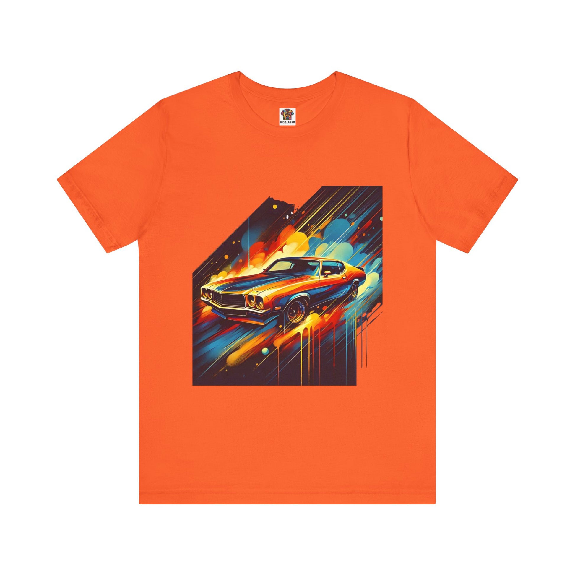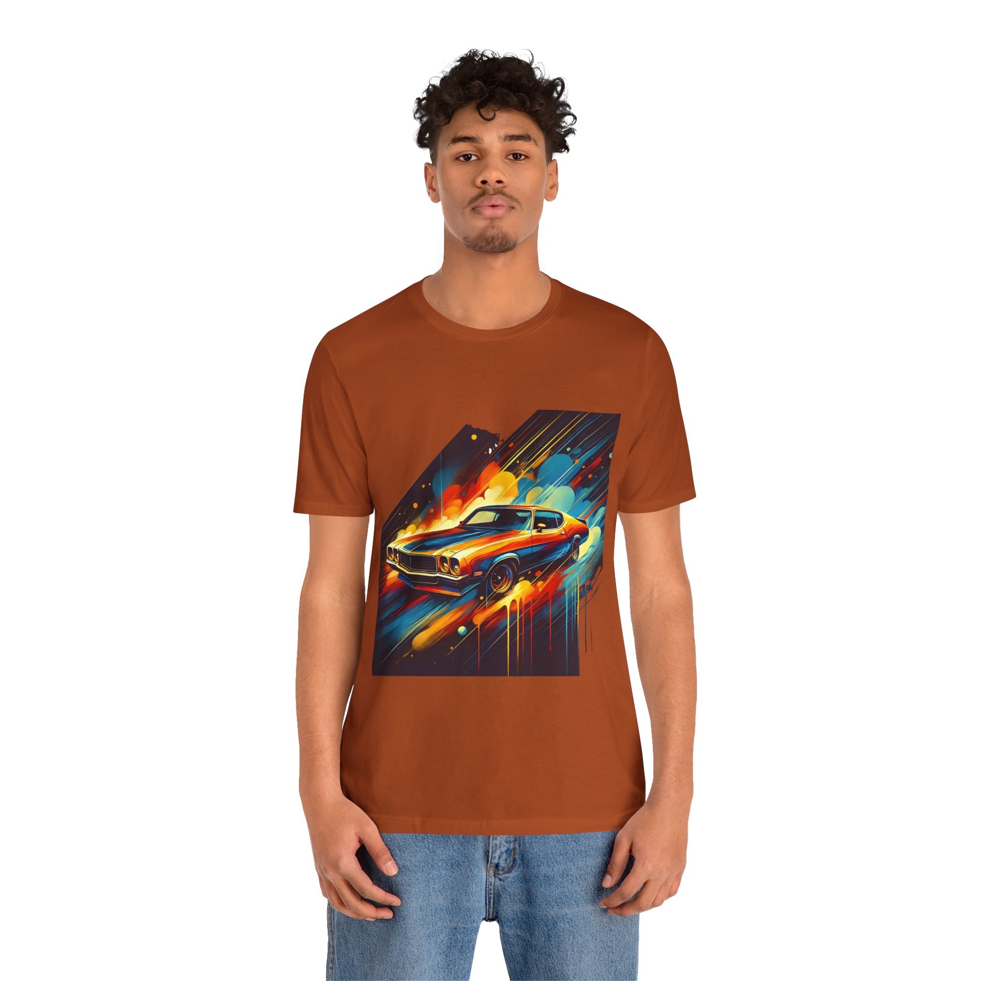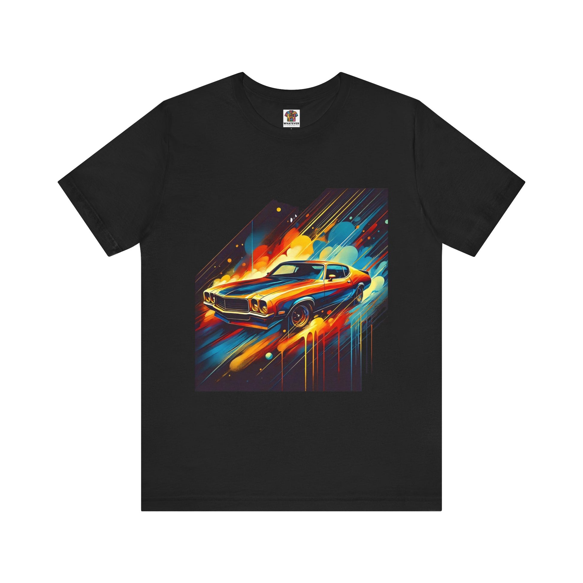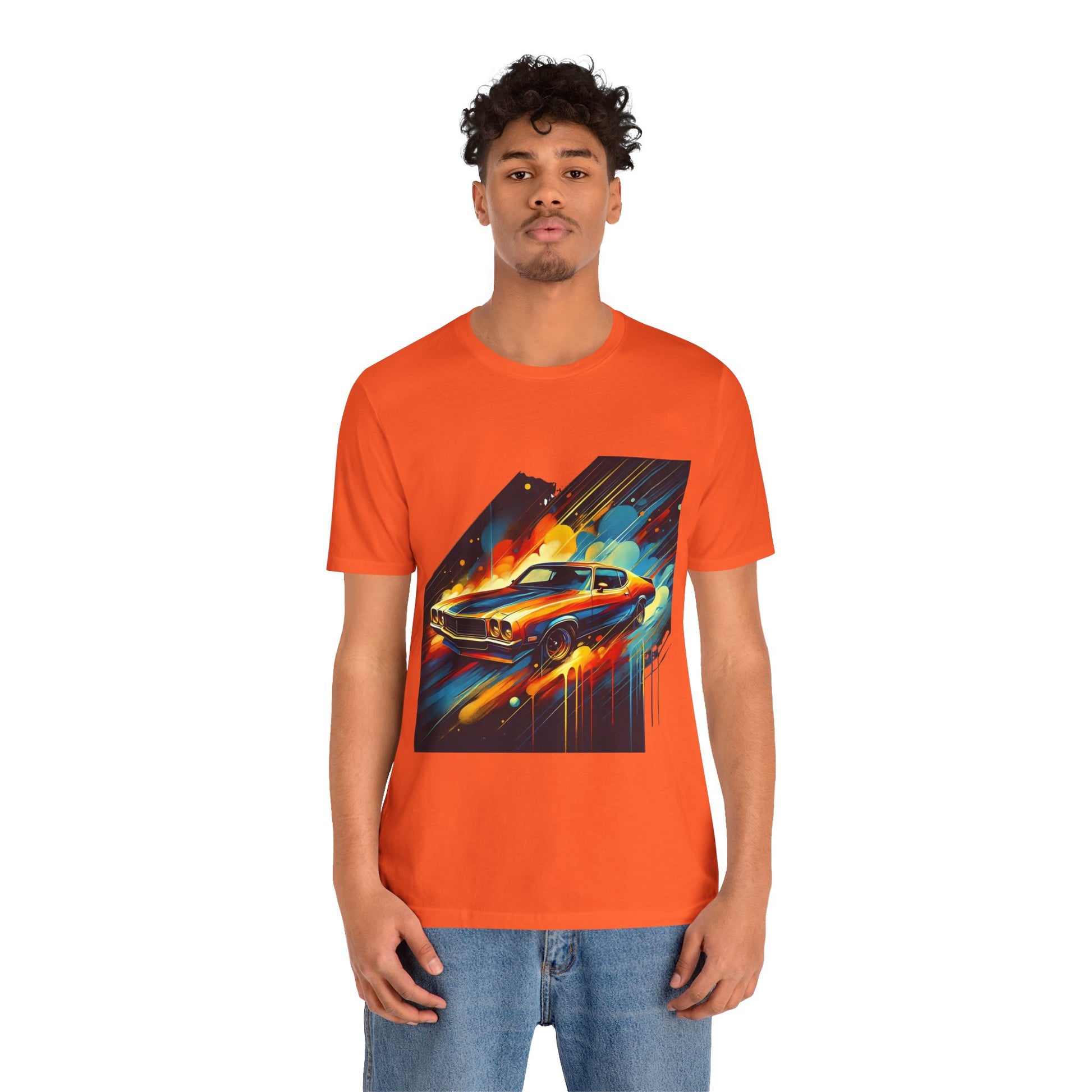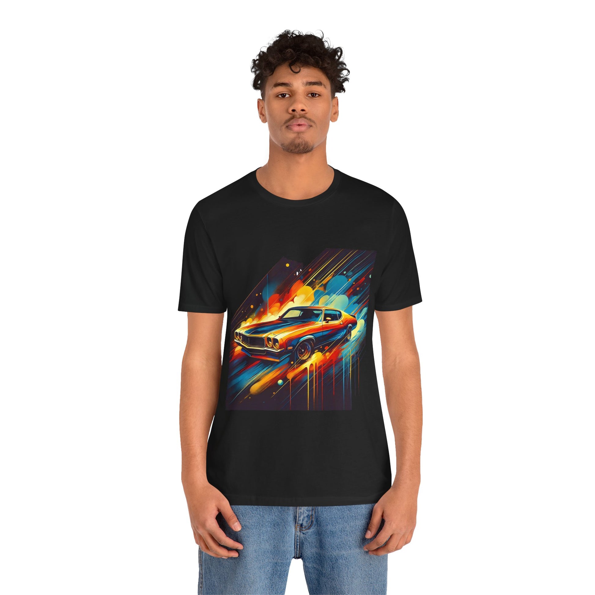 An abstract representation of a 1970s car with vibrant colors like oranges, yellows, and blues, suggesting speed and motion against a dark backdrop.