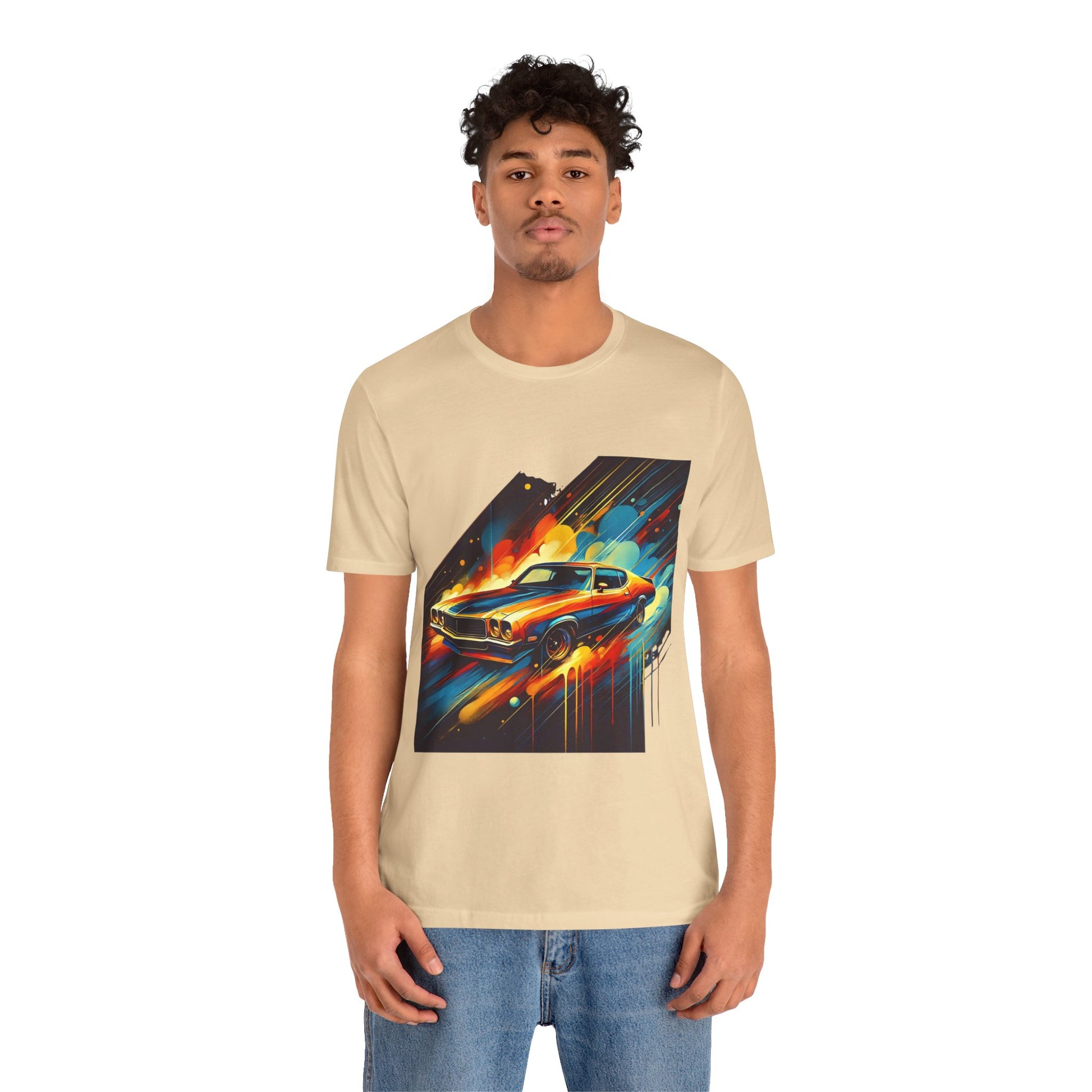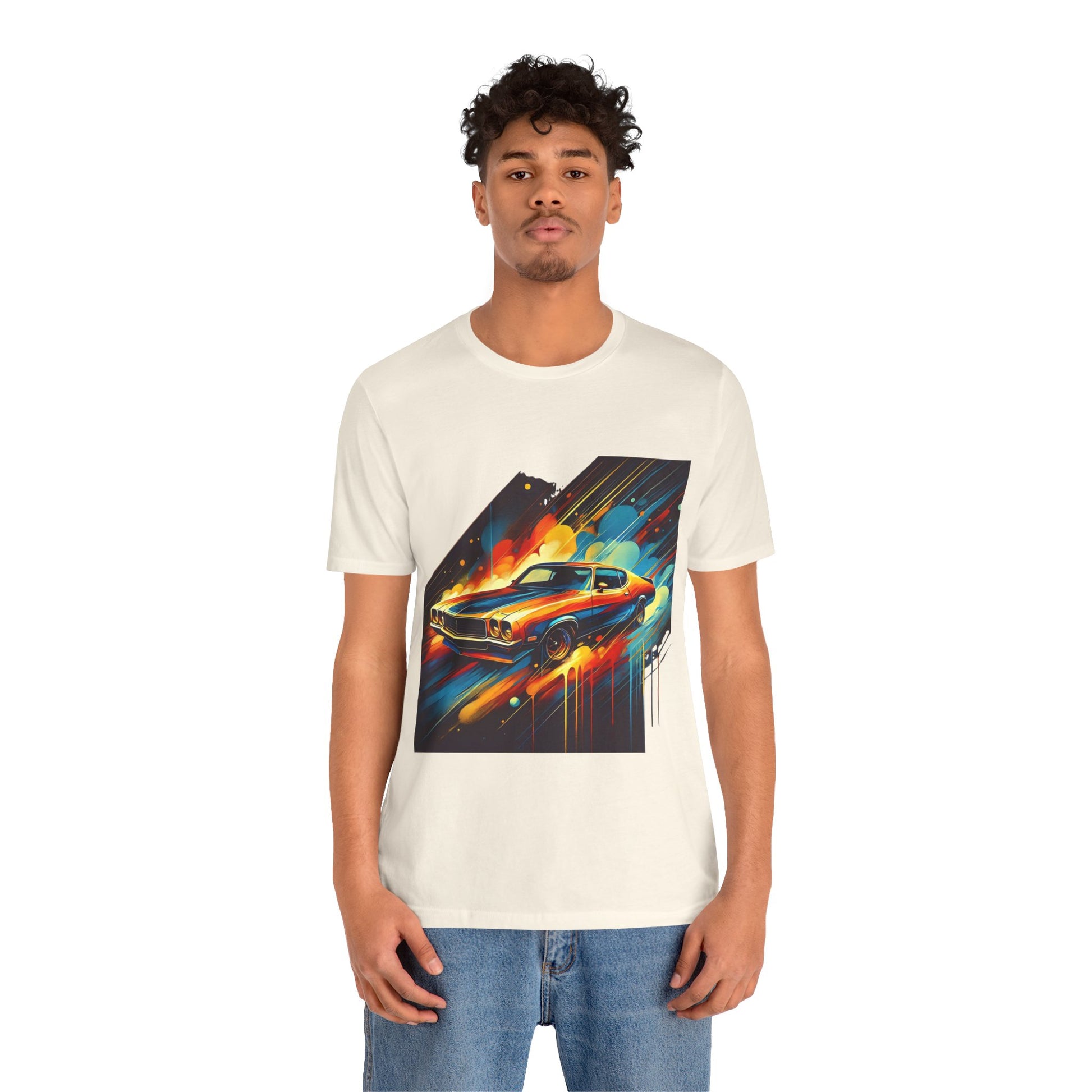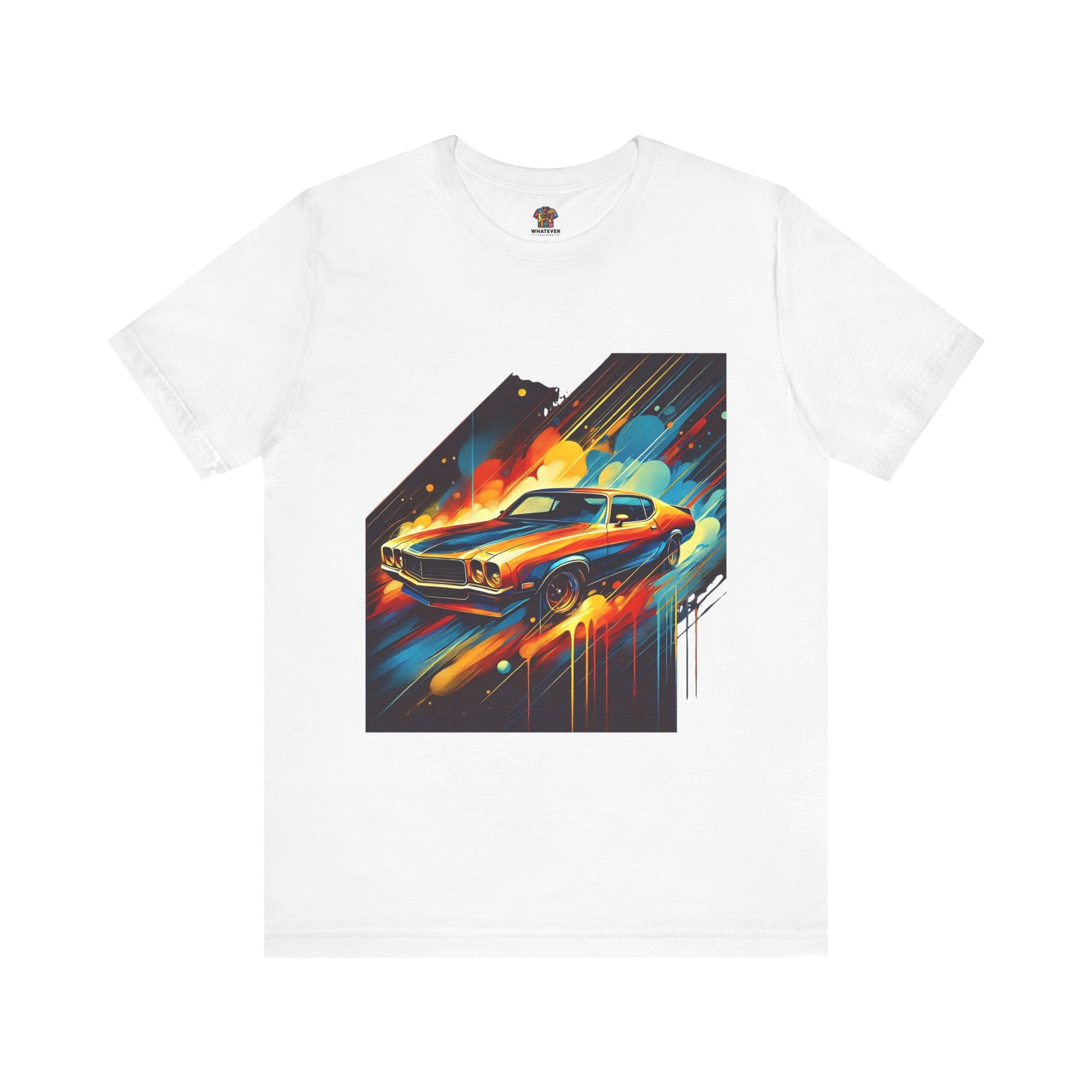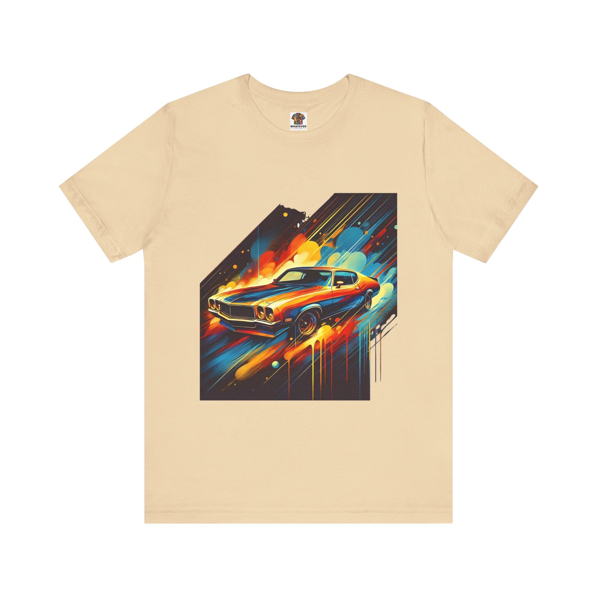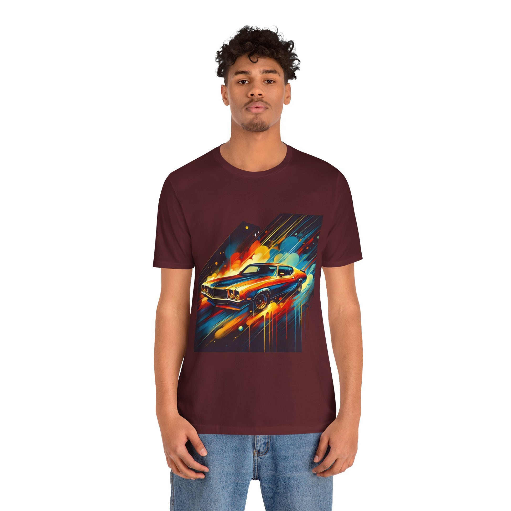 An abstract representation of a 1970s car with vibrant colors like oranges, yellows, and blues, suggesting speed and motion against a dark backdrop.