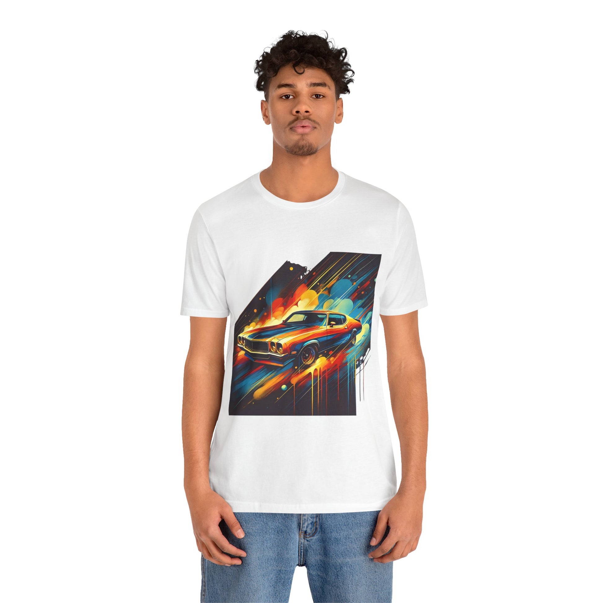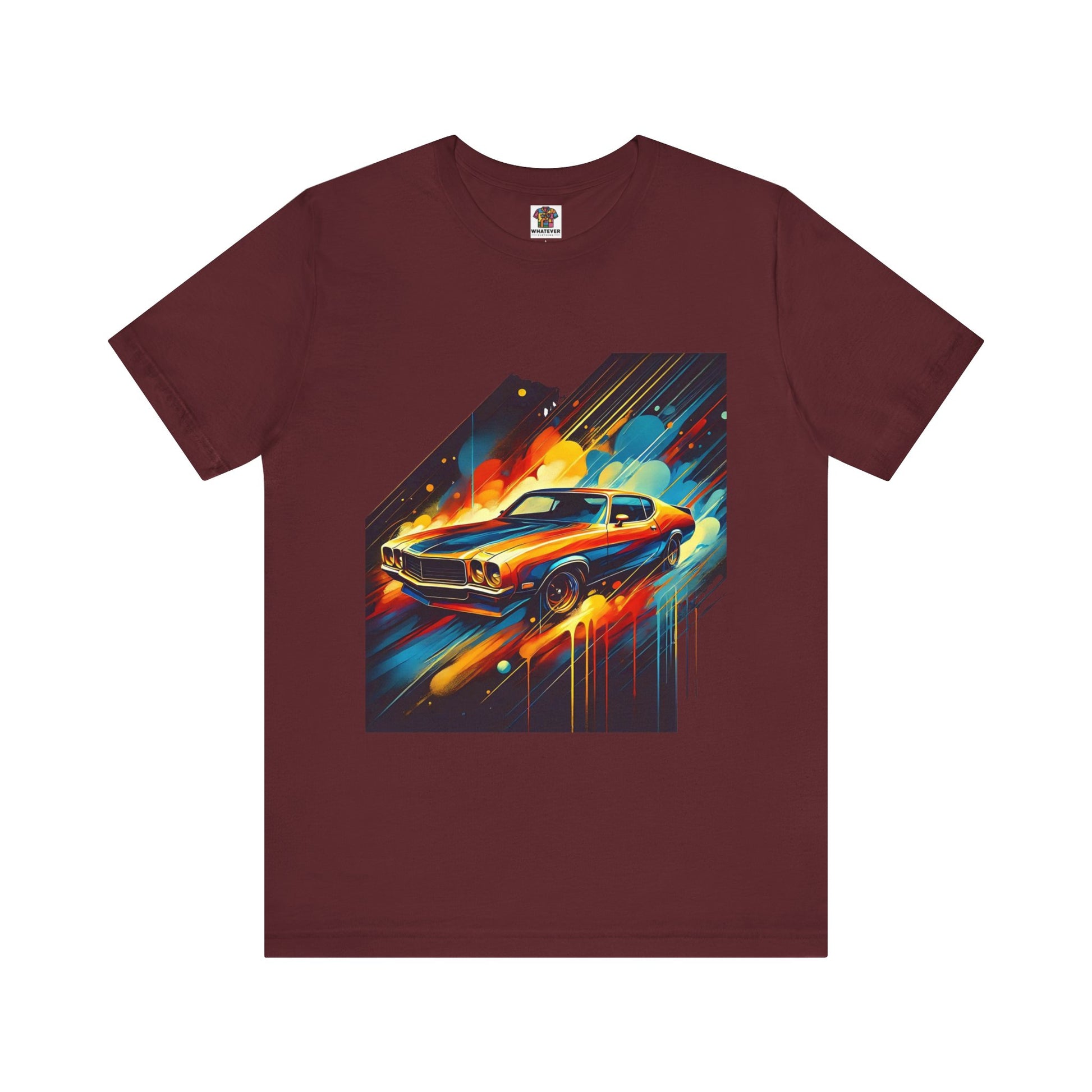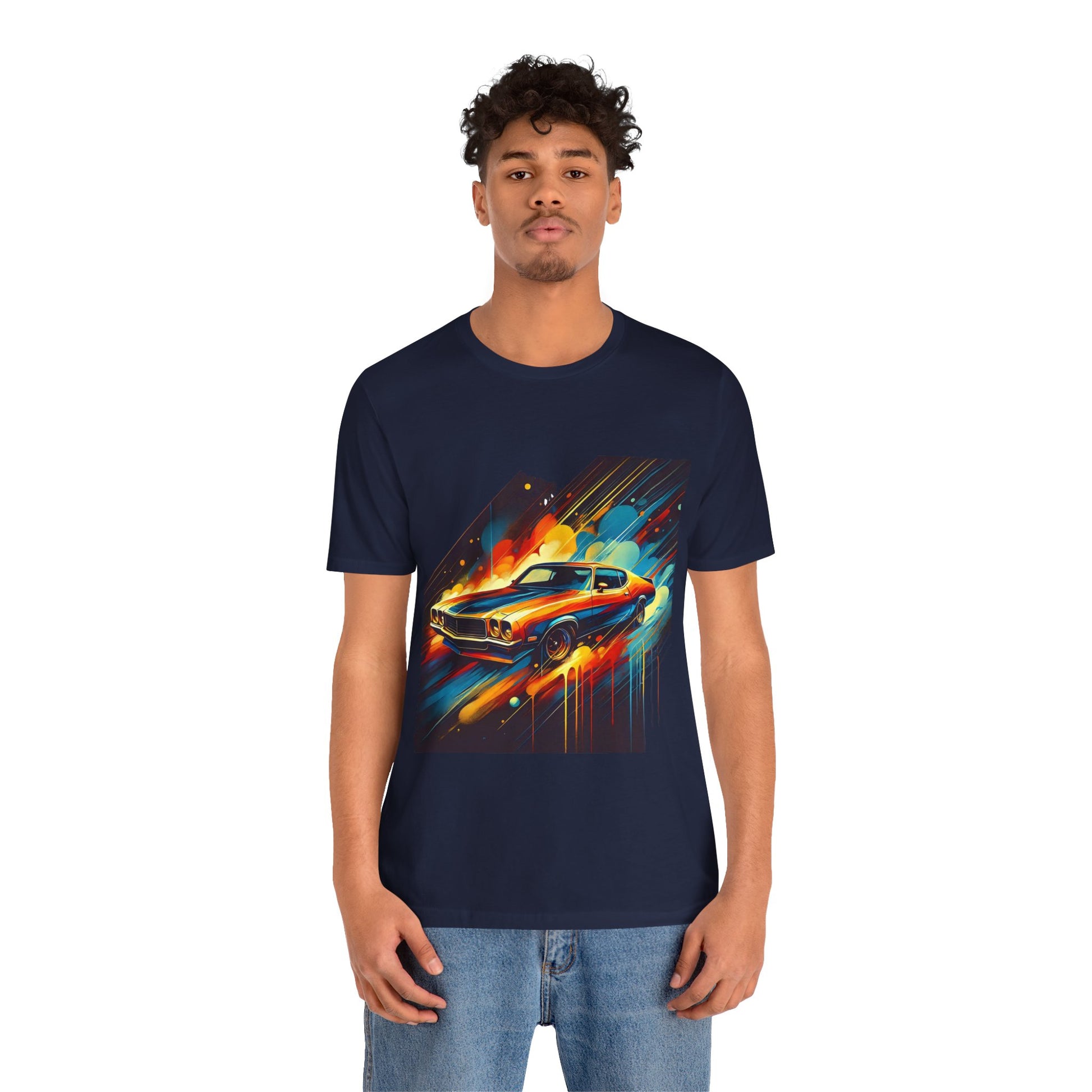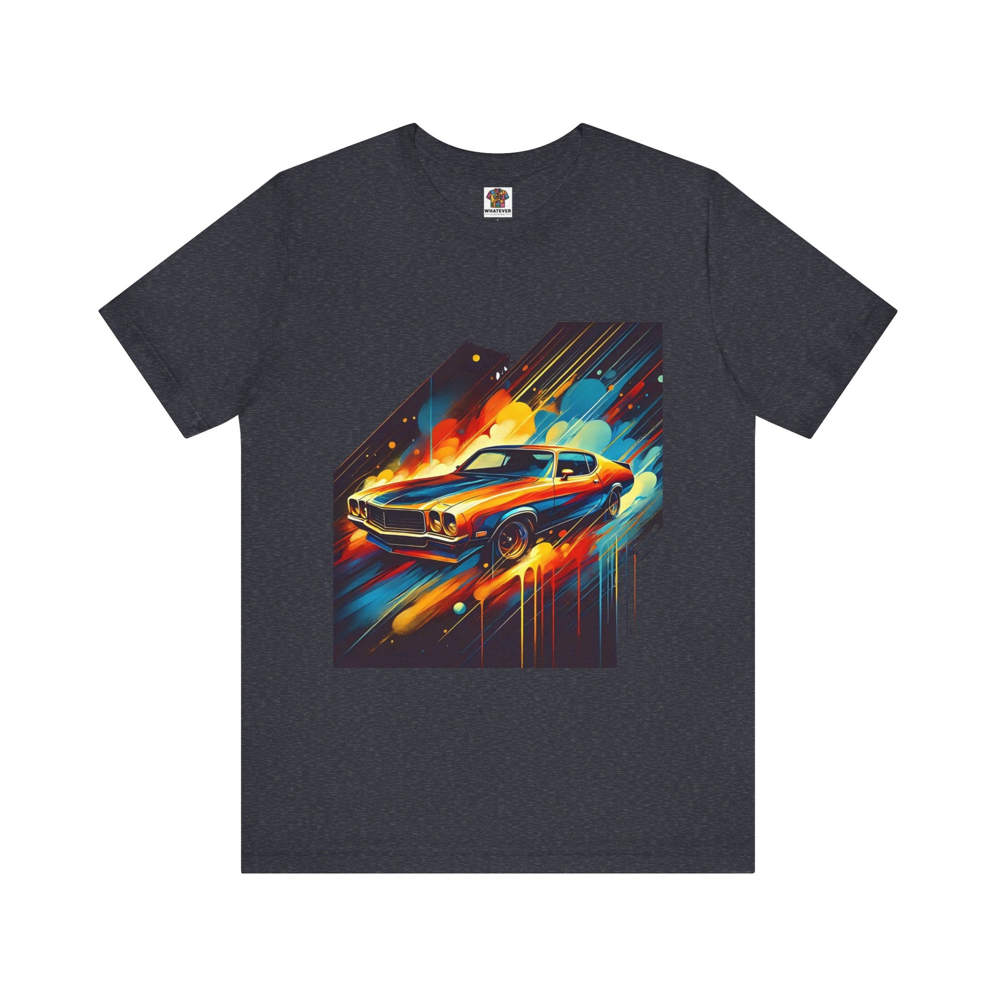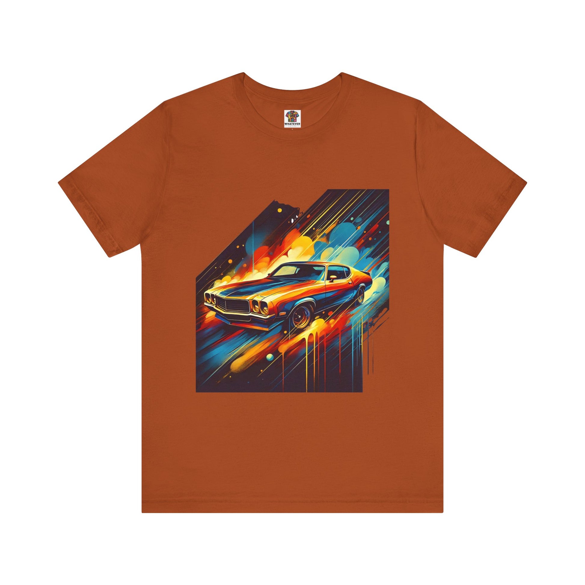An abstract representation of a 1970s car with vibrant colors like oranges, yellows, and blues, suggesting speed and motion against a dark backdrop.