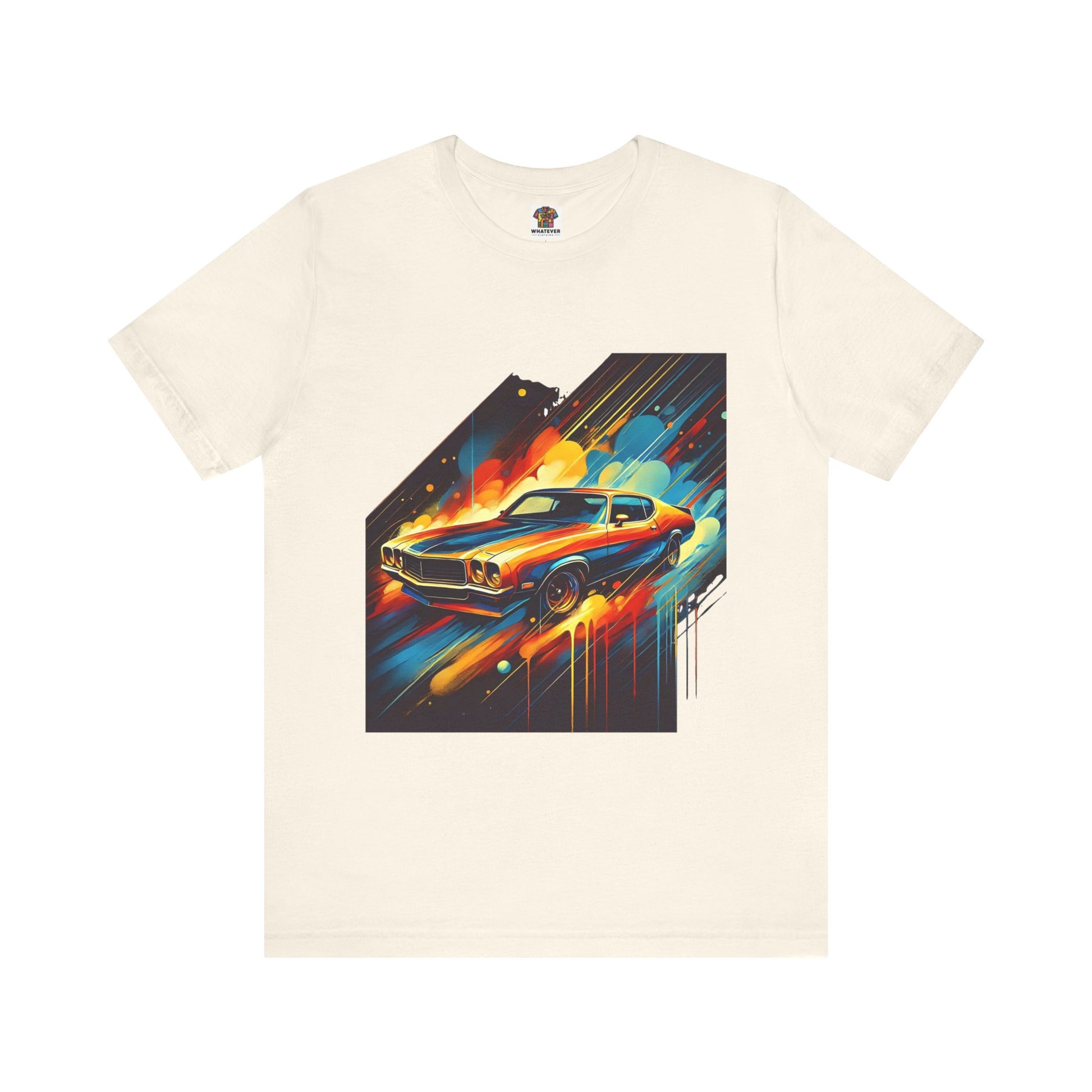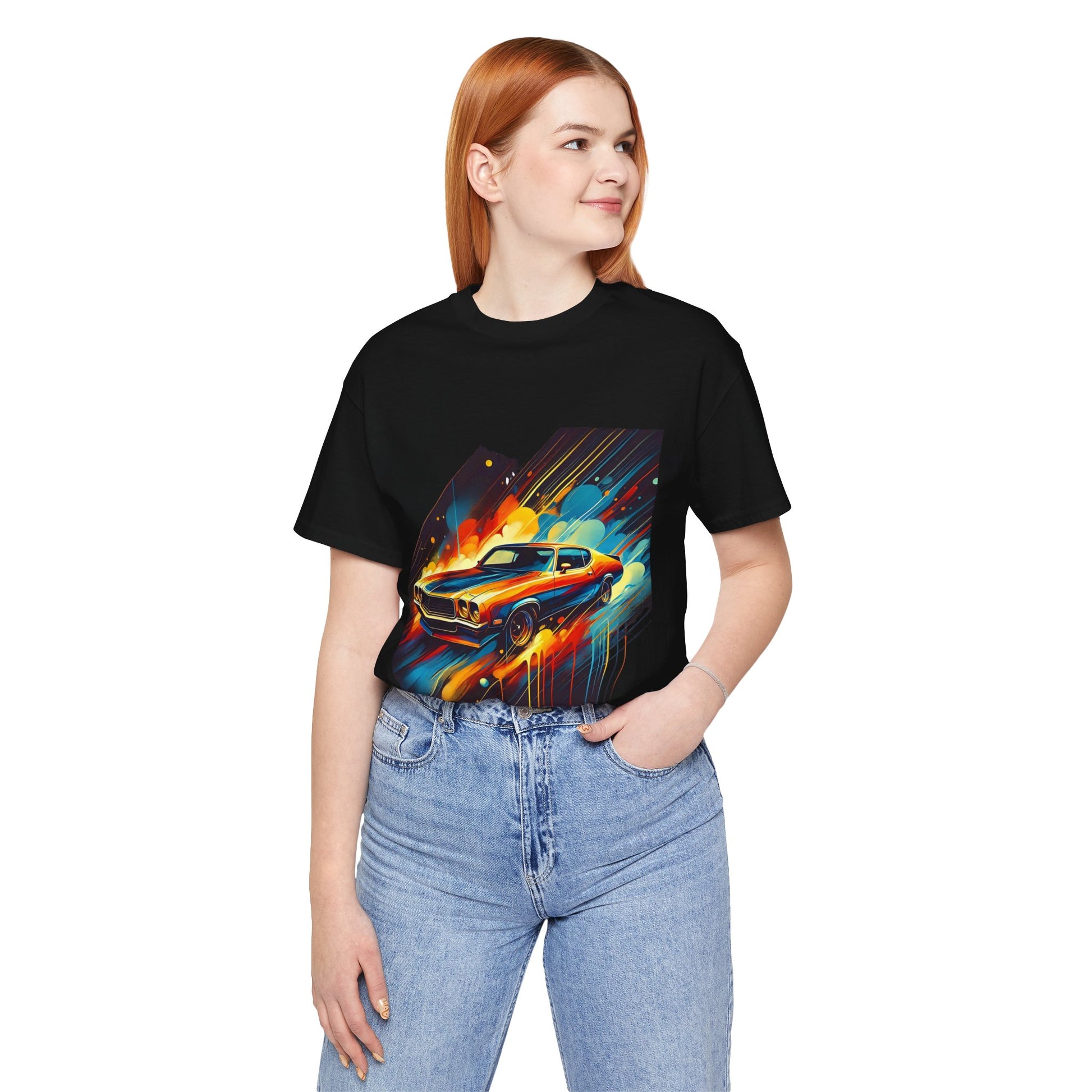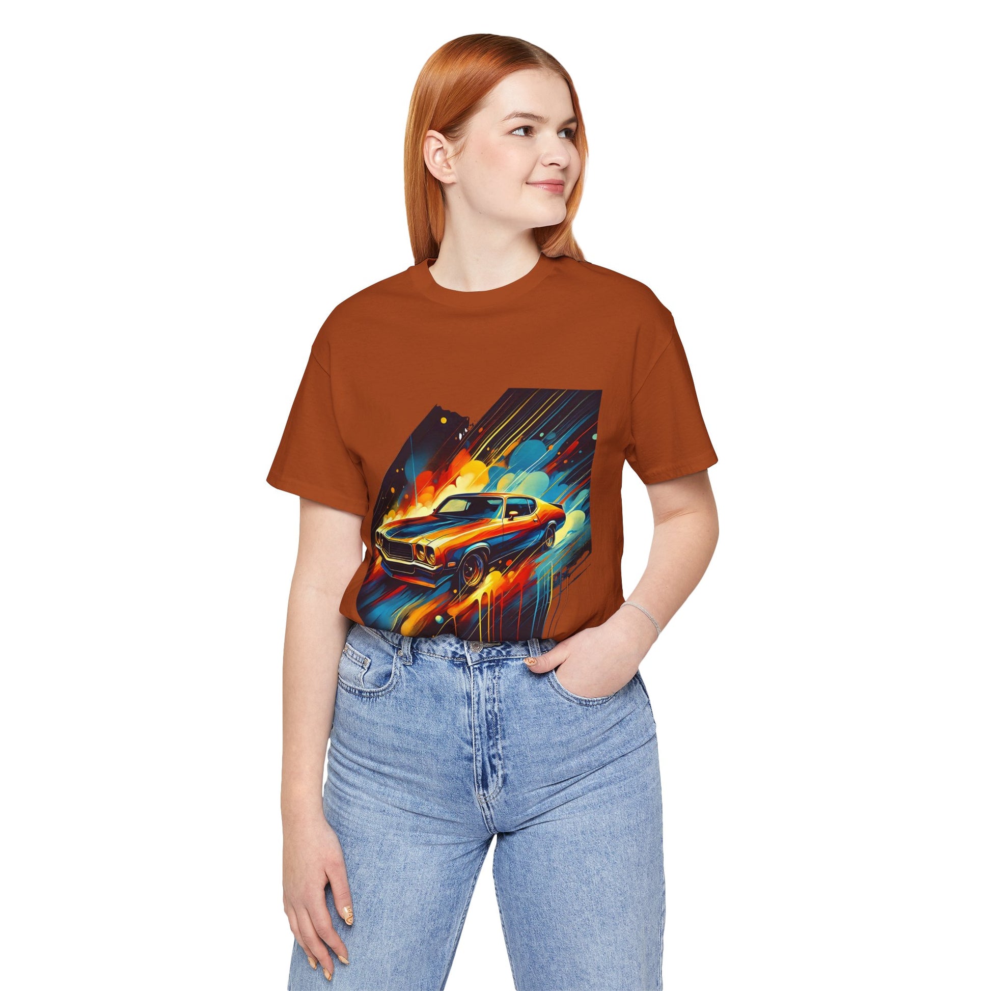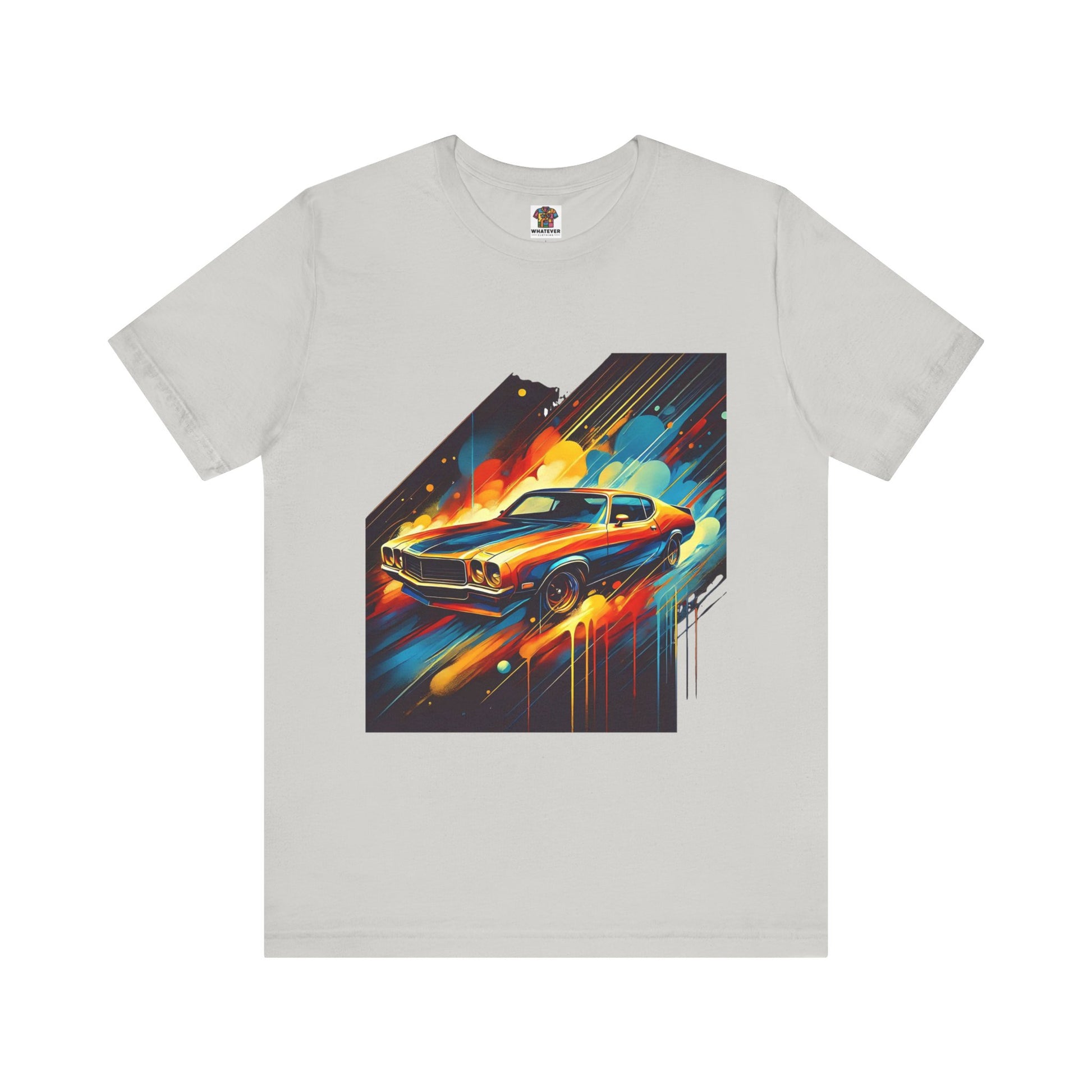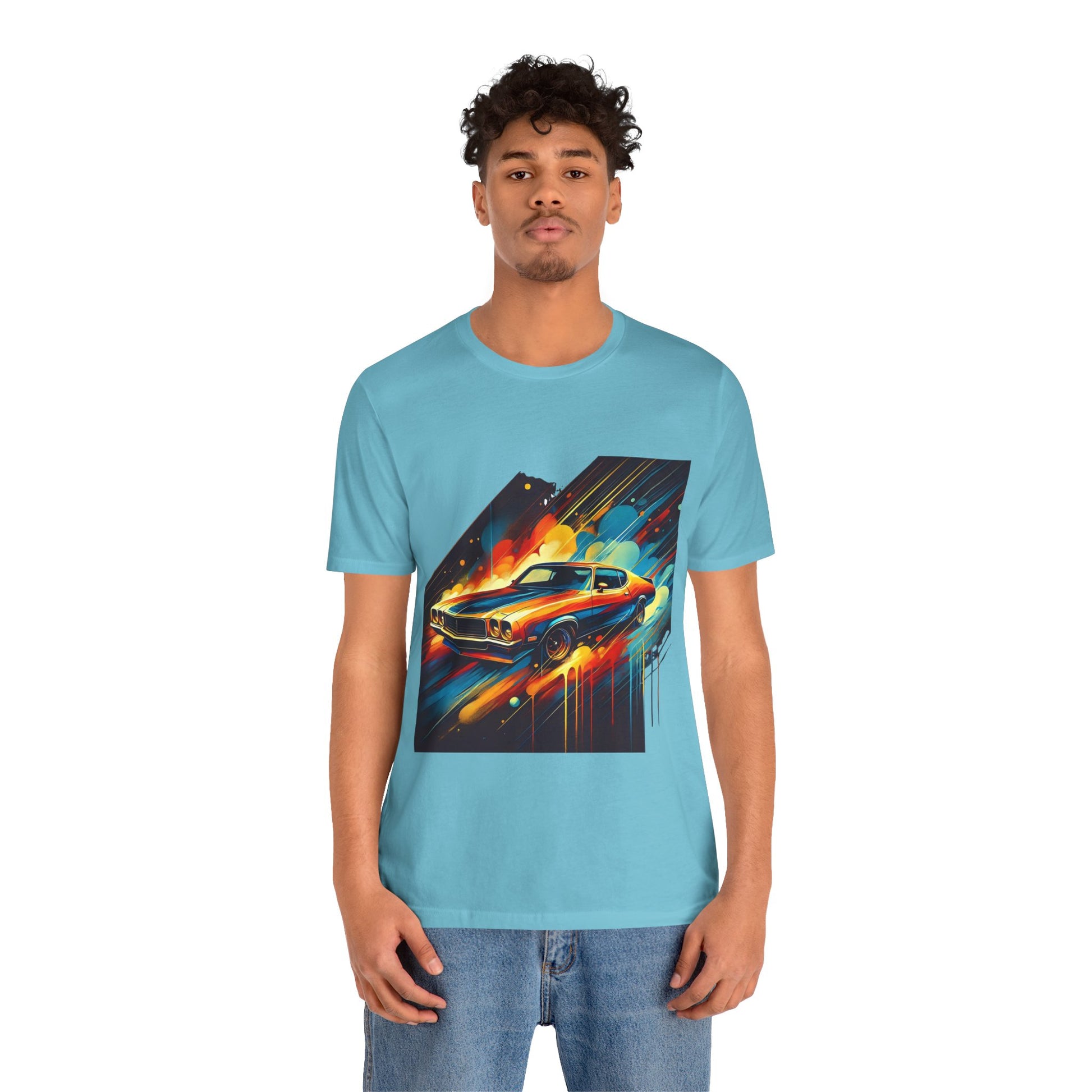 An abstract representation of a 1970s car with vibrant colors like oranges, yellows, and blues, suggesting speed and motion against a dark backdrop.
