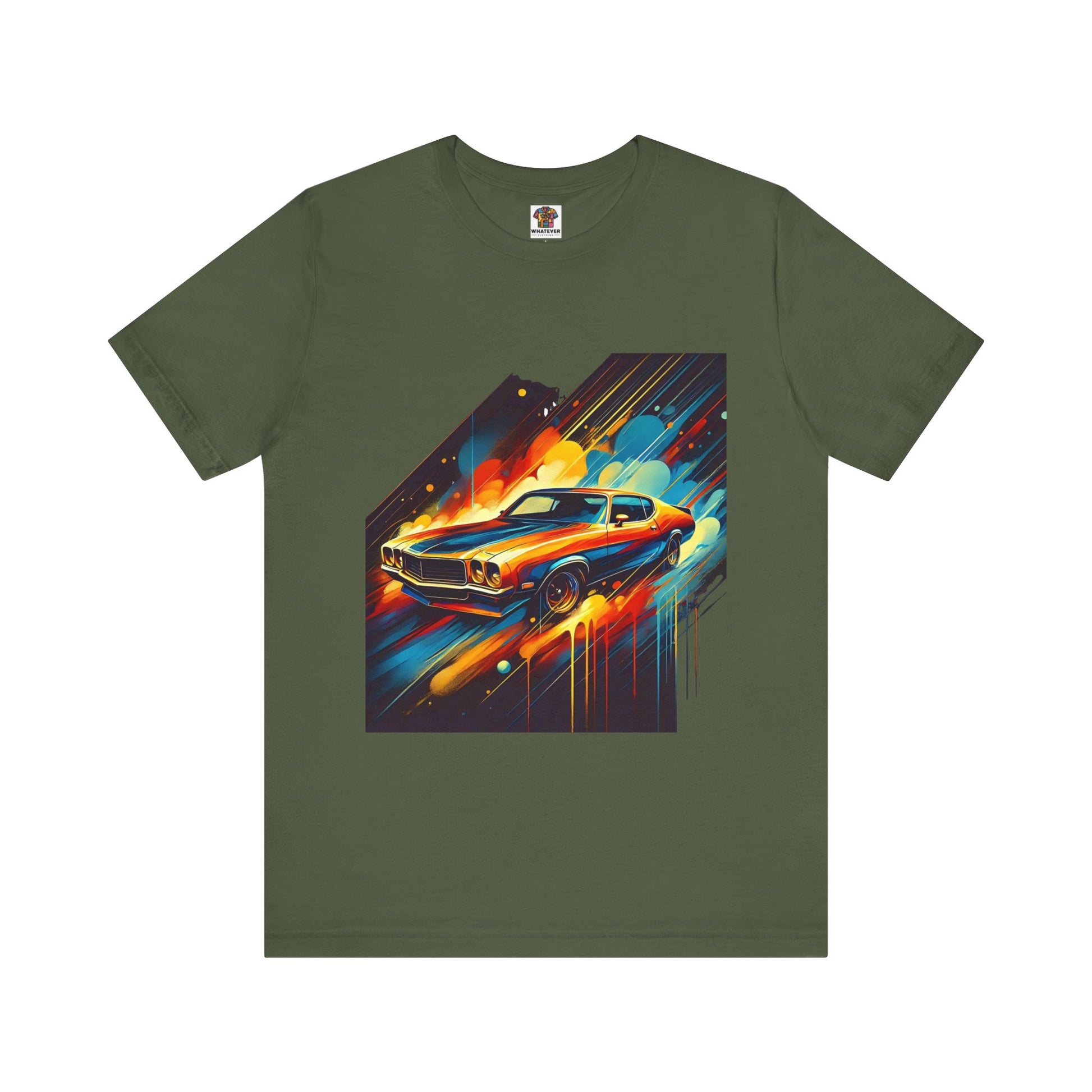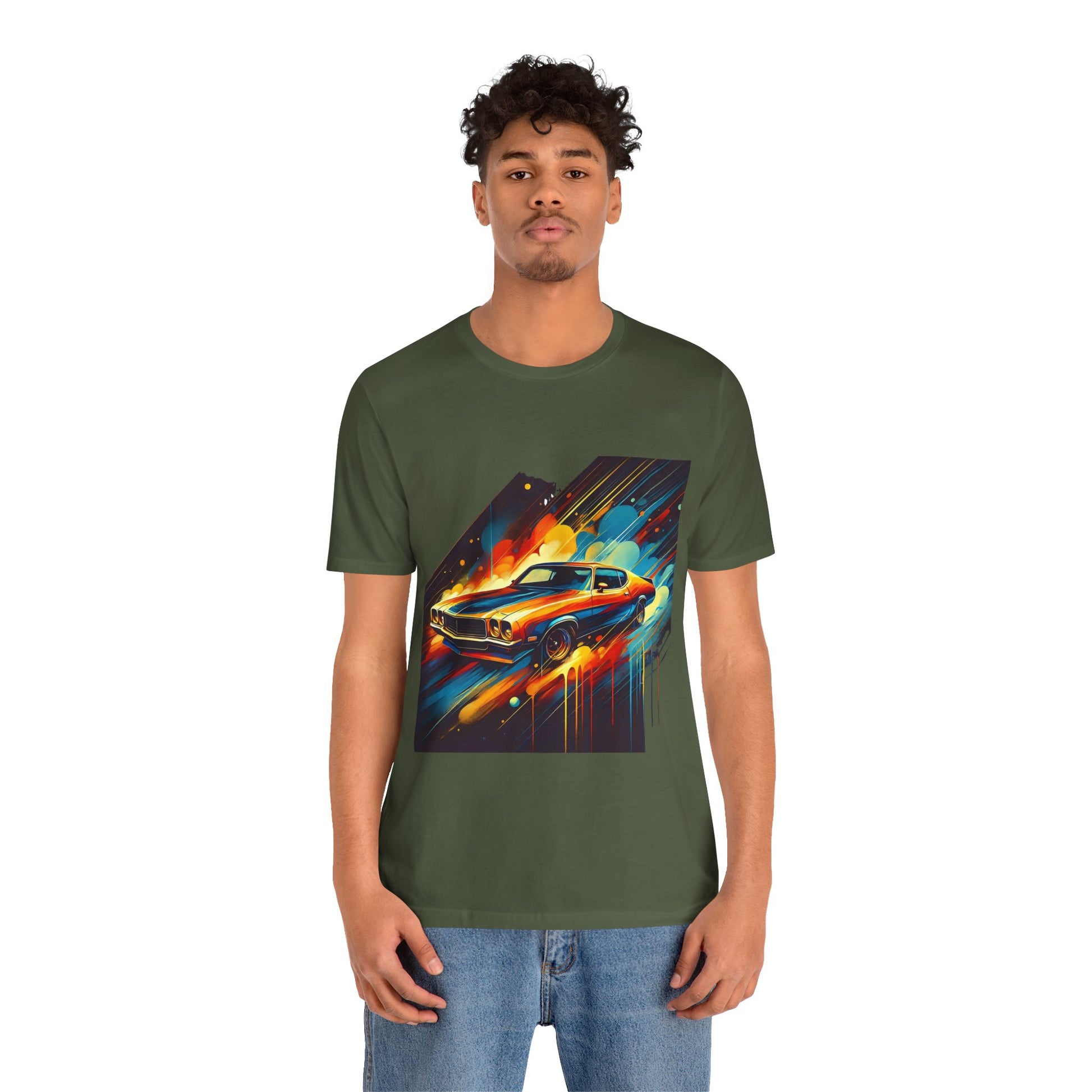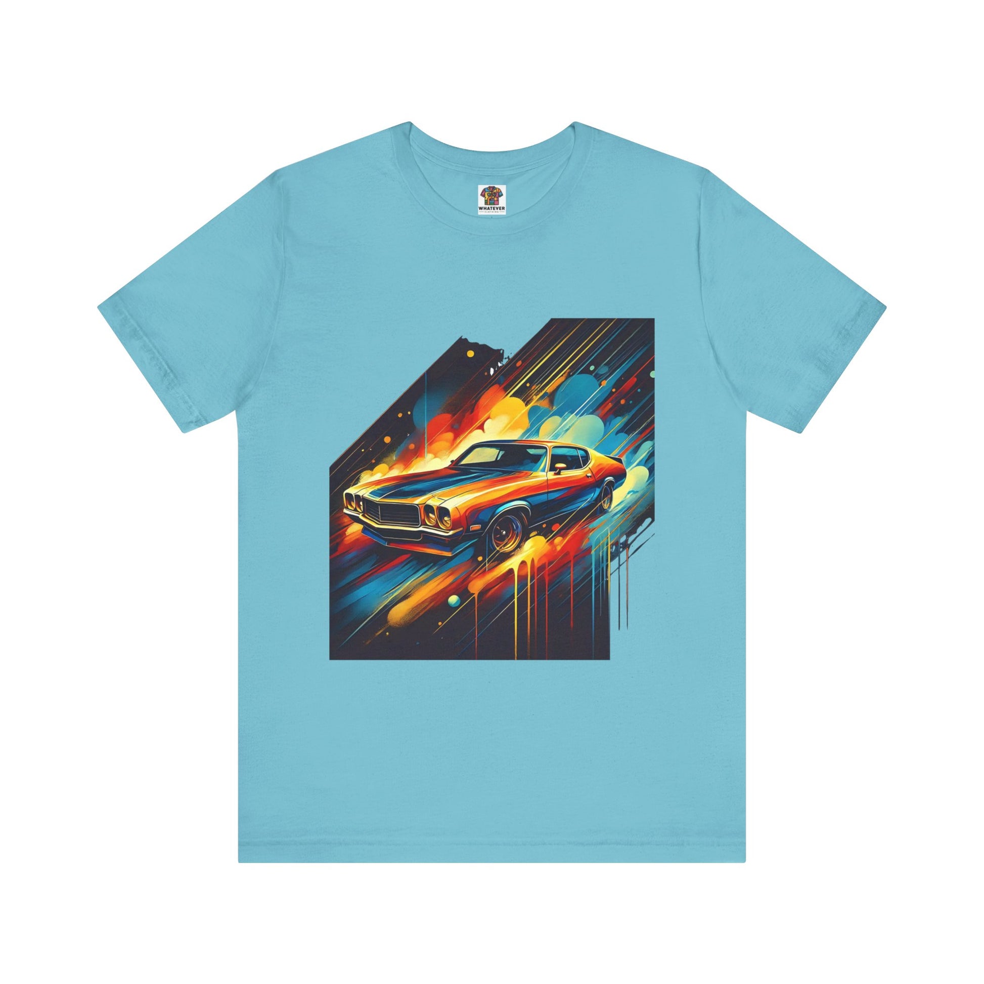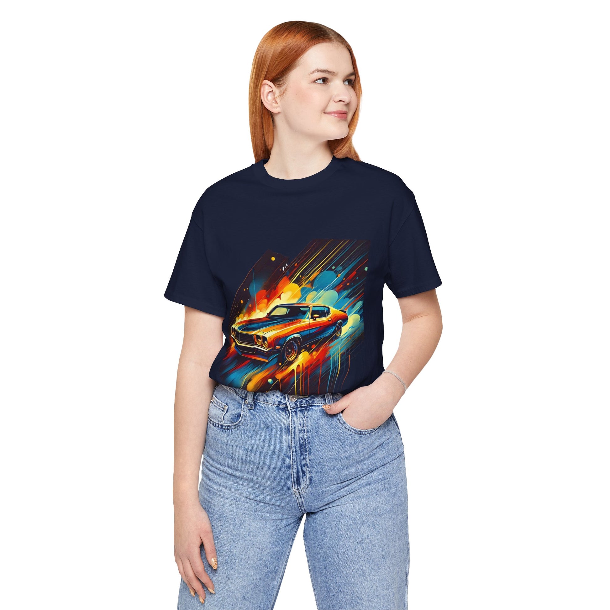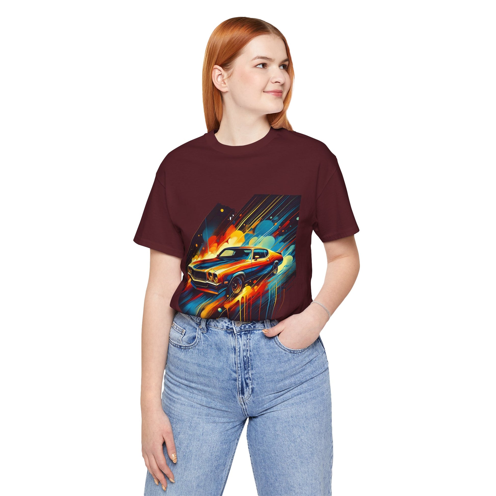 An abstract representation of a 1970s car with vibrant colors like oranges, yellows, and blues, suggesting speed and motion against a dark backdrop.