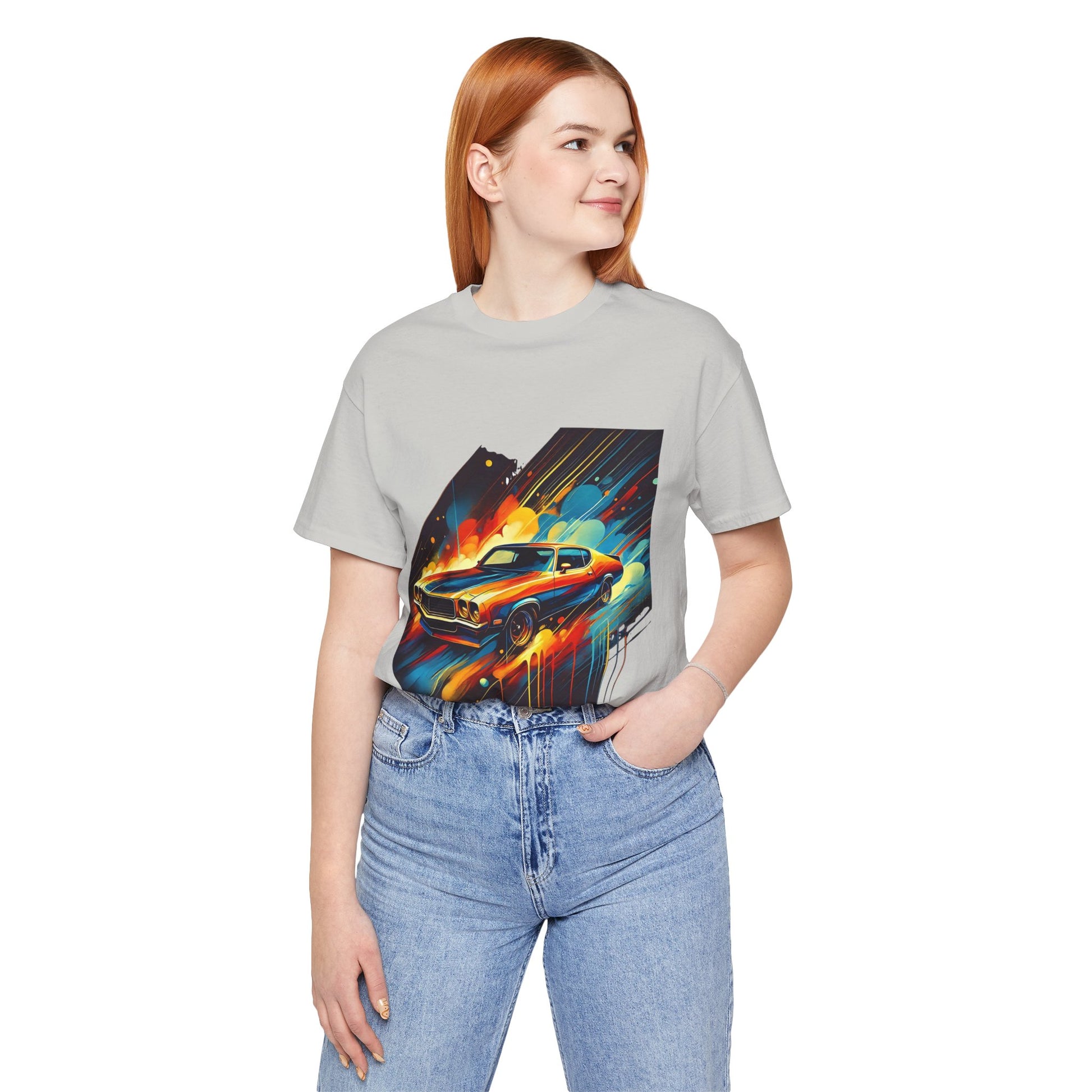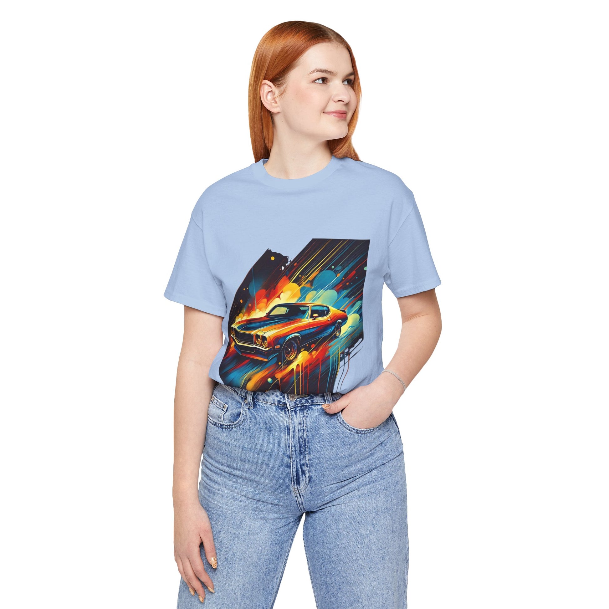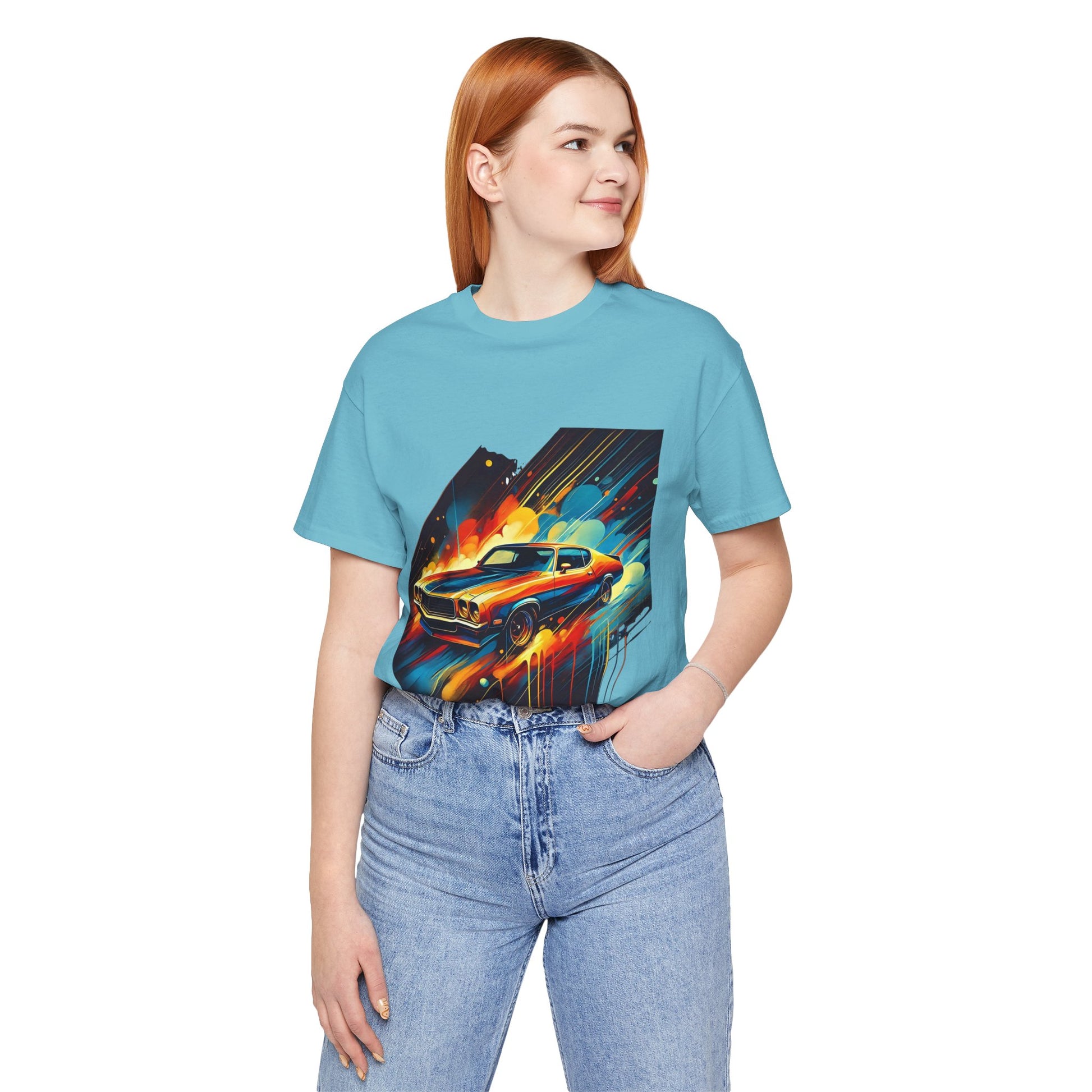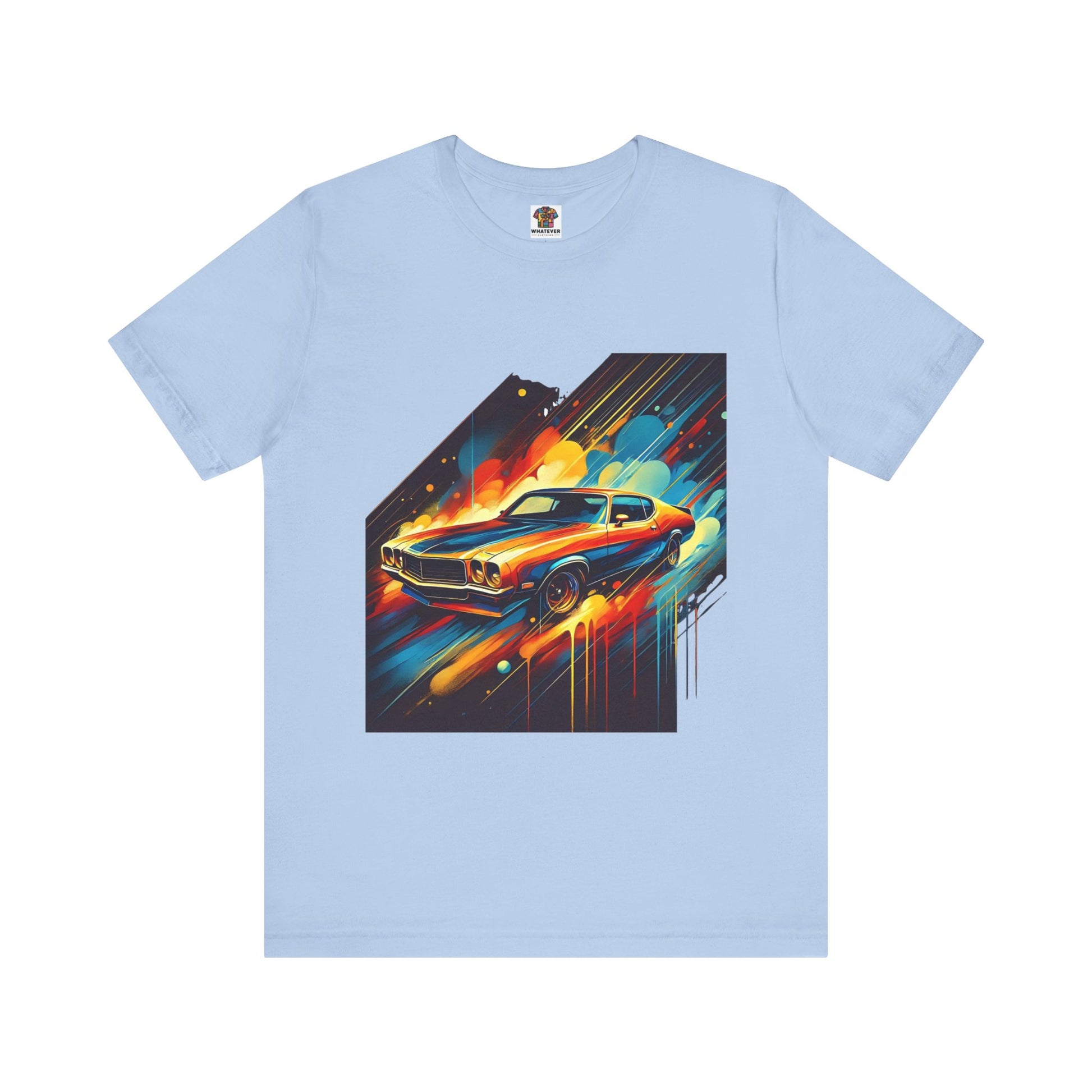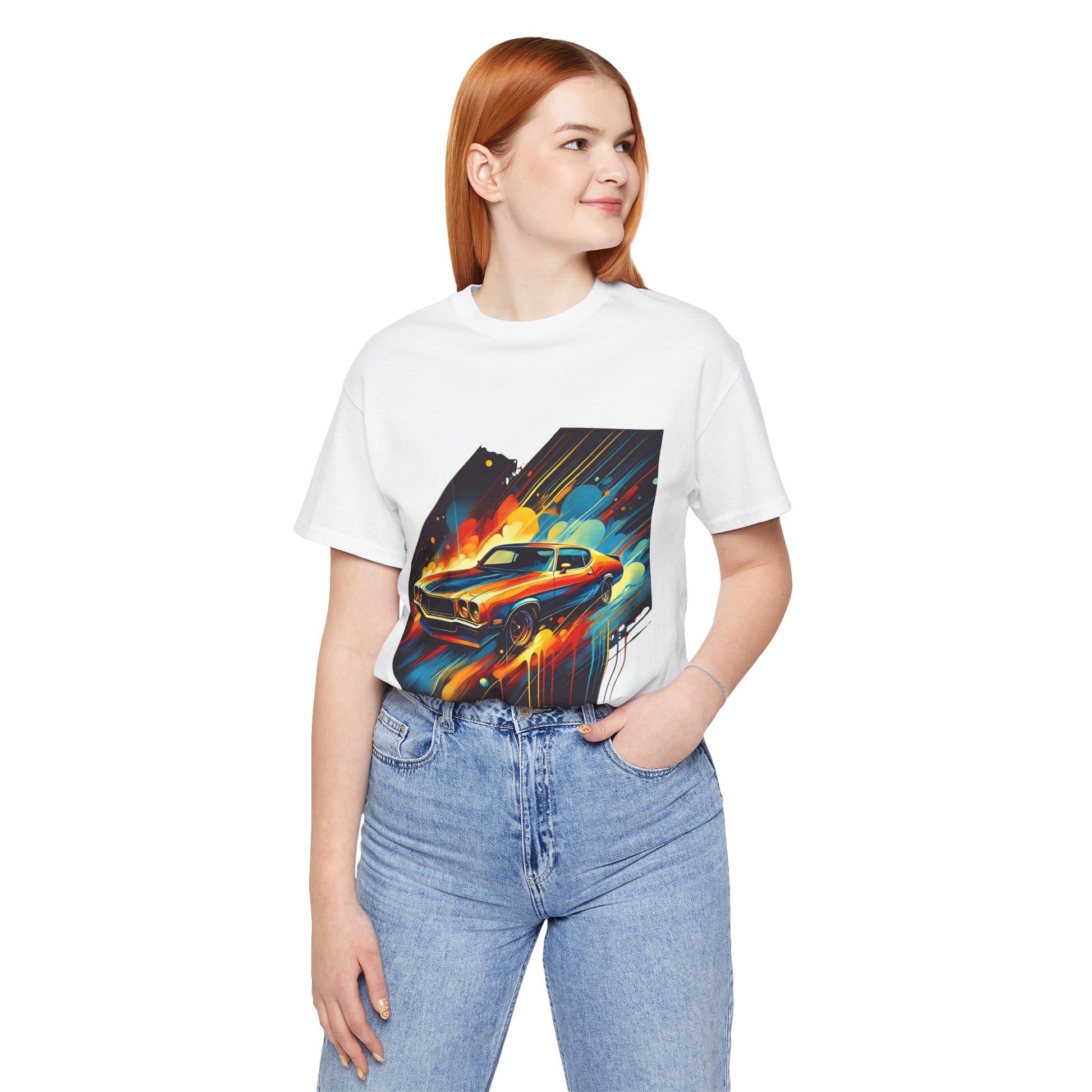 An abstract representation of a 1970s car with vibrant colors like oranges, yellows, and blues, suggesting speed and motion against a dark backdrop.