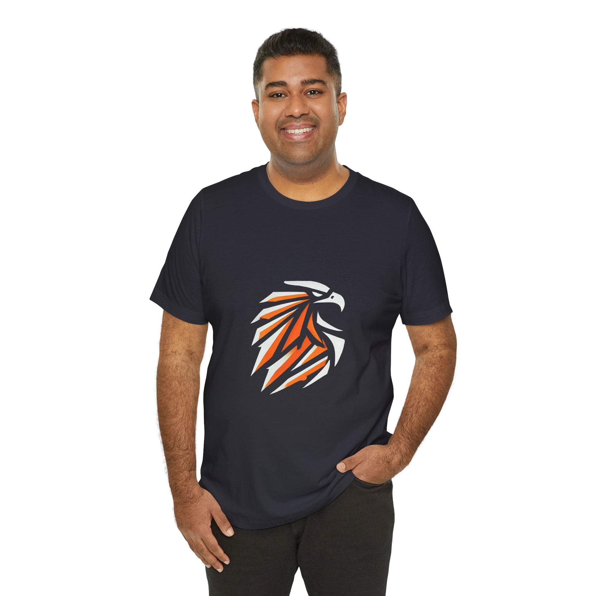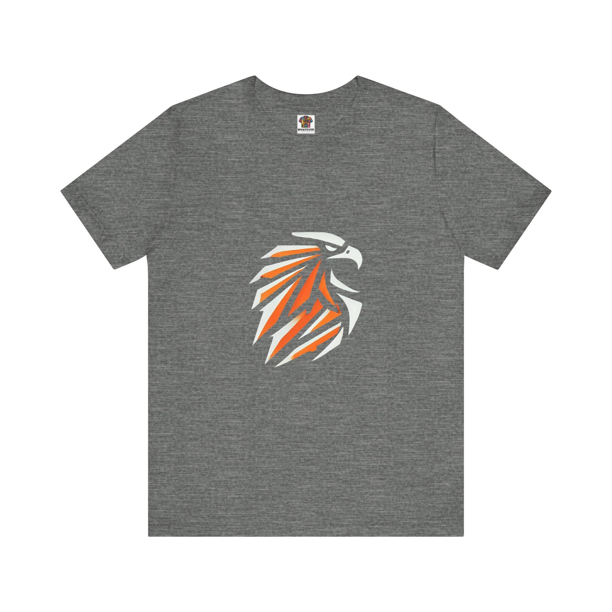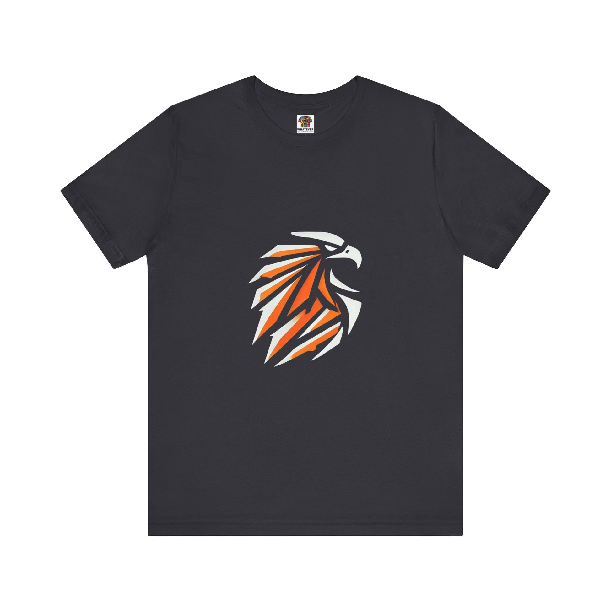 An eagle silhouette with angular lines and bold orange highlights on a dark gray background.
