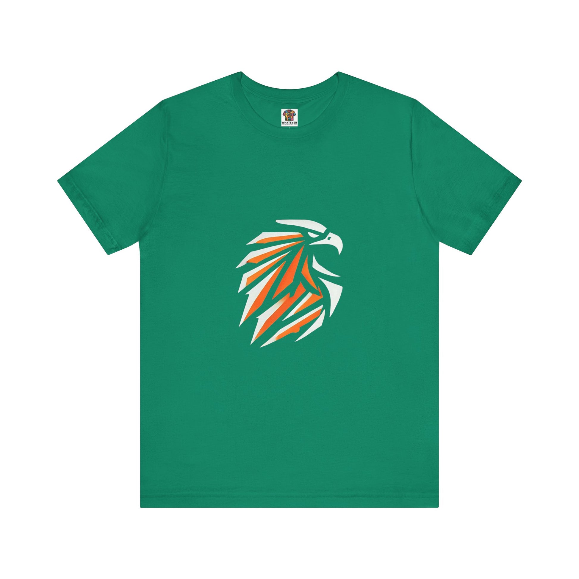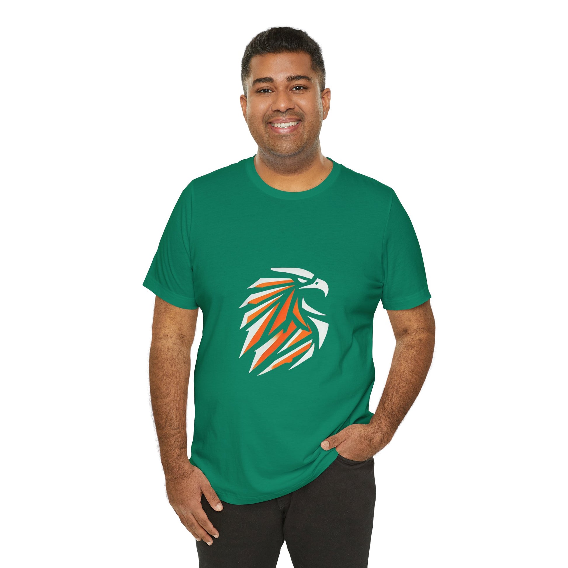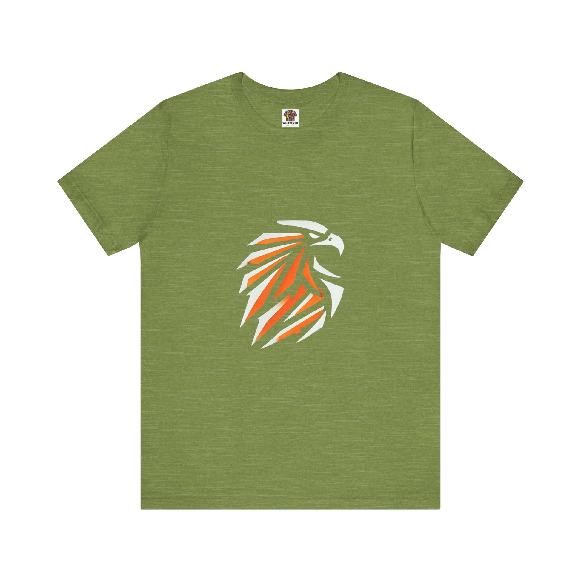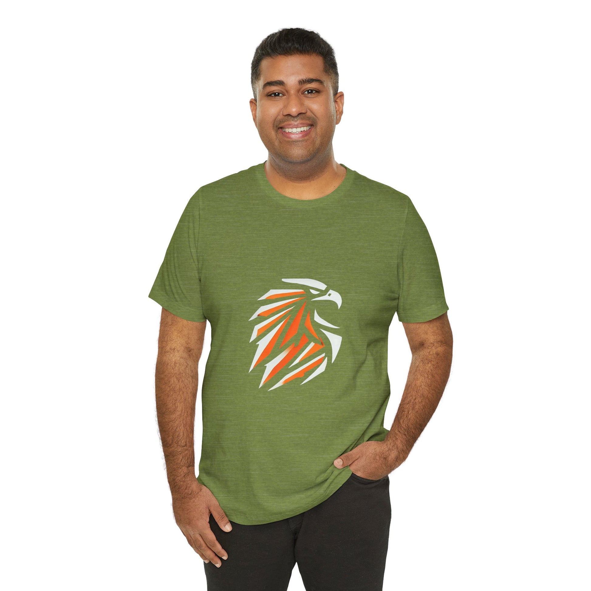 An eagle silhouette with angular lines and bold orange highlights on a dark gray background.