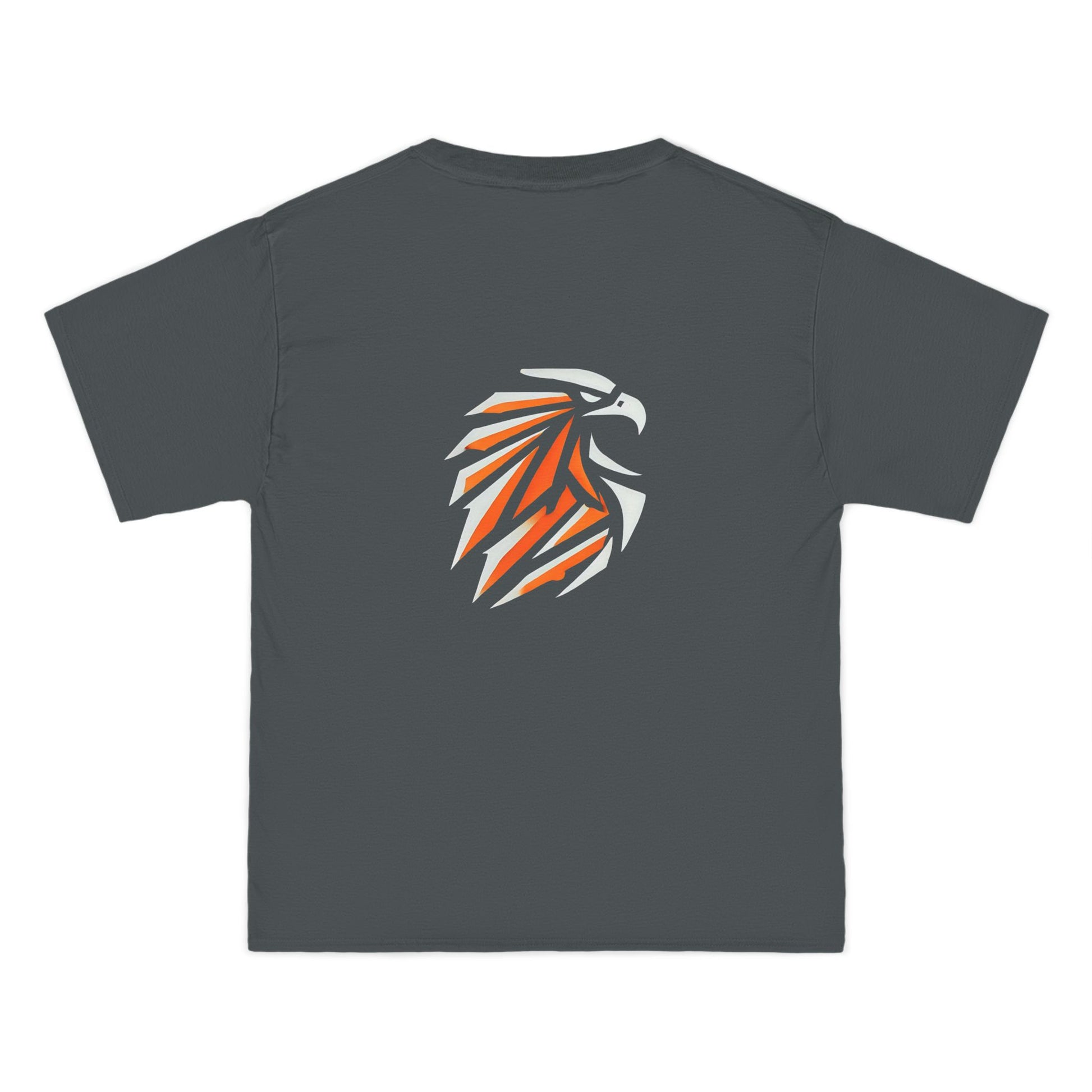 Introducing the Abstract Eagle: Minimalist Geometric Tee from Whatever Clothing, where creativity takes flight! This shirt features a striking eagle silhouette, masterfully crafted with angular lines and bold orange highlights that pop against a stylish, dark gray background. Like a wearable canvas, this design brings art to life right at your fingertips.
