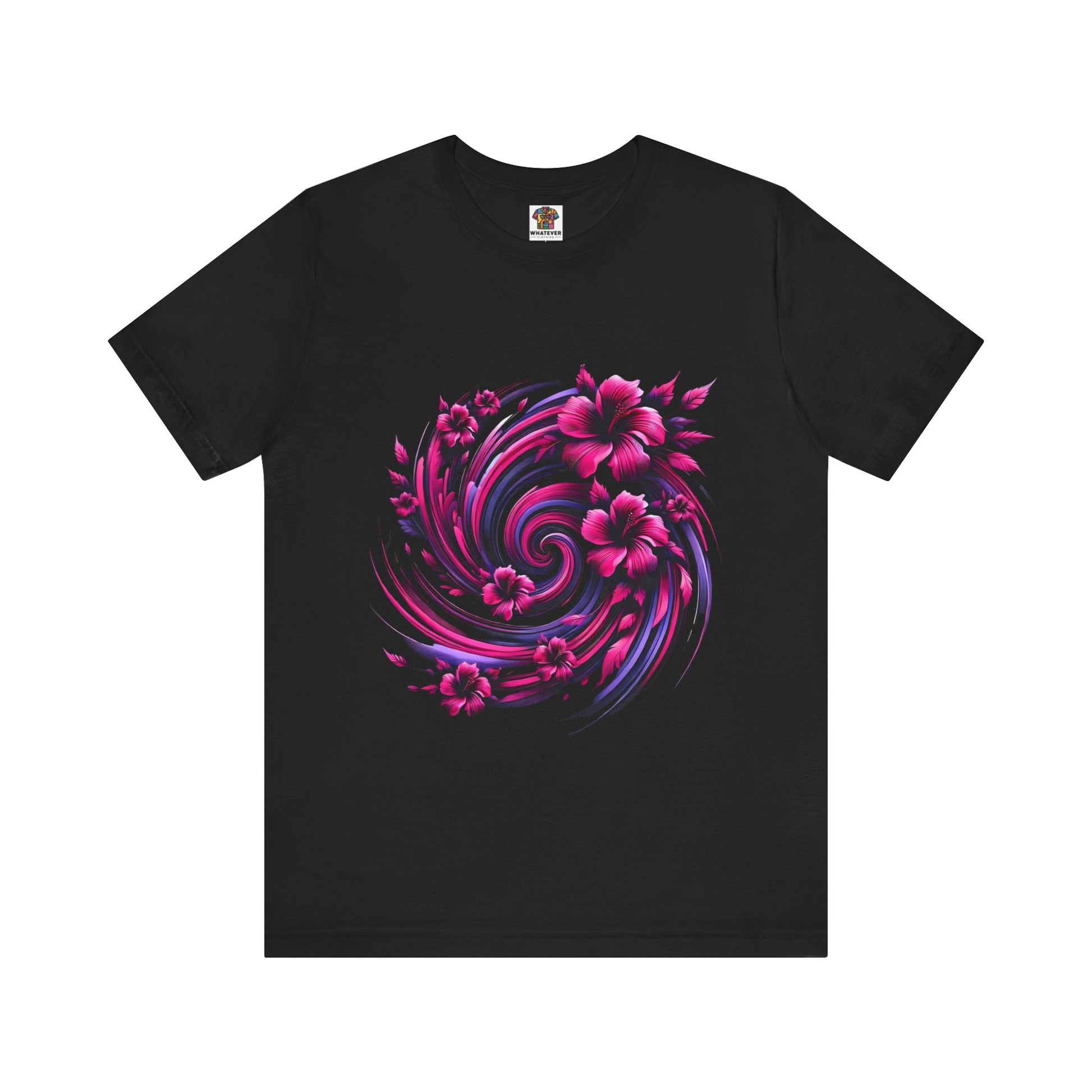 An abstract swirl composed of magenta flowers, creating motion on a black background.