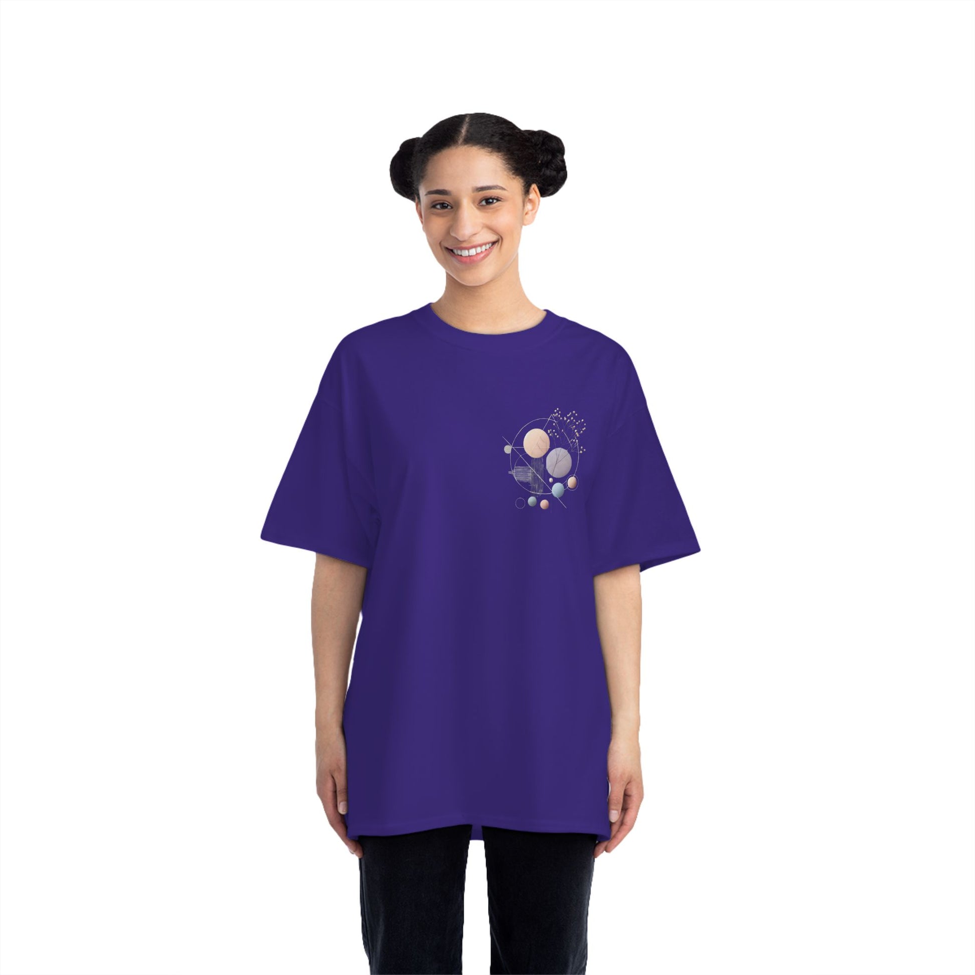 Our unique, AI-generated design features a soothing palette of pastel geometric shapes. Circles and triangles dance together in a minimalist, modern style that's understated yet unmissable. It's wearable art that captures the beauty of simplicity, the freedom of expression, and the joy of individuality.