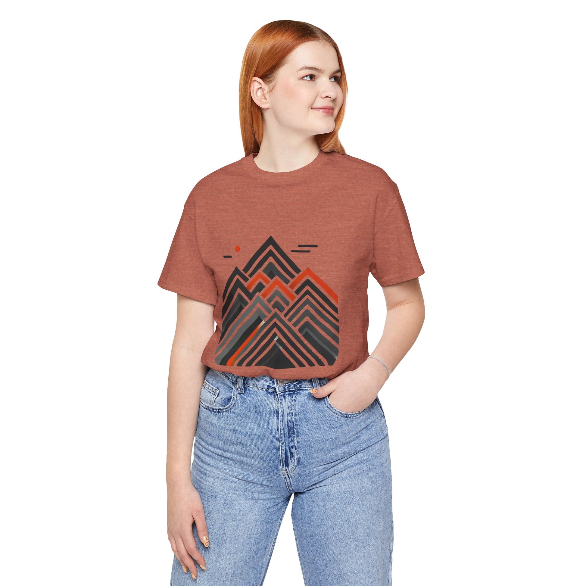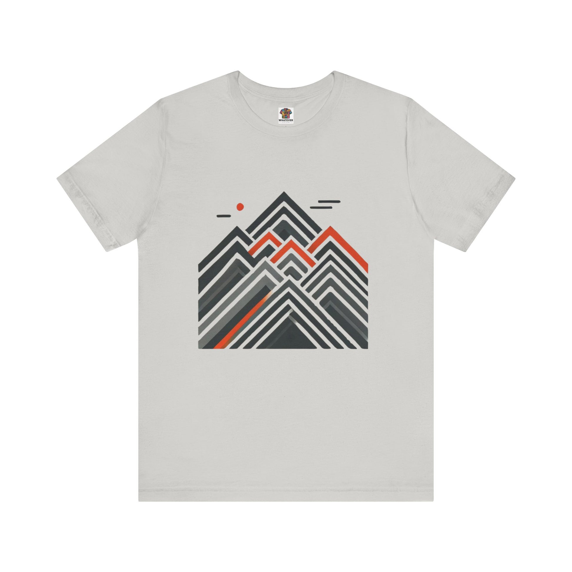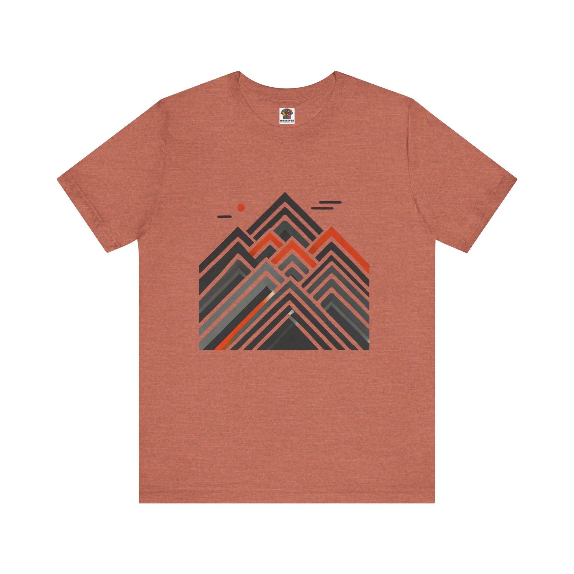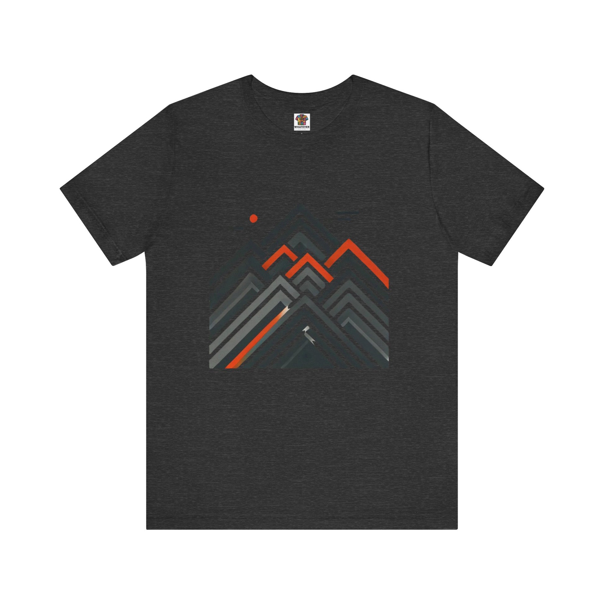 Simplified mountain peaks made of triangular shapes with bold orange accents and clean lines.