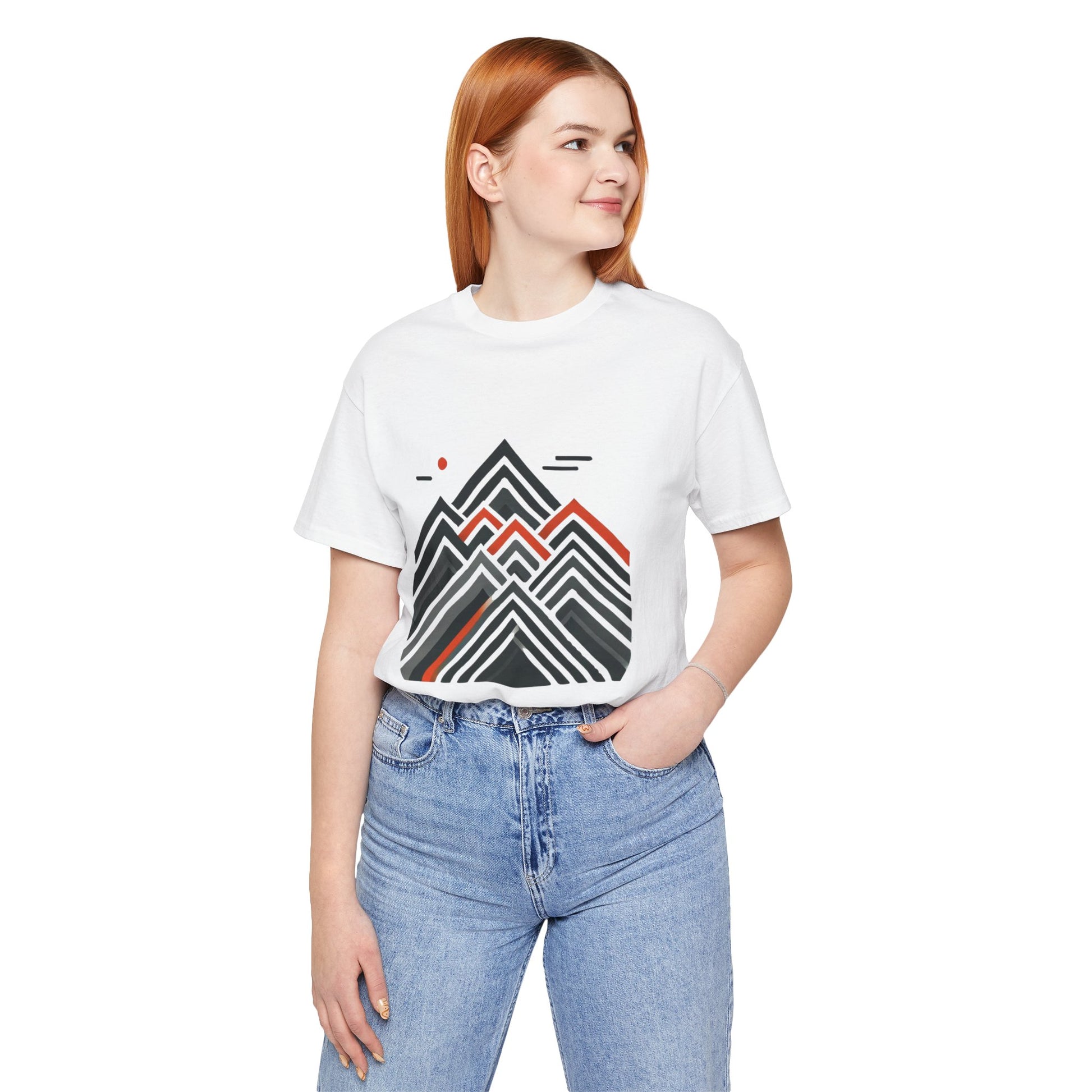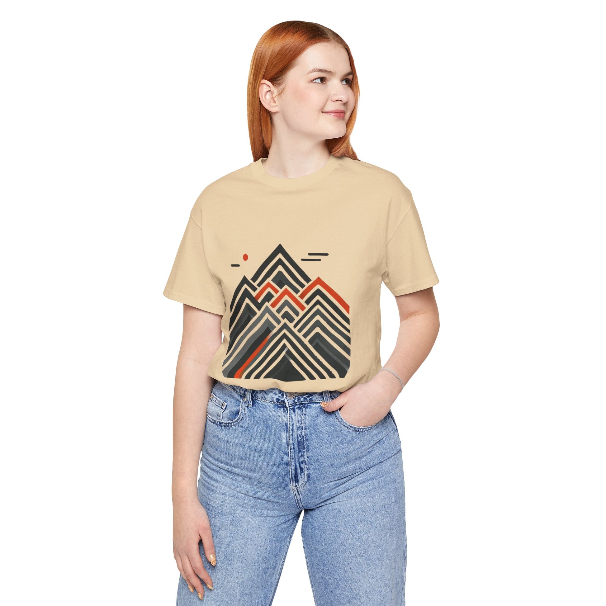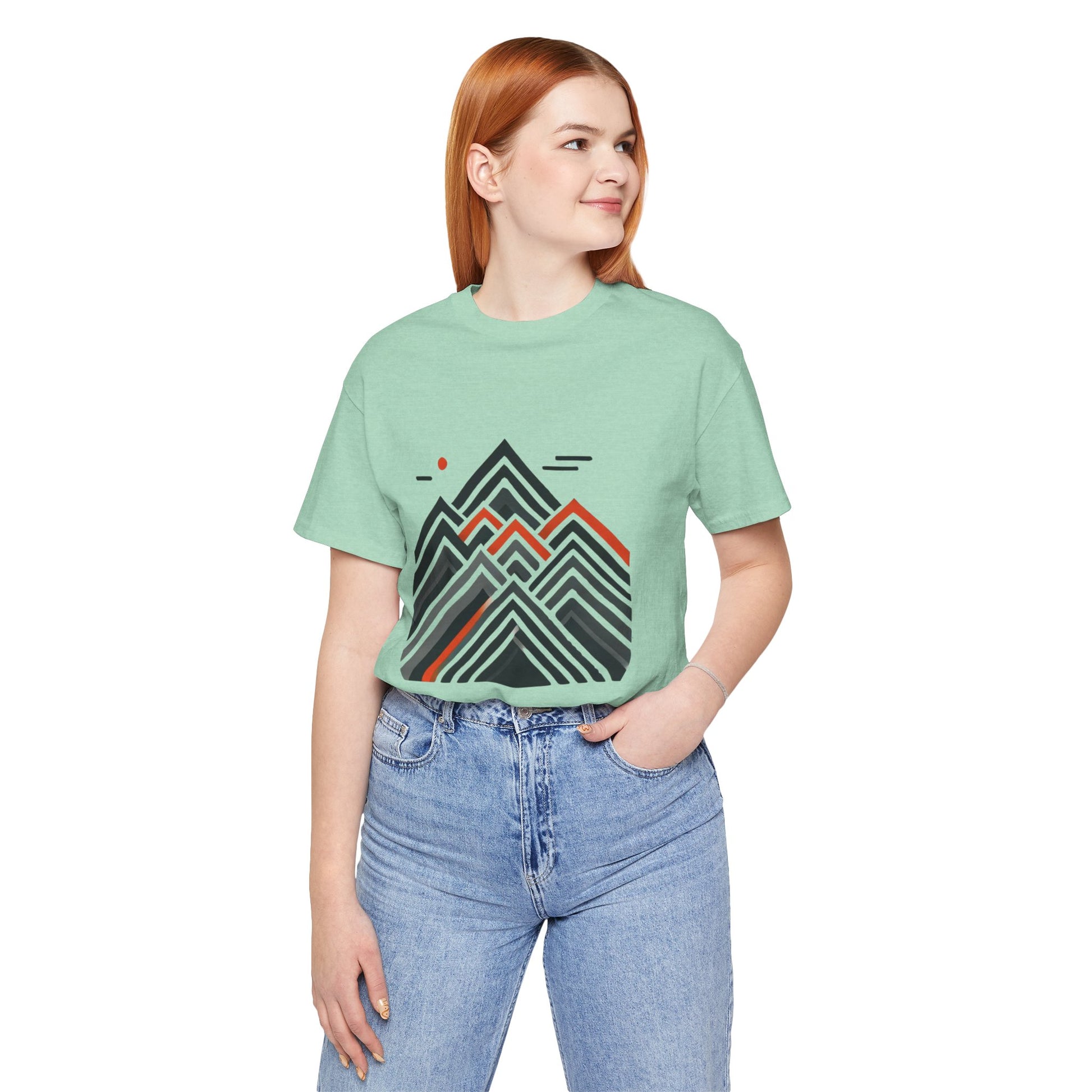 Simplified mountain peaks made of triangular shapes with bold orange accents and clean lines.