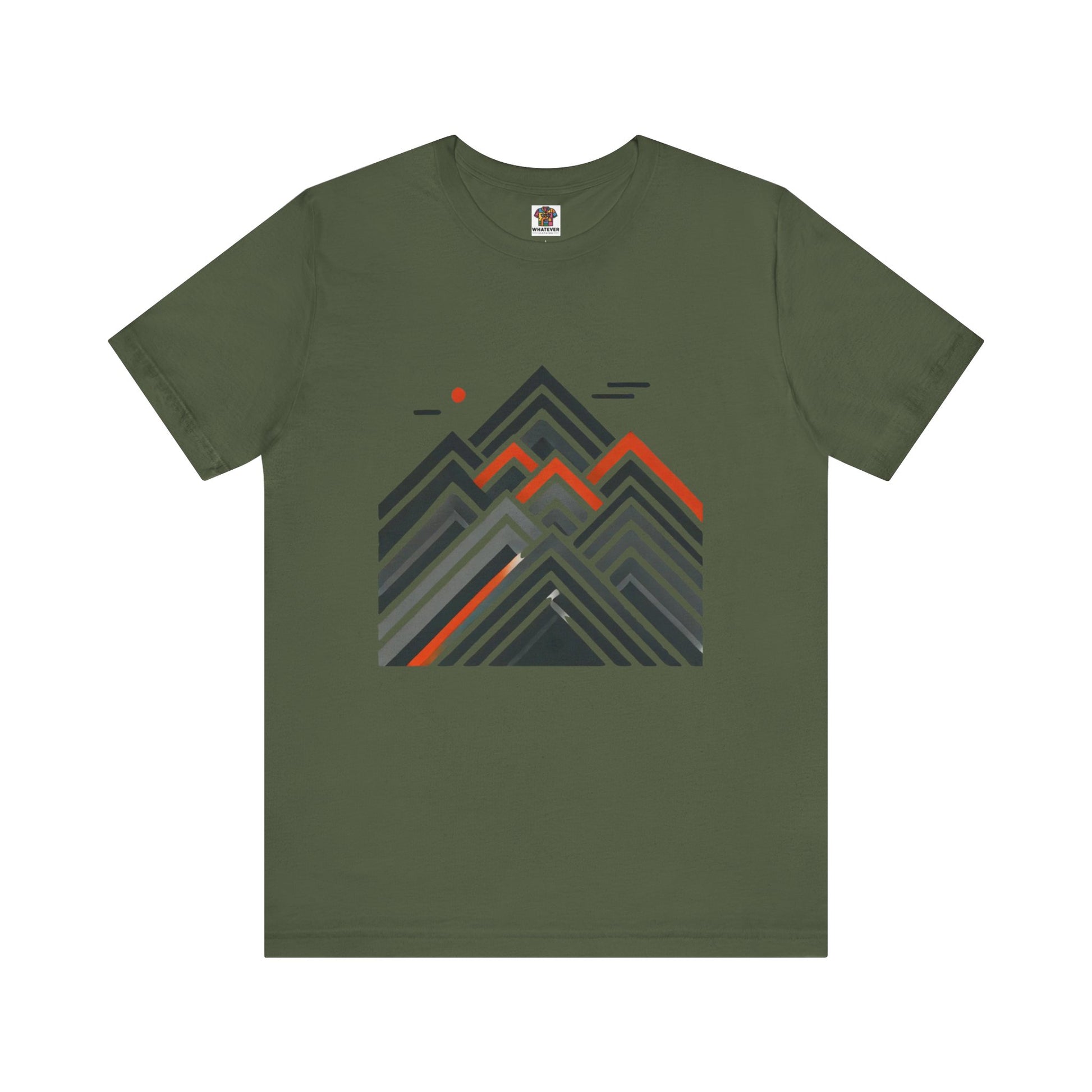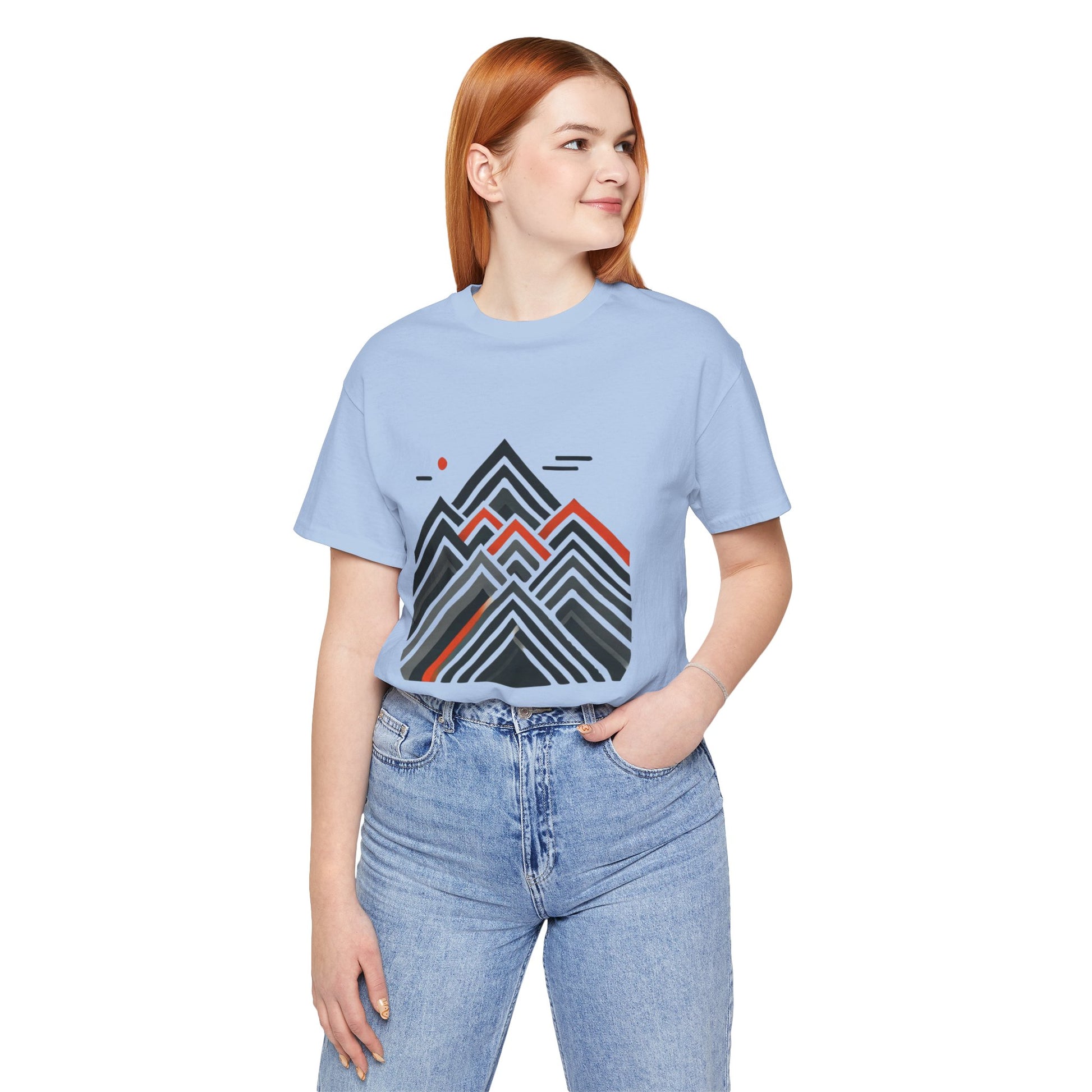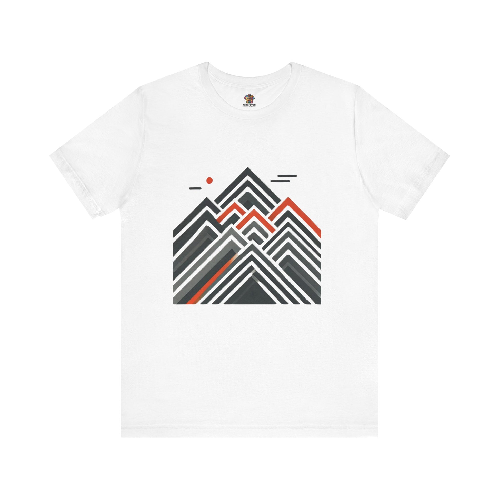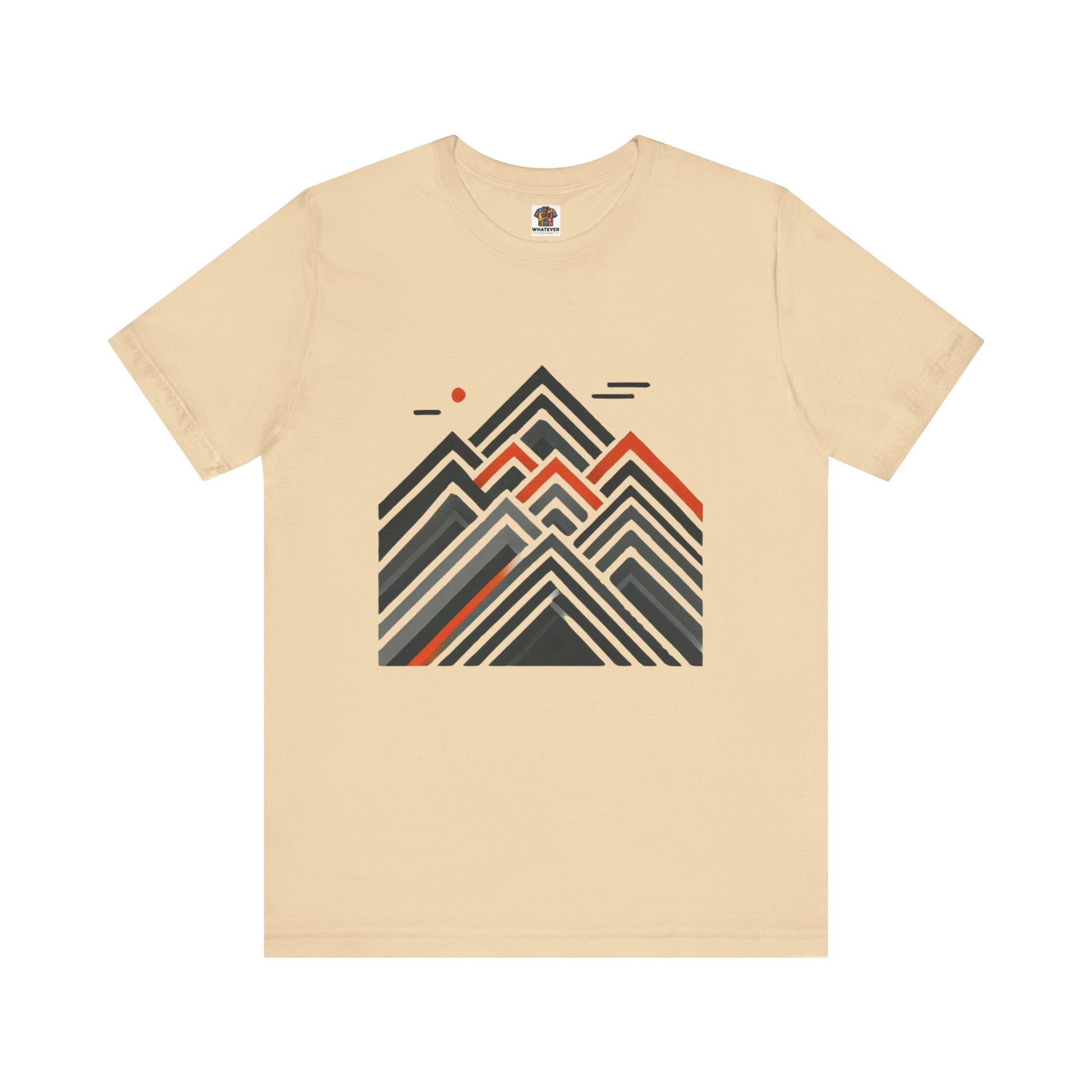 Simplified mountain peaks made of triangular shapes with bold orange accents and clean lines.