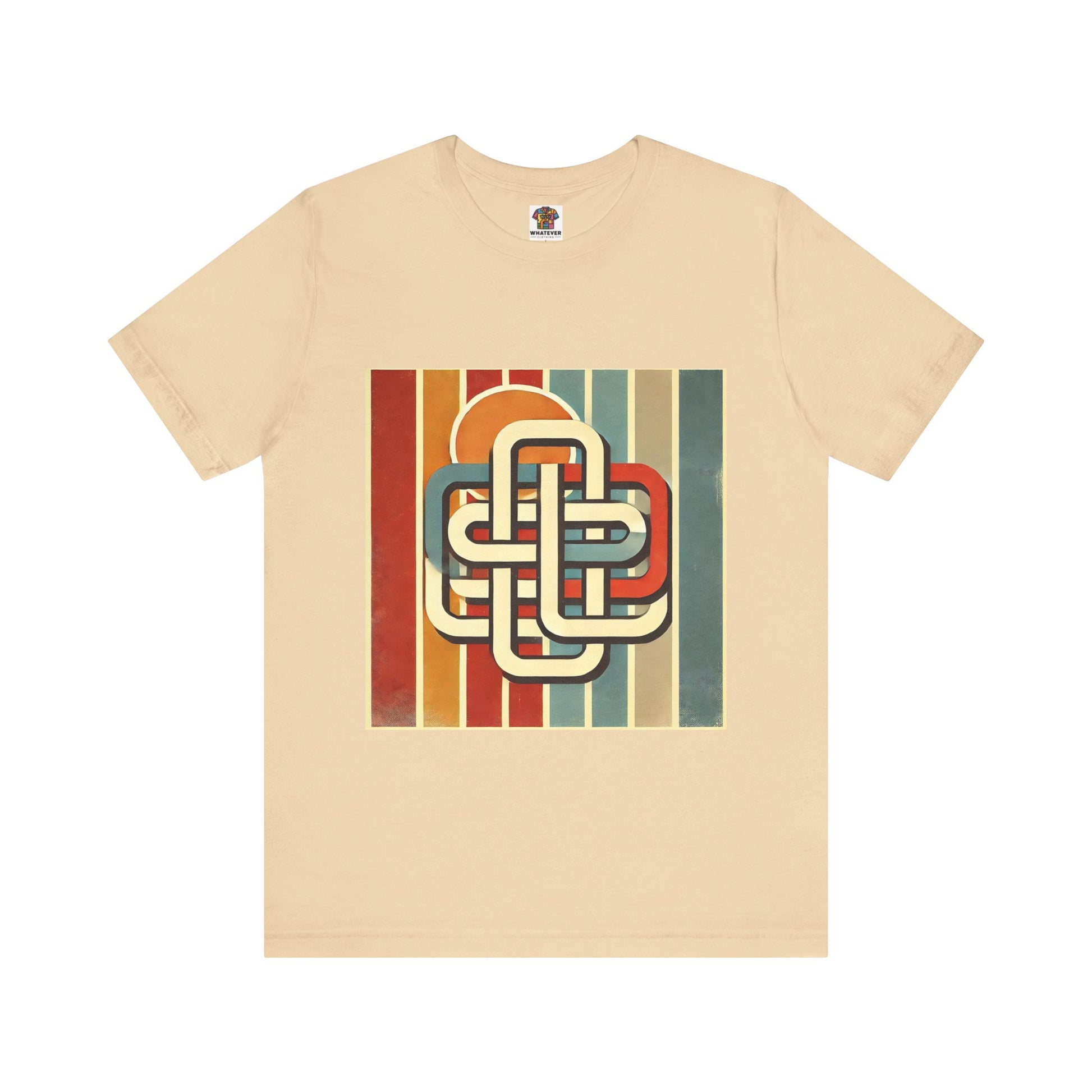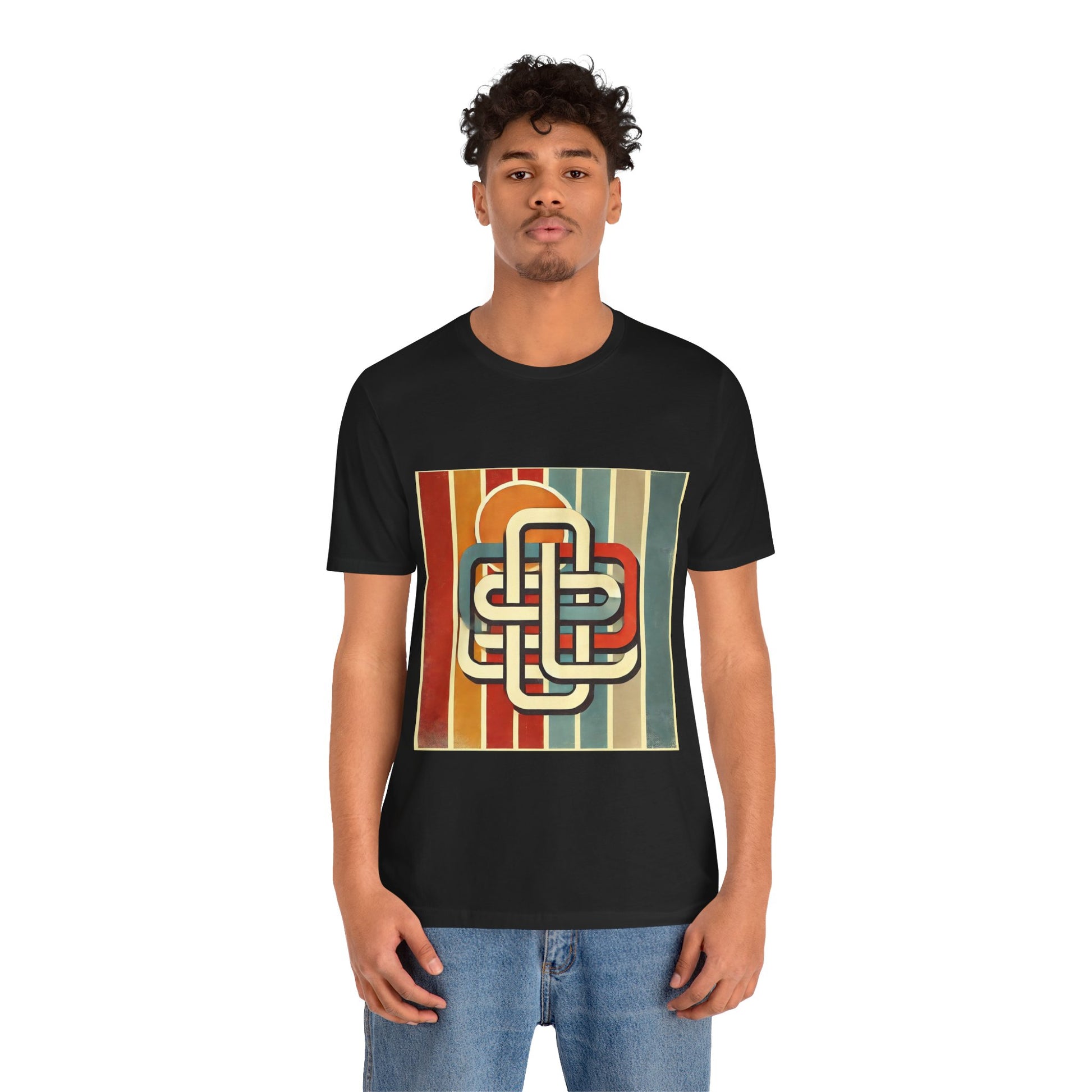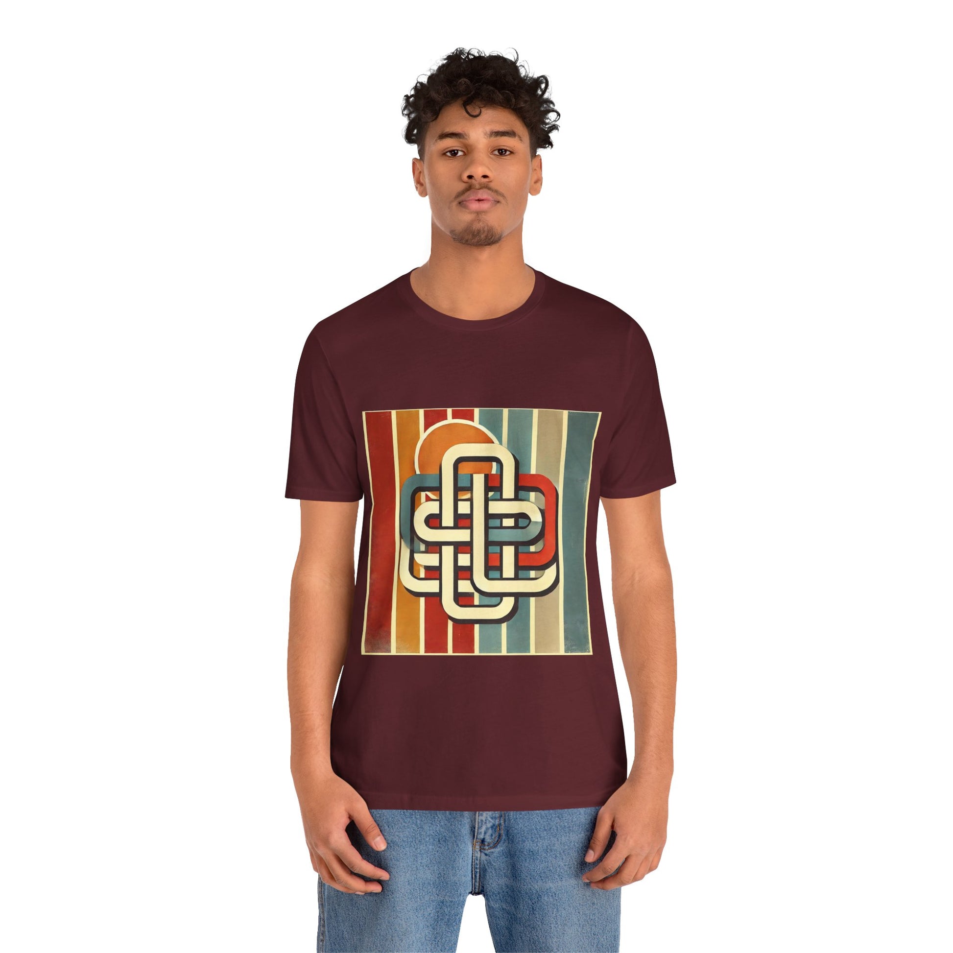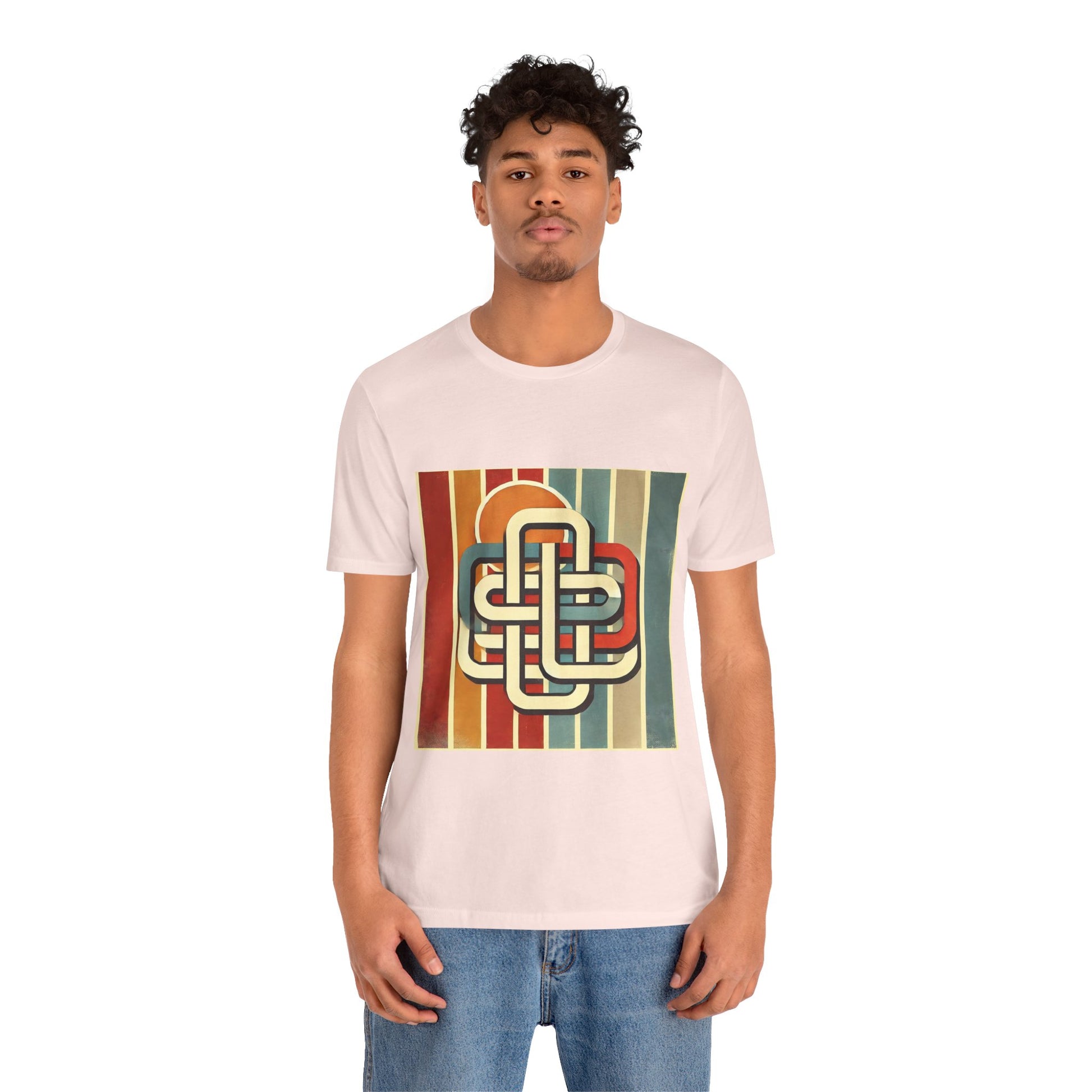 A series of interlocking abstract shapes in bold lines, set against a gradient background with muted retro colors and a grainy texture.