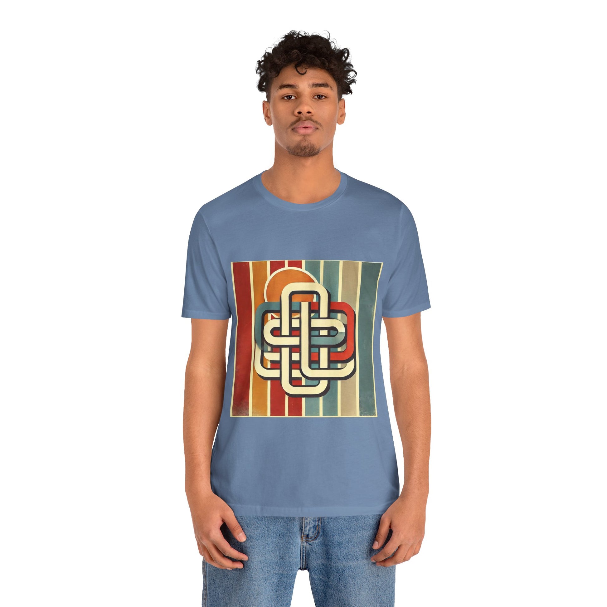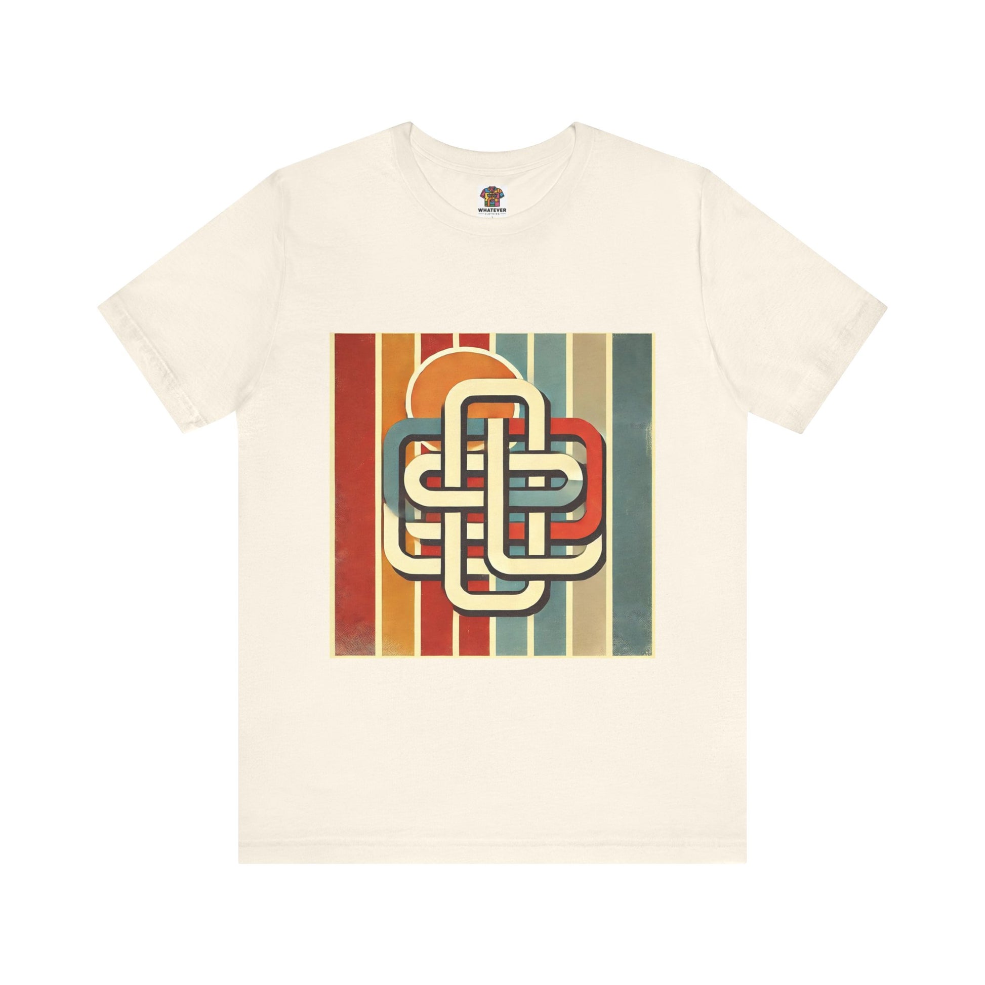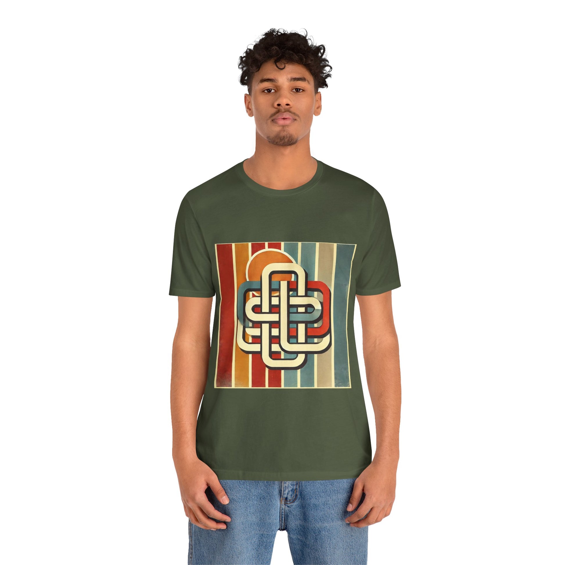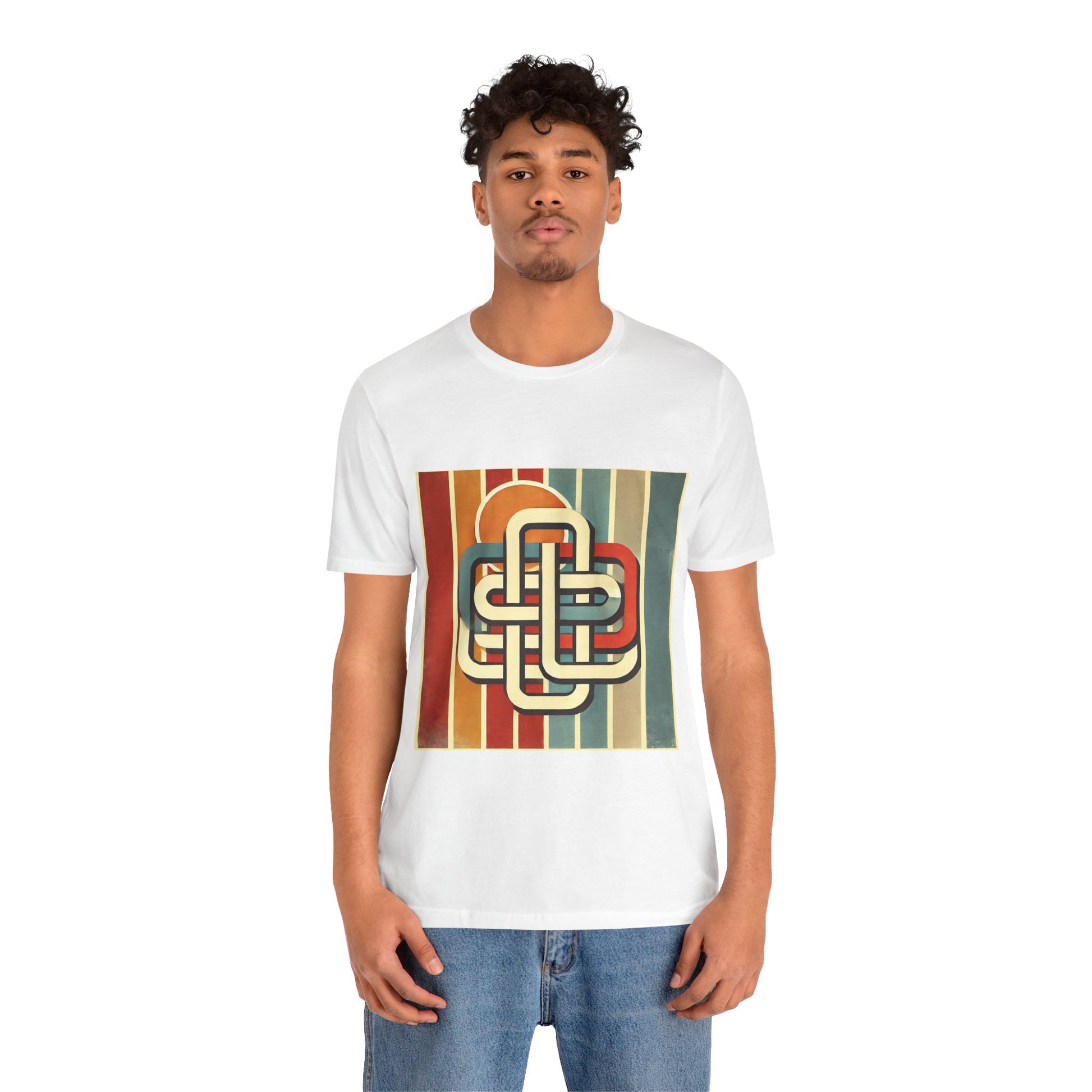 A series of interlocking abstract shapes in bold lines, set against a gradient background with muted retro colors and a grainy texture.