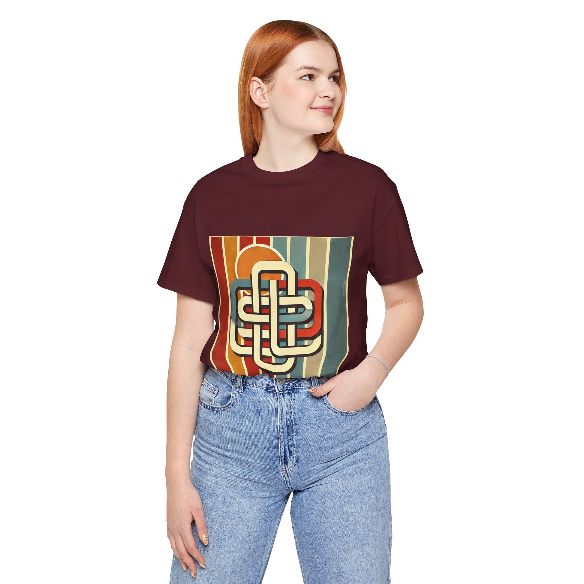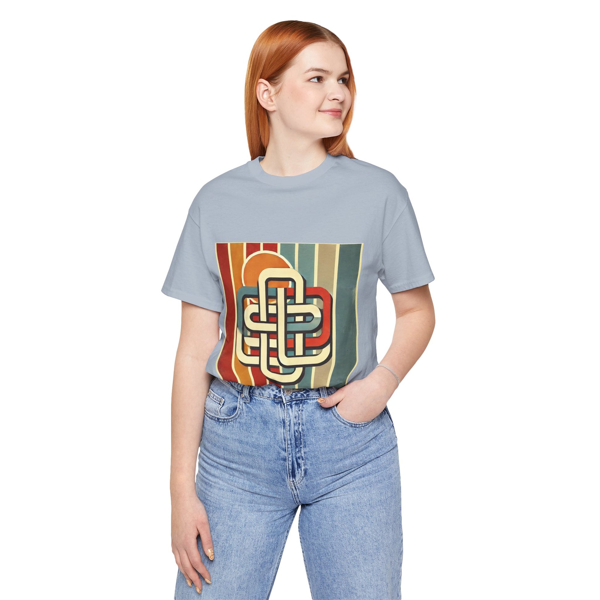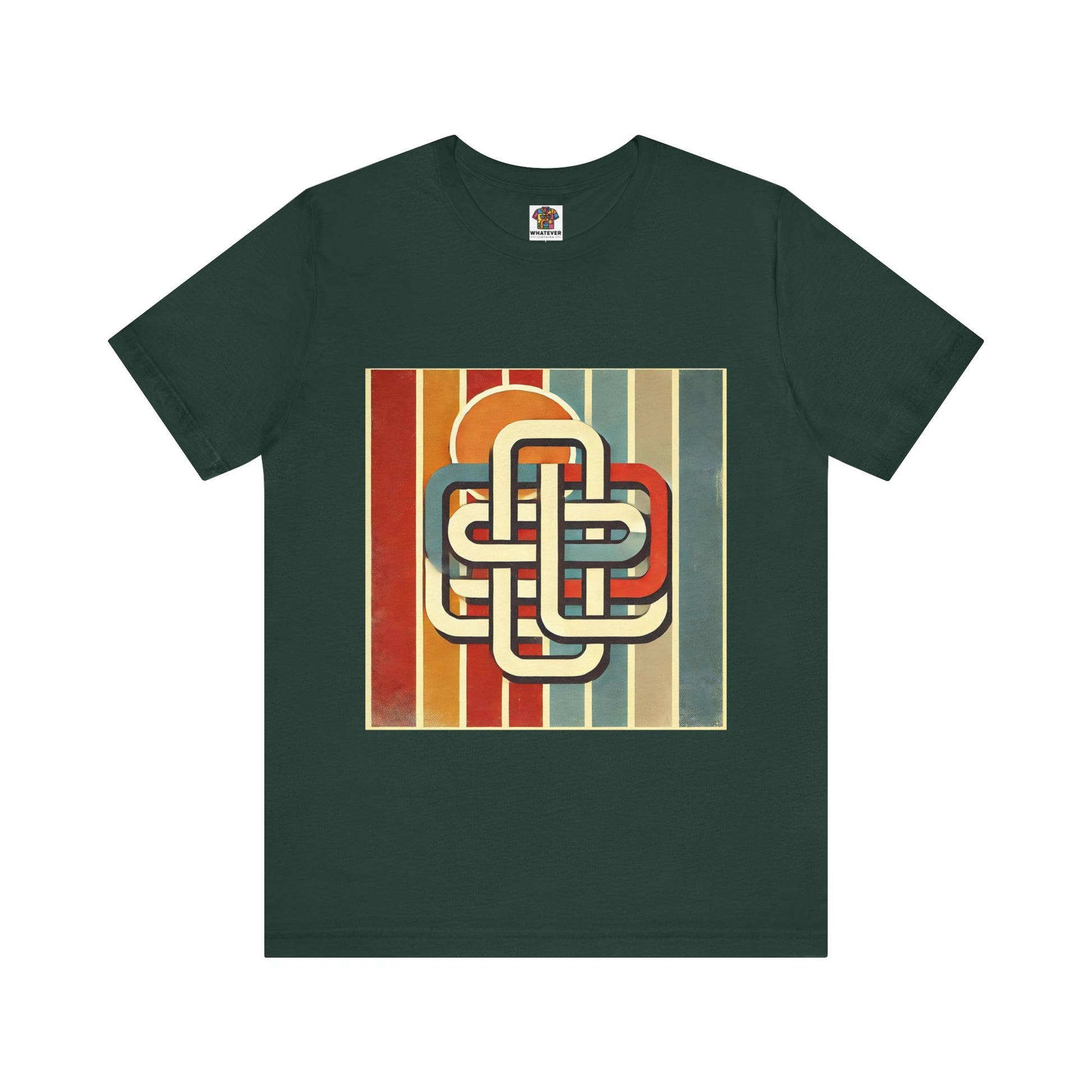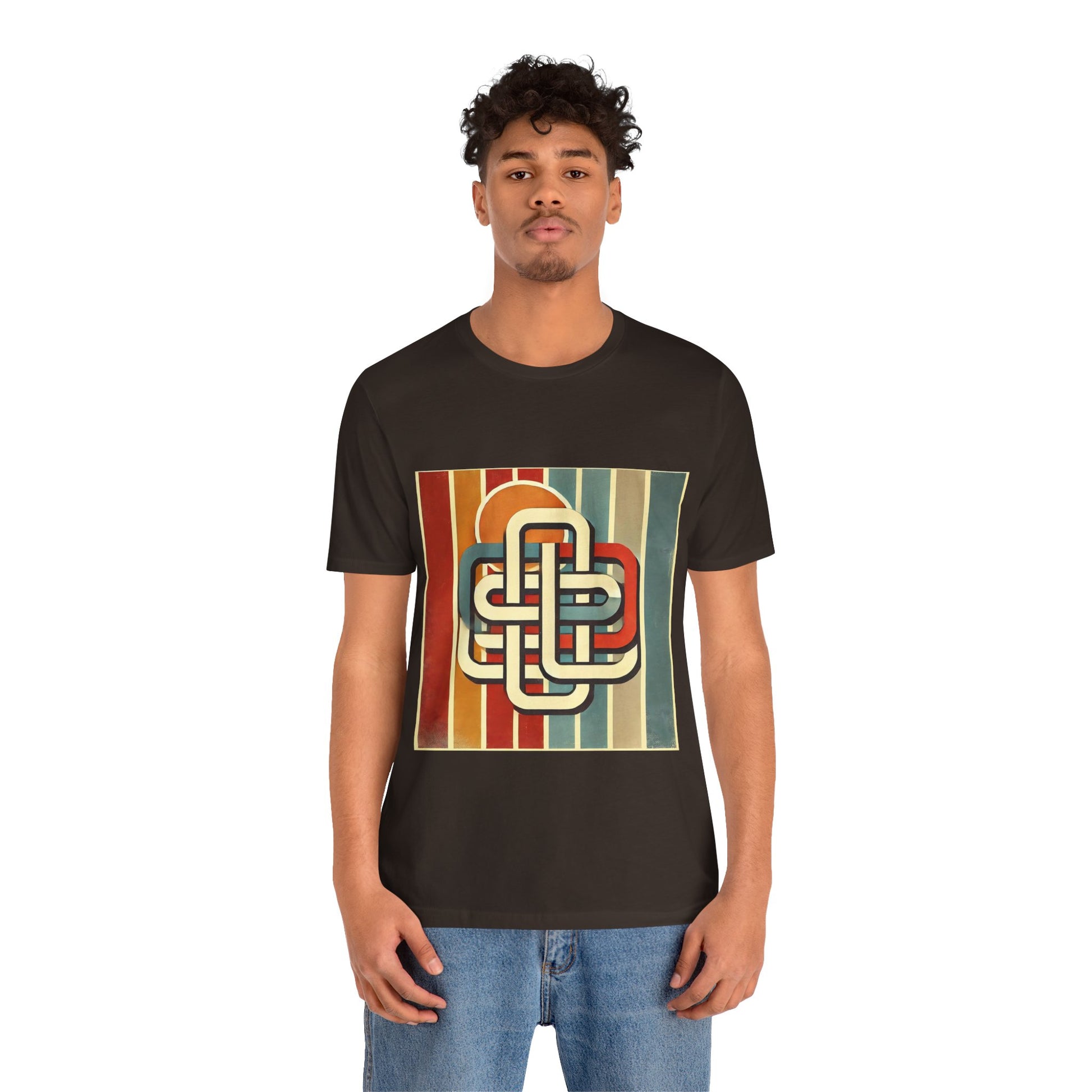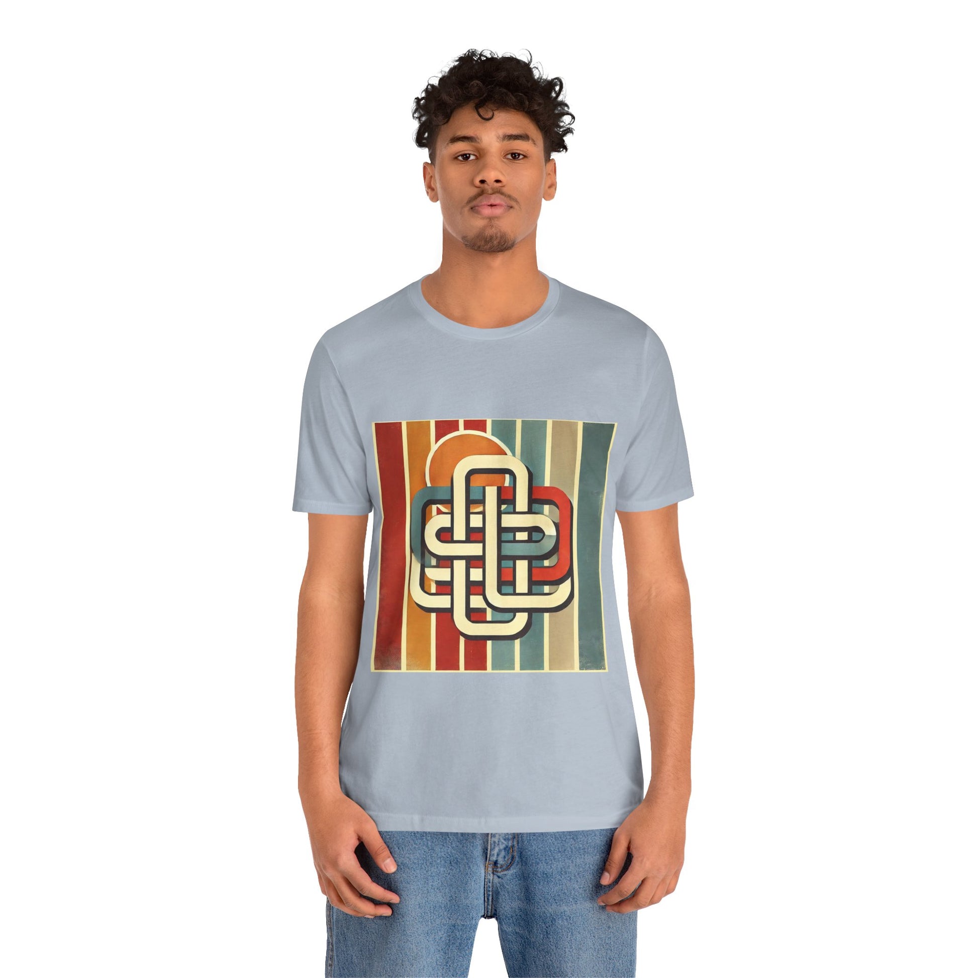 A series of interlocking abstract shapes in bold lines, set against a gradient background with muted retro colors and a grainy texture.