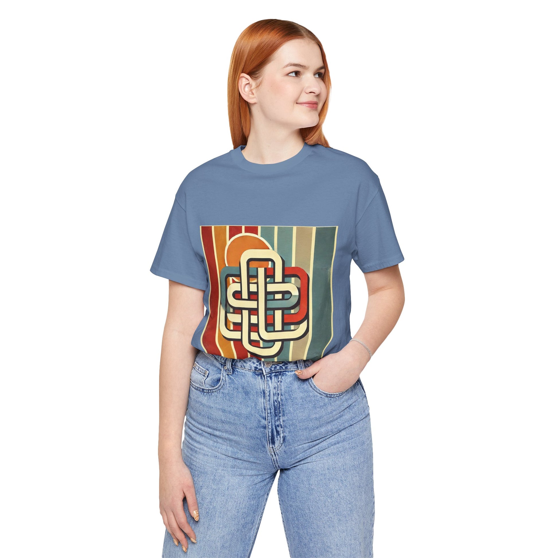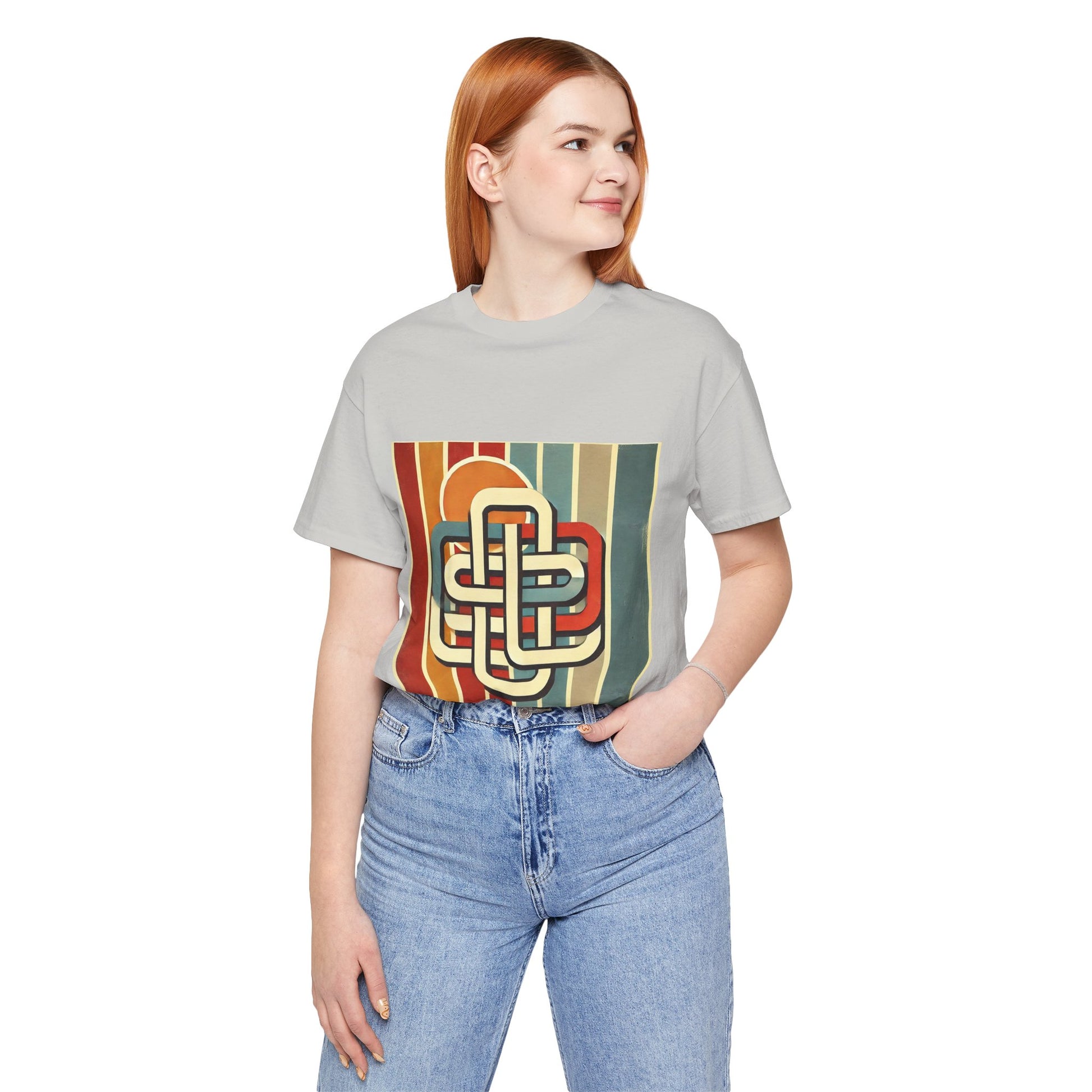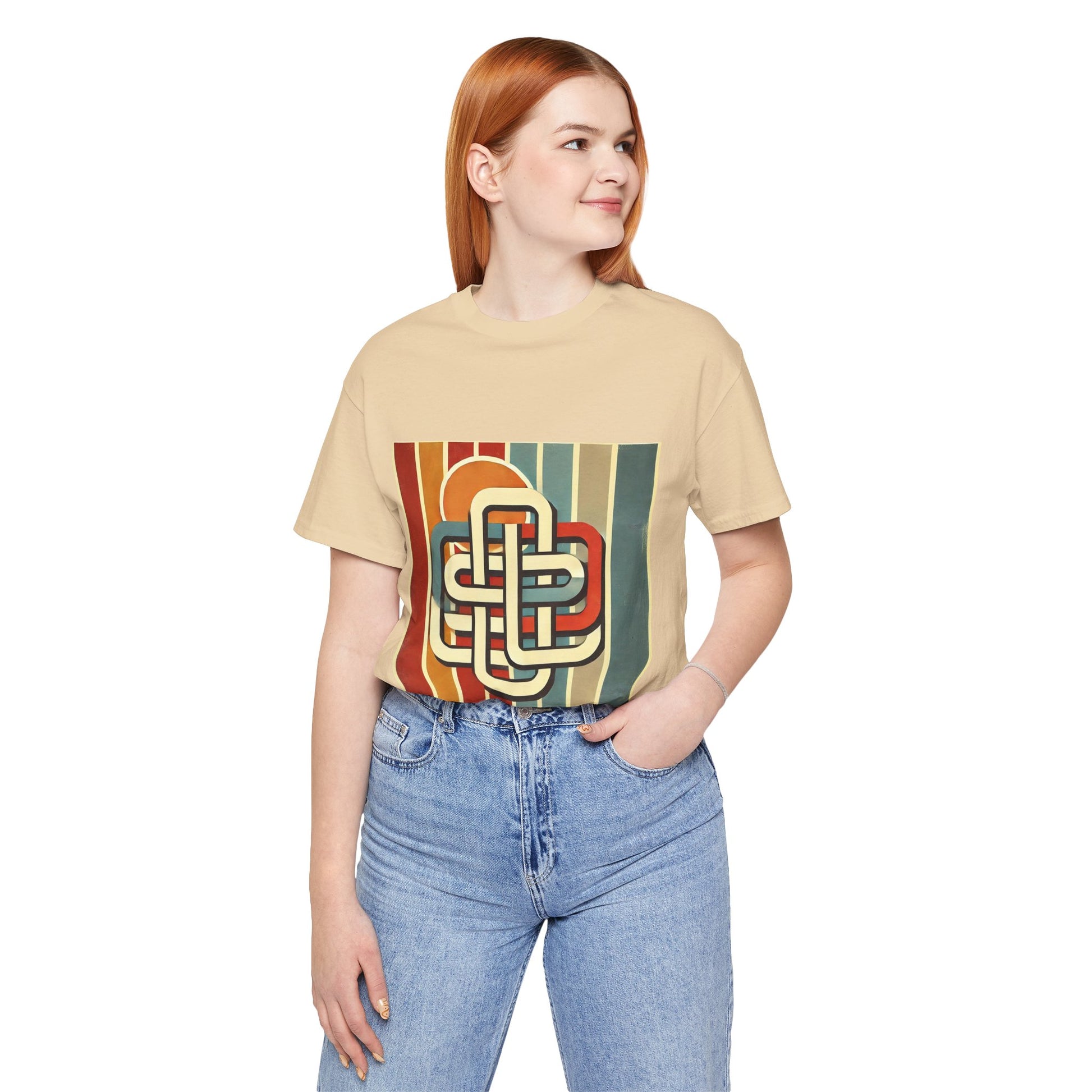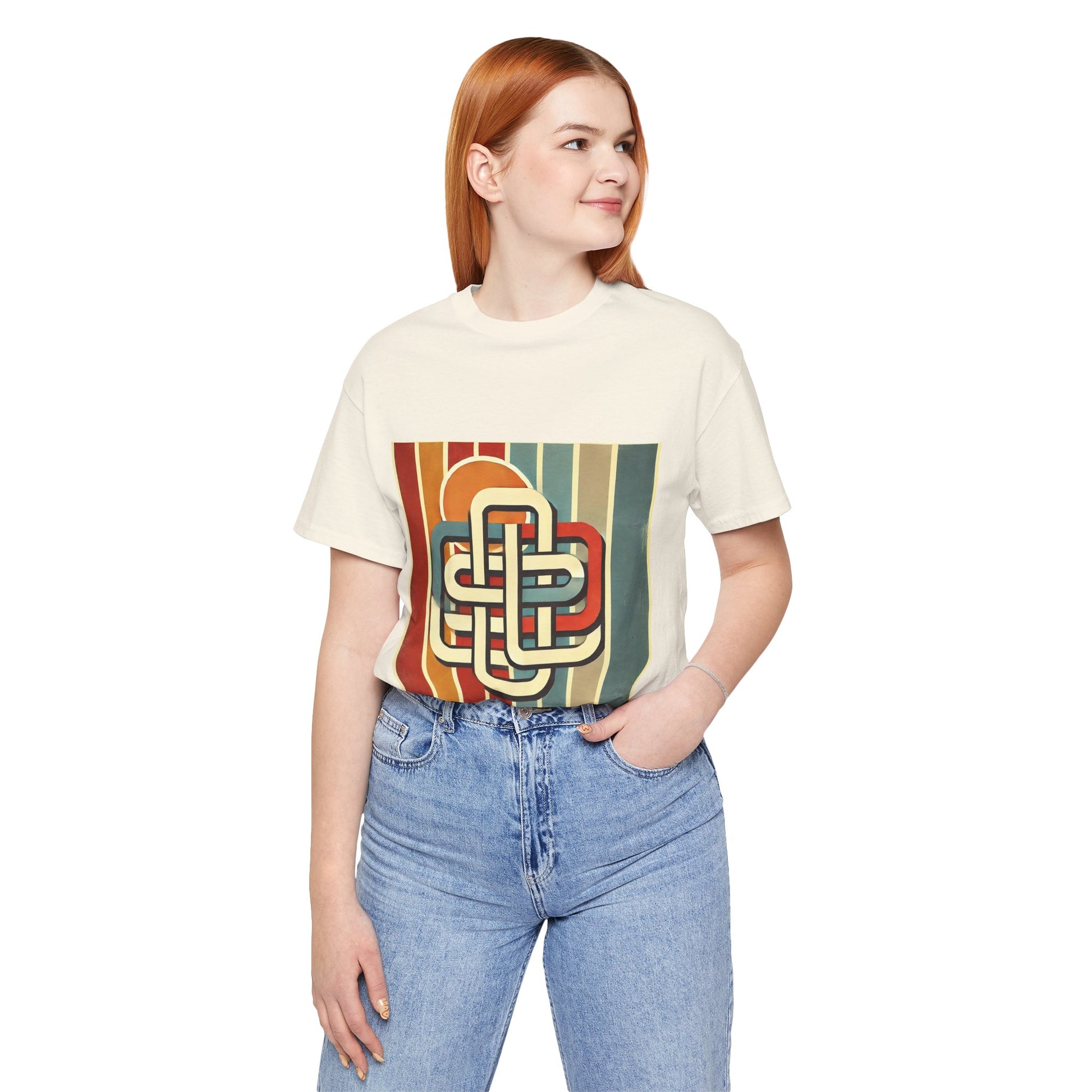 A series of interlocking abstract shapes in bold lines, set against a gradient background with muted retro colors and a grainy texture.