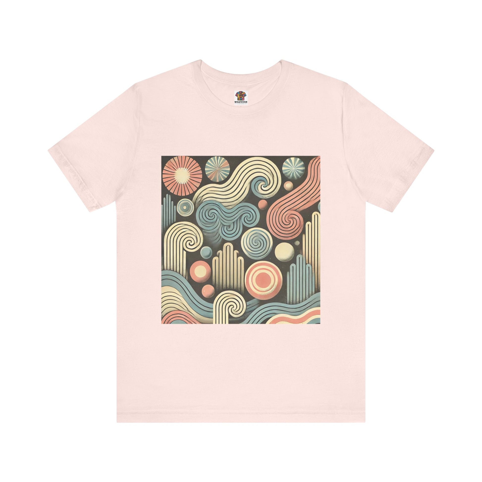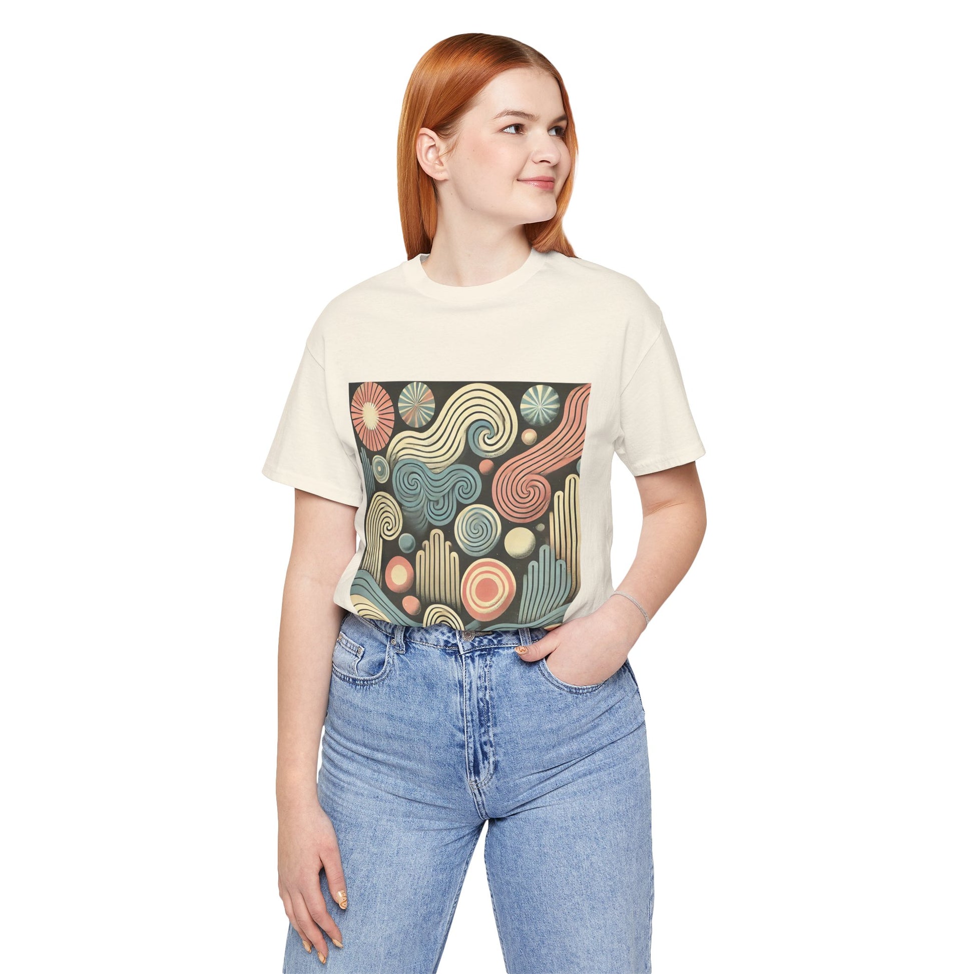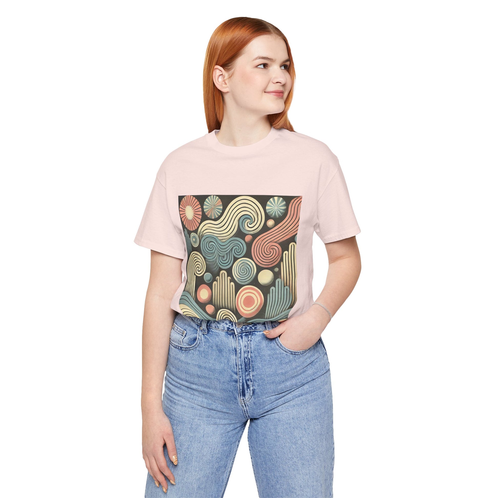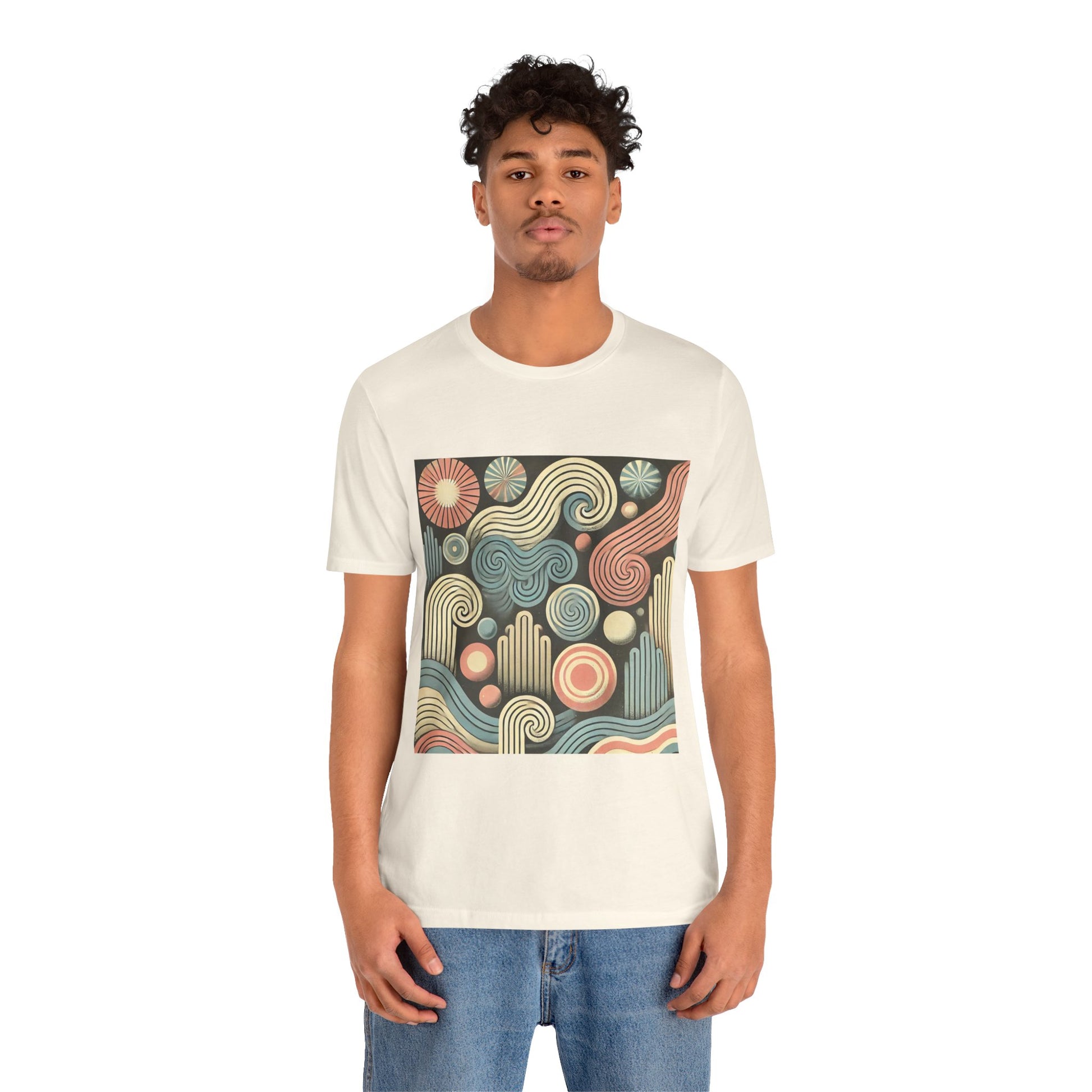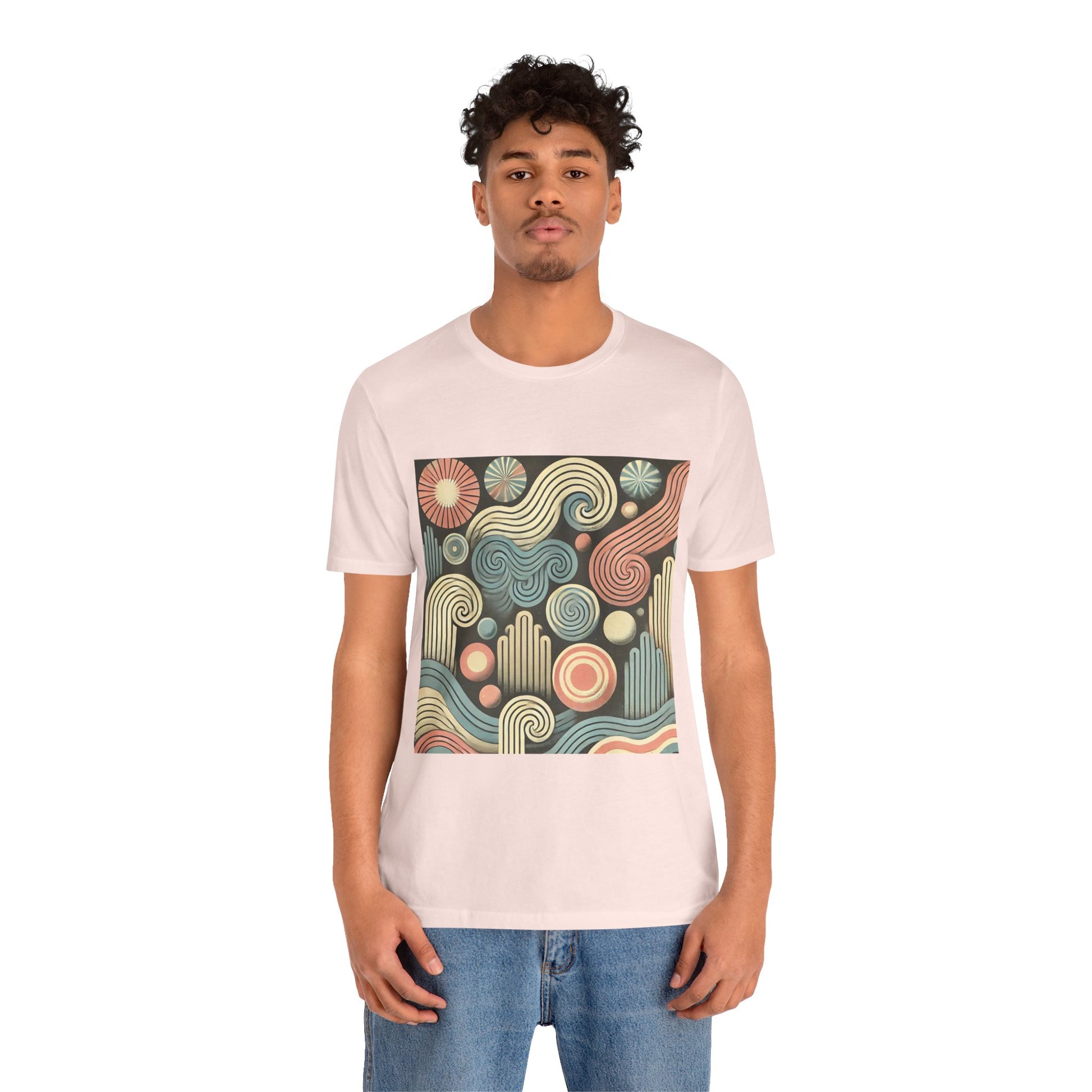 Abstract objects like waves and spirals in pastel colors, adding a dynamic, groovy touch to the retro design with a vintage feel.