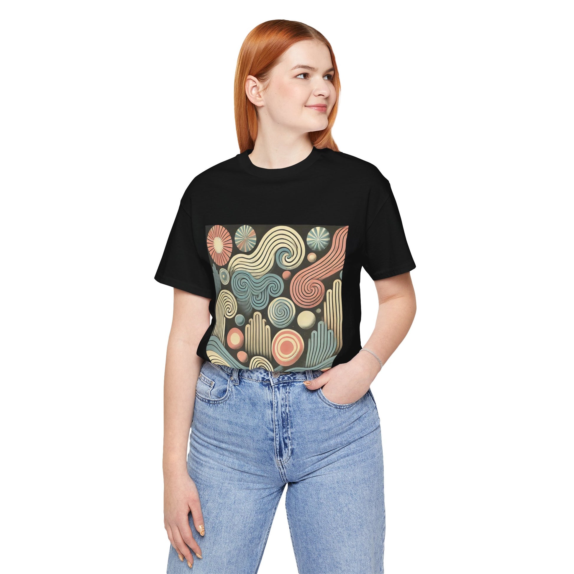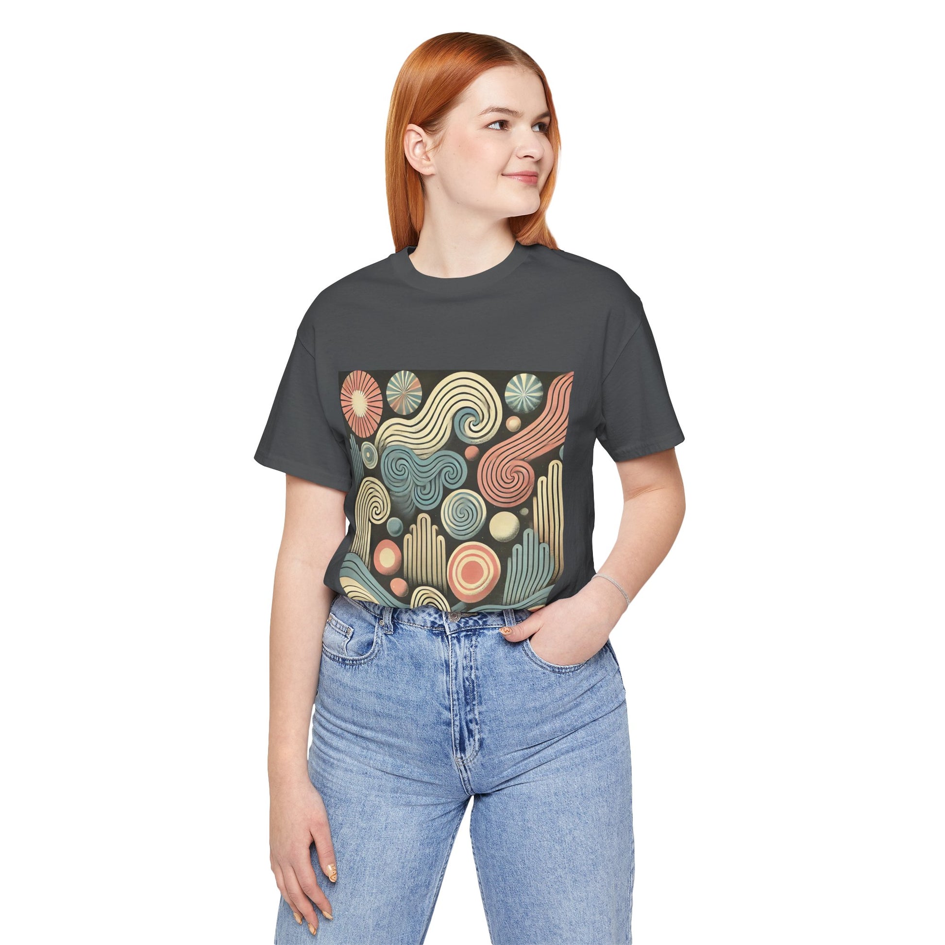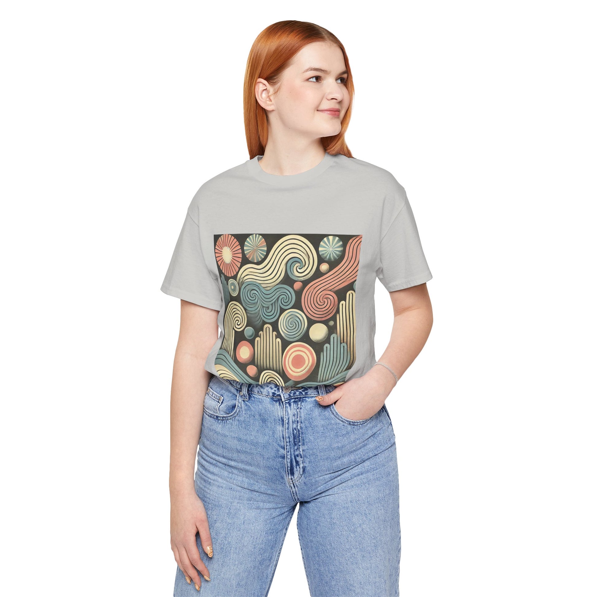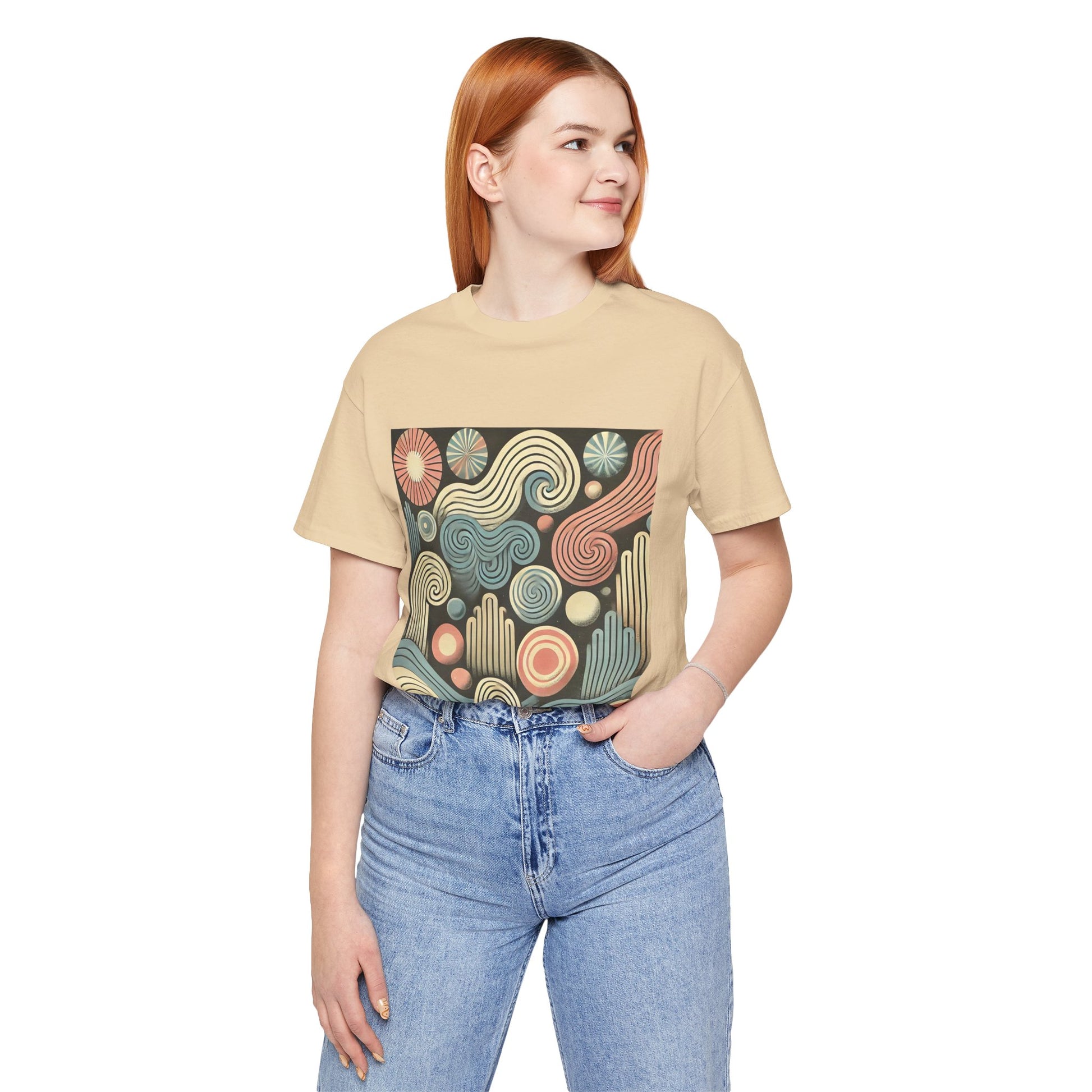 Abstract objects like waves and spirals in pastel colors, adding a dynamic, groovy touch to the retro design with a vintage feel.