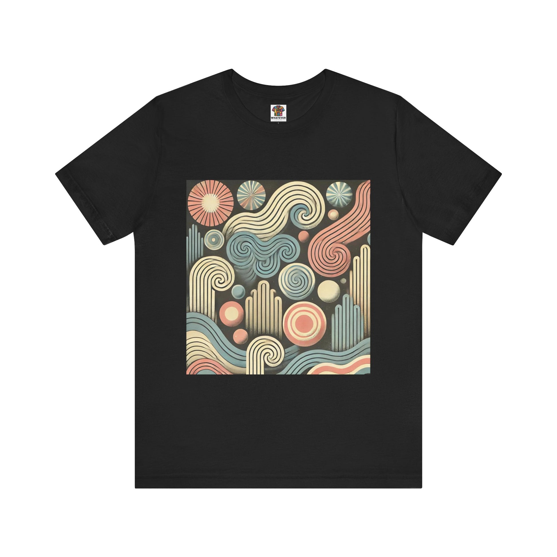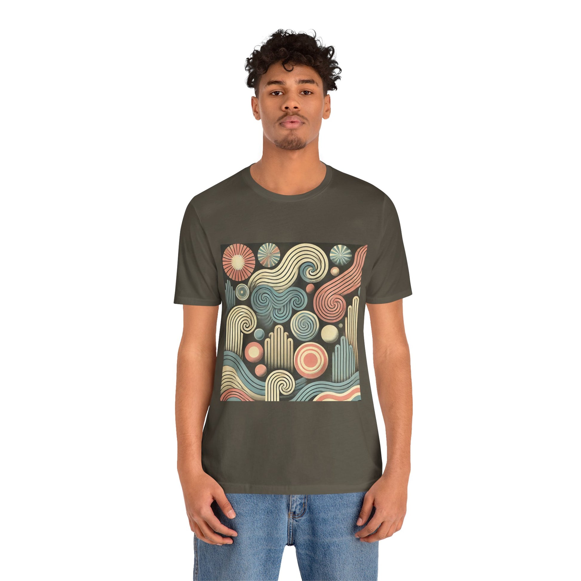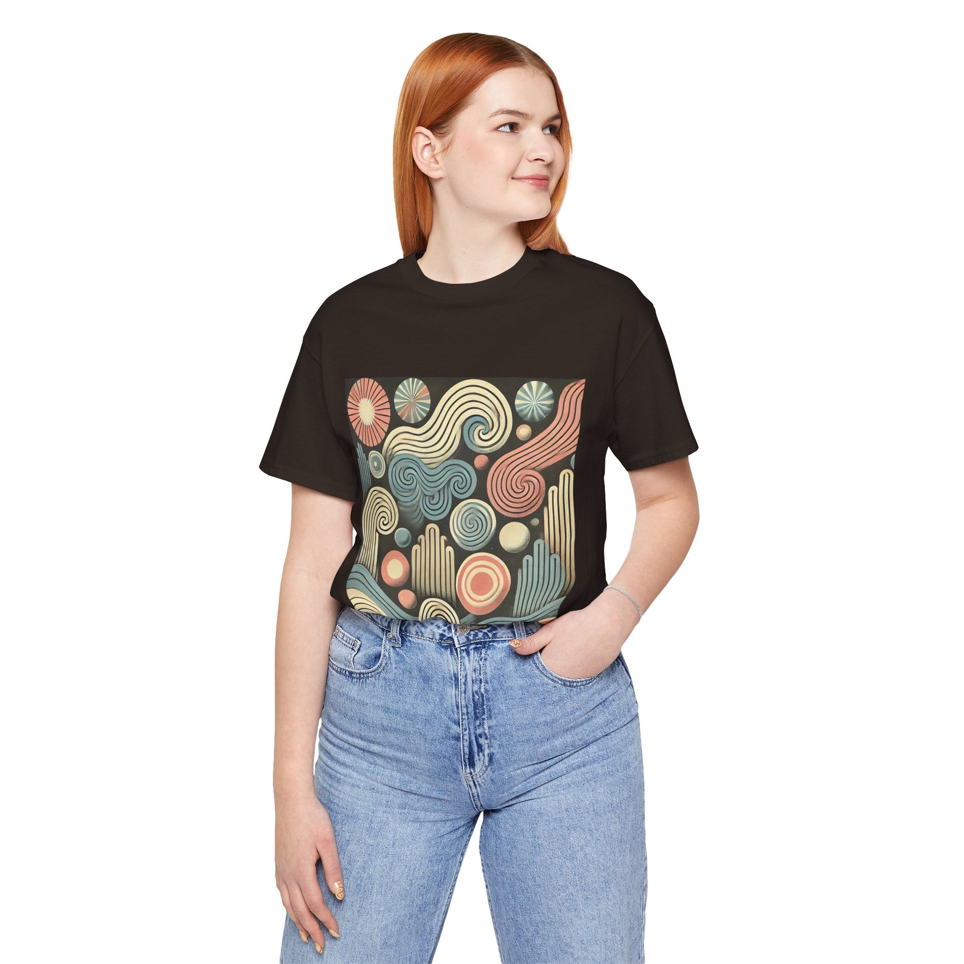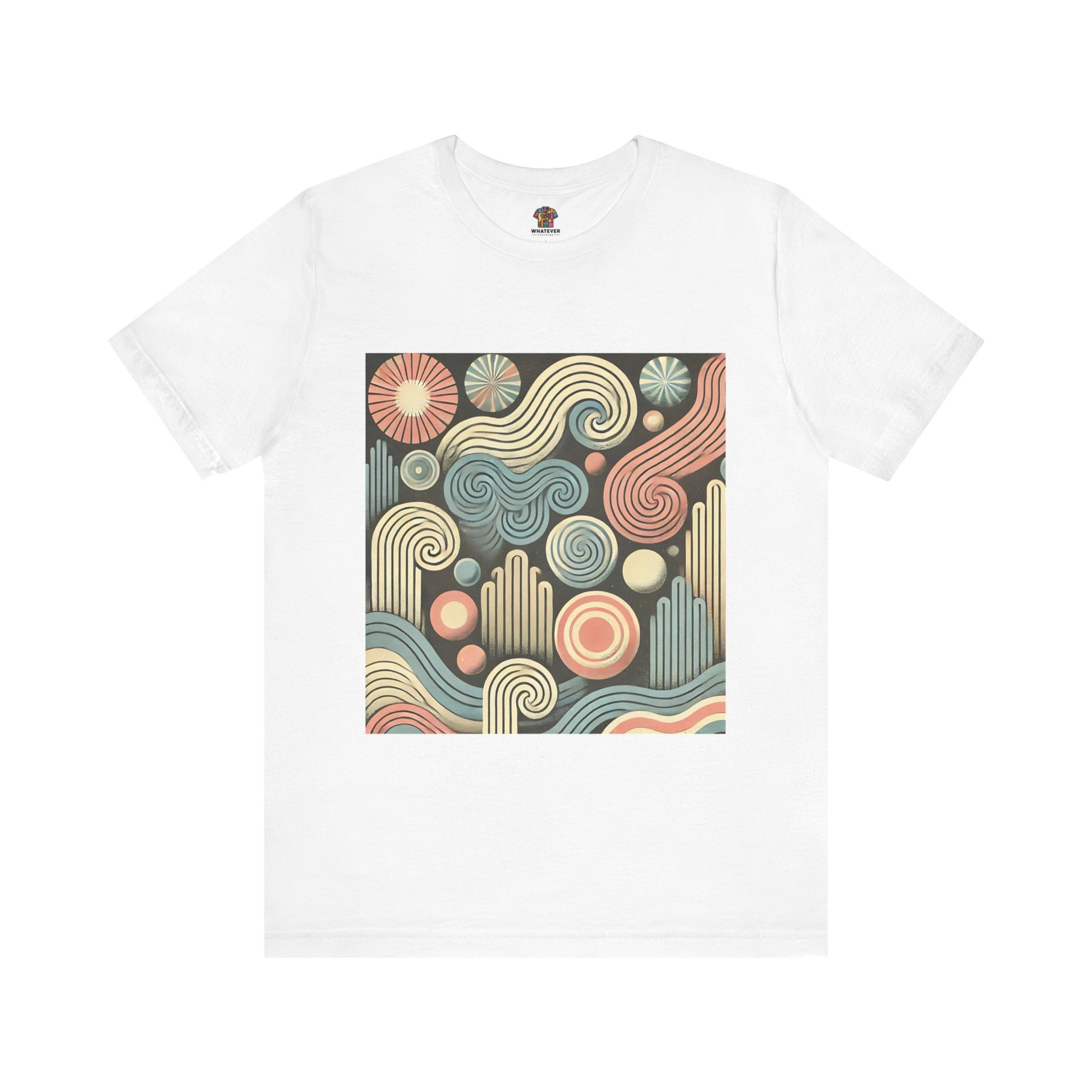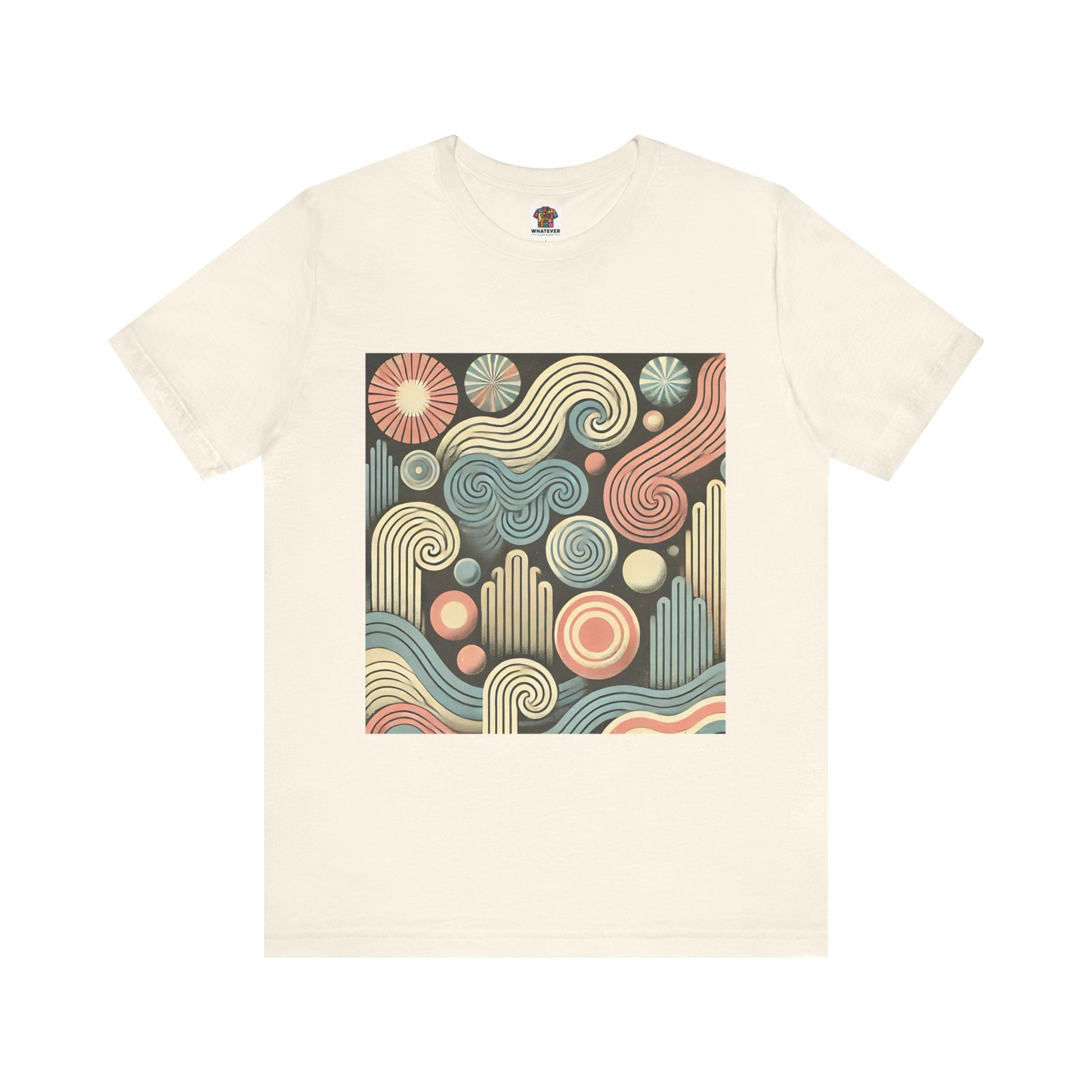 Abstract objects like waves and spirals in pastel colors, adding a dynamic, groovy touch to the retro design with a vintage feel.