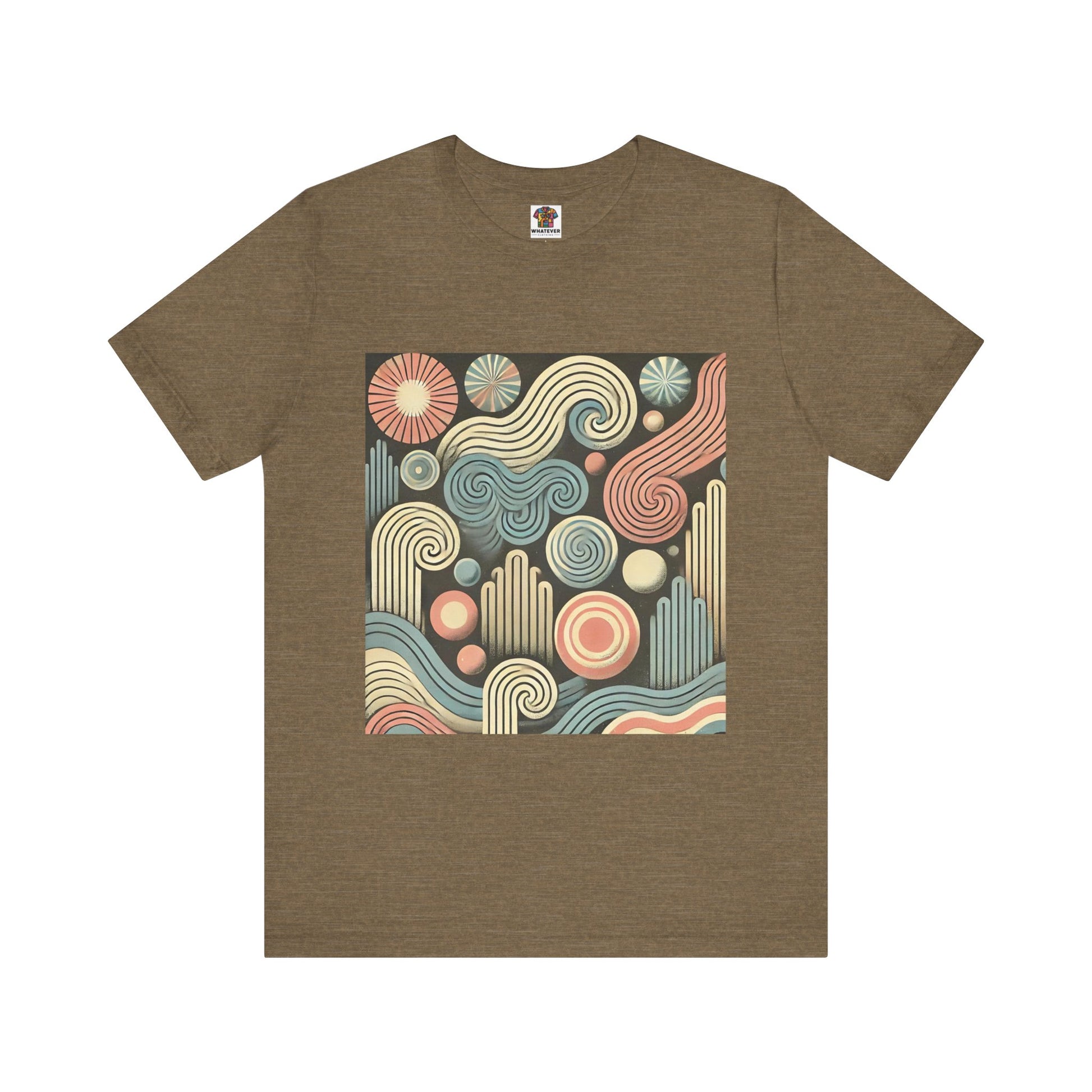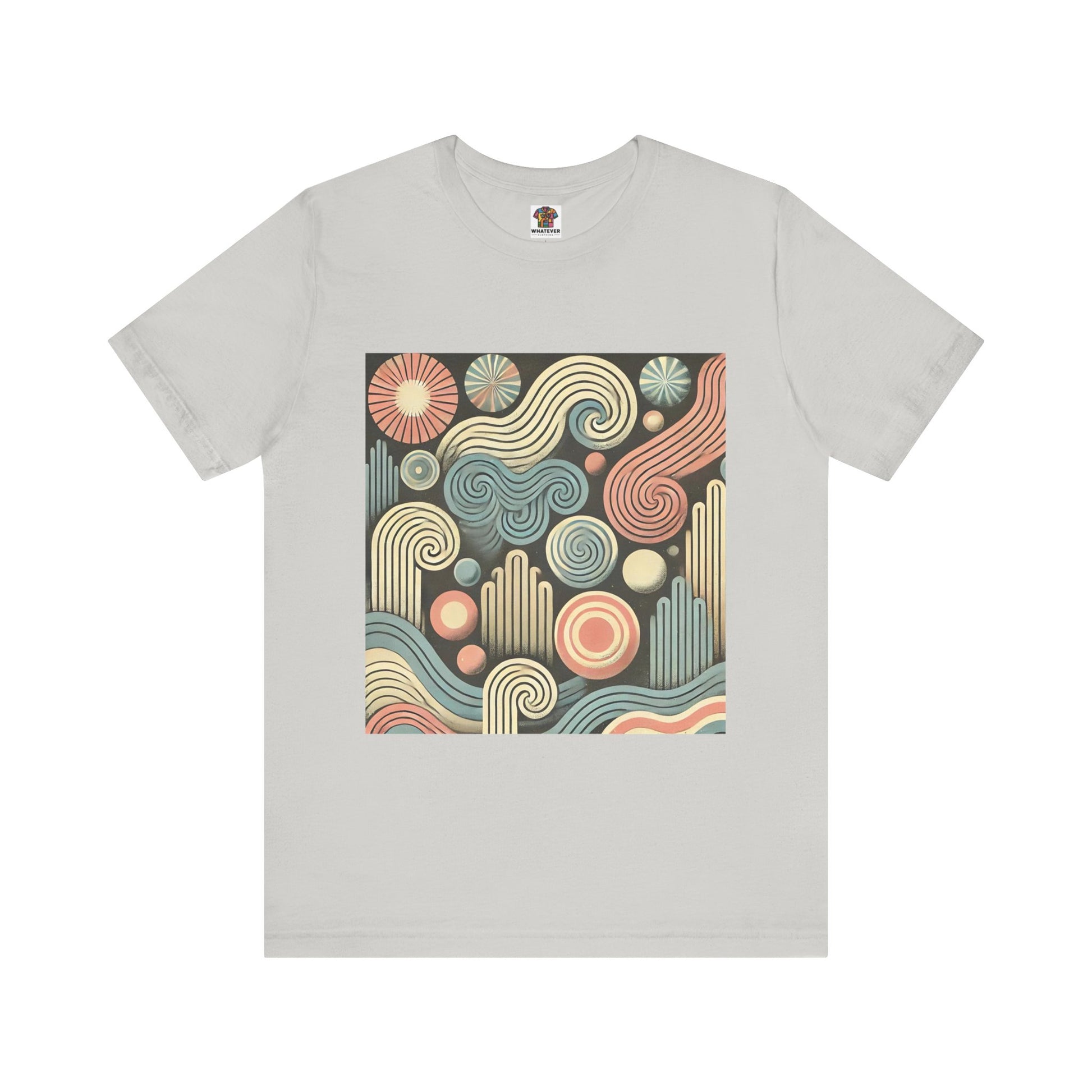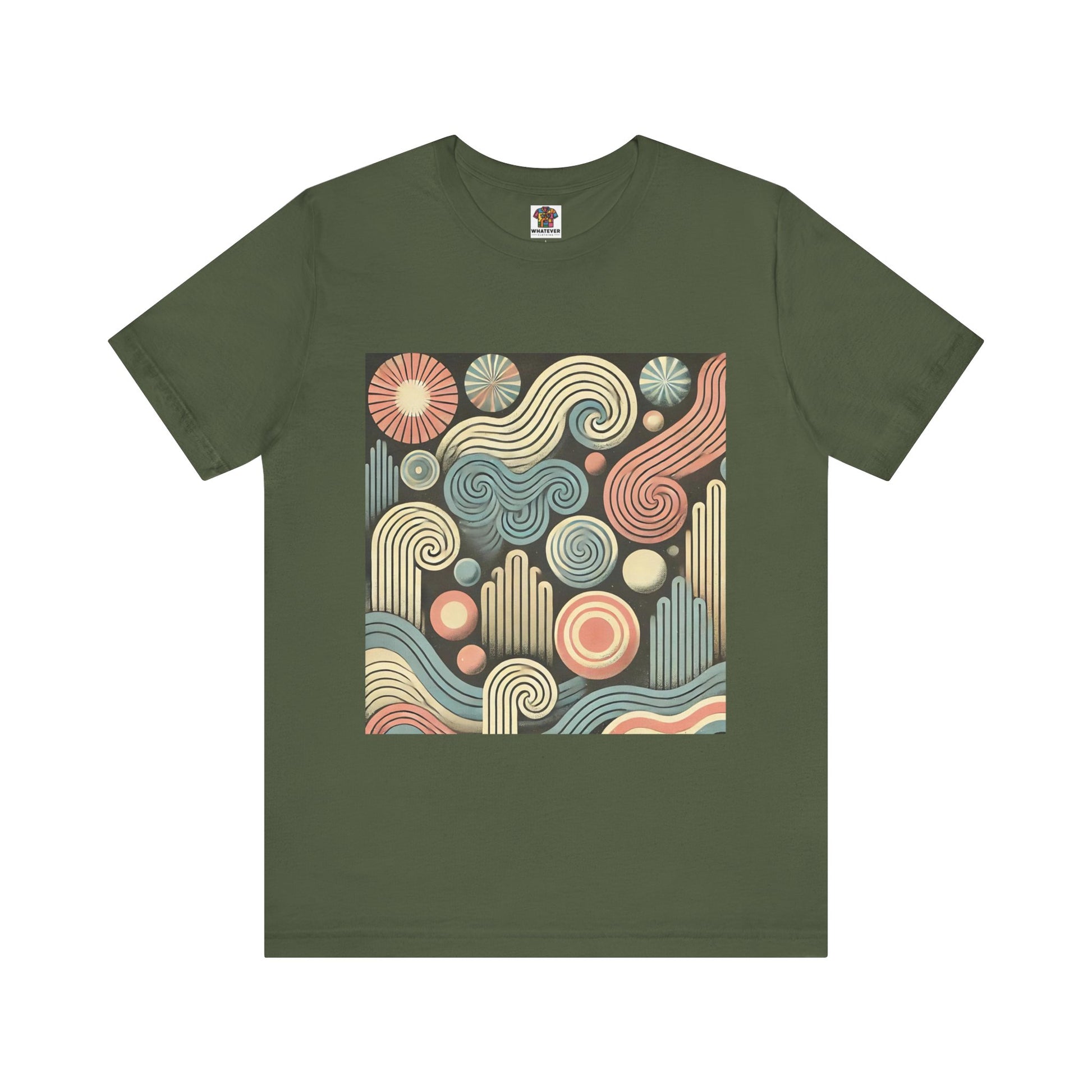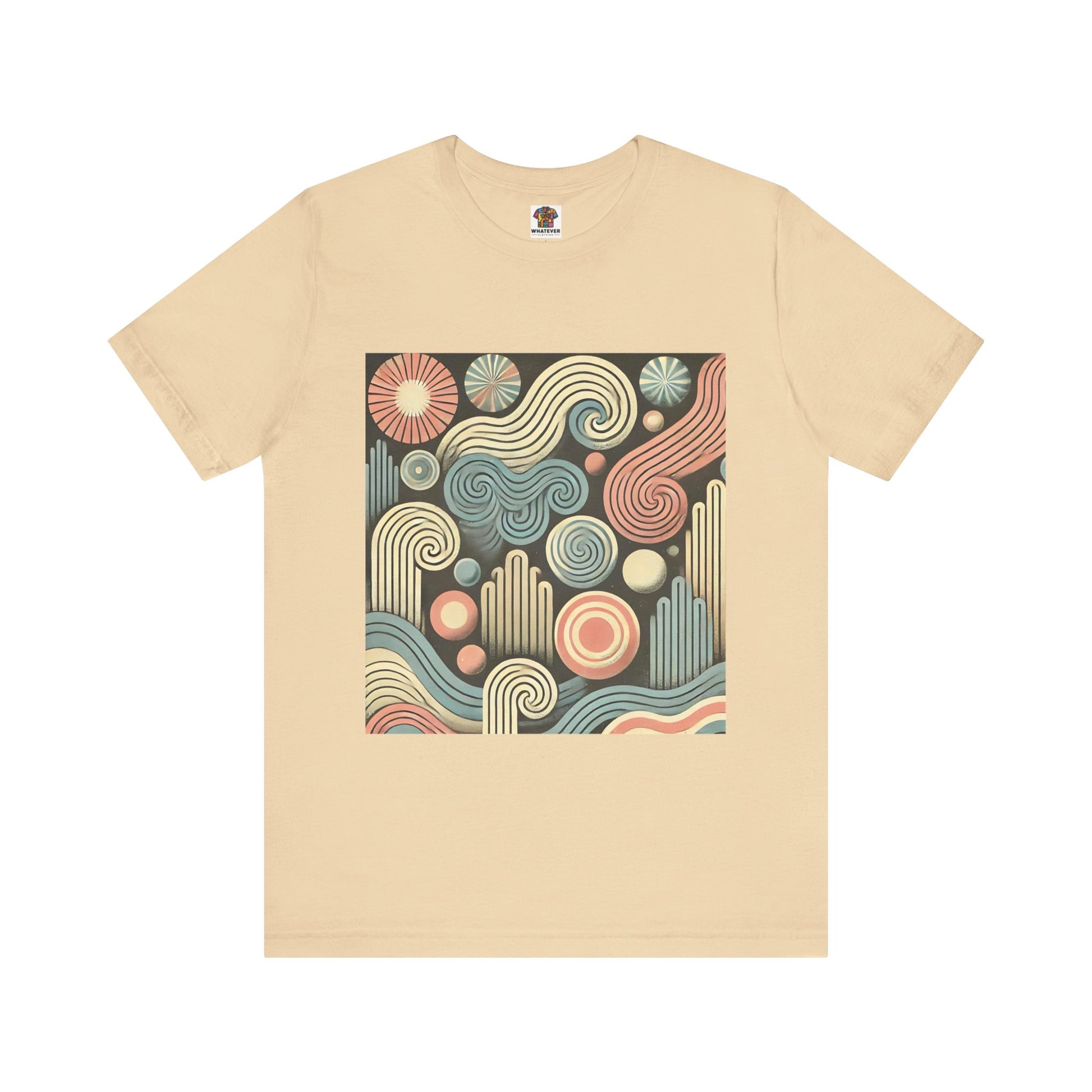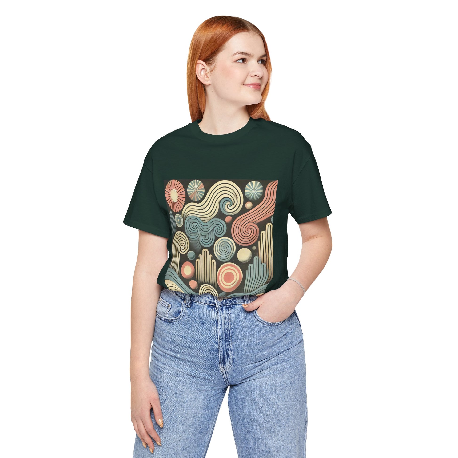 Abstract objects like waves and spirals in pastel colors, adding a dynamic, groovy touch to the retro design with a vintage feel.