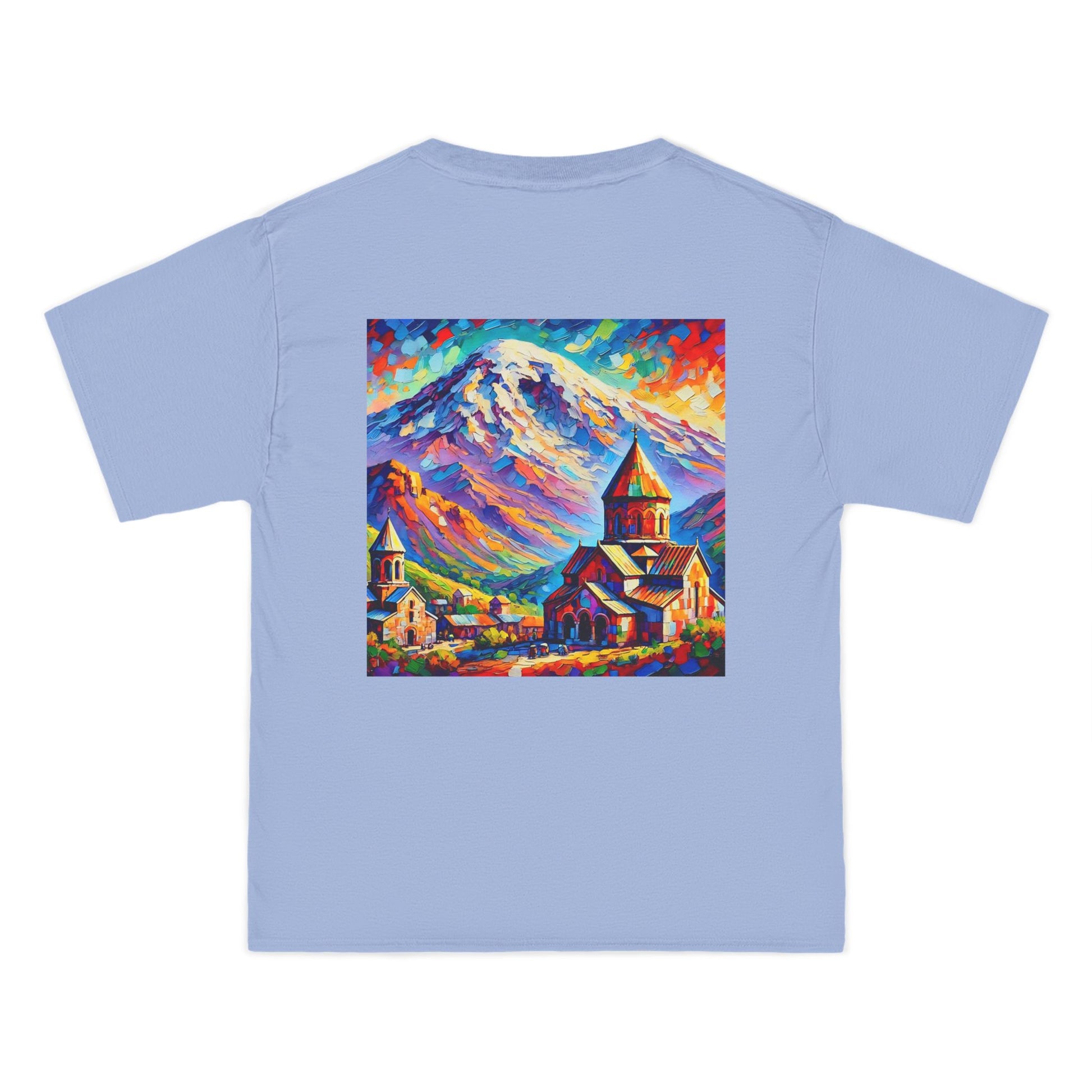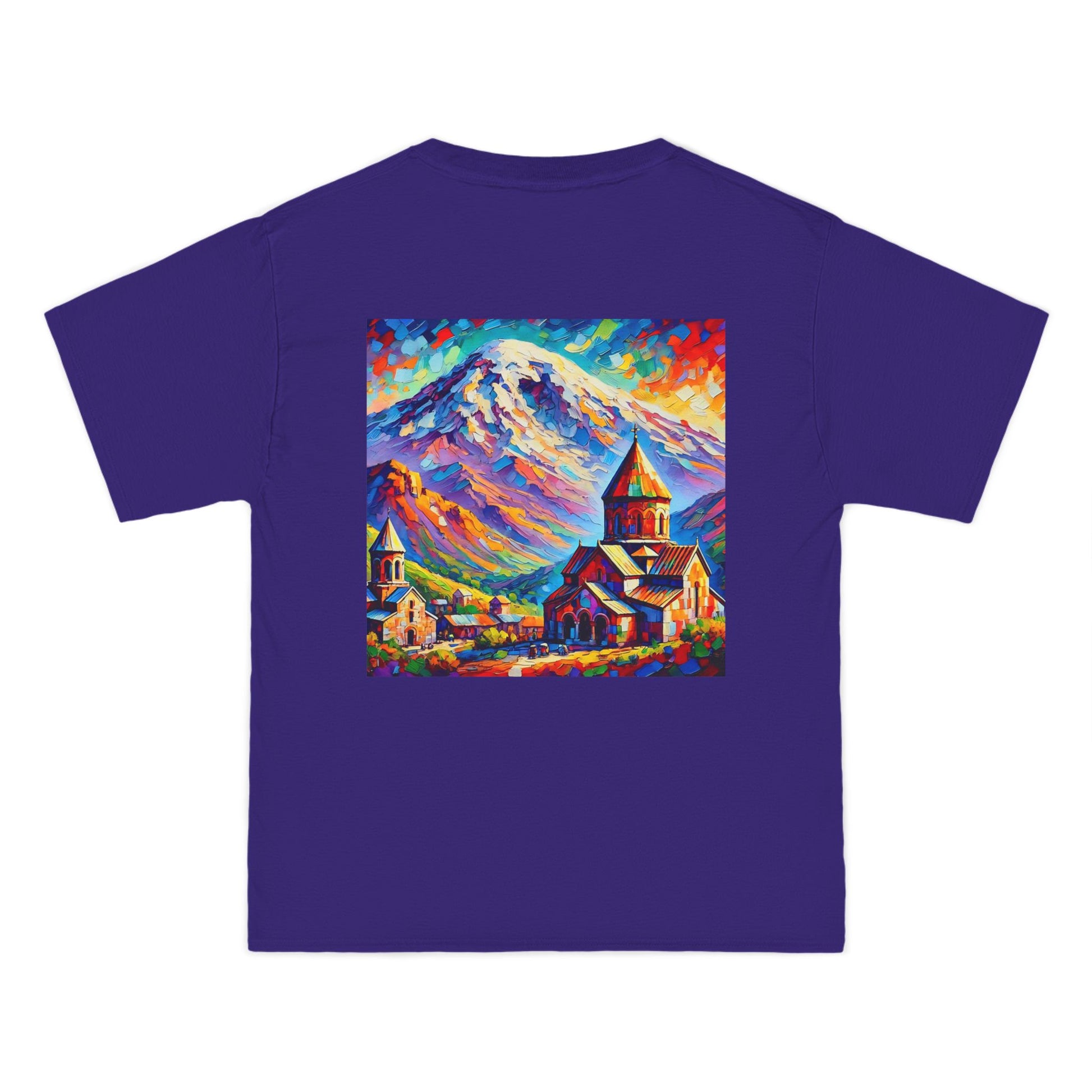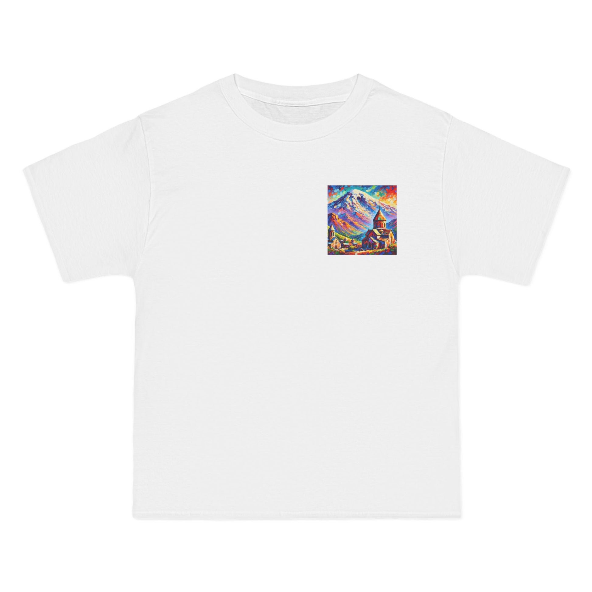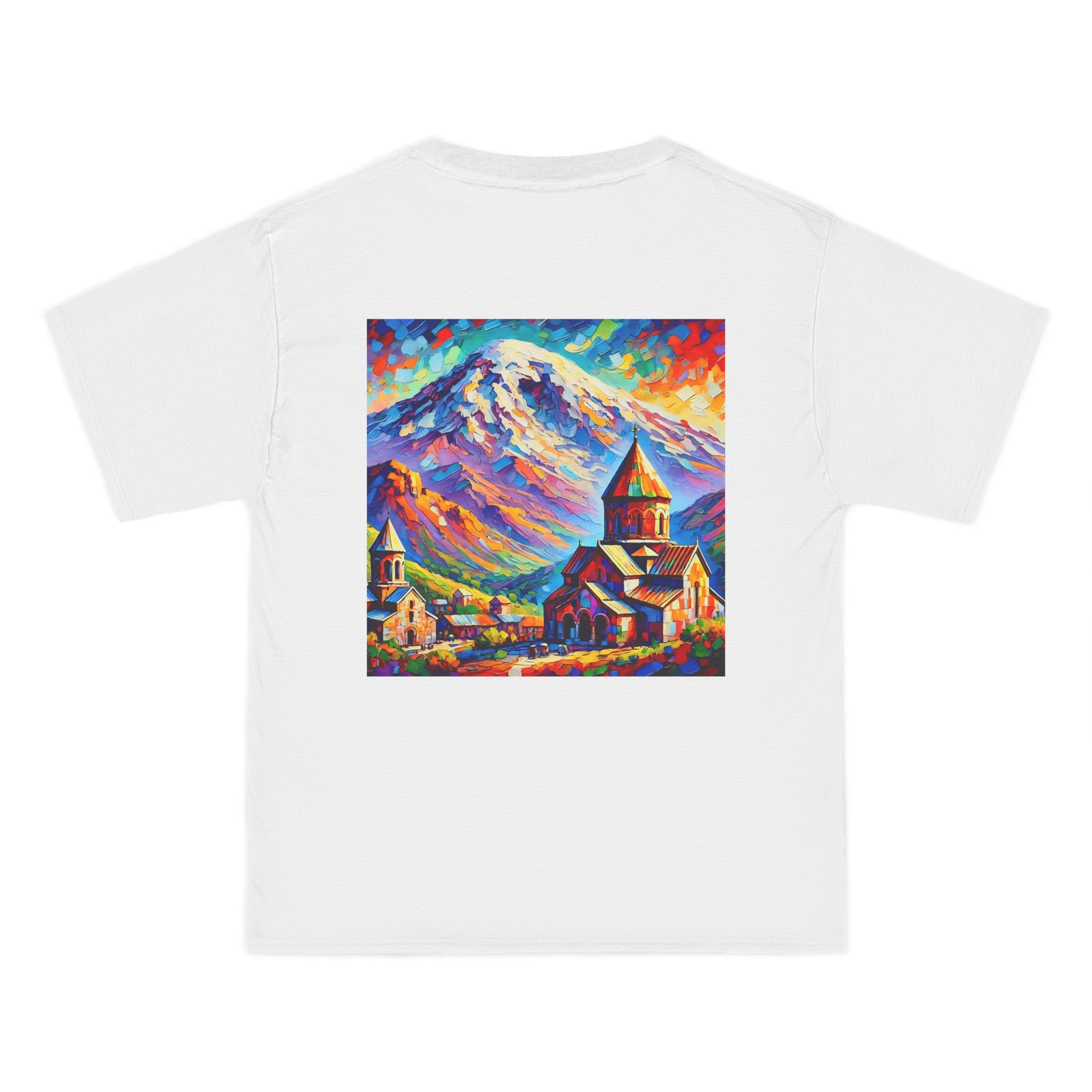 Step into the world of art with our Ararat Mountain & Church Post-Impressionist Fauvism shirt. Reminiscent of a vibrant and bold painting, this design encapsulates the passion of the artist and the beauty of Ararat Mountain with an ancient Armenian church. Let the expressive colors and simplified forms inspire you. It's not just a shirt; it's wearable art.