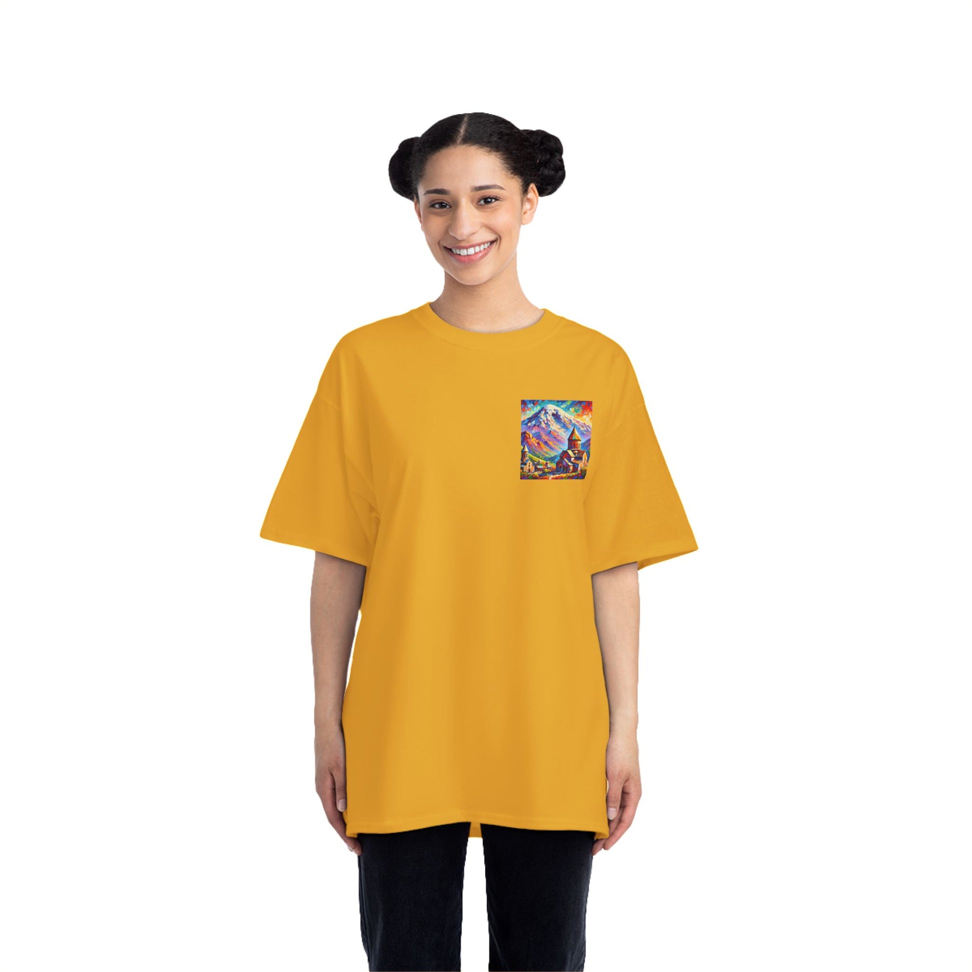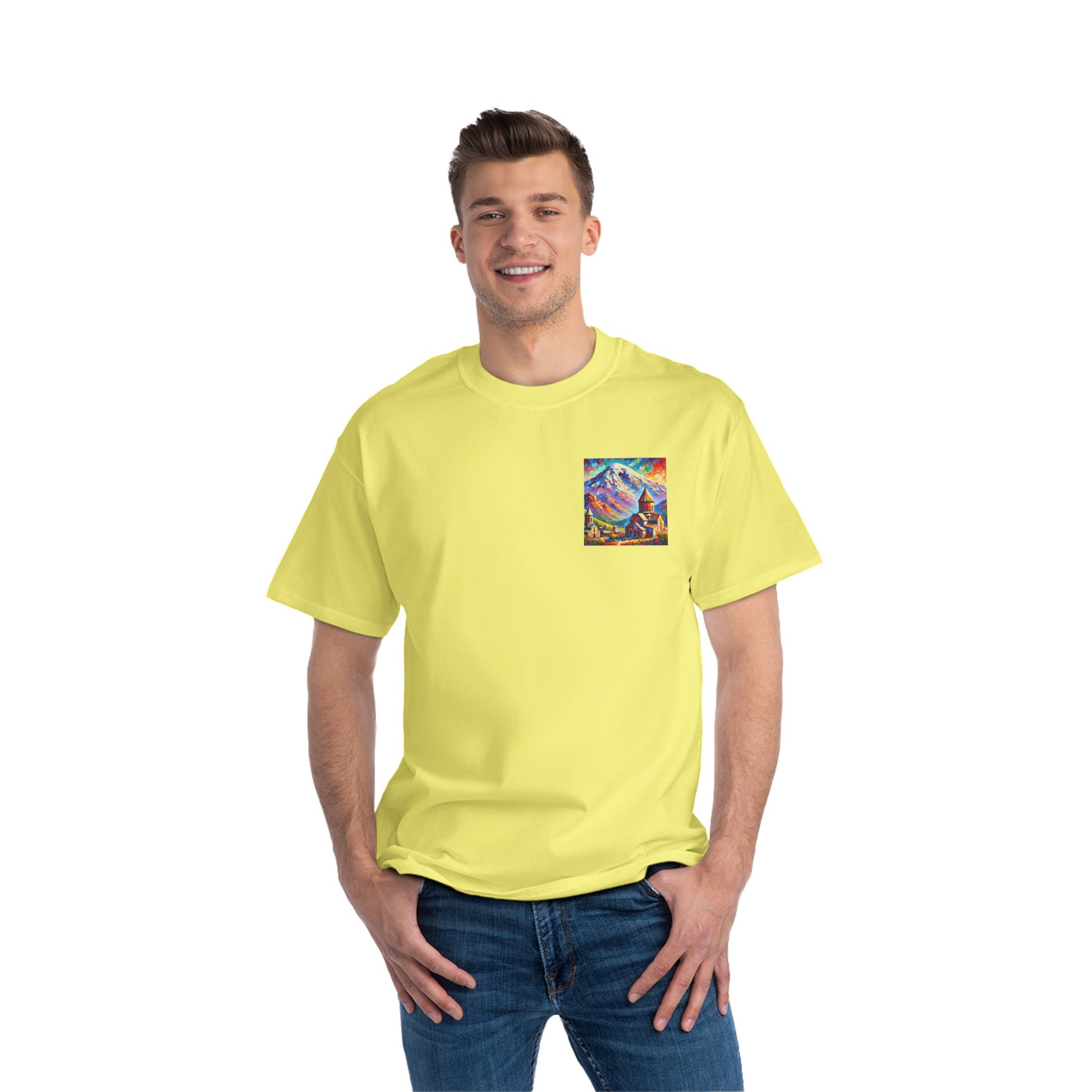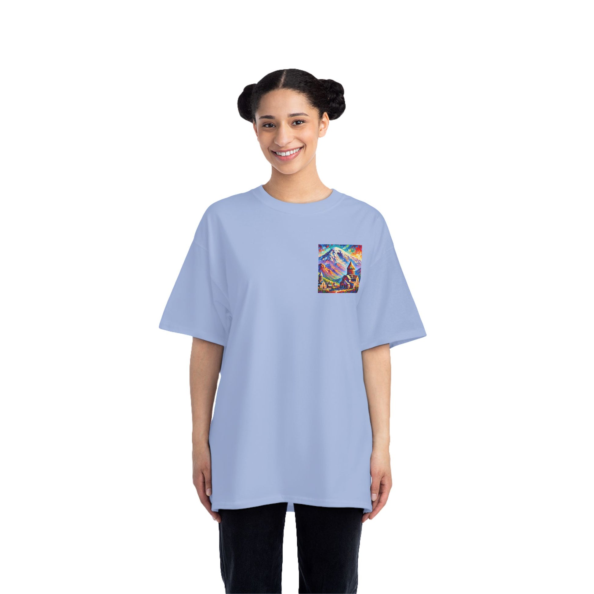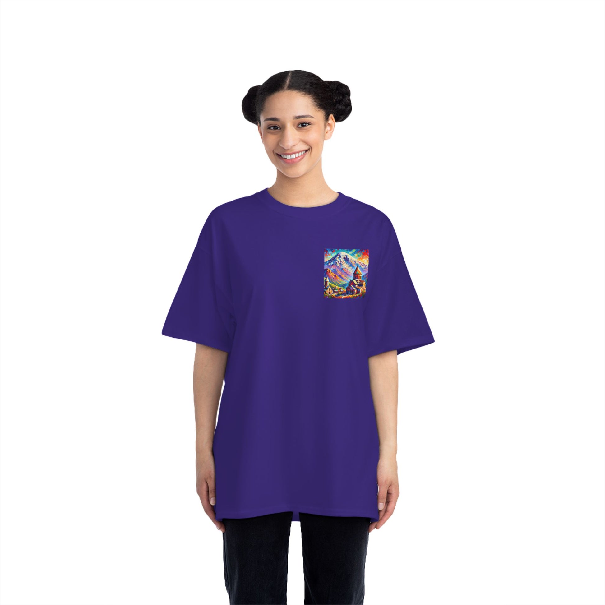 Step into the world of art with our Ararat Mountain & Church Post-Impressionist Fauvism shirt. Reminiscent of a vibrant and bold painting, this design encapsulates the passion of the artist and the beauty of Ararat Mountain with an ancient Armenian church. Let the expressive colors and simplified forms inspire you. It's not just a shirt; it's wearable art.
