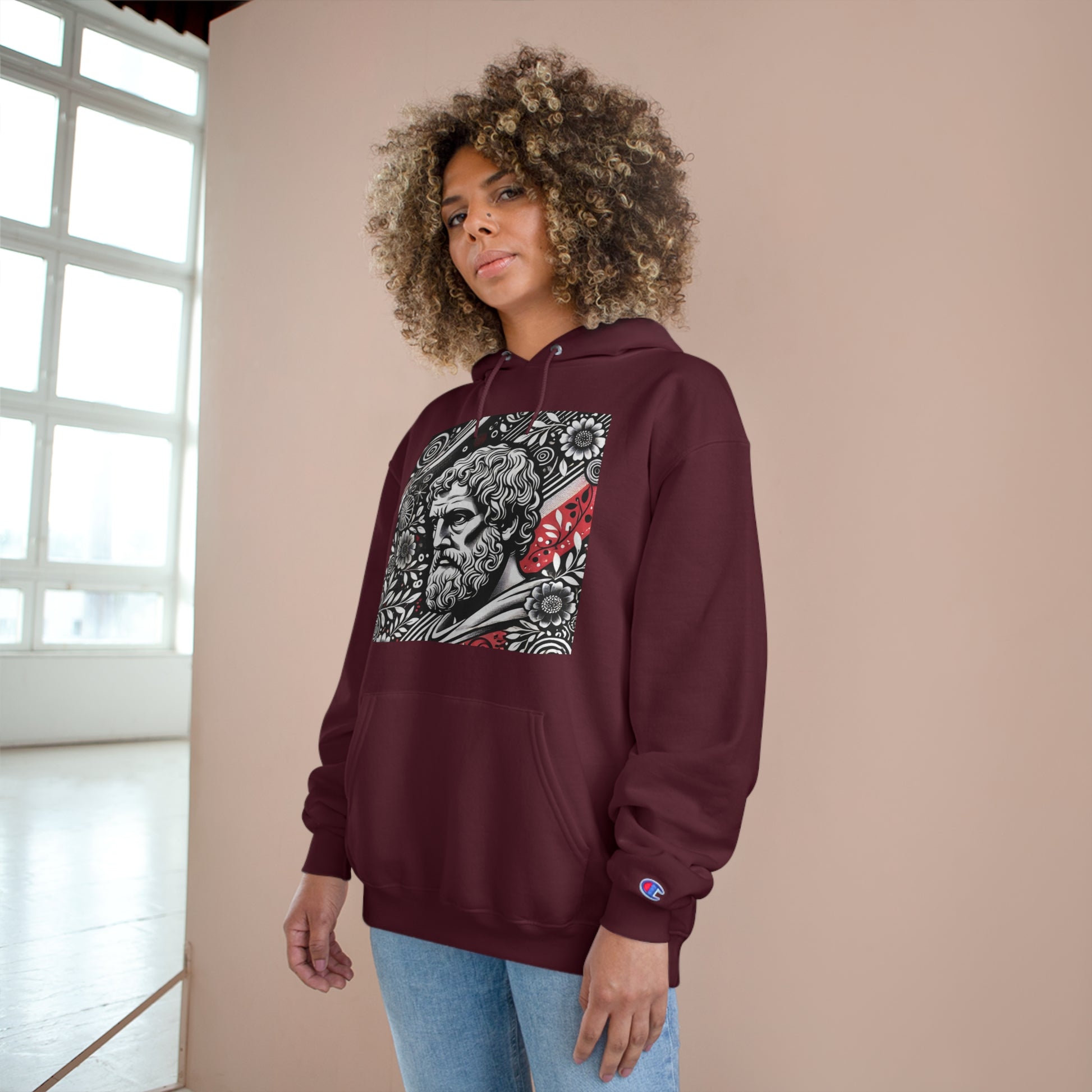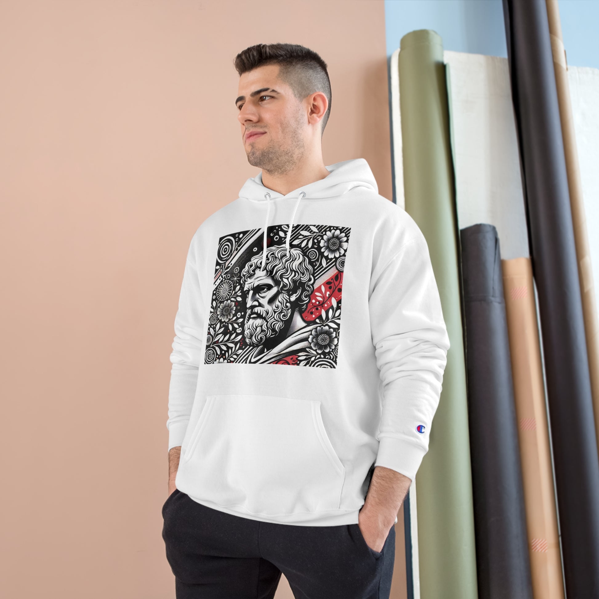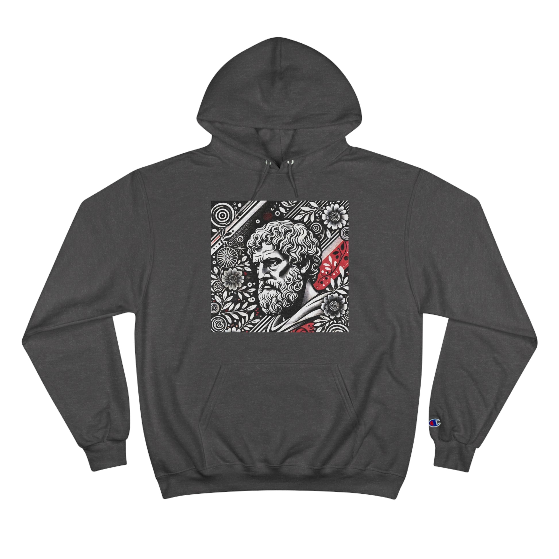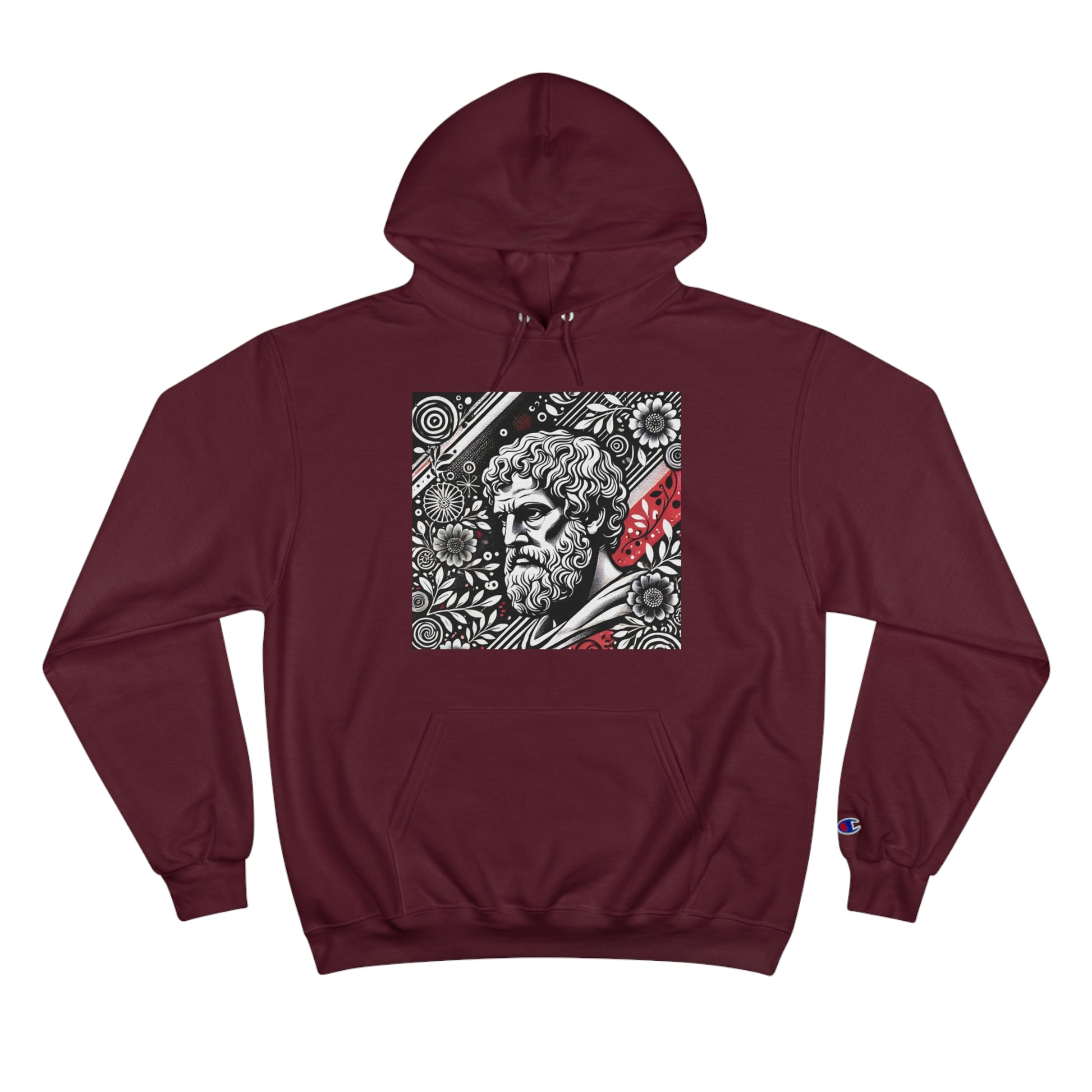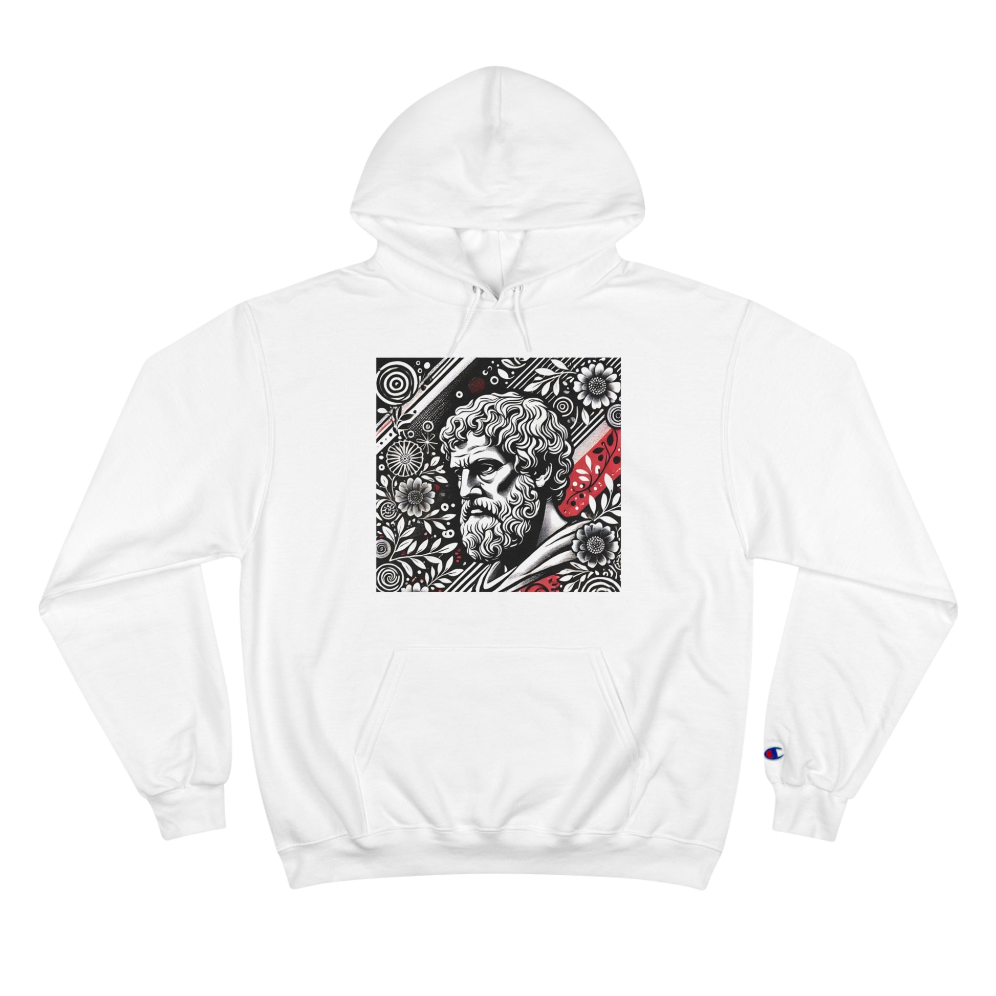 Step into the world of AI-inspired fashion with our Aristotle: Vintage Floral sweatshirt, a piece that truly allows you to 'Wear Your World.' This unique design blends the wisdom of the ancient world with a modern, hand-drawn aesthetic, featuring a monochrome image of Aristotle lost in thought, surrounded by intricate, bold floral patterns. The playful splashes of red add a vibrant pop of color, encapsulating Whatever Clothing's innovative spirit.
