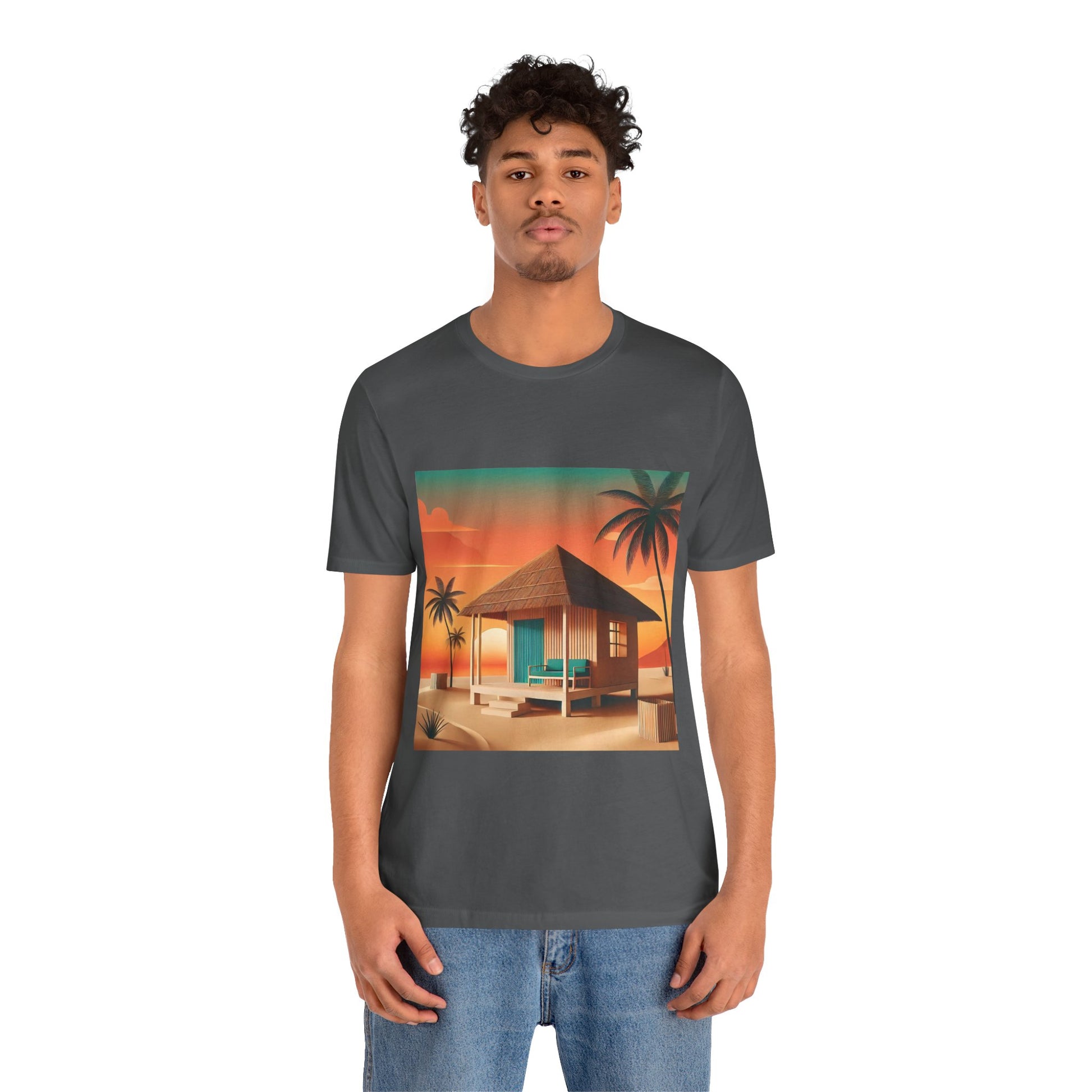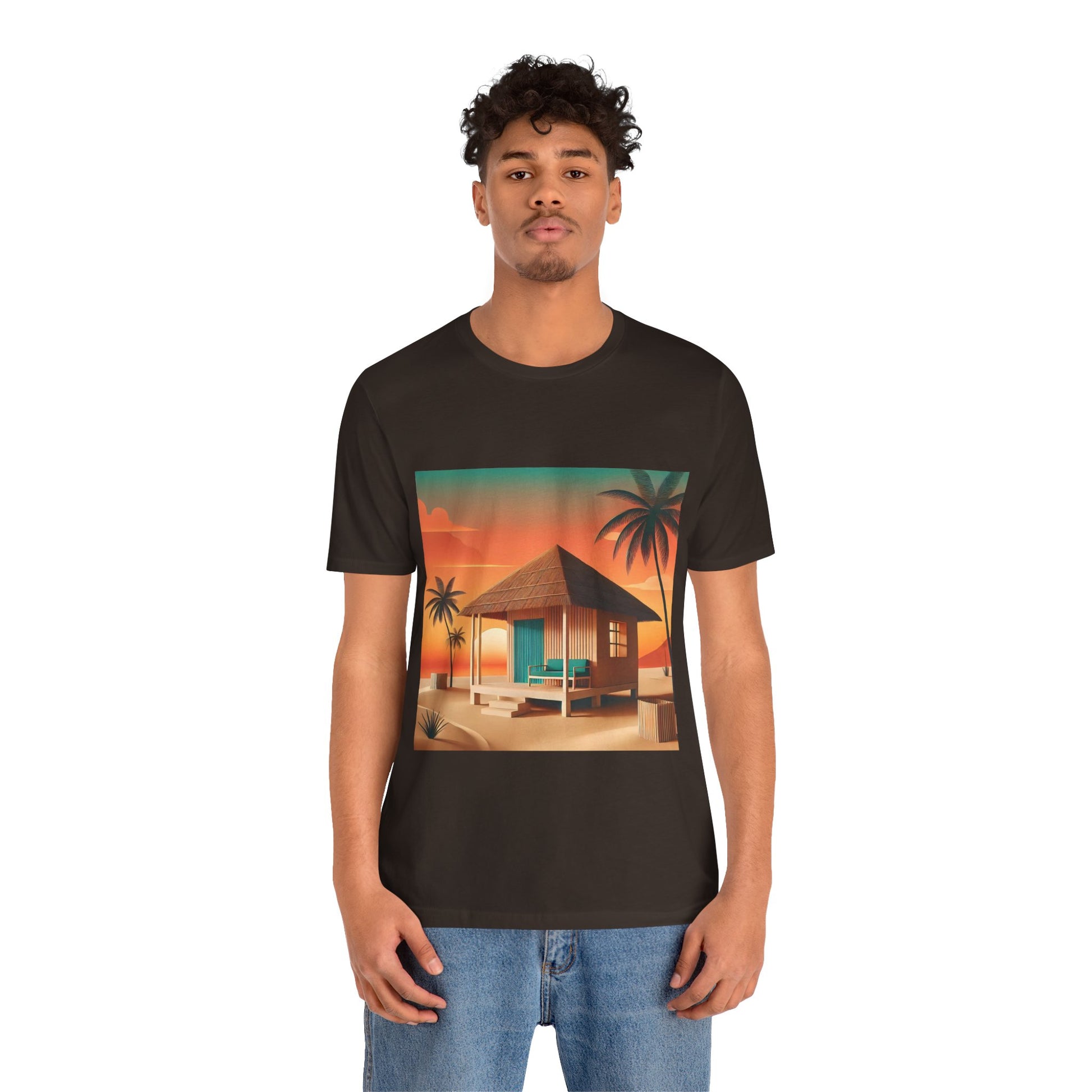 A minimalist tropical beach hut with a thatched roof, set against a sunset backdrop.