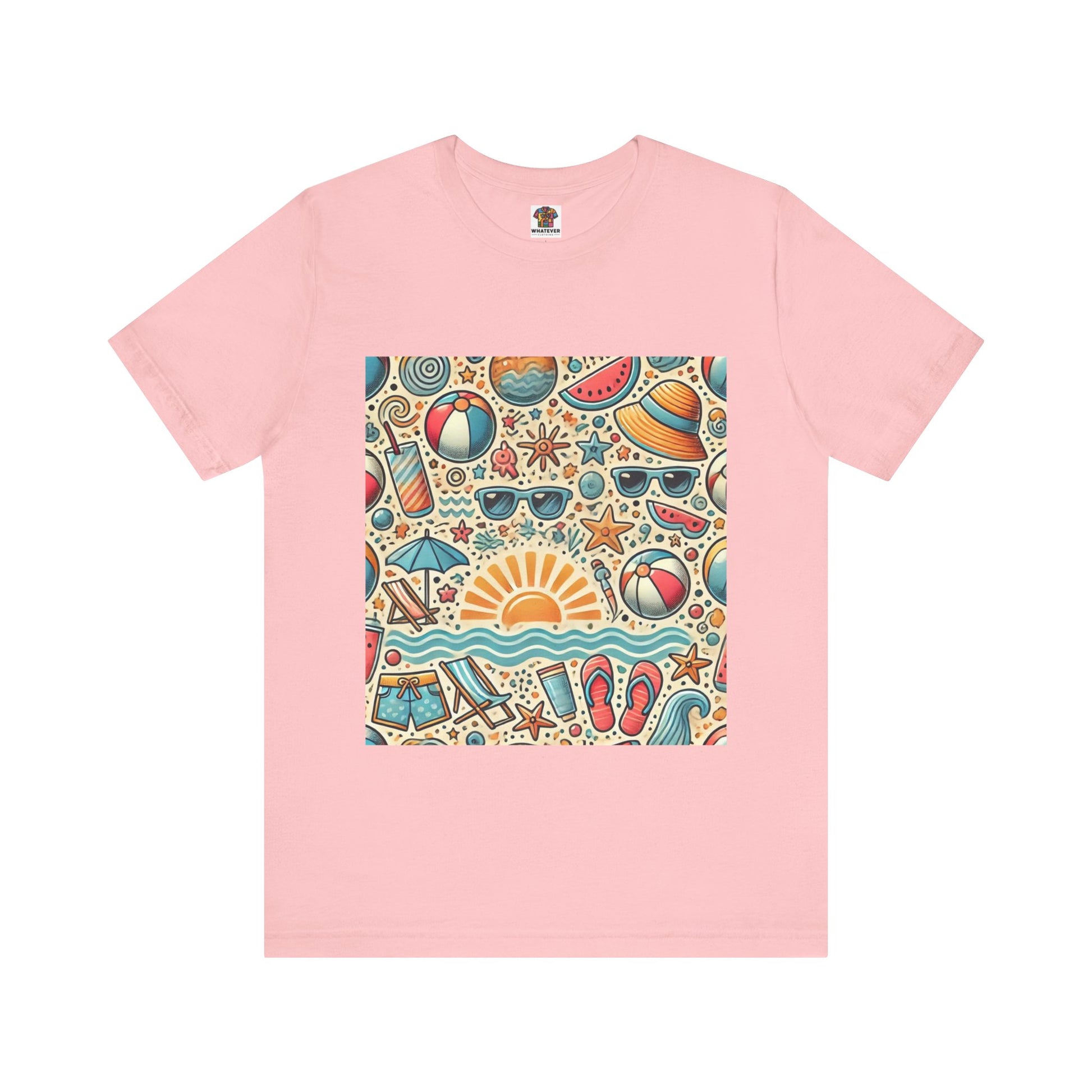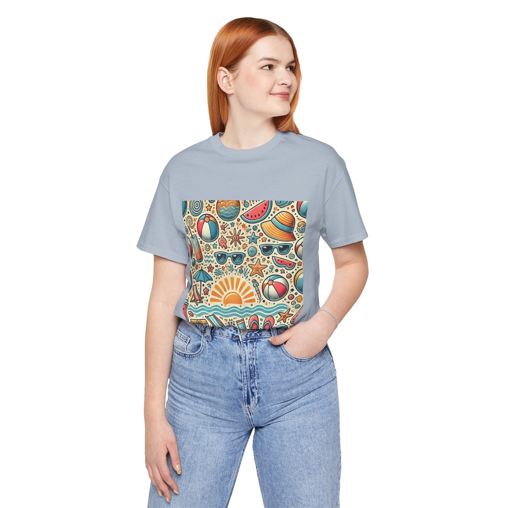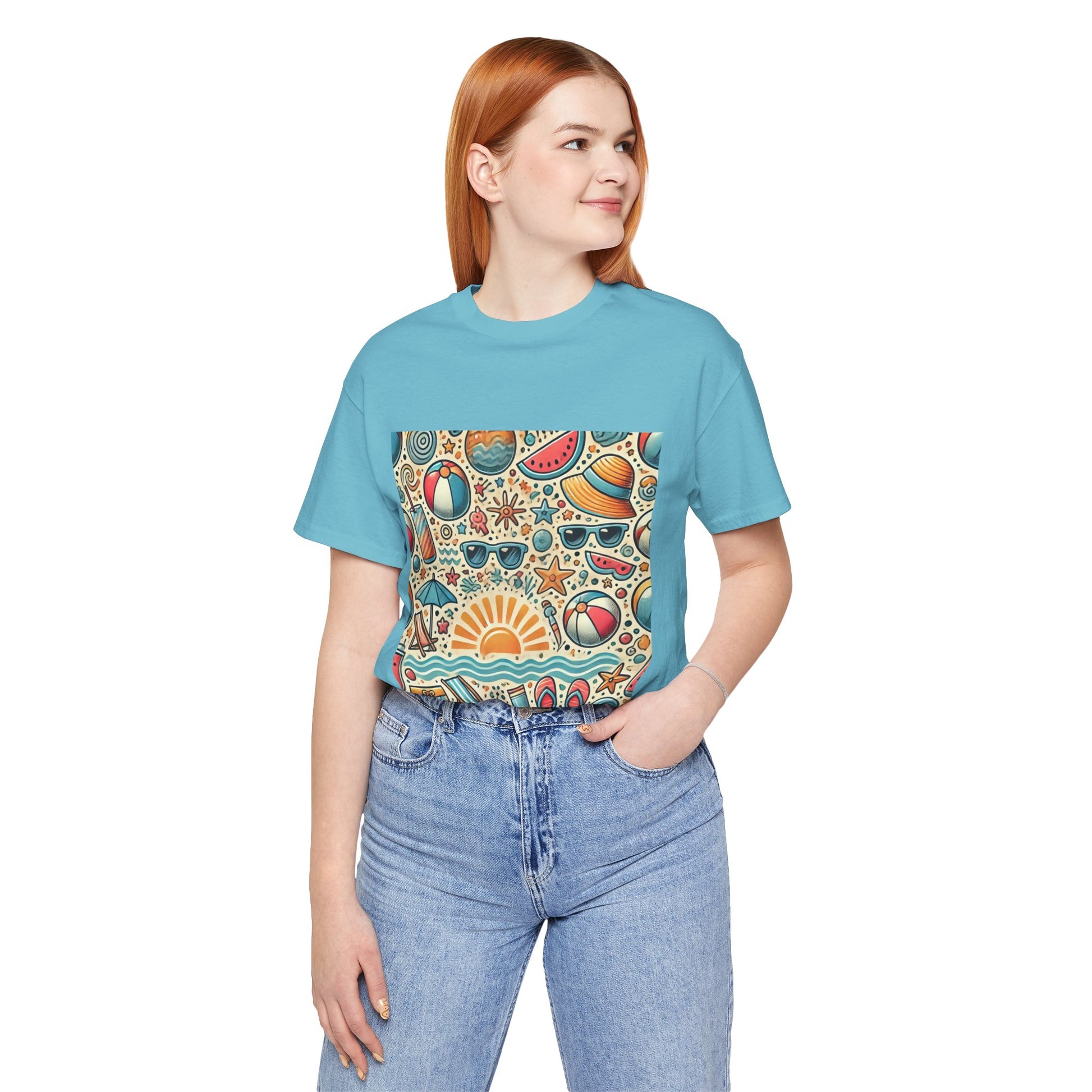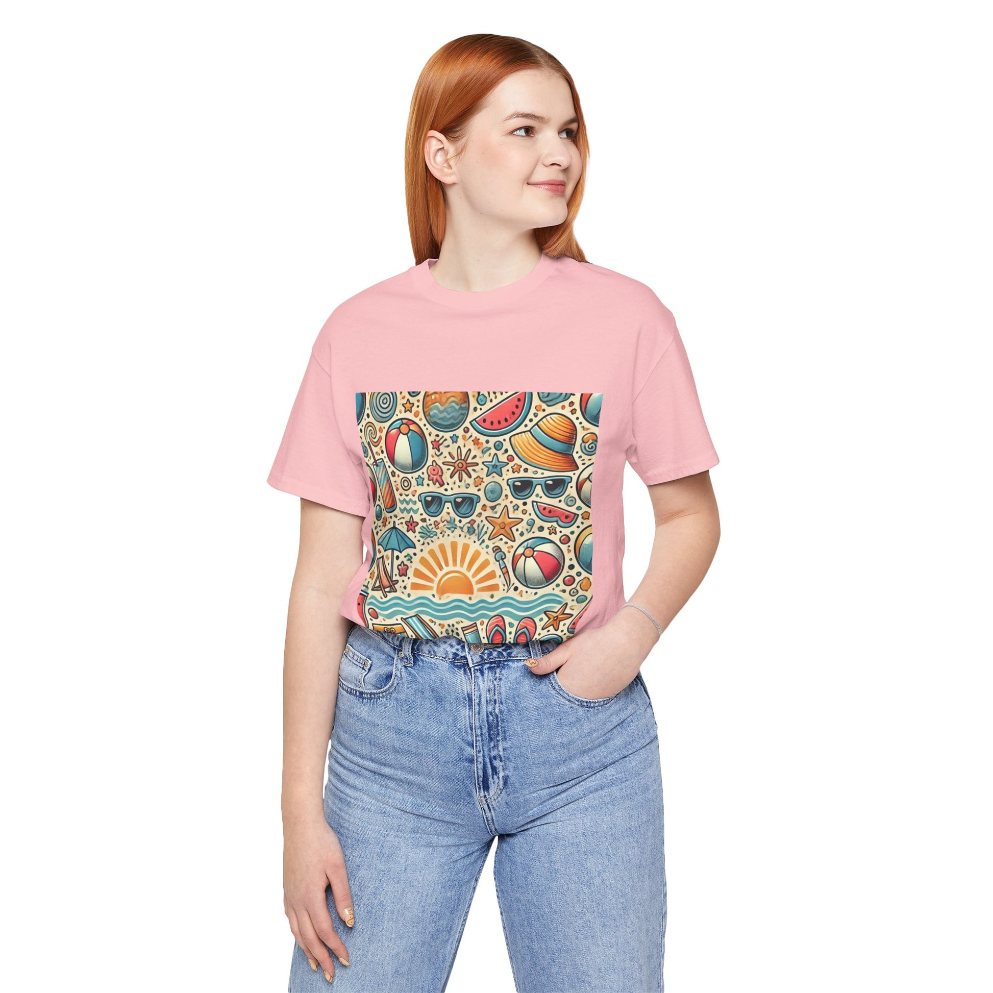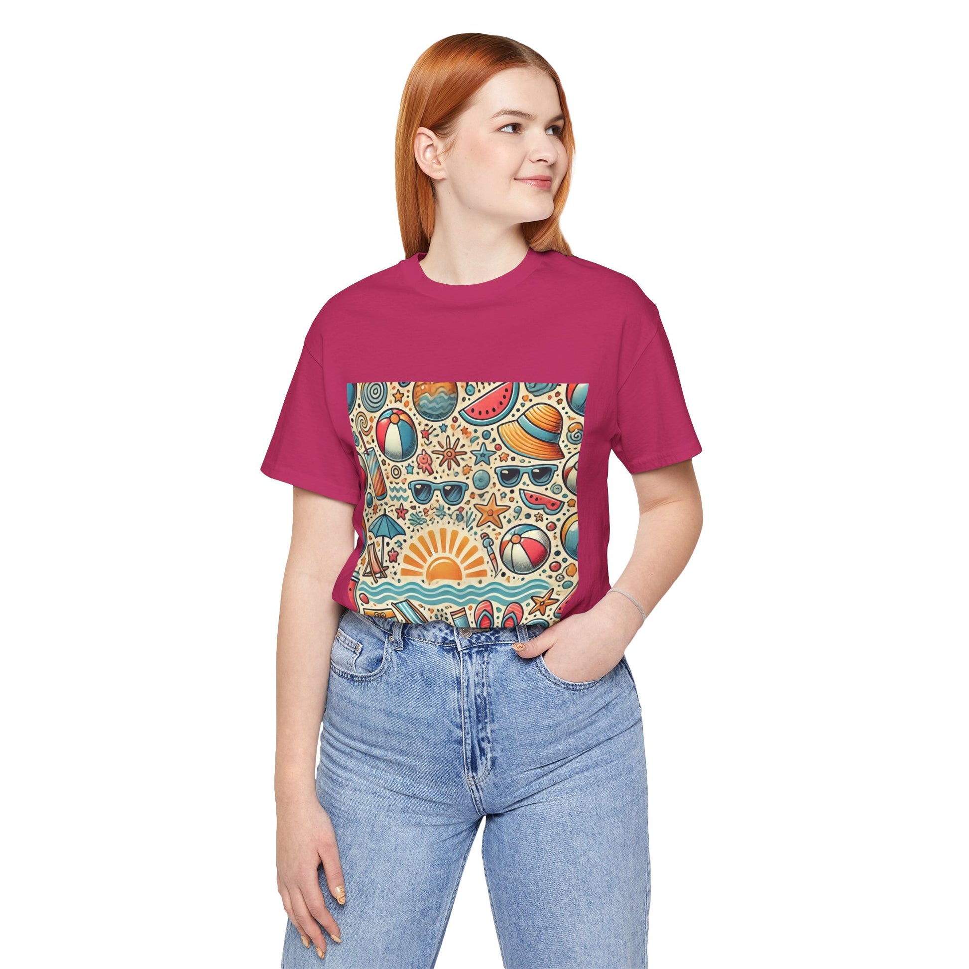 A fun beach-themed pattern featuring elements like beach balls, sunglasses, and sun hats in bright, playful colors against a pastel background.