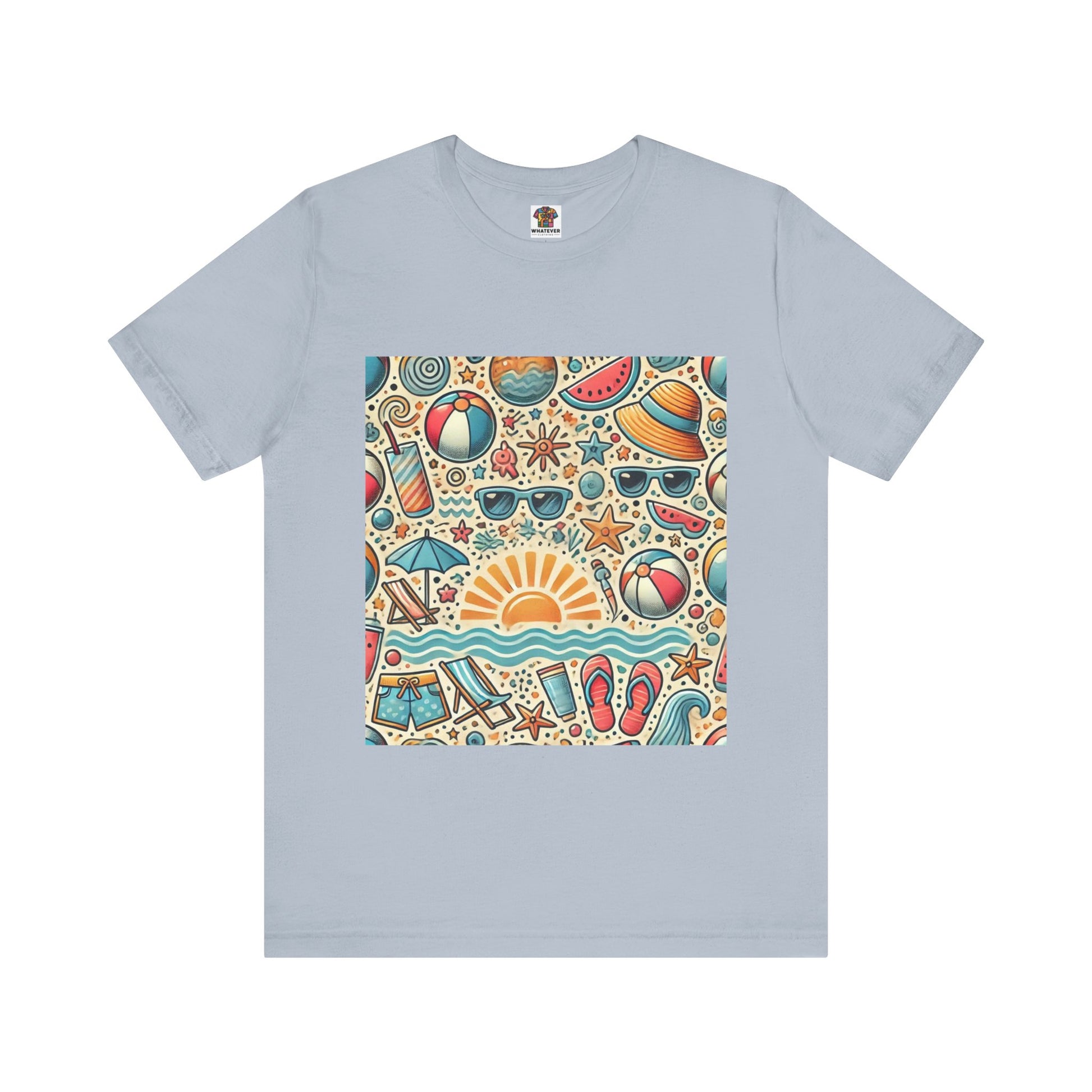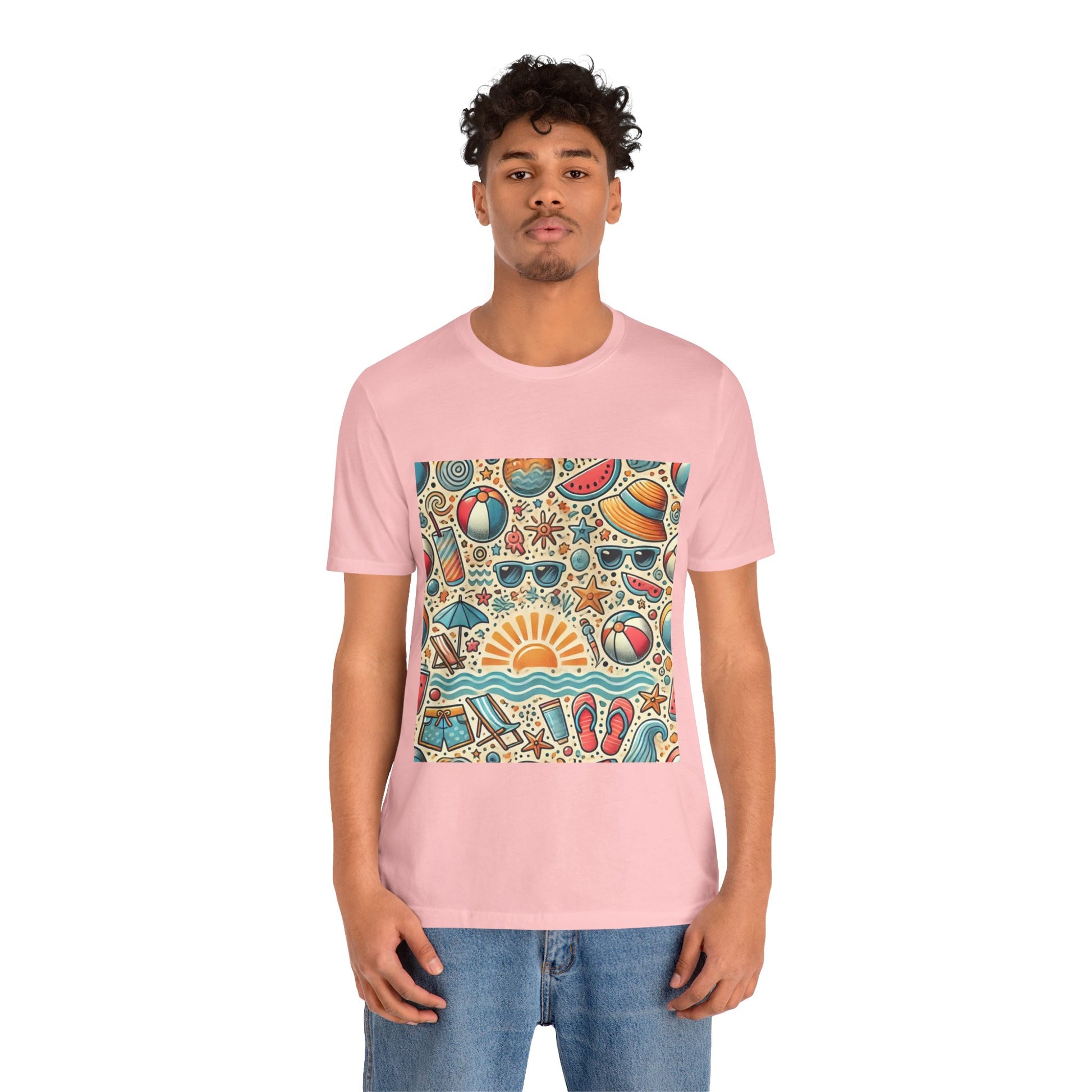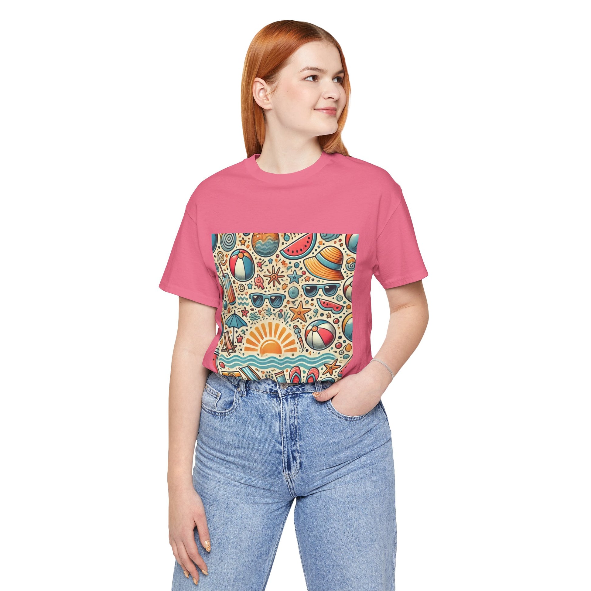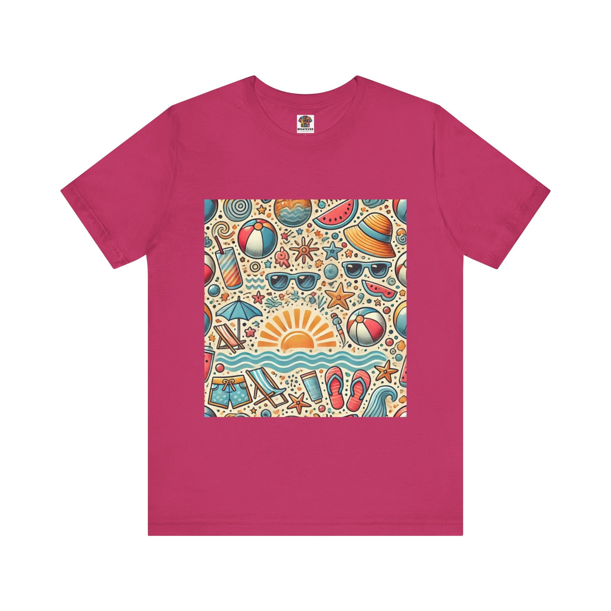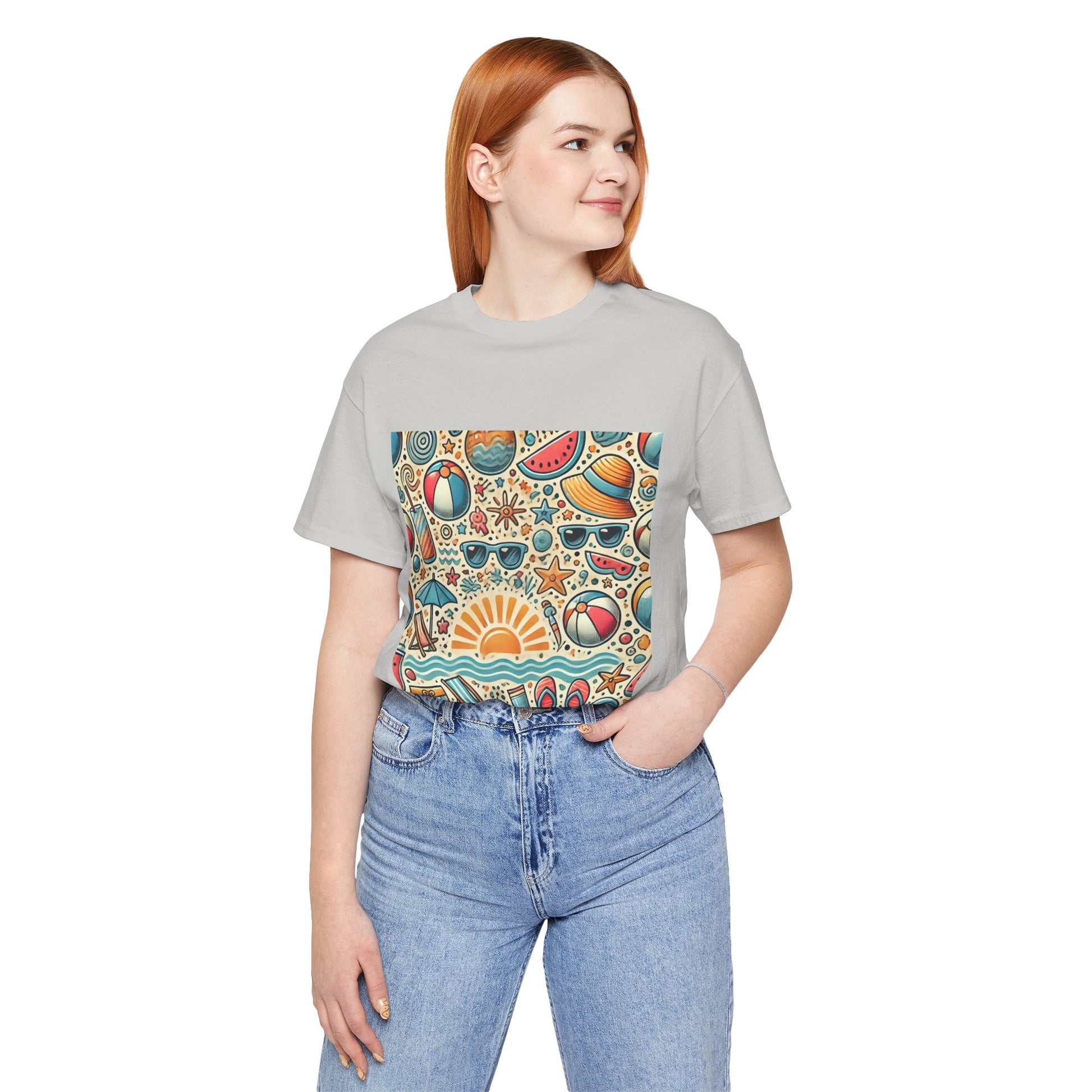 A fun beach-themed pattern featuring elements like beach balls, sunglasses, and sun hats in bright, playful colors against a pastel background.