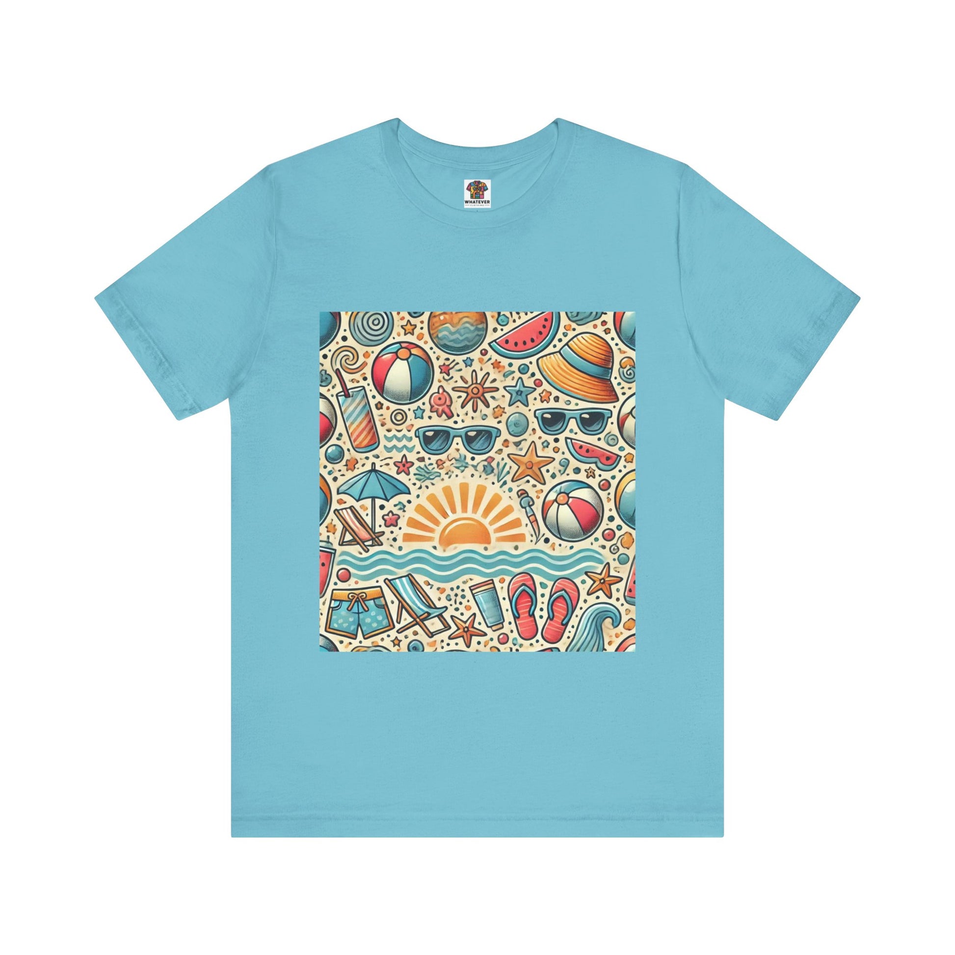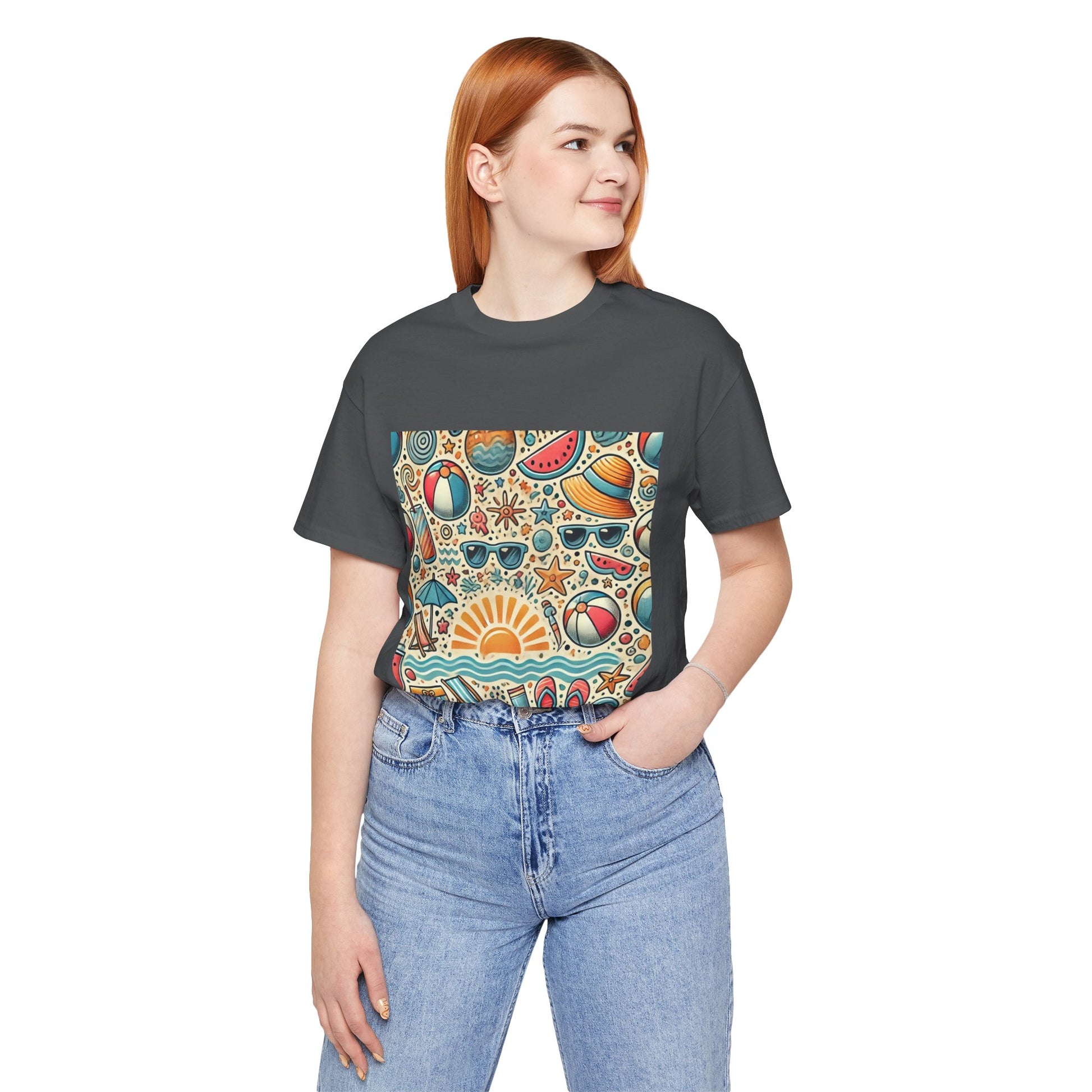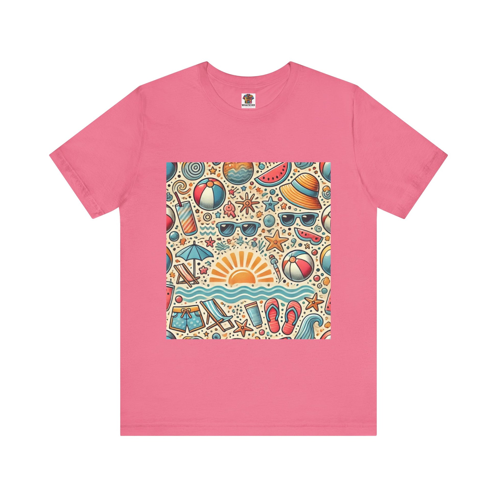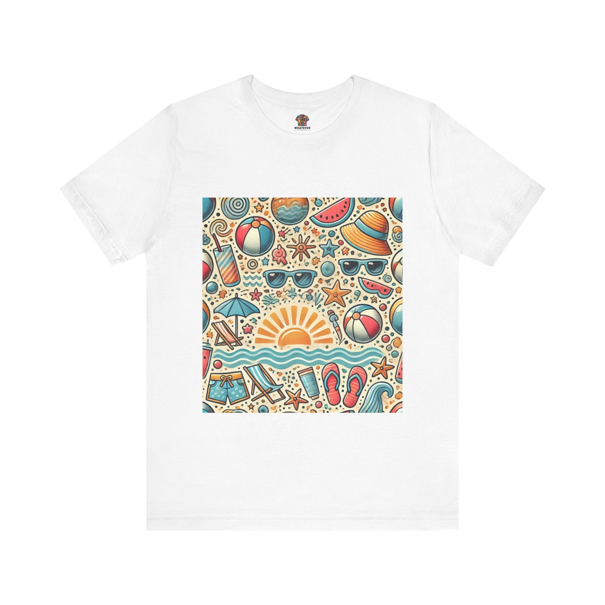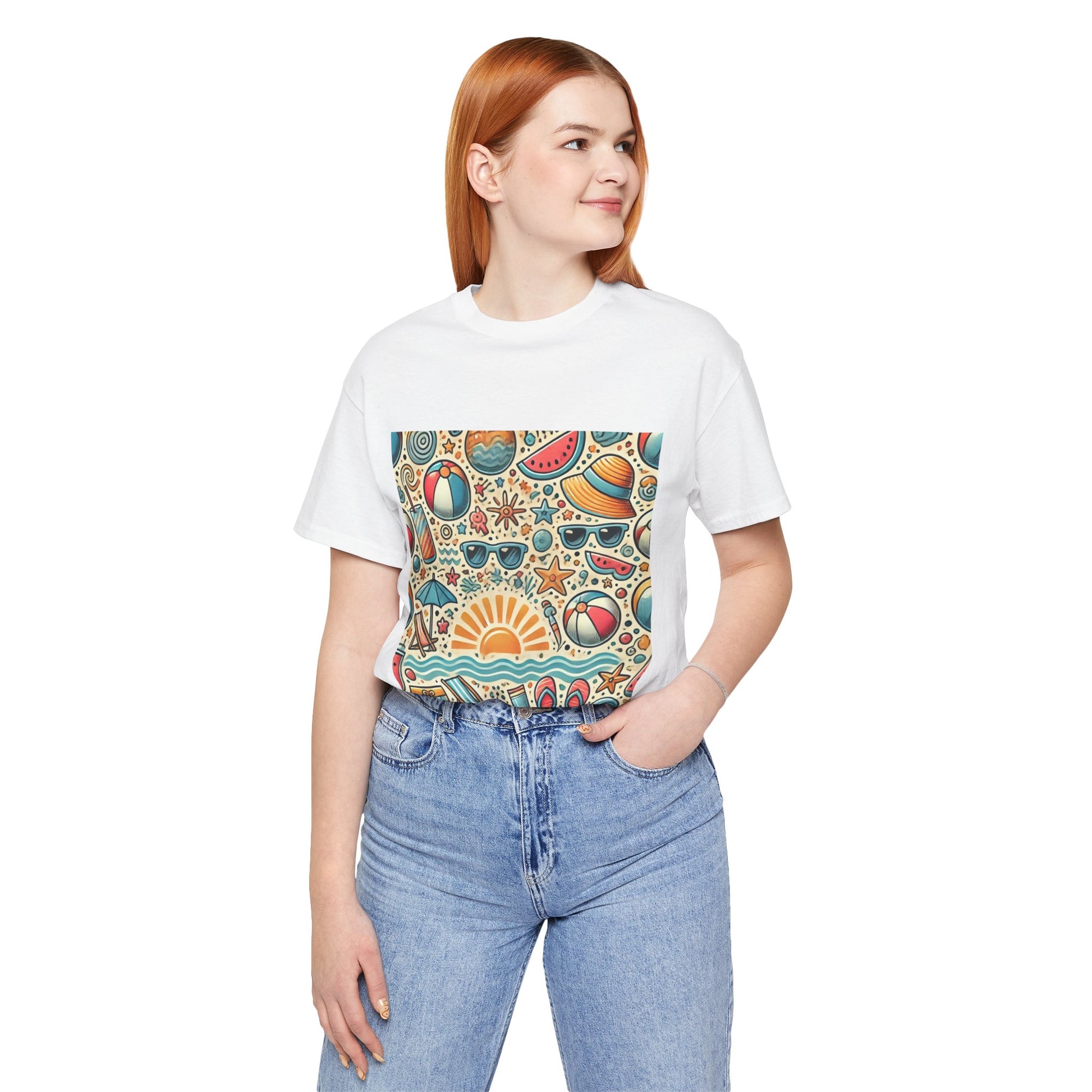 A fun beach-themed pattern featuring elements like beach balls, sunglasses, and sun hats in bright, playful colors against a pastel background.