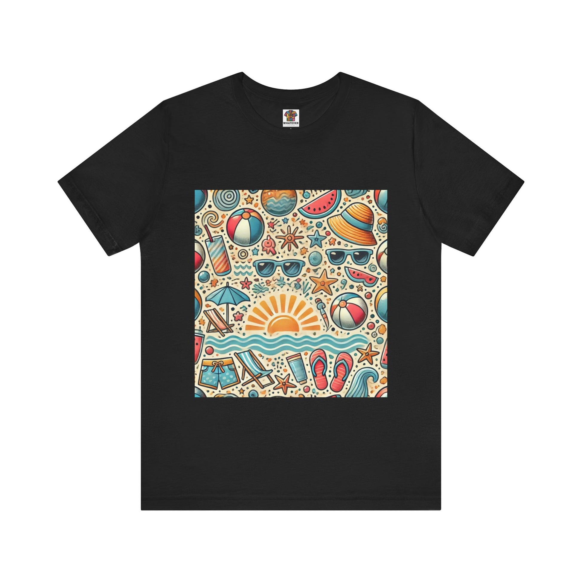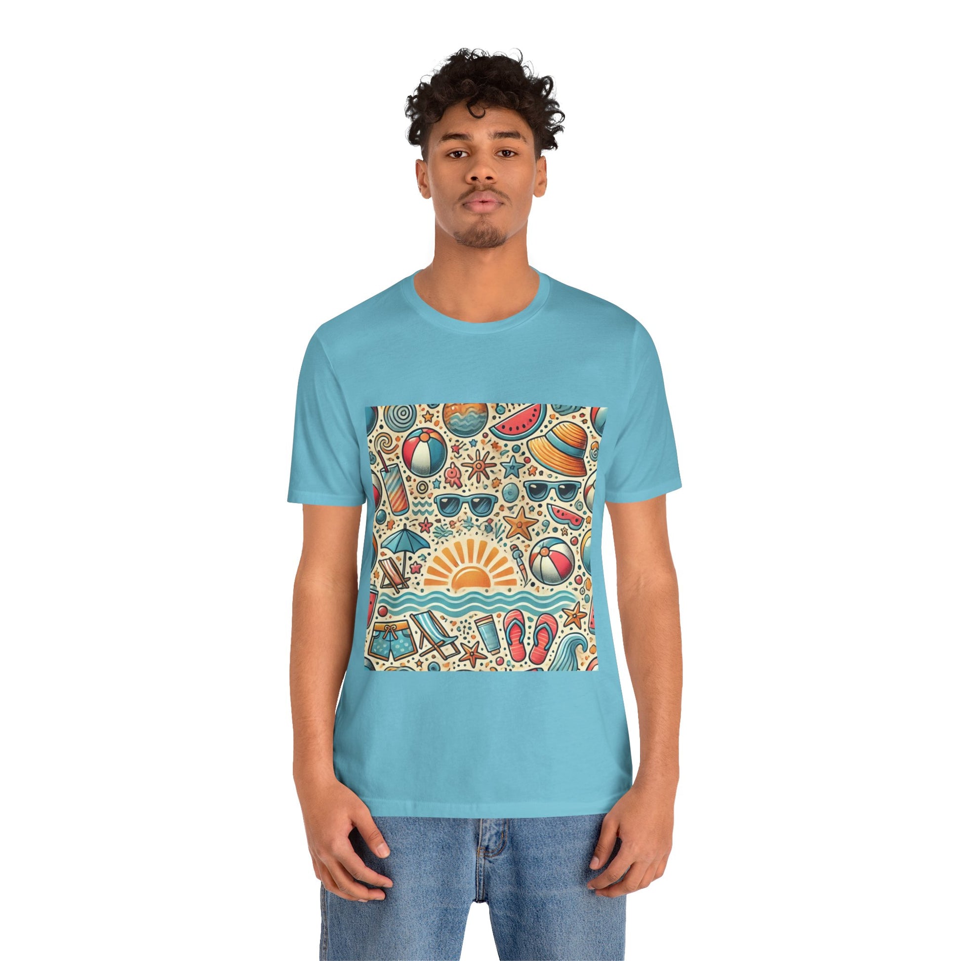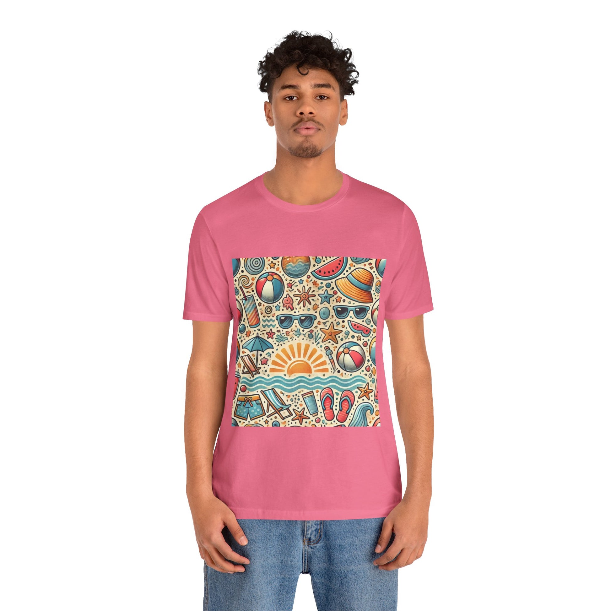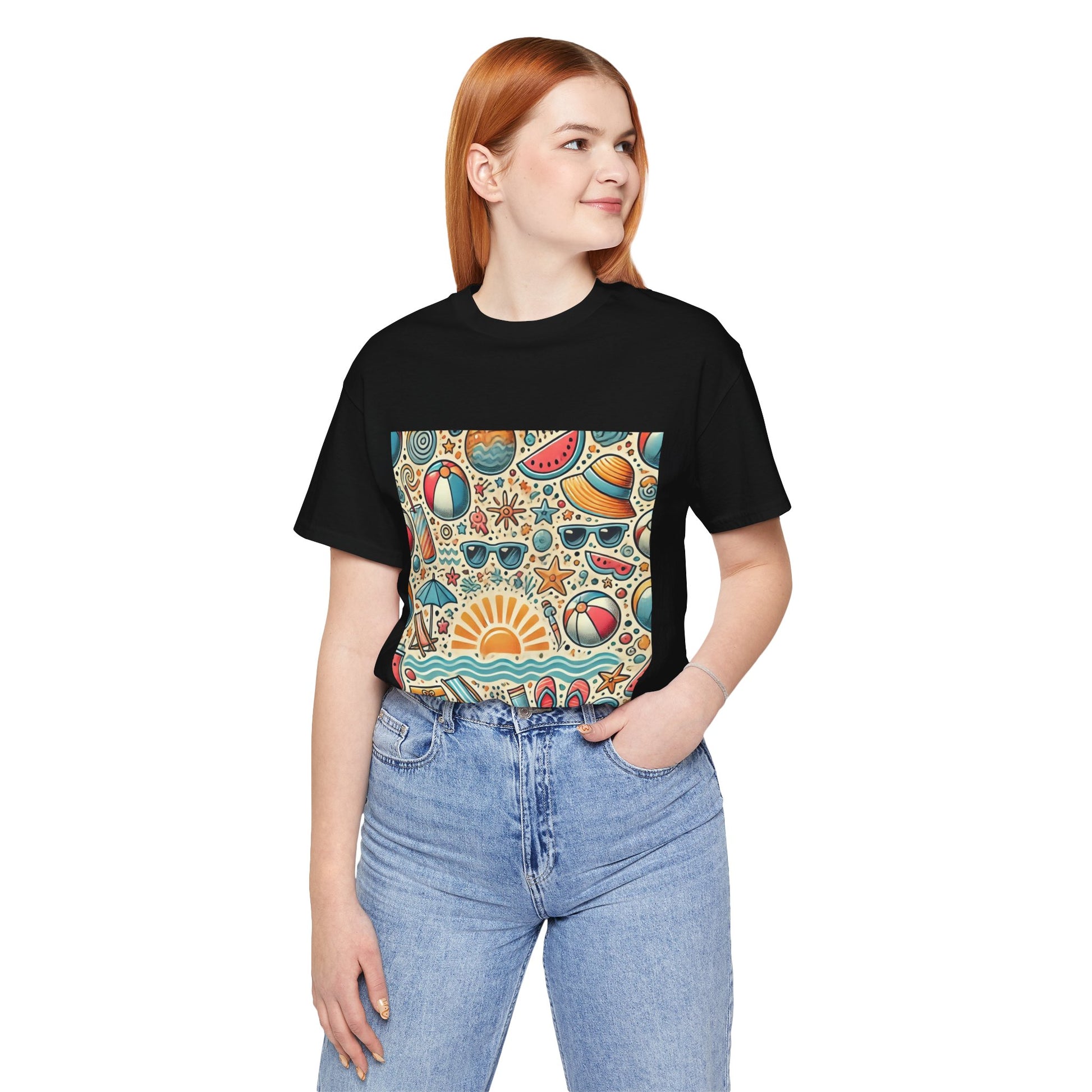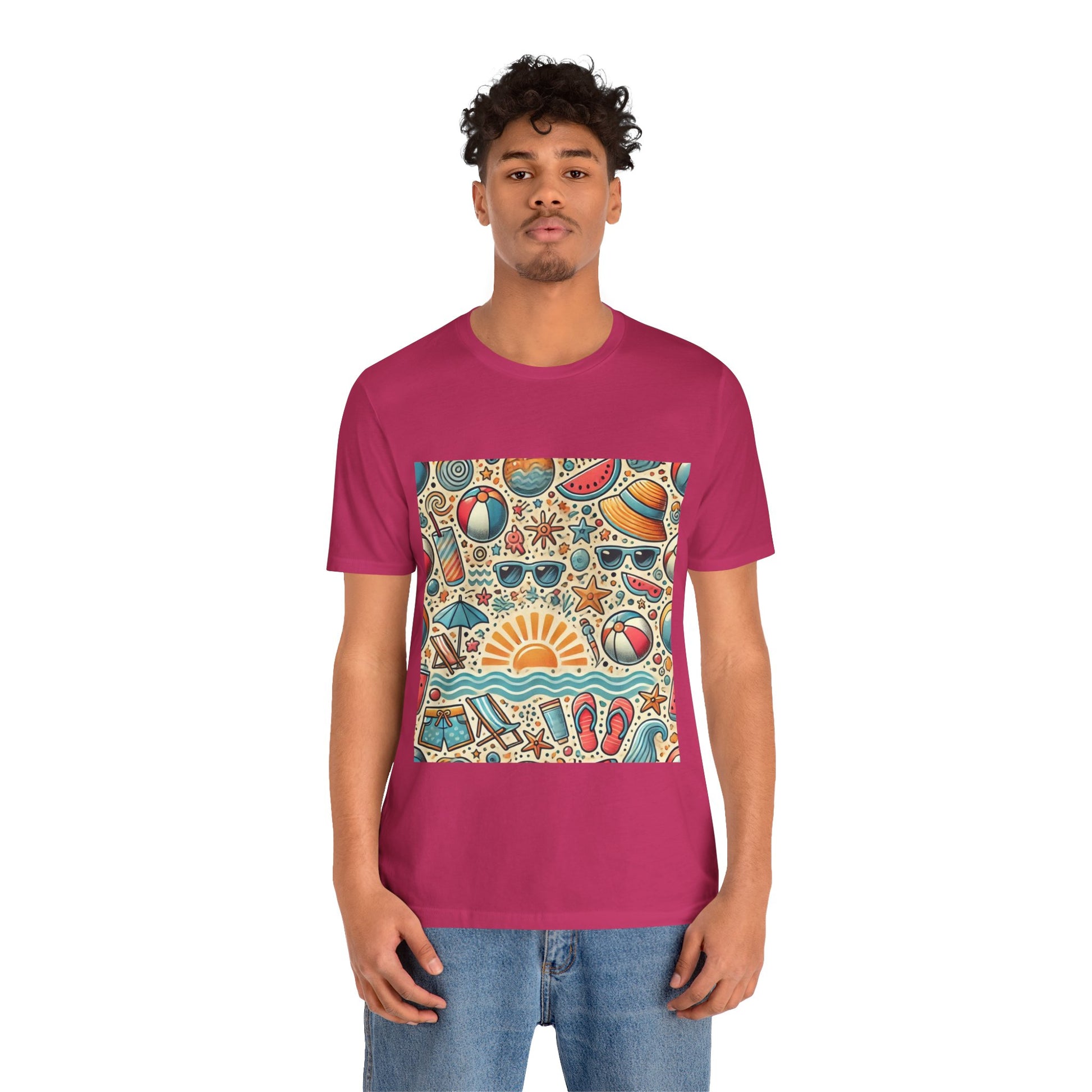 A fun beach-themed pattern featuring elements like beach balls, sunglasses, and sun hats in bright, playful colors against a pastel background.