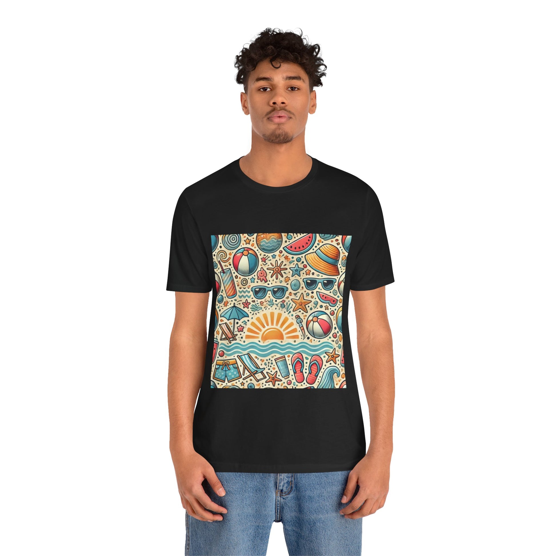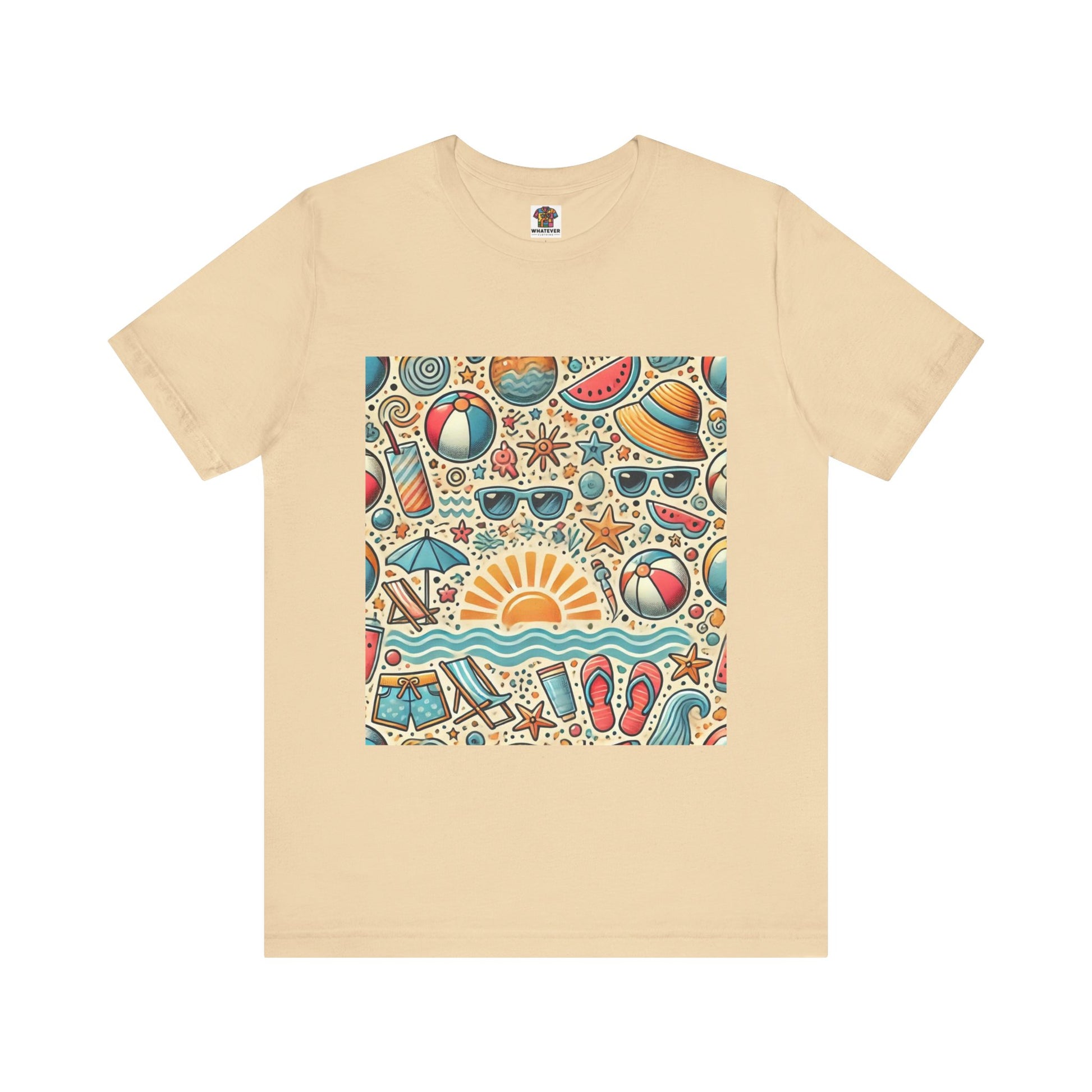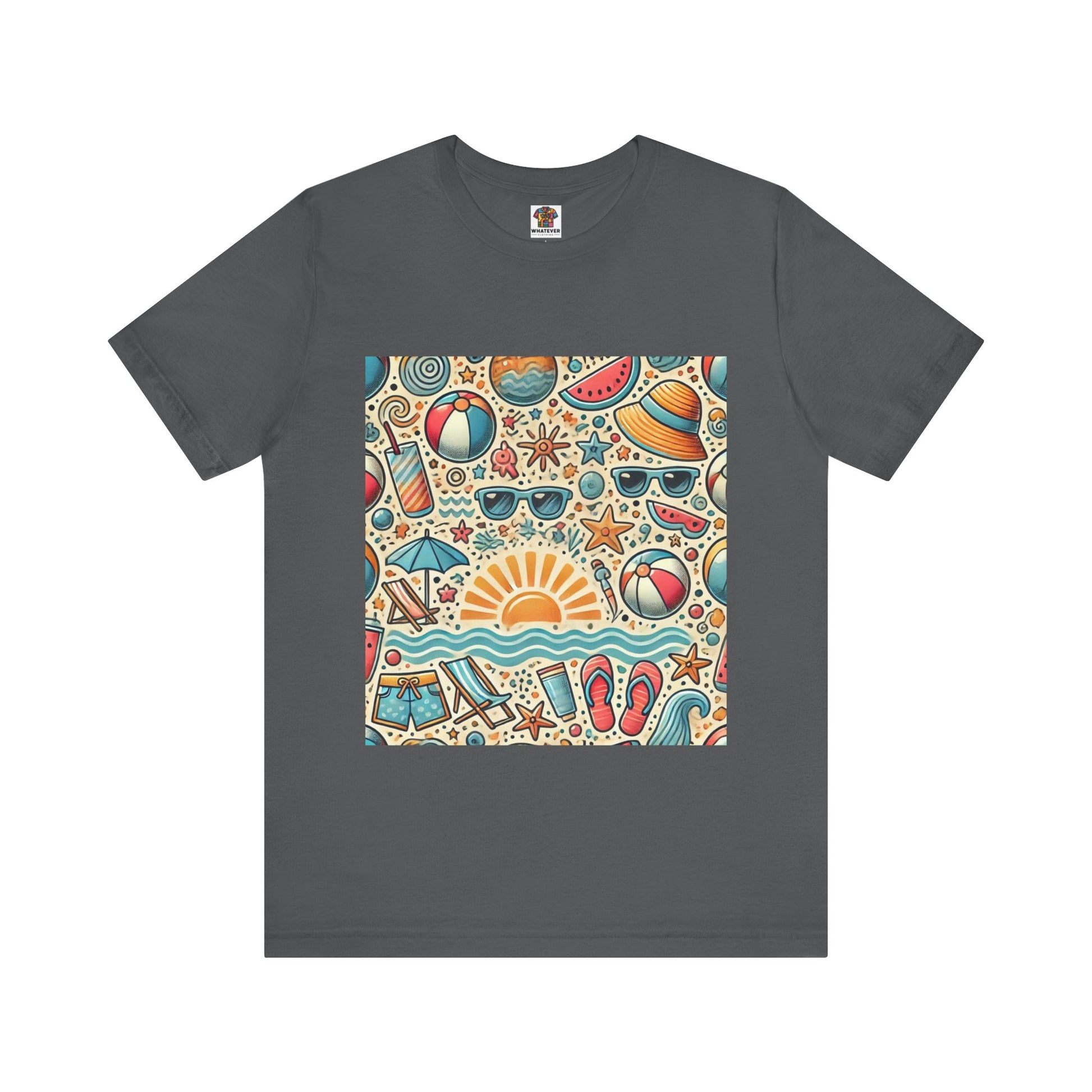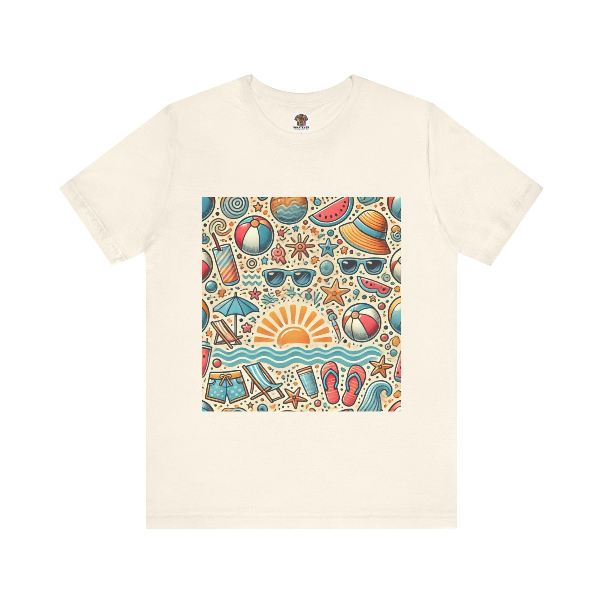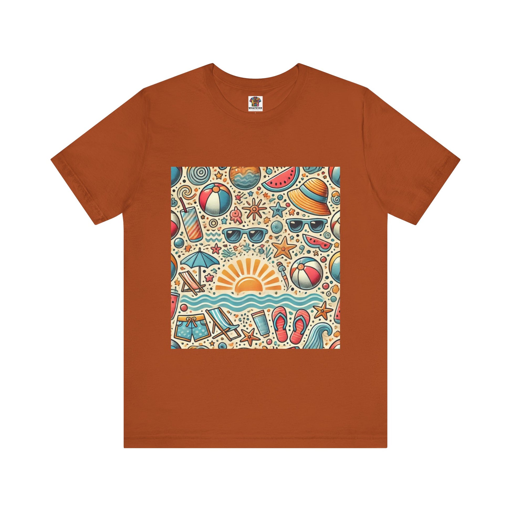 A fun beach-themed pattern featuring elements like beach balls, sunglasses, and sun hats in bright, playful colors against a pastel background.