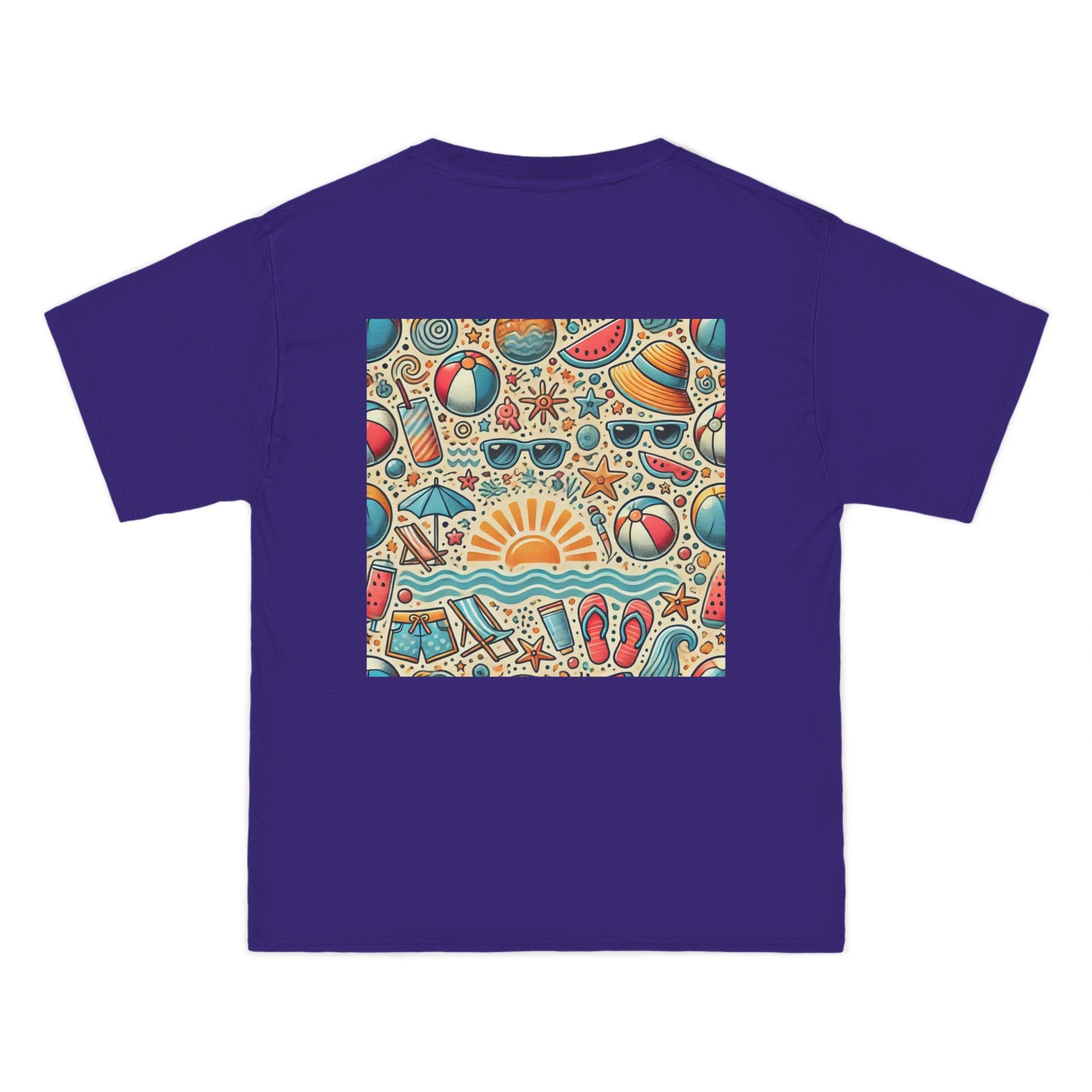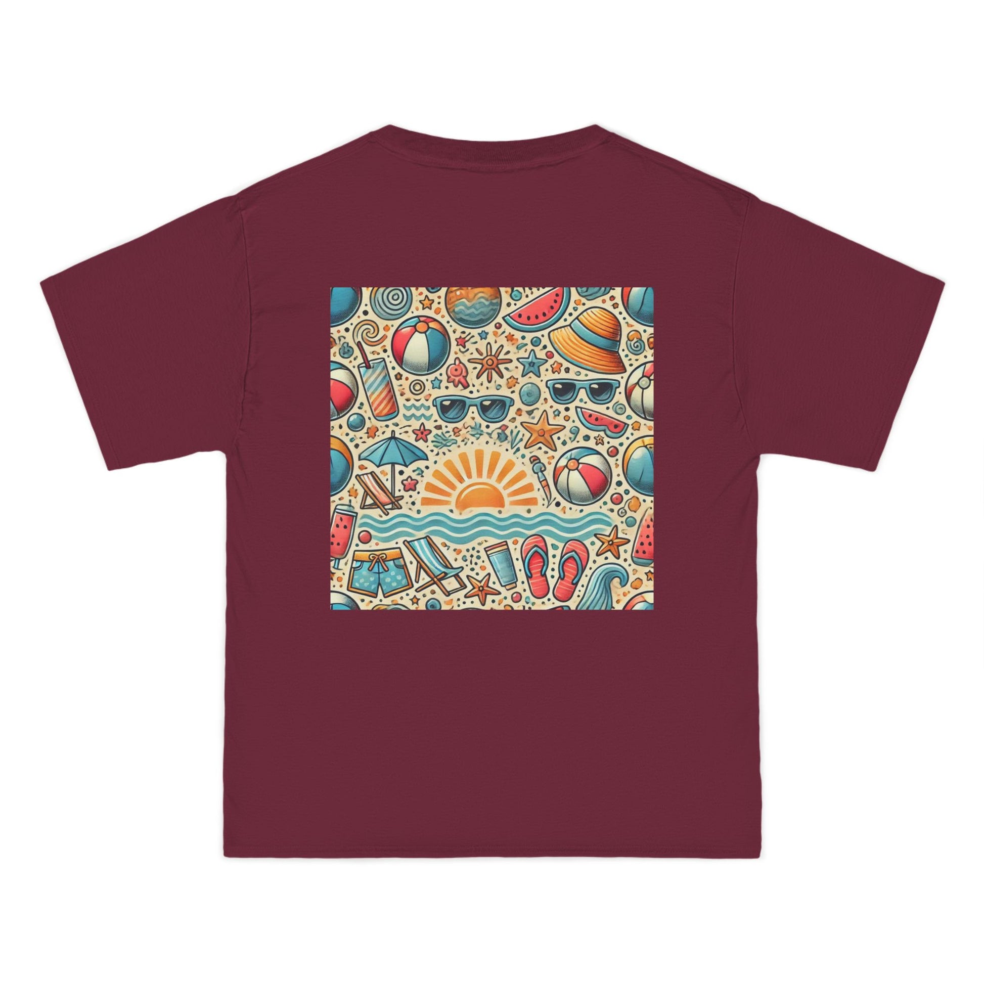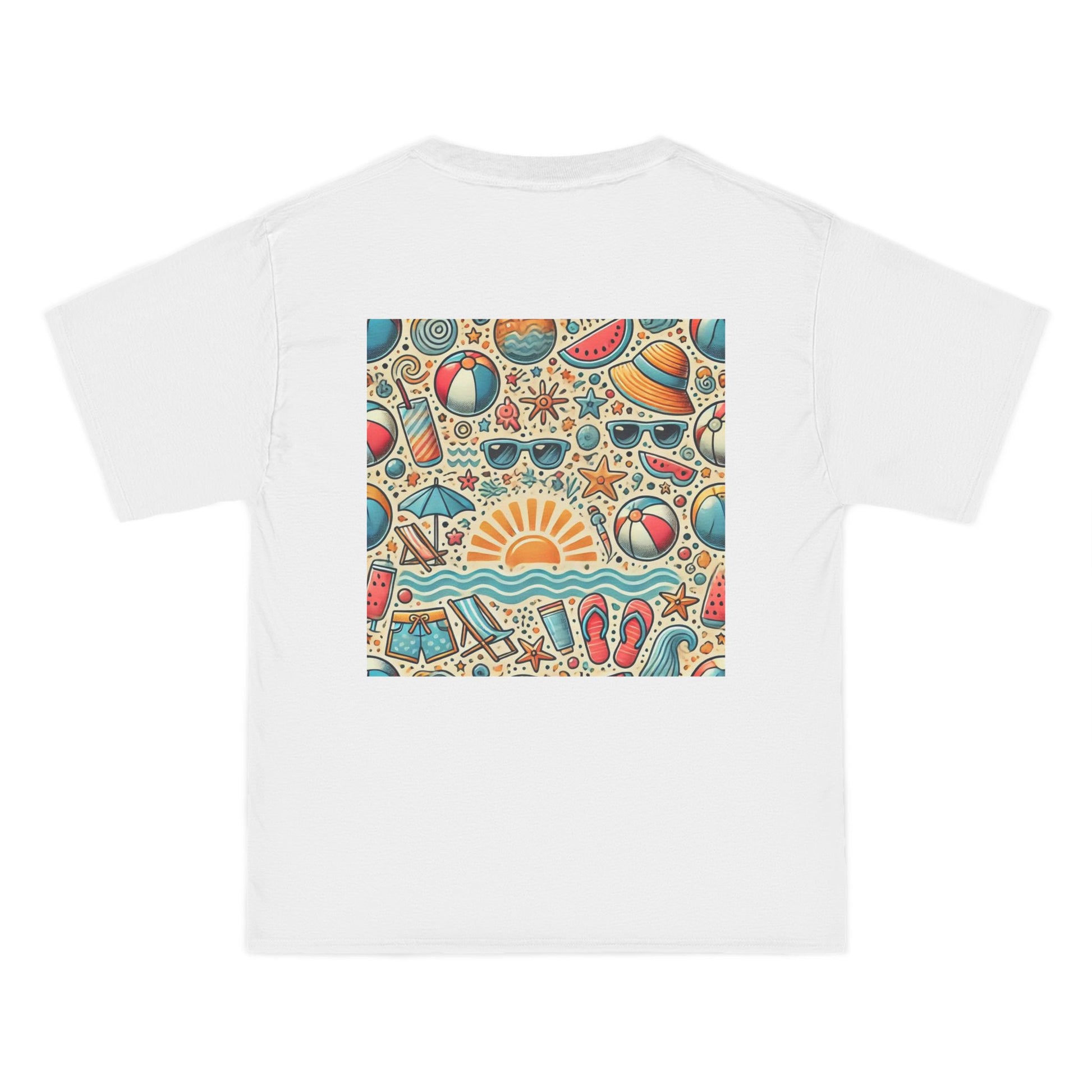 Dive into a world of vibrant hues and sun-kissed memories with our Beach Scene: Playful Summer Tee. Unleash your creativity and wear your world with this one-of-a-kind design, bursting with beach balls, sun hats, and sunglasses, all dancing against a dreamy pastel backdrop.