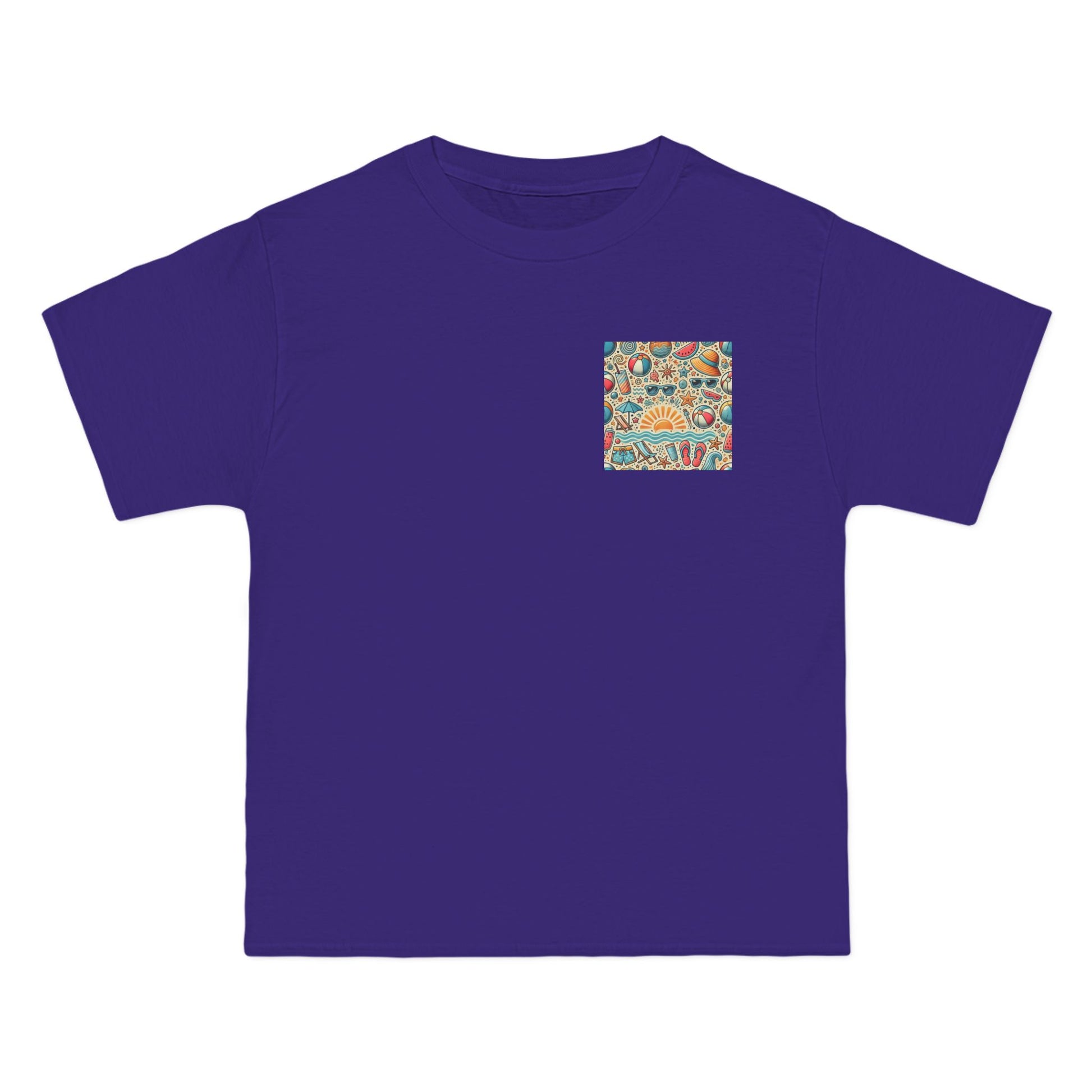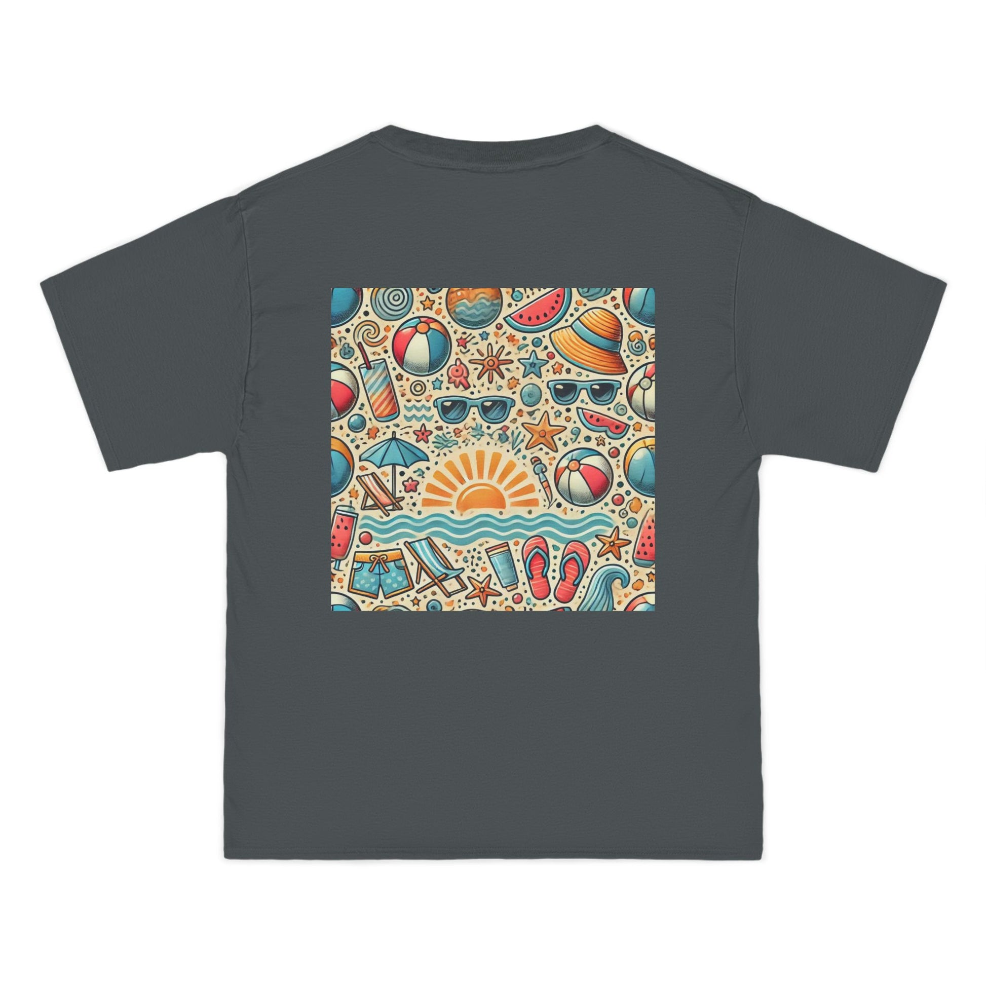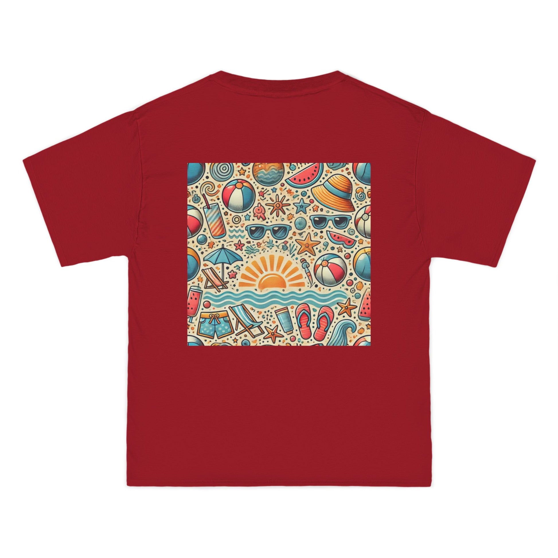 Dive into a world of vibrant hues and sun-kissed memories with our Beach Scene: Playful Summer Tee. Unleash your creativity and wear your world with this one-of-a-kind design, bursting with beach balls, sun hats, and sunglasses, all dancing against a dreamy pastel backdrop.