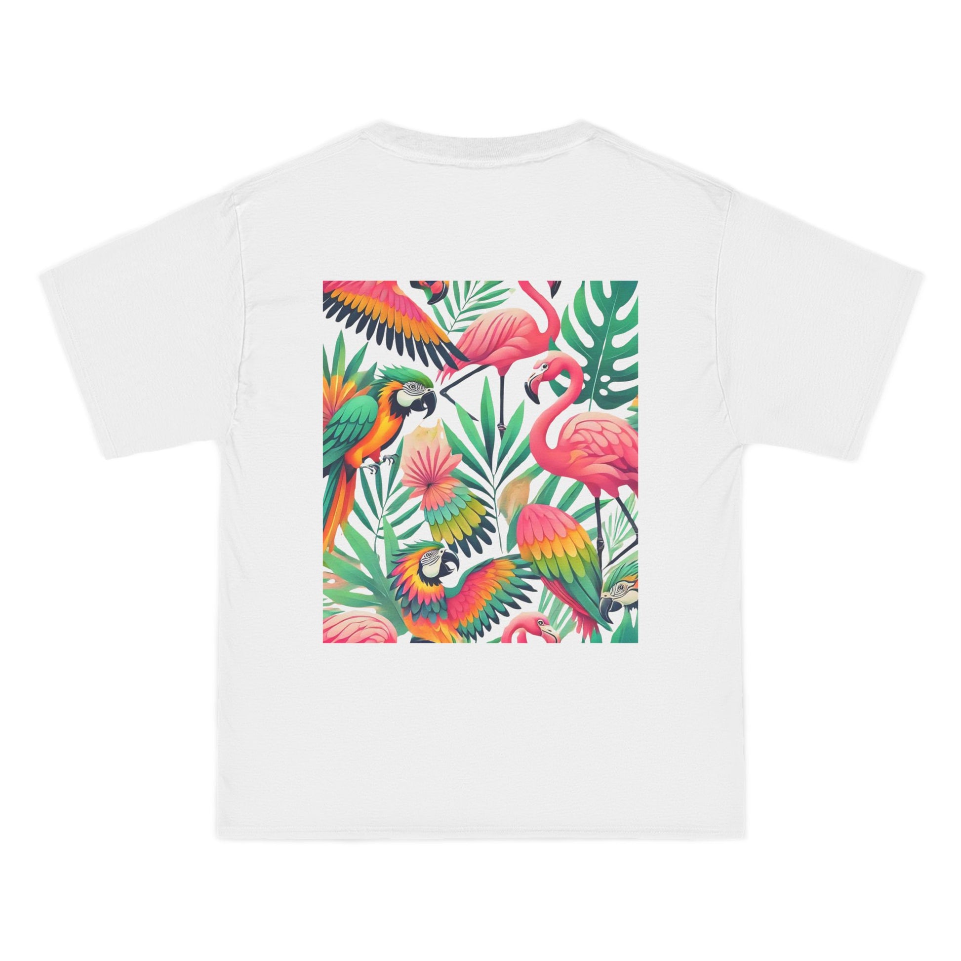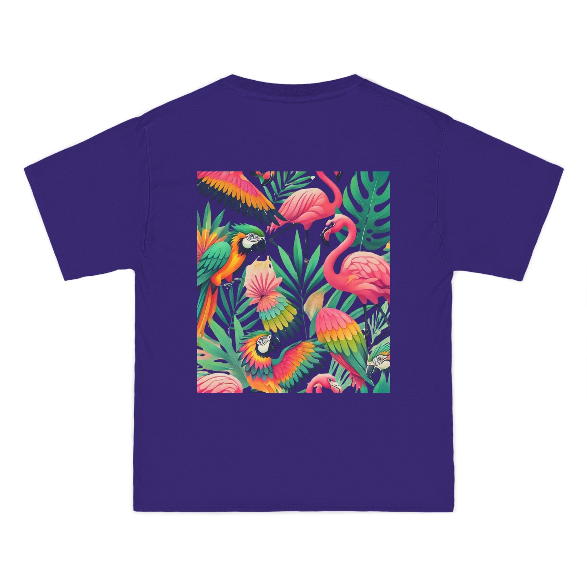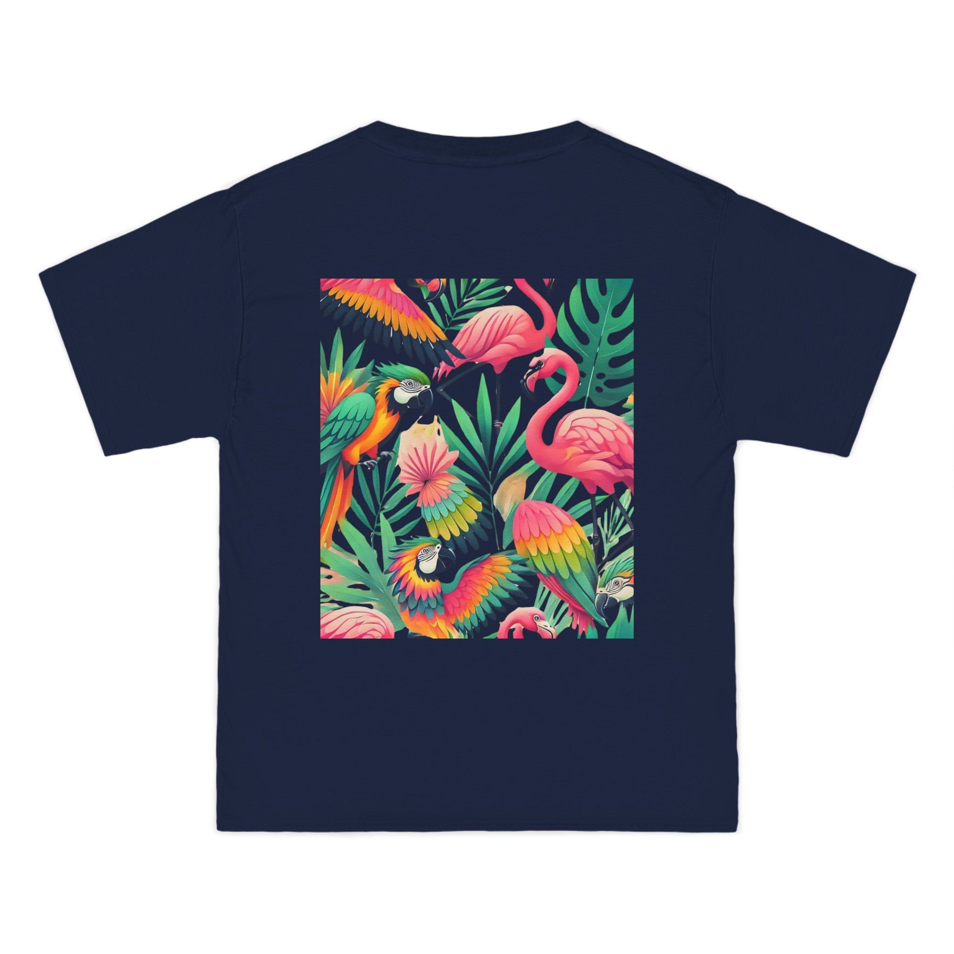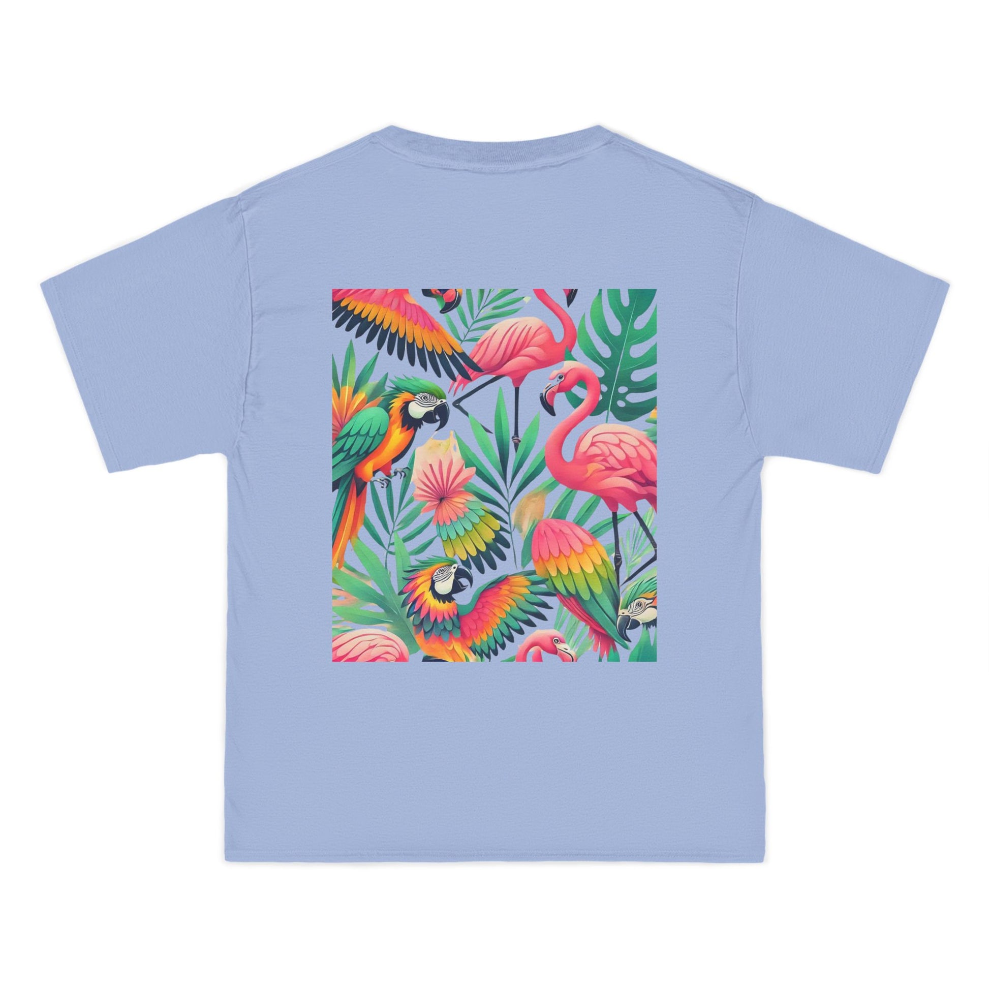 Welcome to the vibrant world of the Birds Pattern: Playful Summer tee from Whatever Clothing! Bursting with color and charm, this unique piece creates a whimsical symphony of stylized parrots and flamingos, their exaggerated bright feathers dancing against a dreamy pastel backdrop. It's more than just a shirt - it's wearable art.
