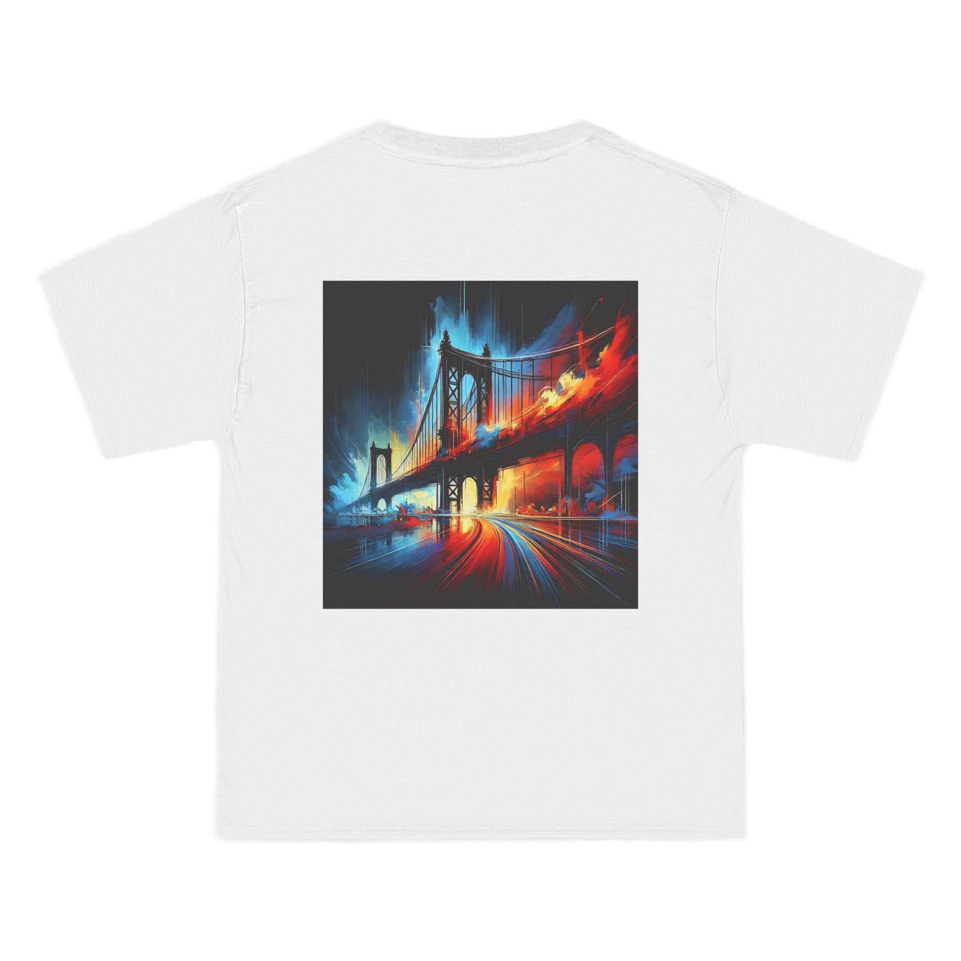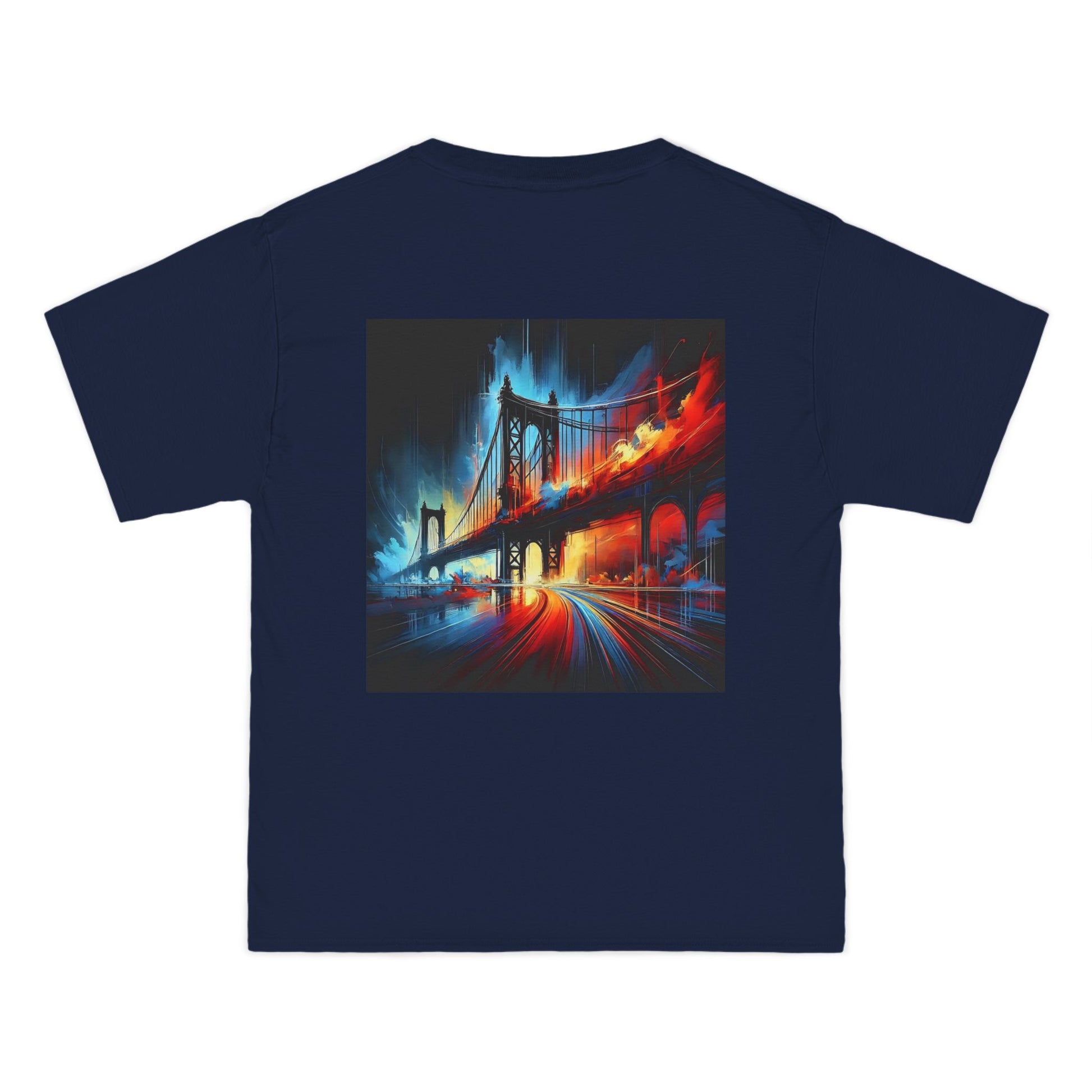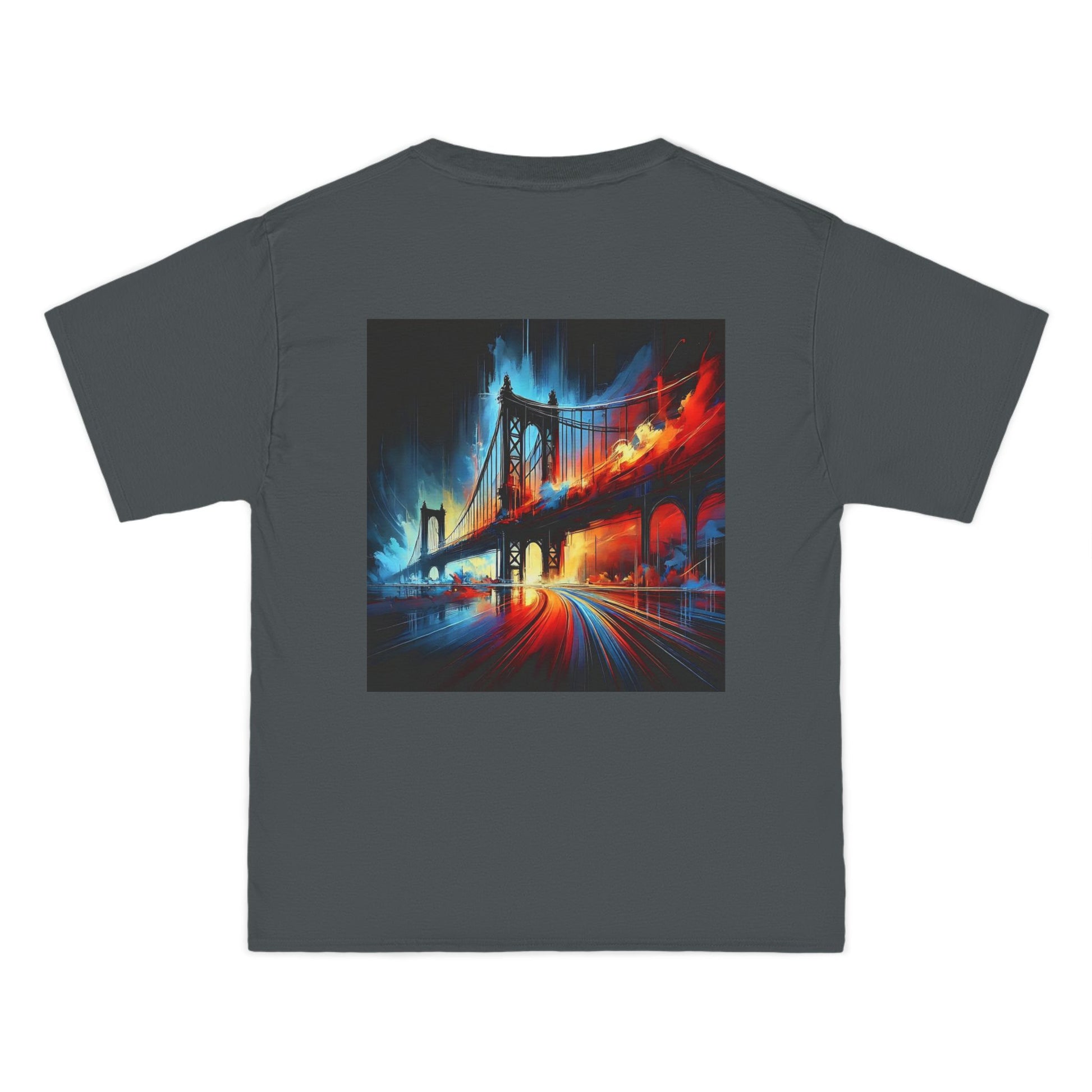 This expressive design captures the invigorating energy of a bridge in motion, brought to life with splashes of red, orange, and blue against a dark background. Every detail is a testament to your individuality and taste for the extraordinary. It's more than just a clothing piece; it's a statement of your distinct style and passion for the unconventional.