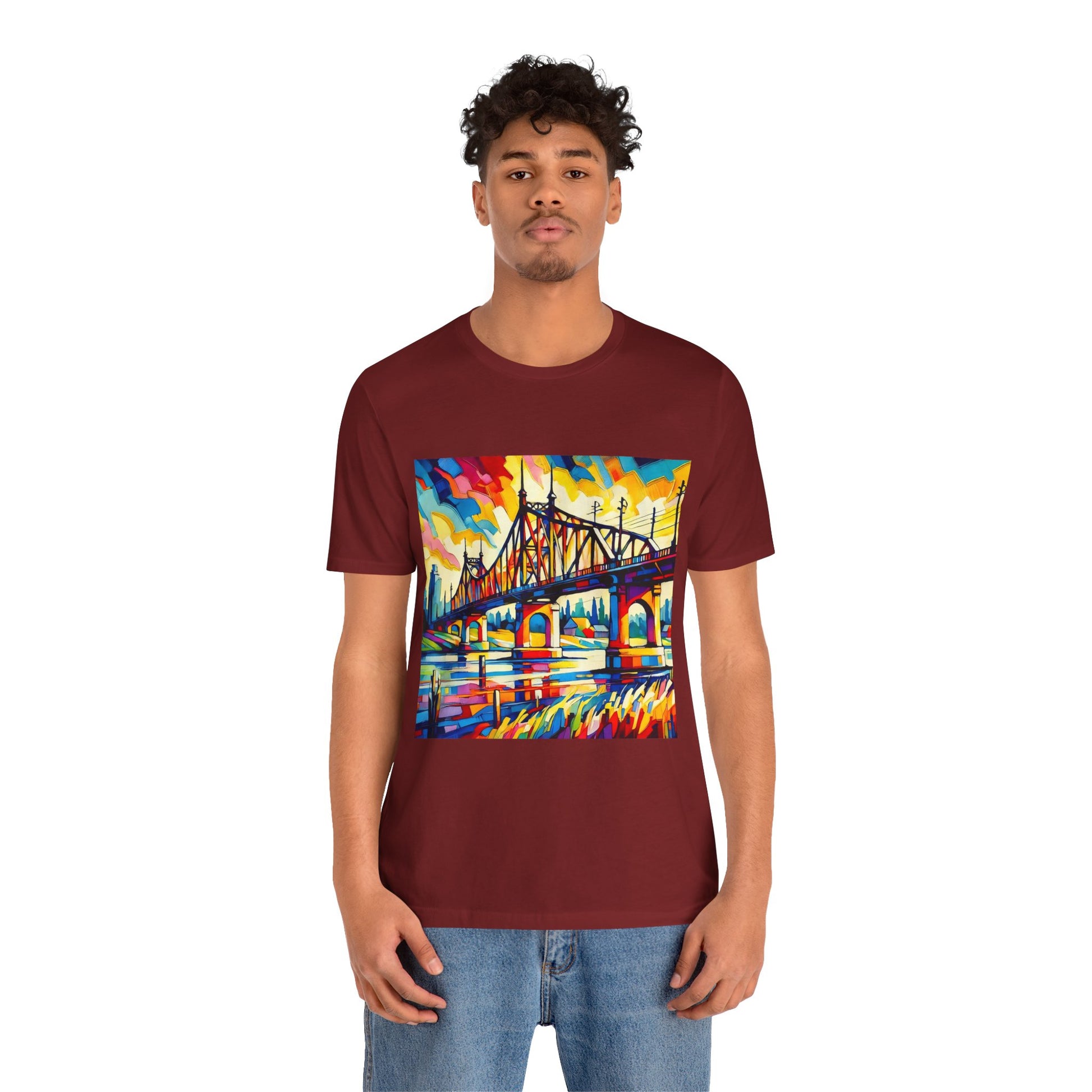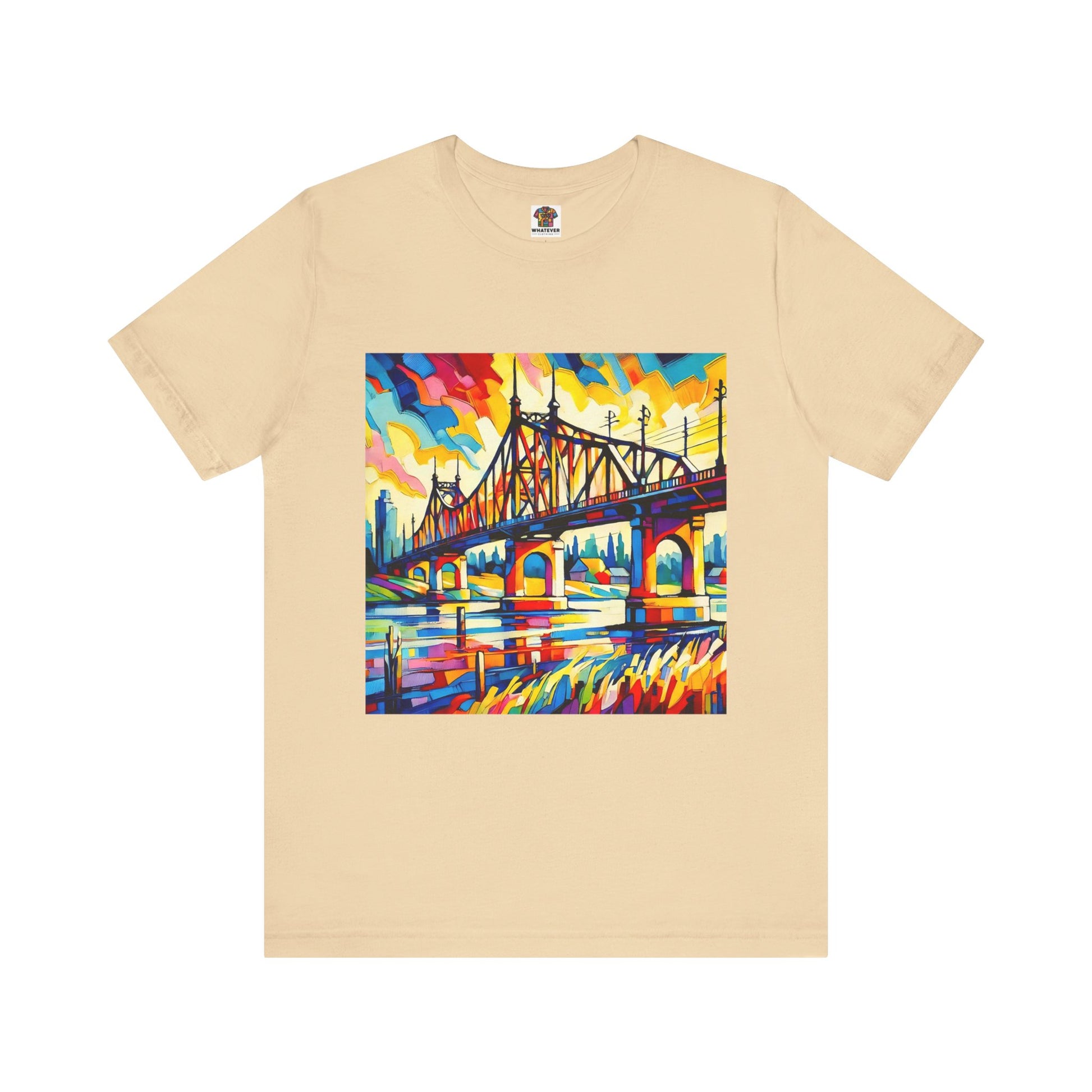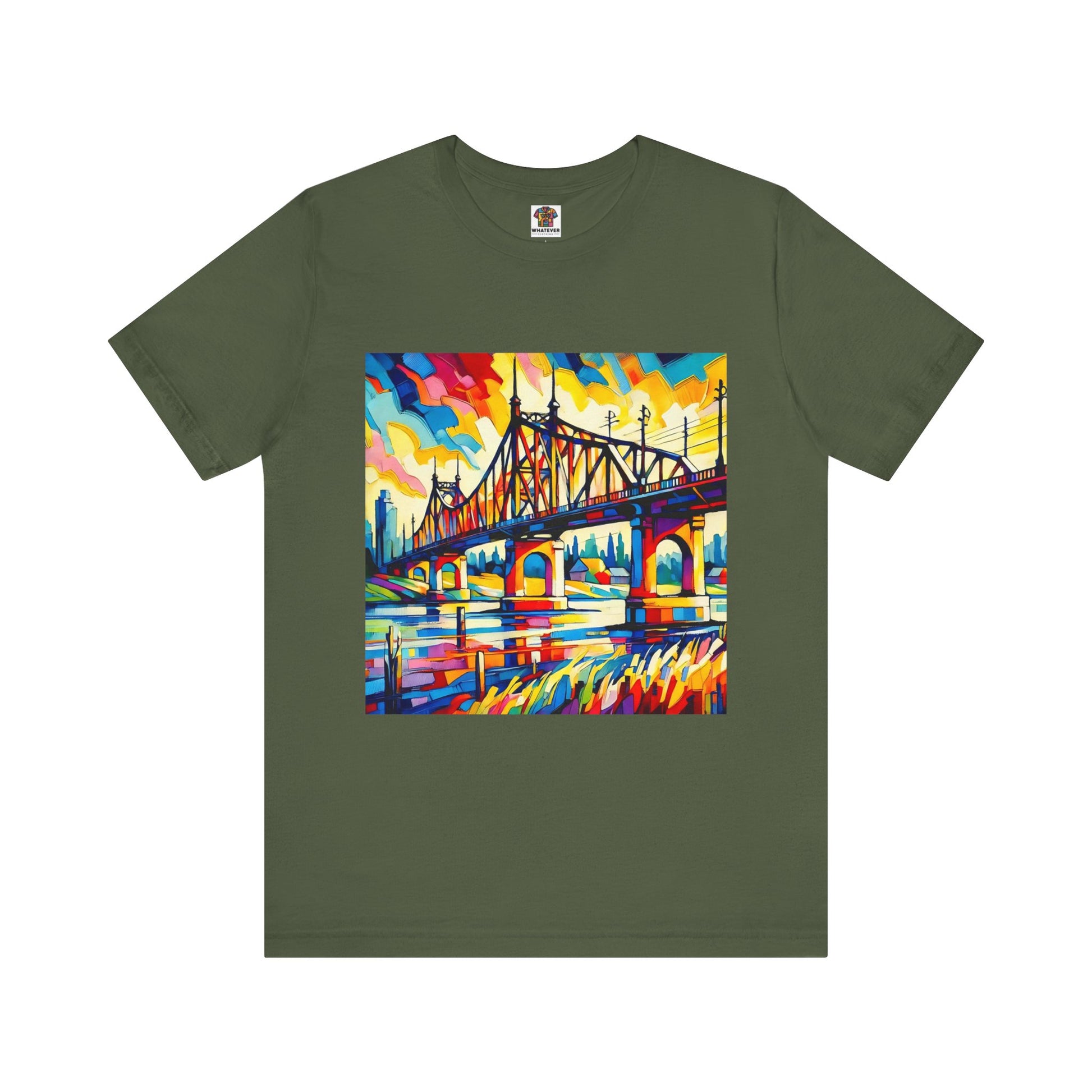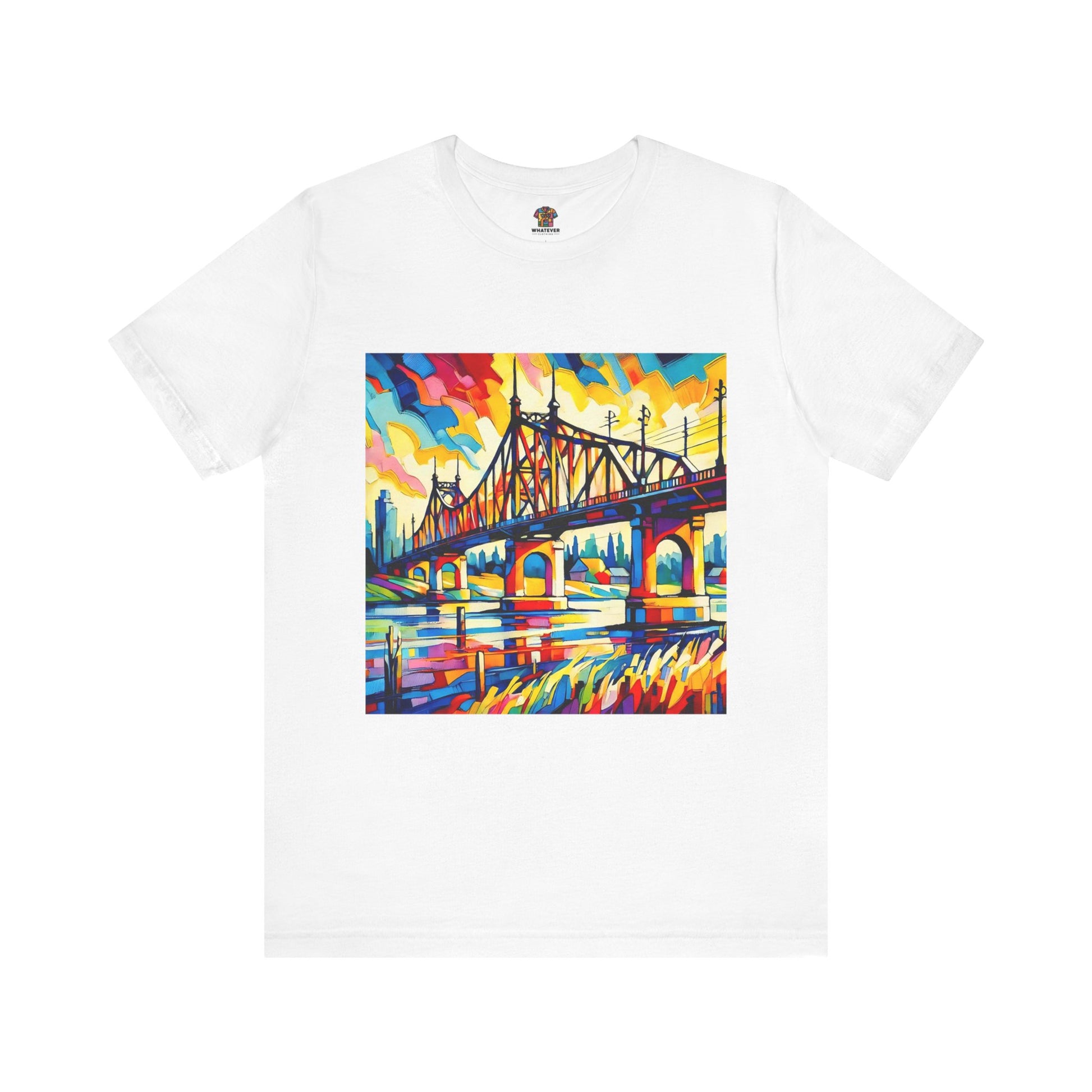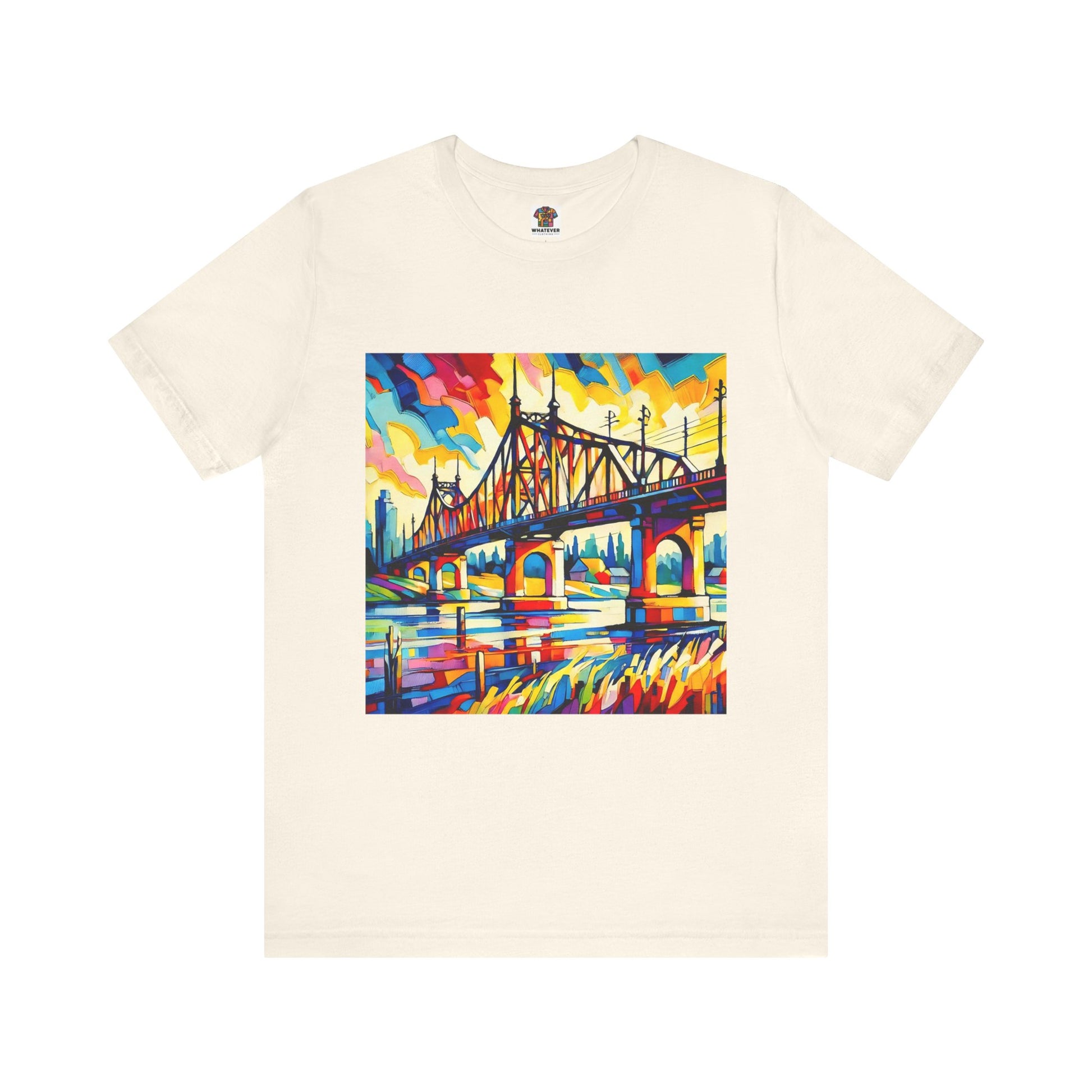 A bright, bold painting of a bridge over a river with simplified forms, focusing on artistic harmony and vivid colors.