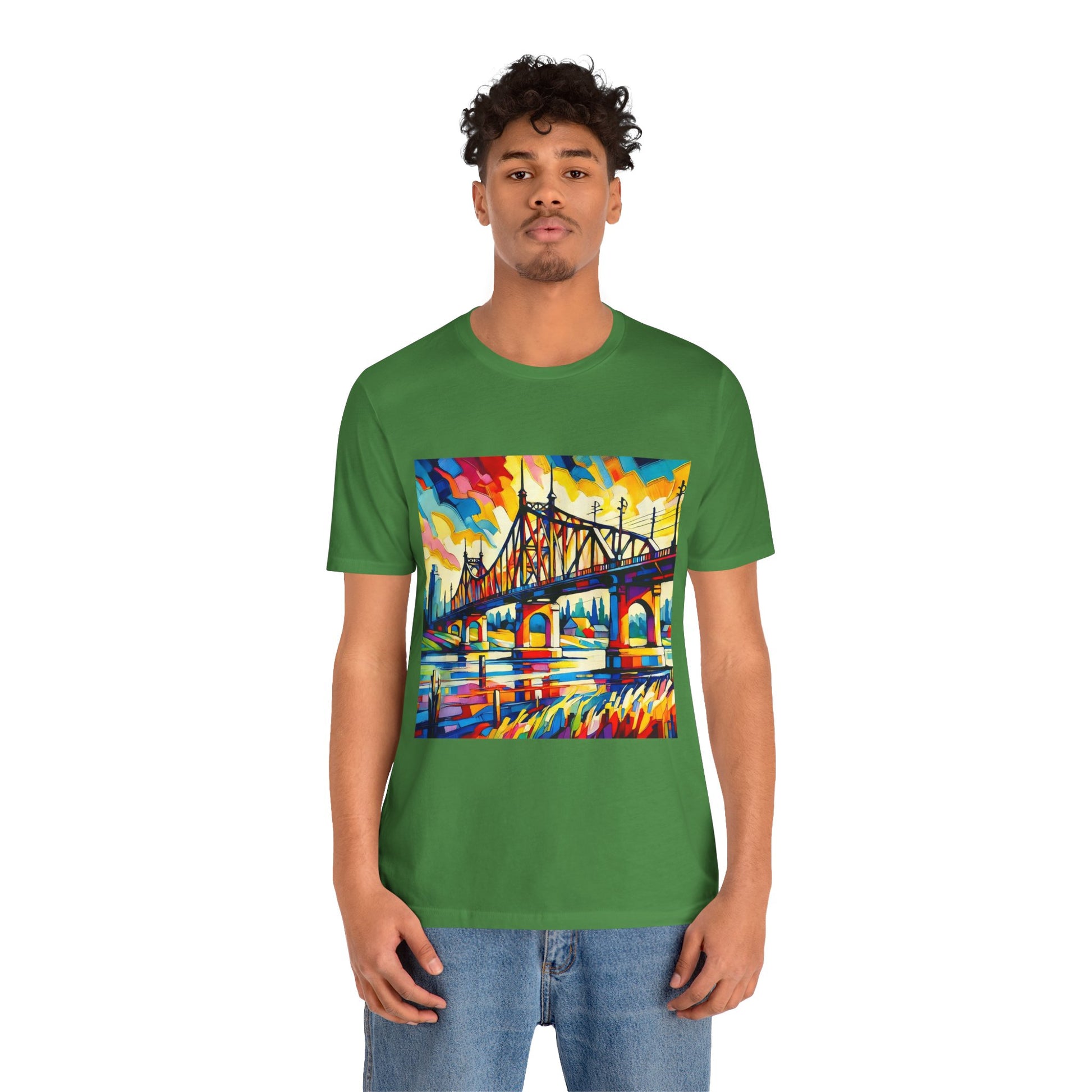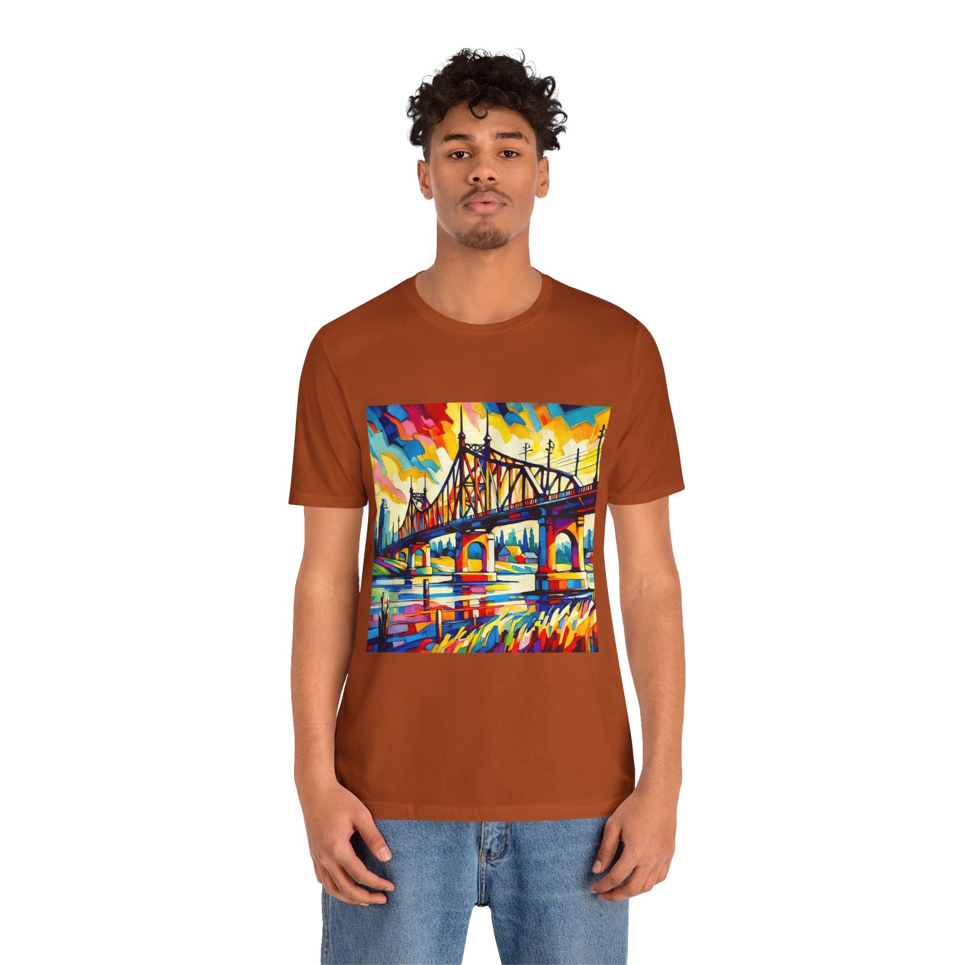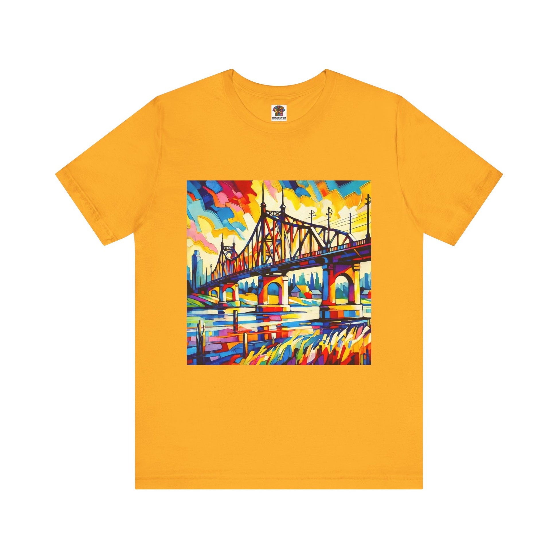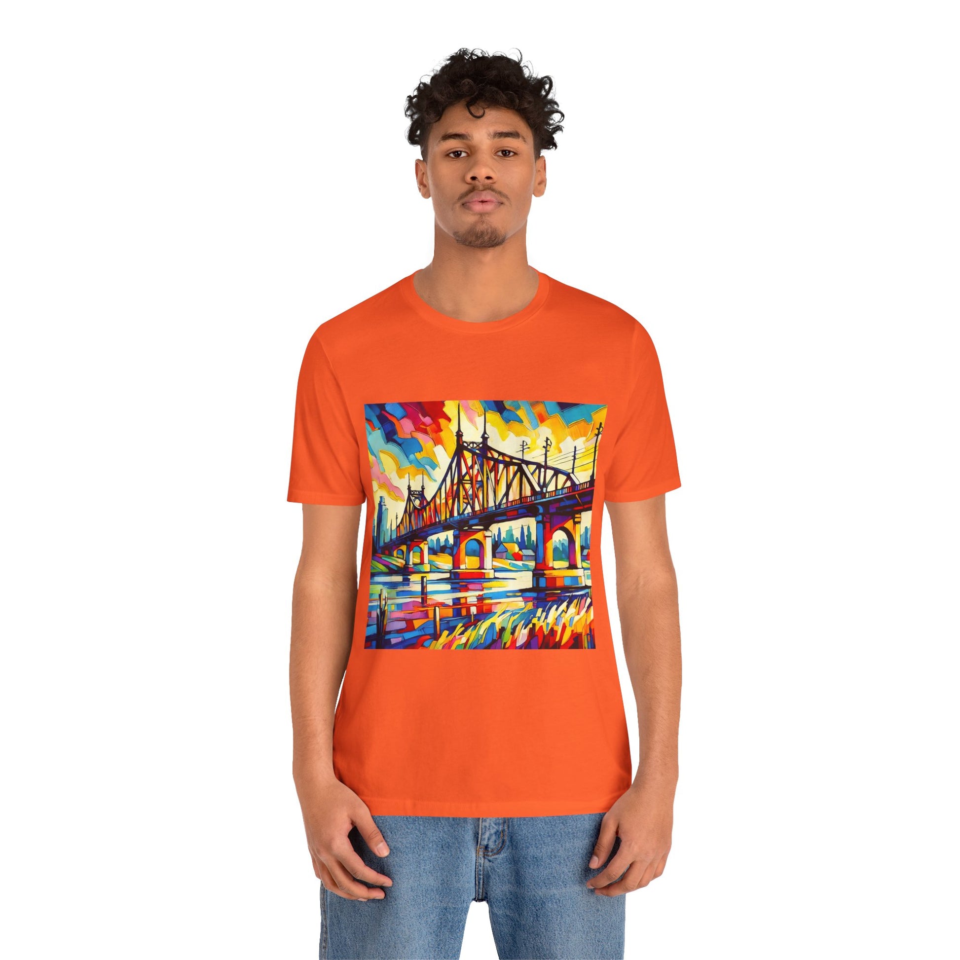 A bright, bold painting of a bridge over a river with simplified forms, focusing on artistic harmony and vivid colors.