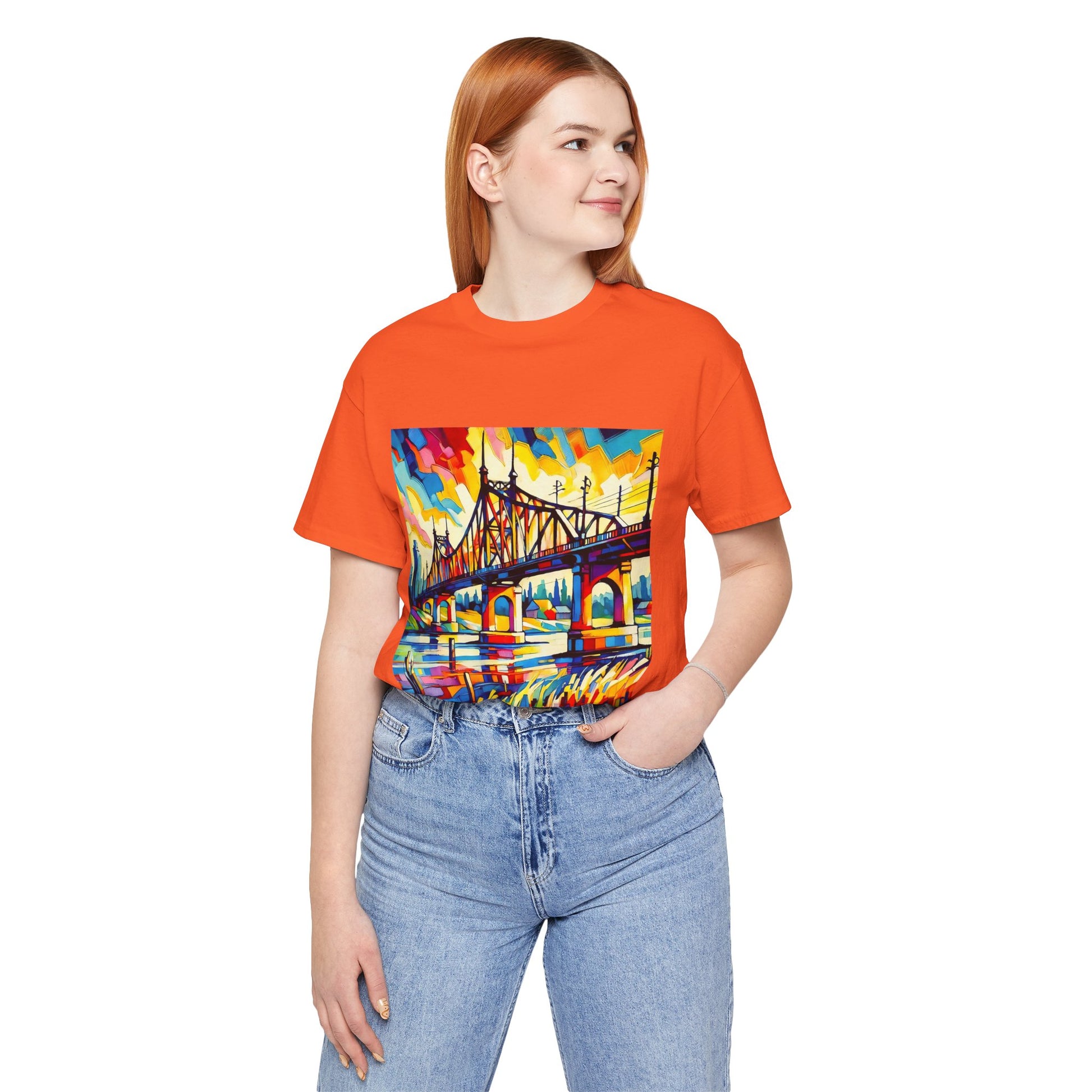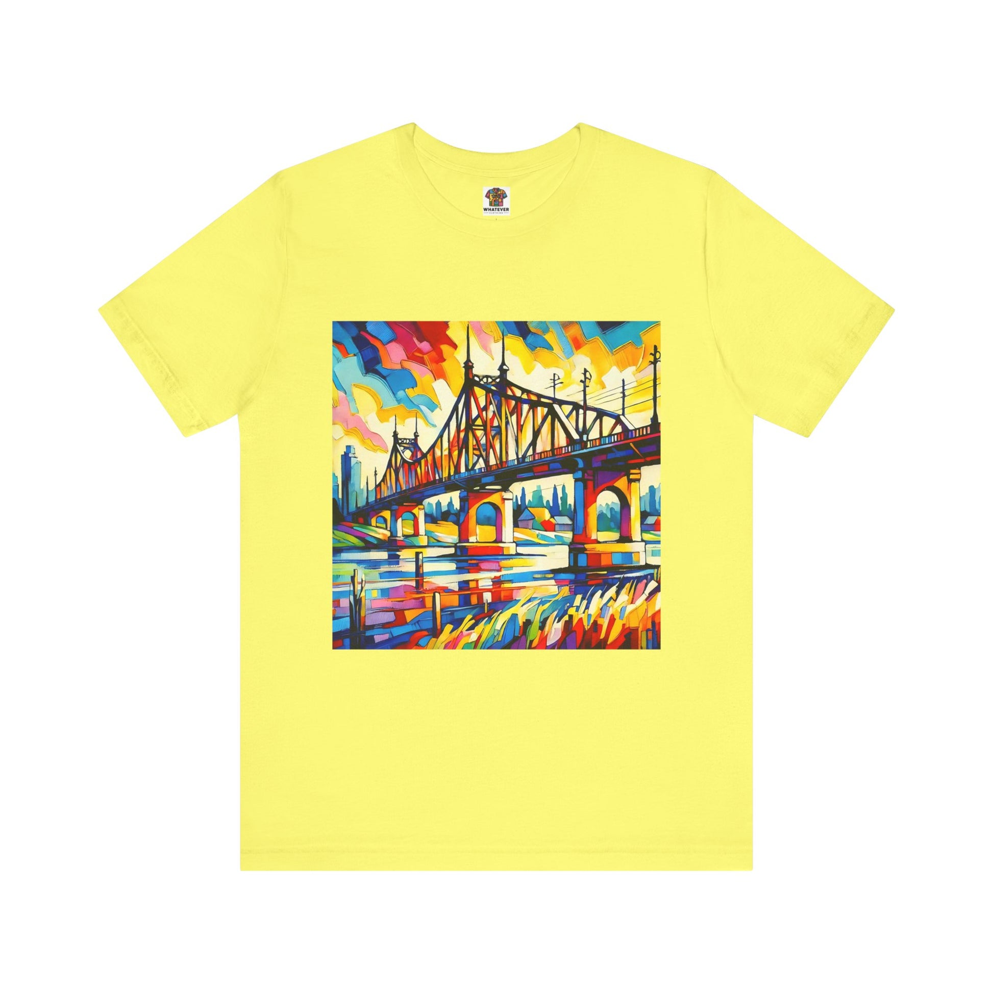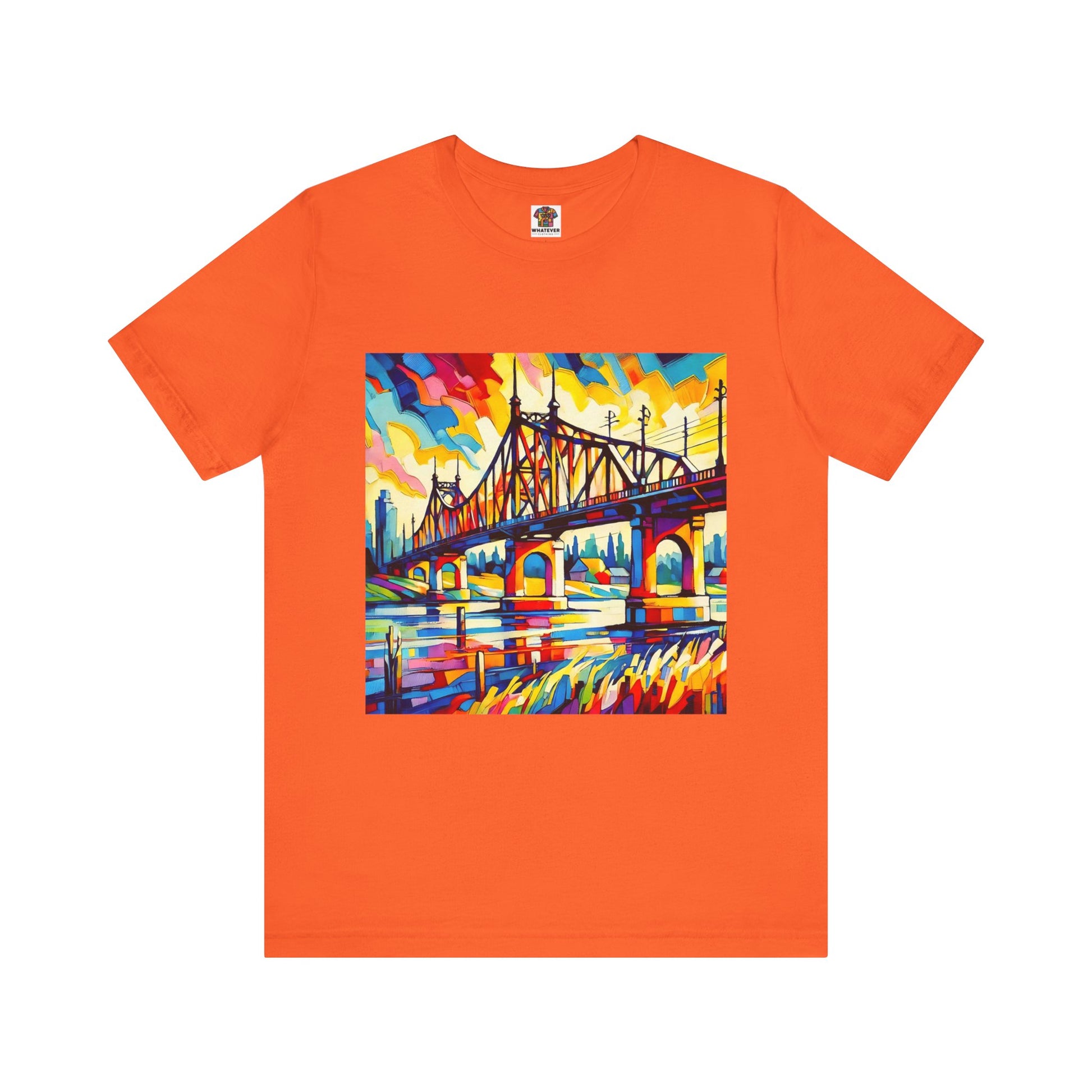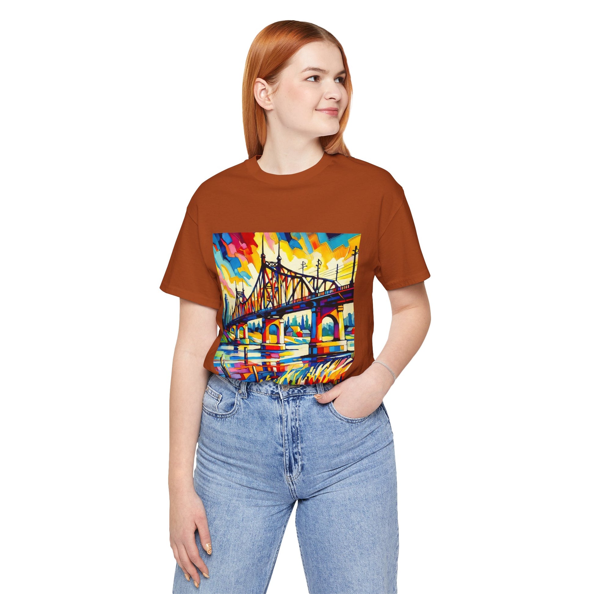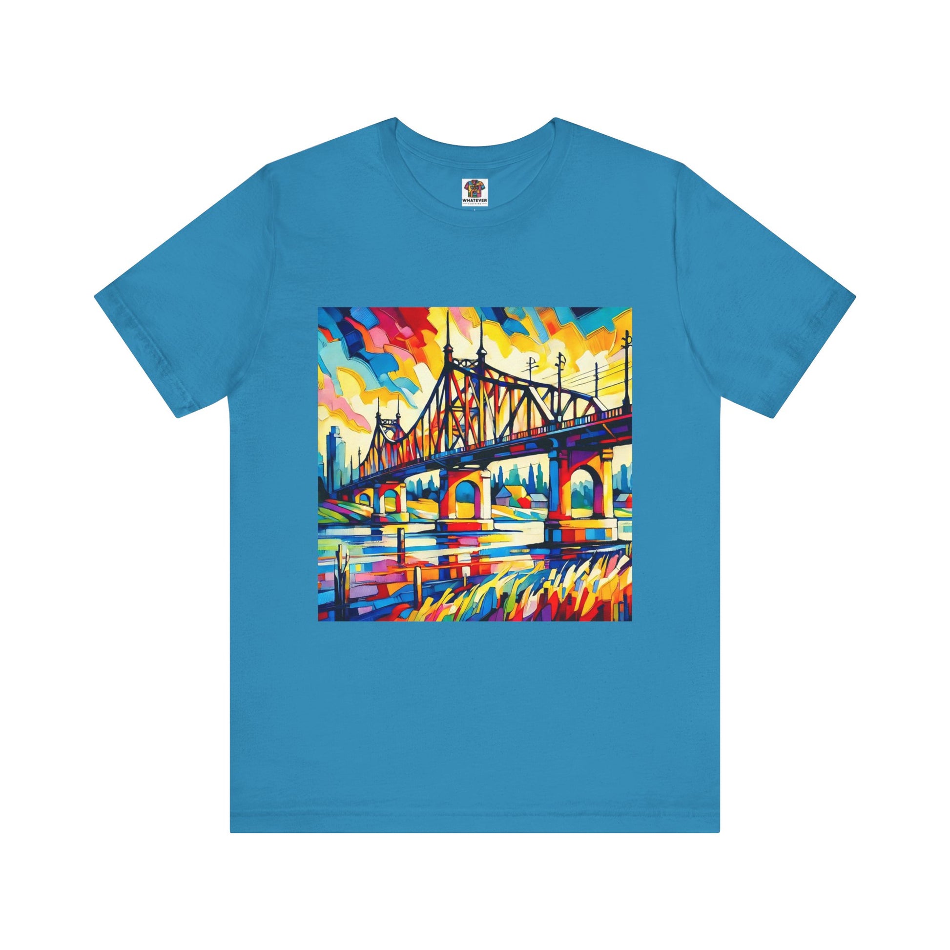 A bright, bold painting of a bridge over a river with simplified forms, focusing on artistic harmony and vivid colors.