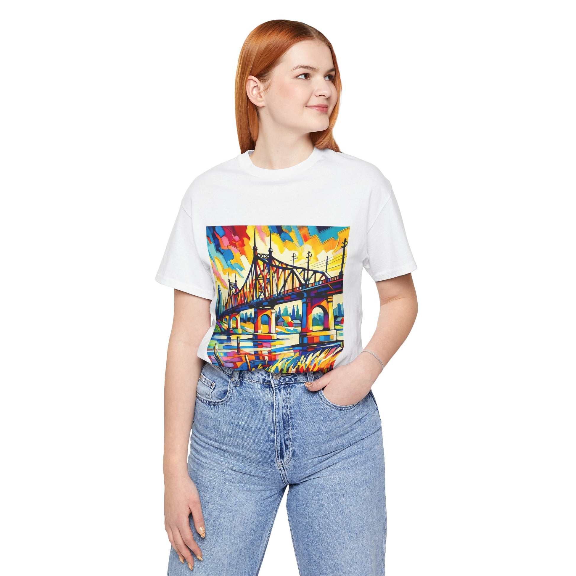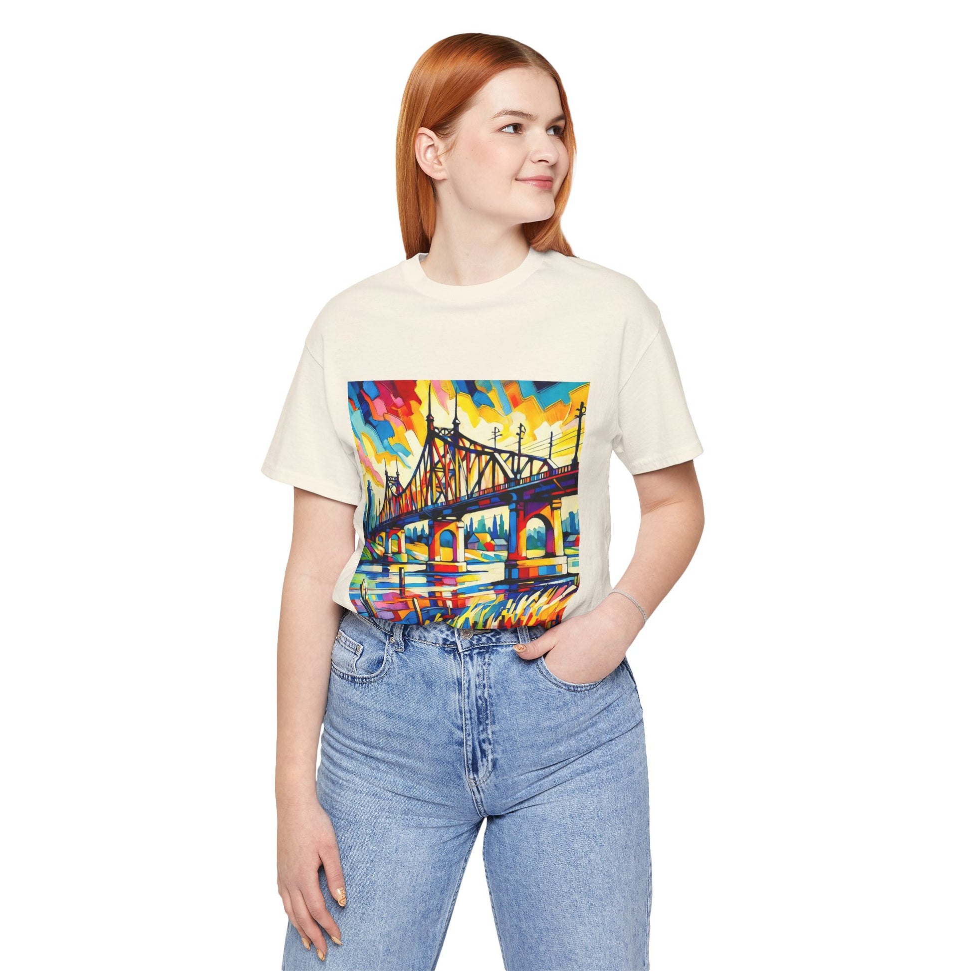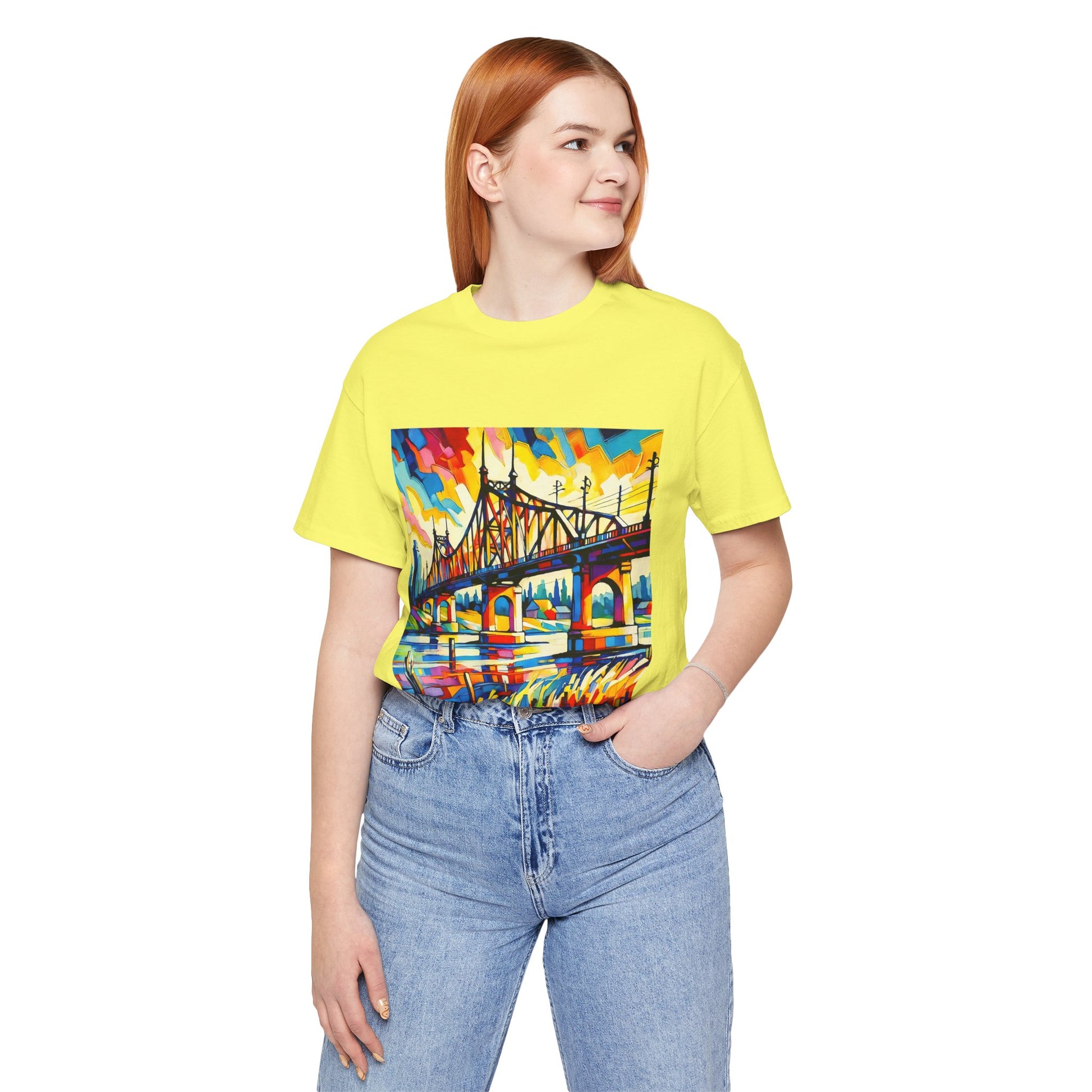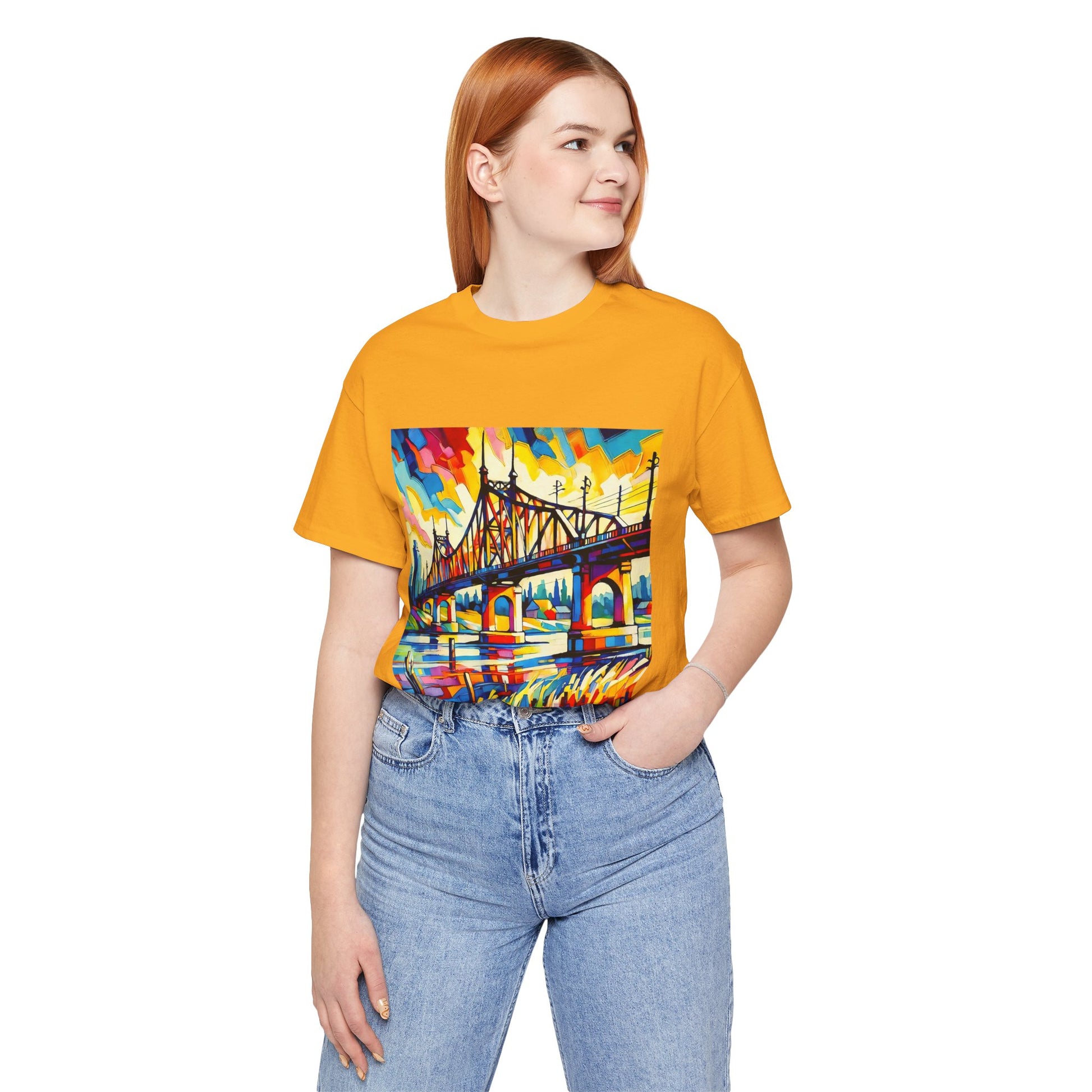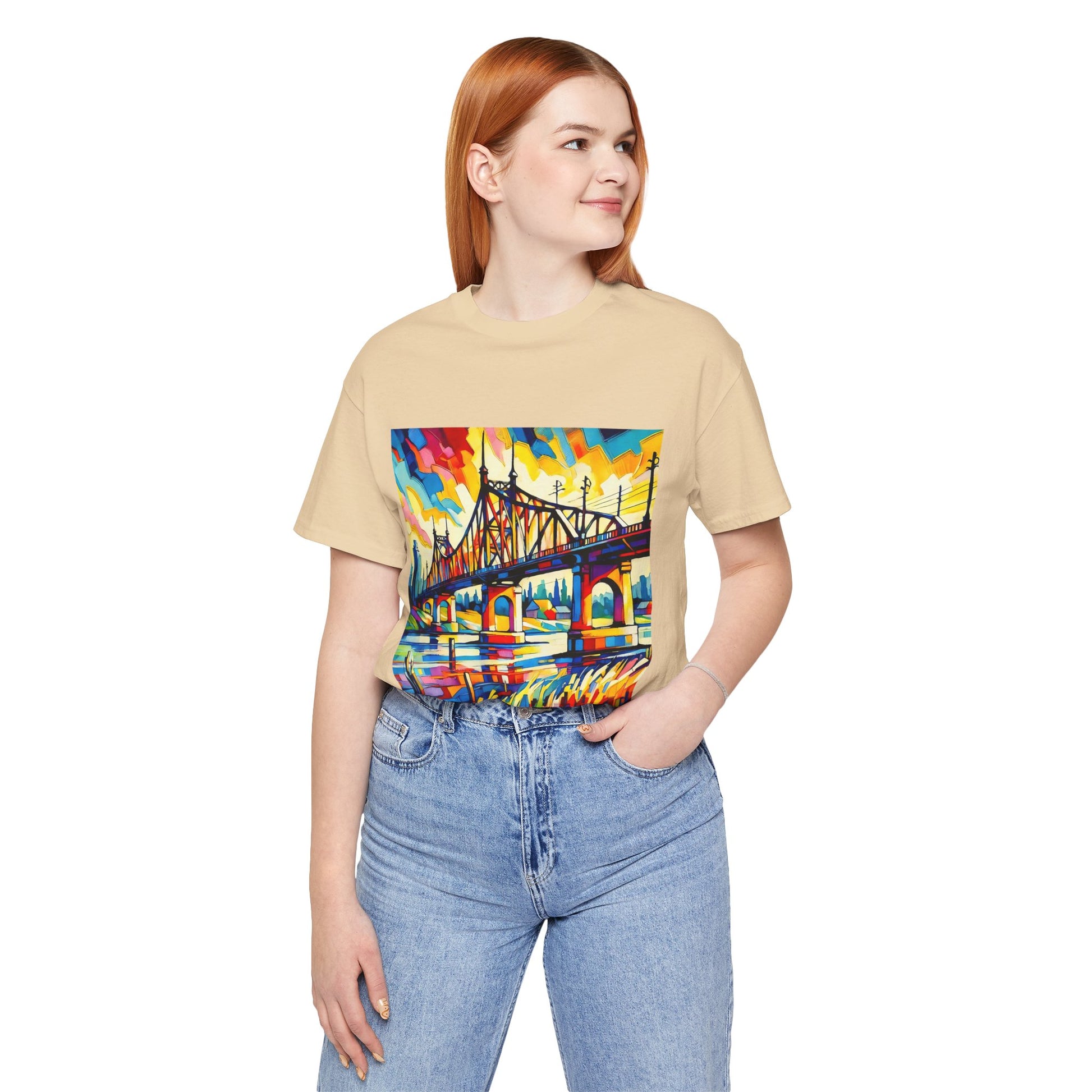 A bright, bold painting of a bridge over a river with simplified forms, focusing on artistic harmony and vivid colors.