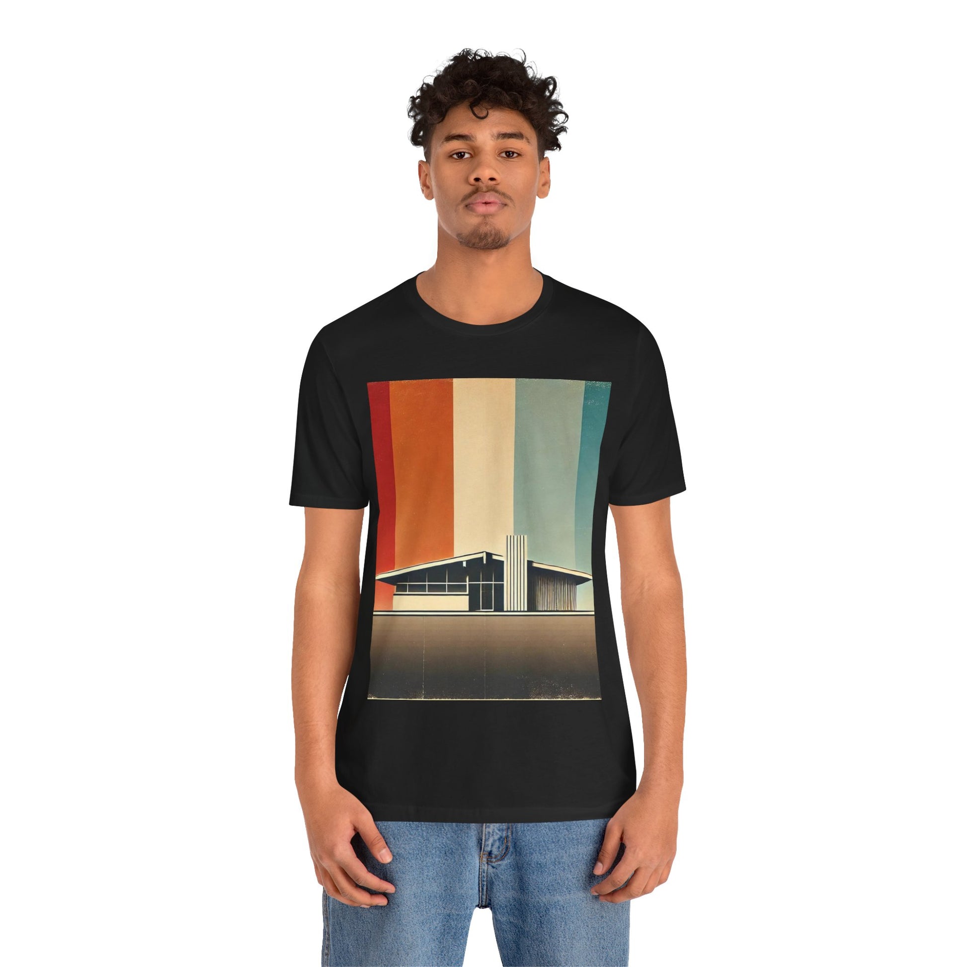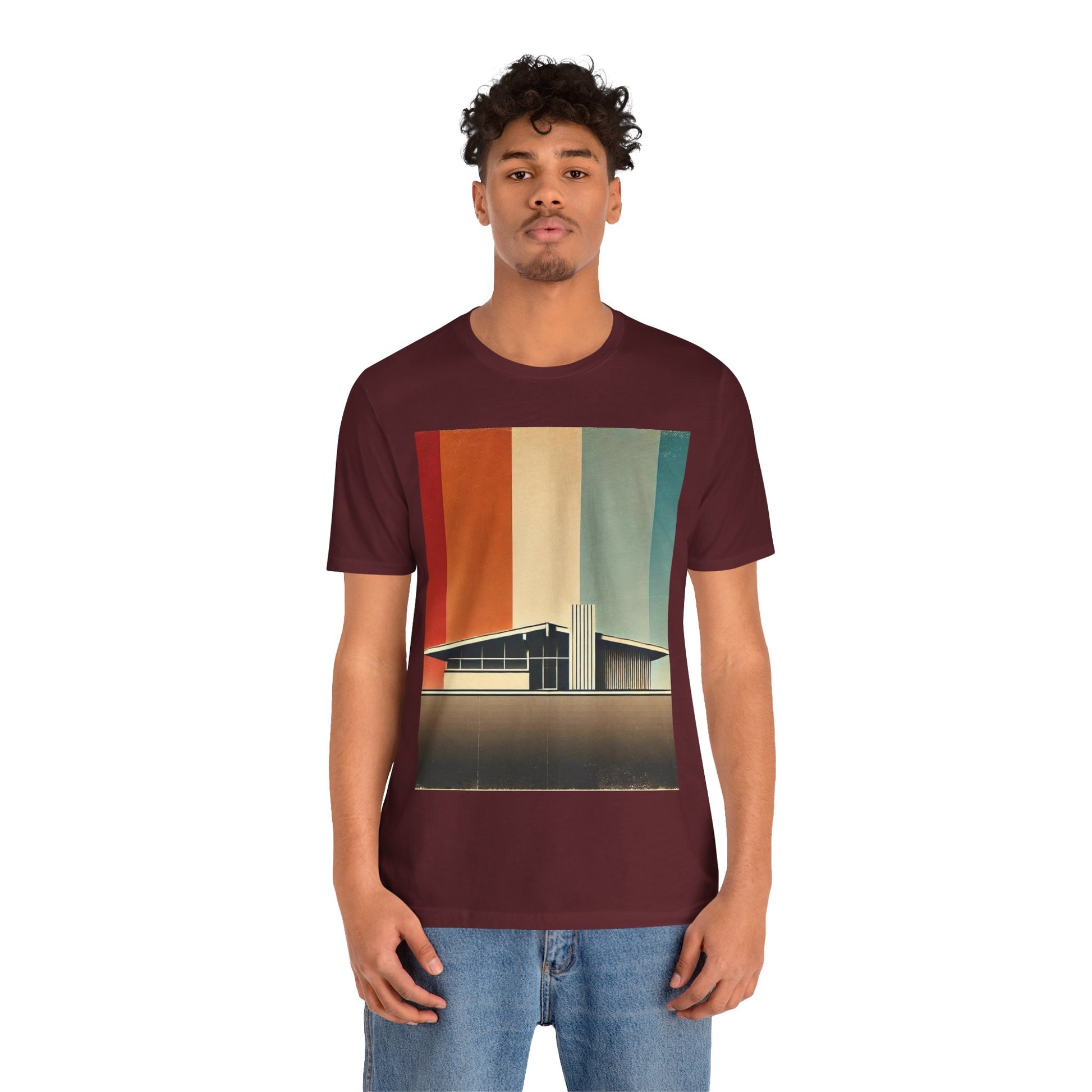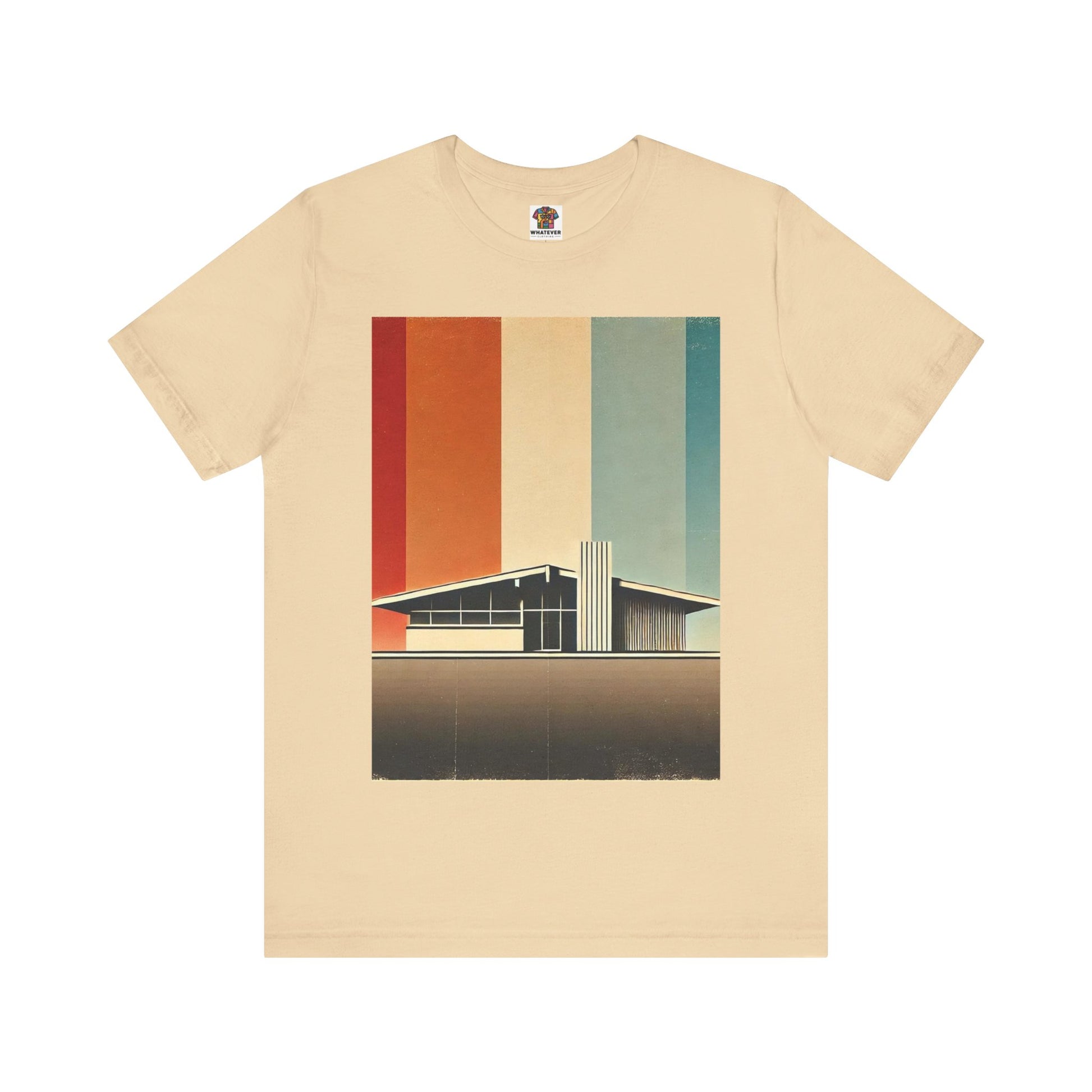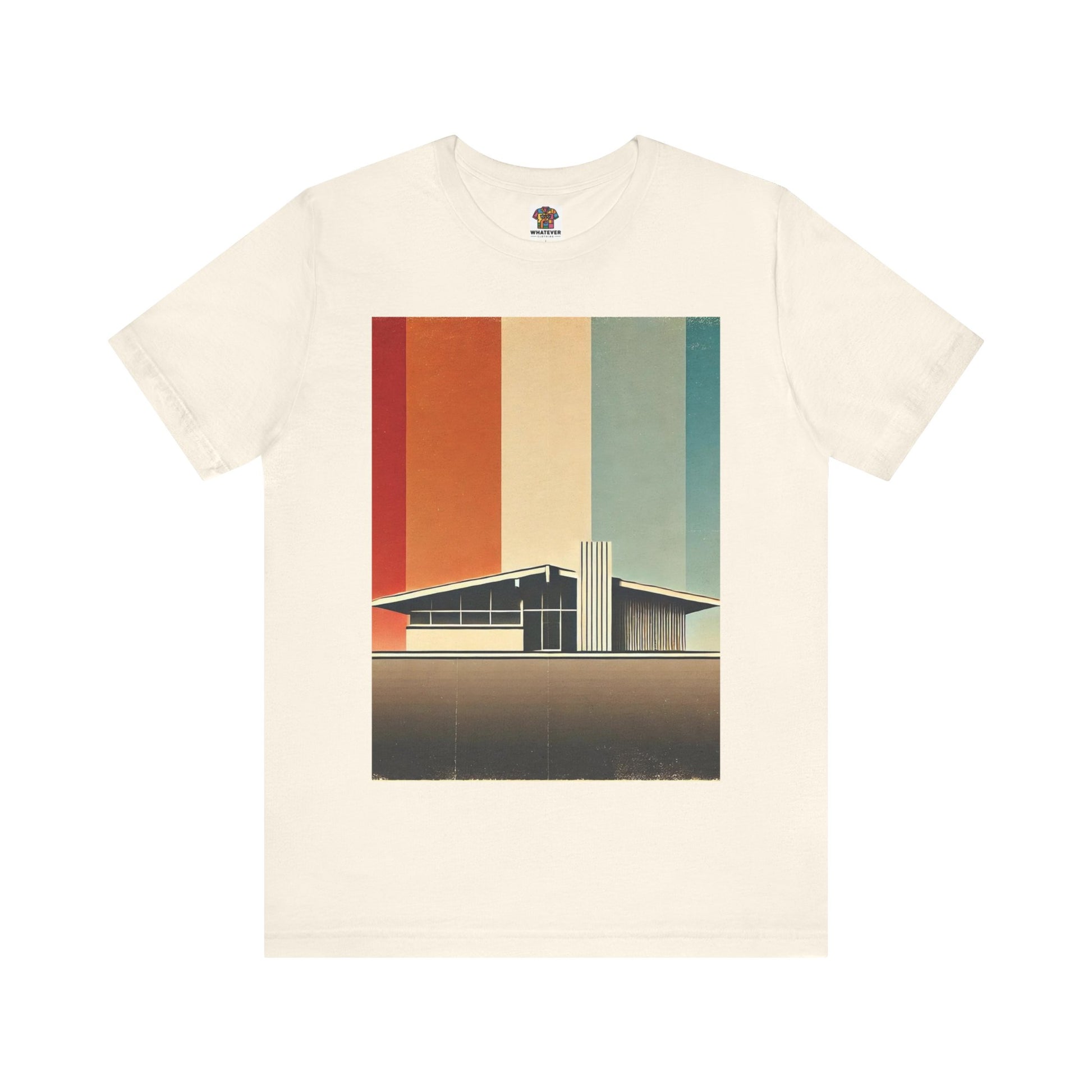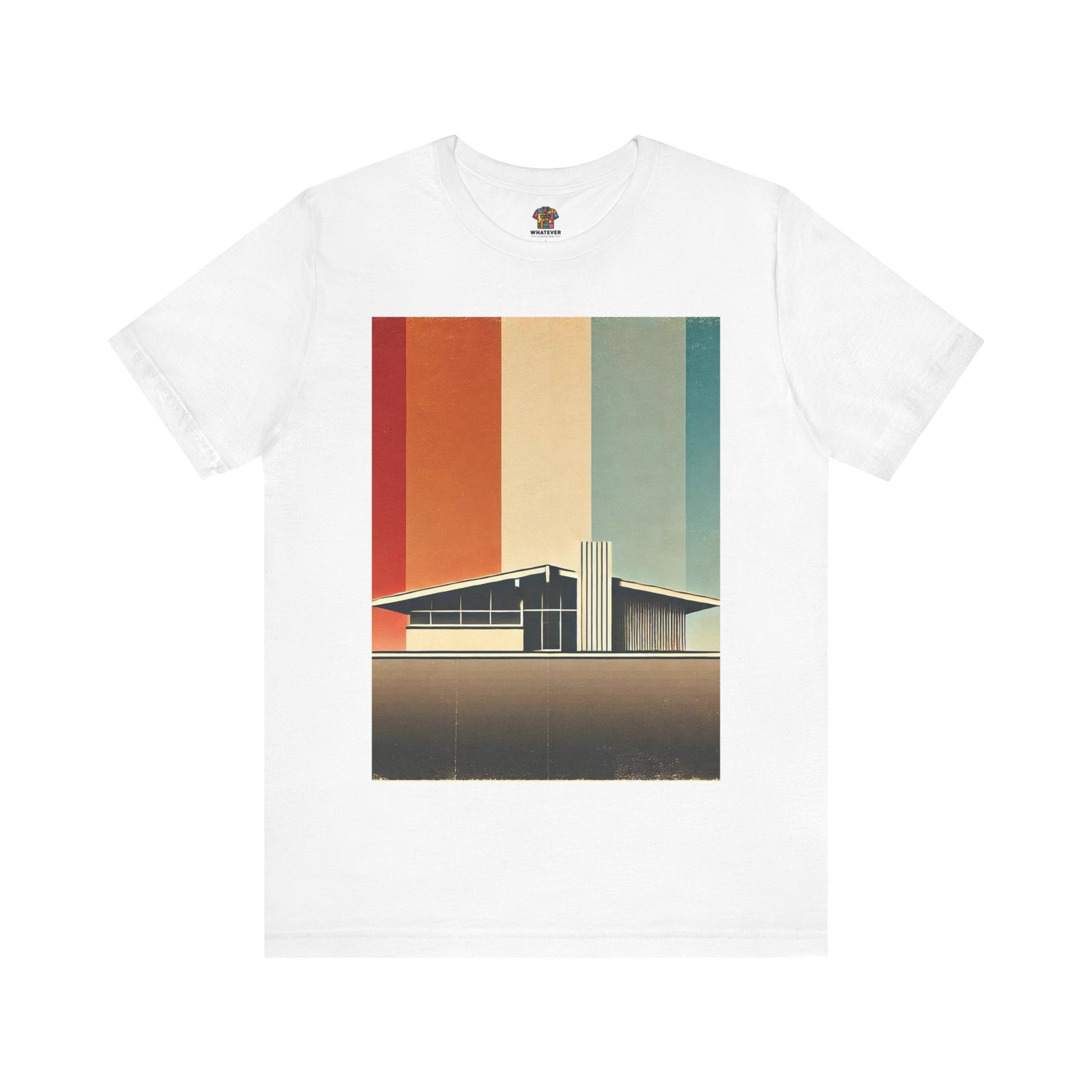 A minimalist mid-century modern house with clean lines, set against a gradient background with a vintage, grainy texture.