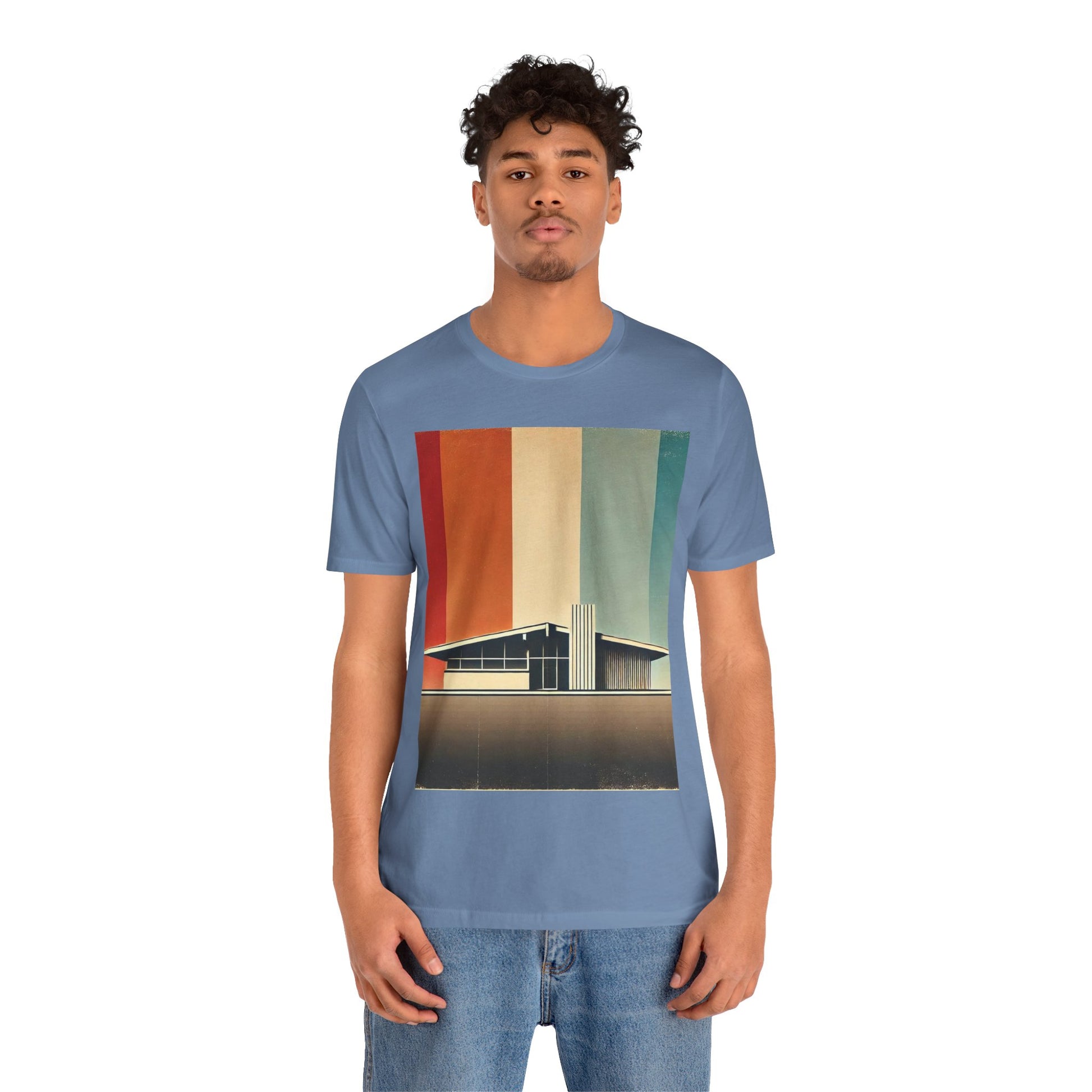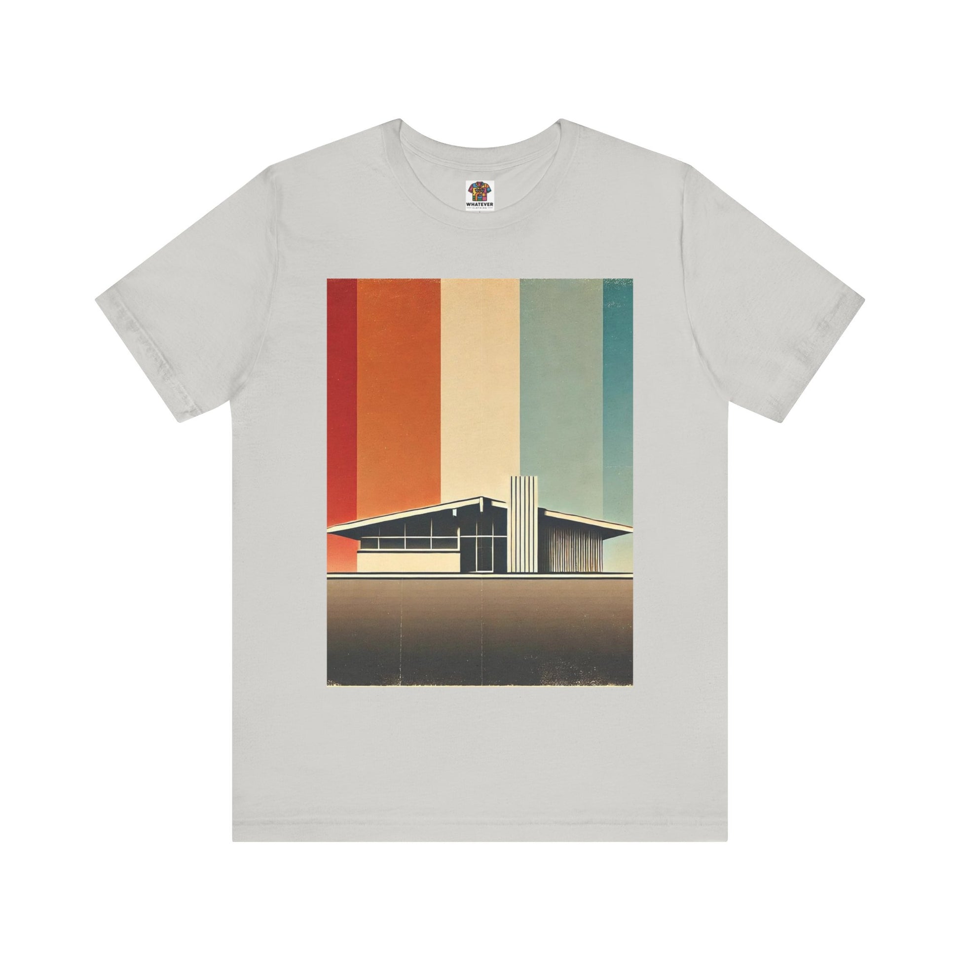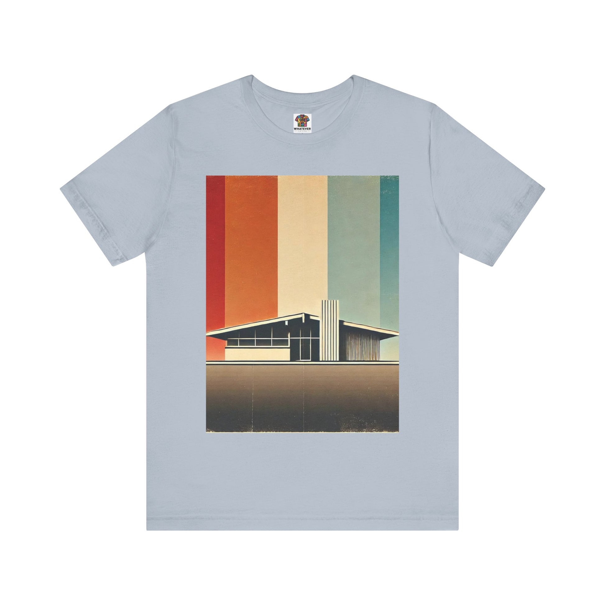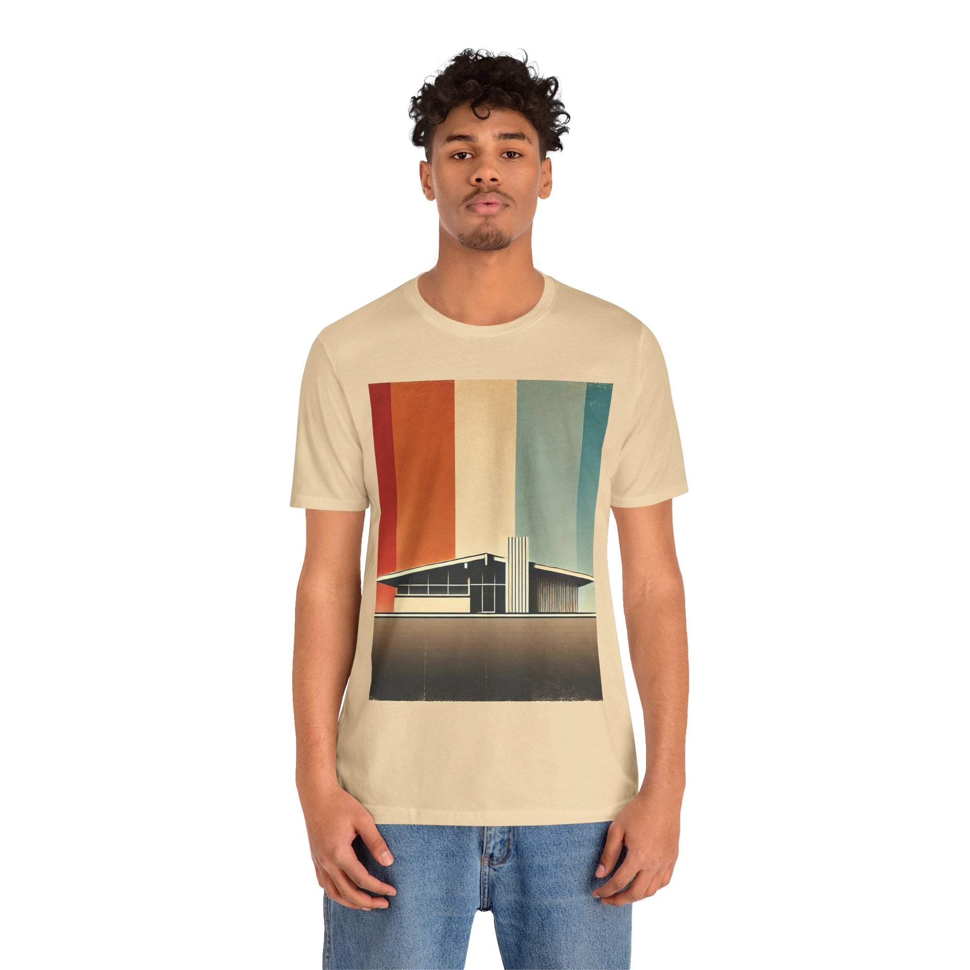 A minimalist mid-century modern house with clean lines, set against a gradient background with a vintage, grainy texture.