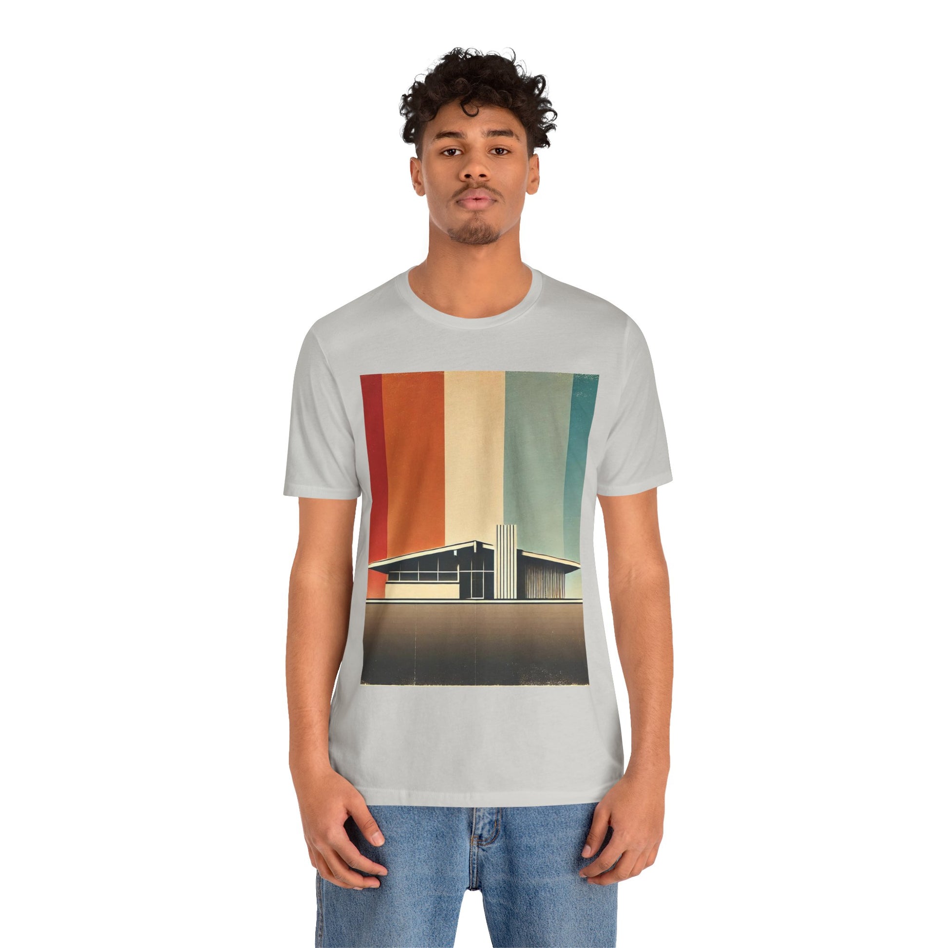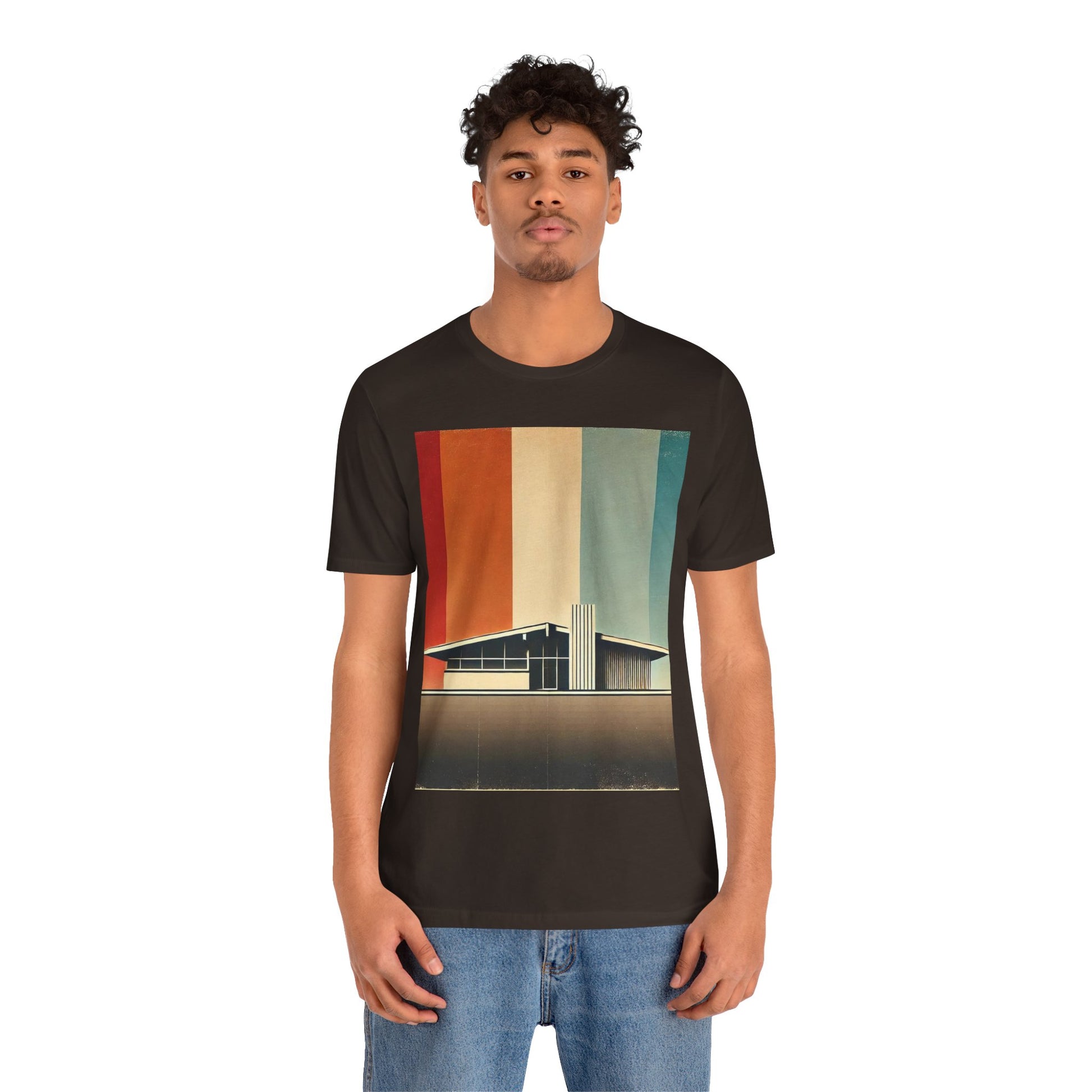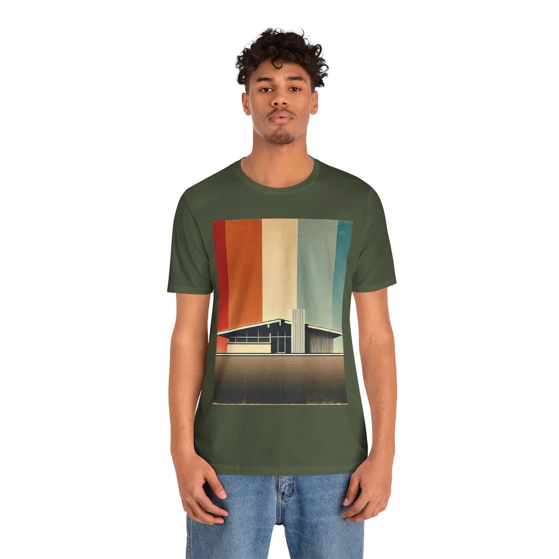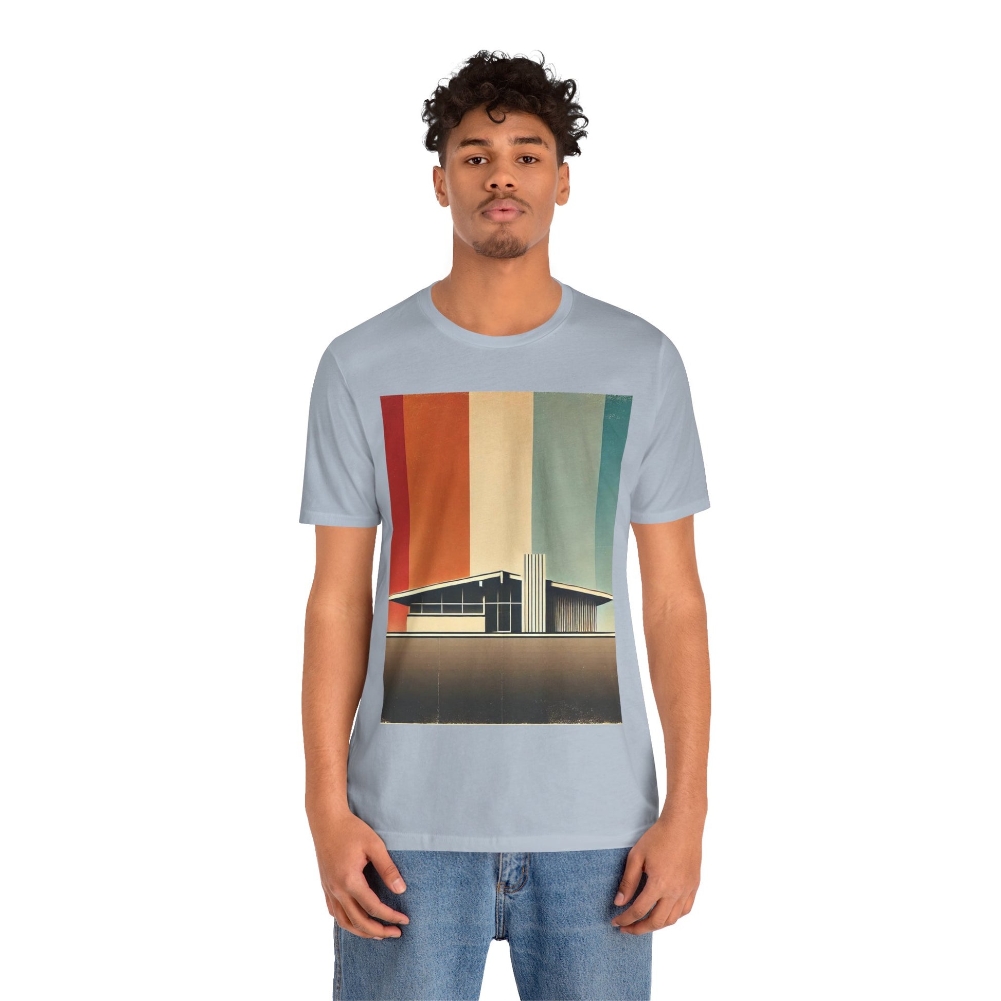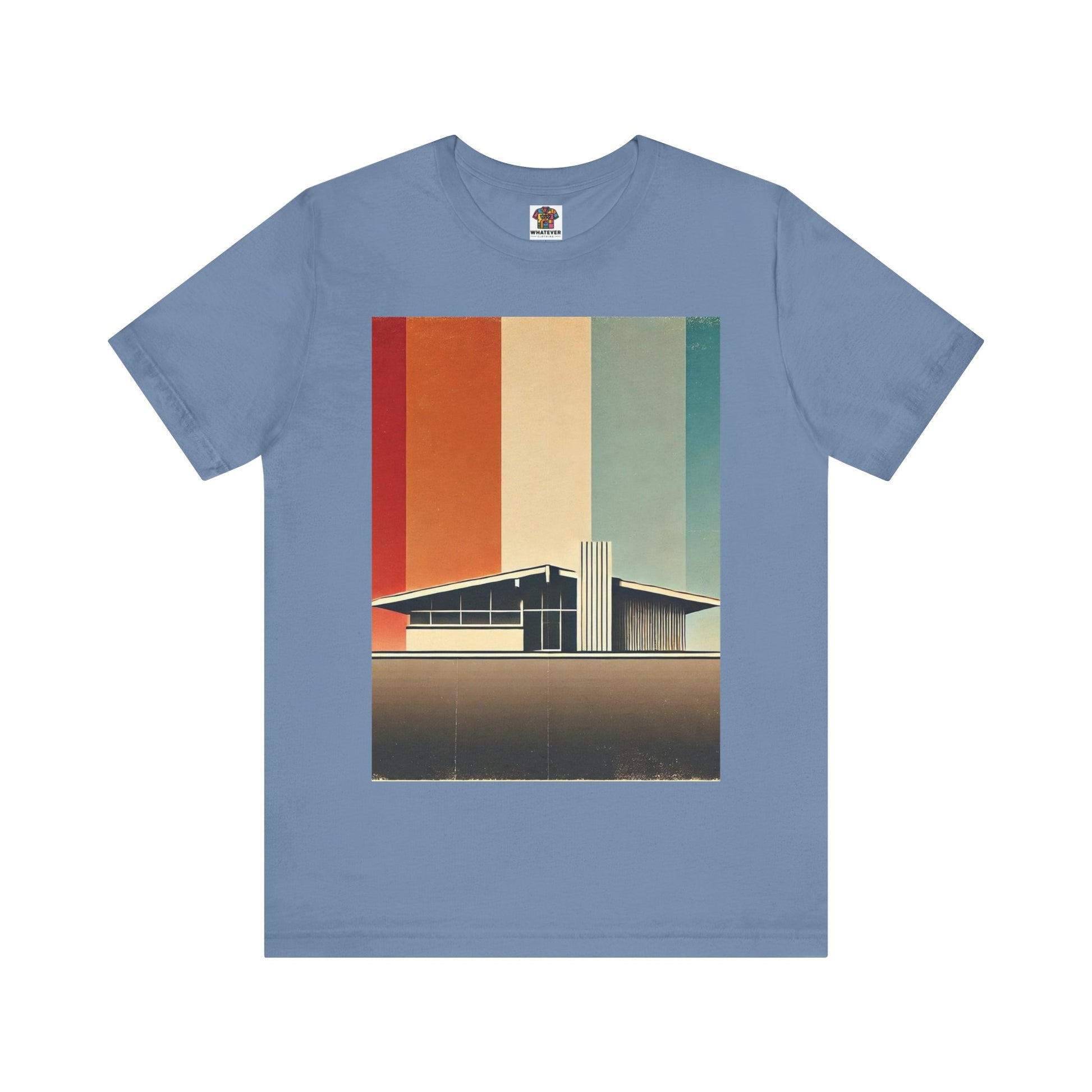 A minimalist mid-century modern house with clean lines, set against a gradient background with a vintage, grainy texture.