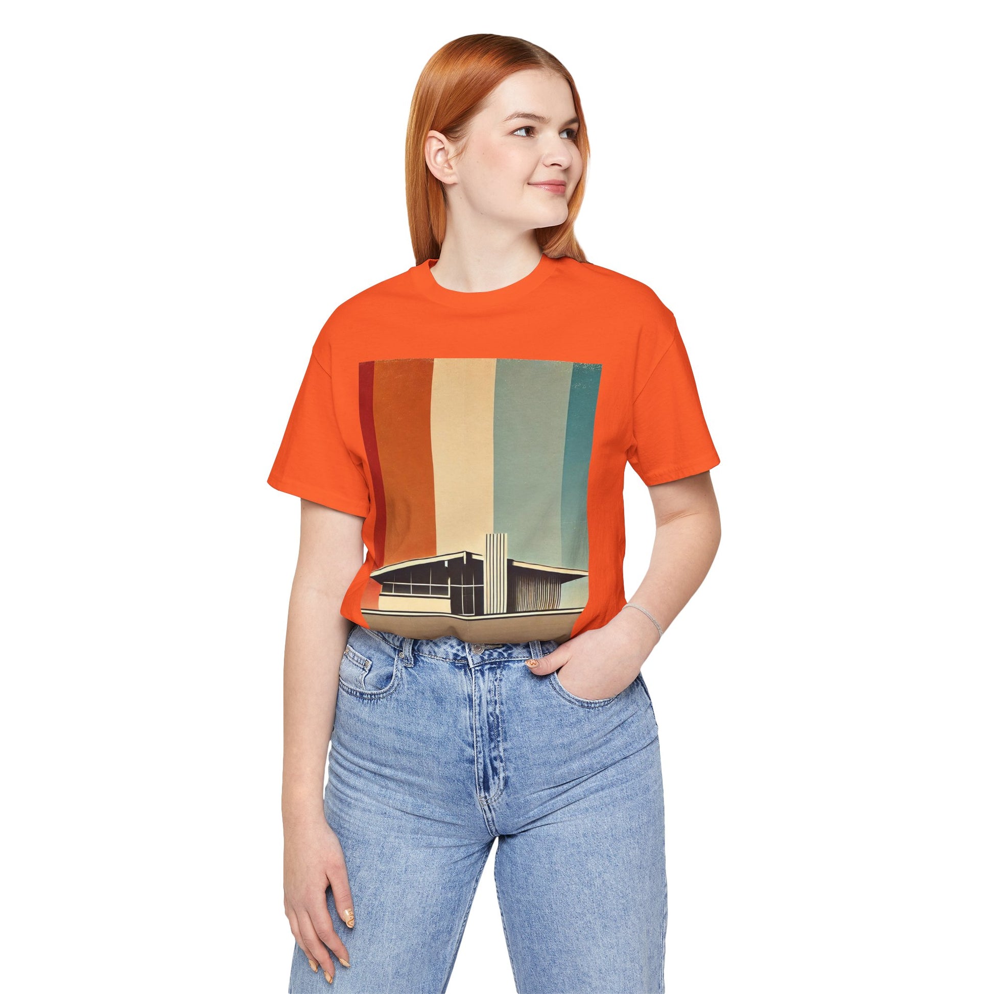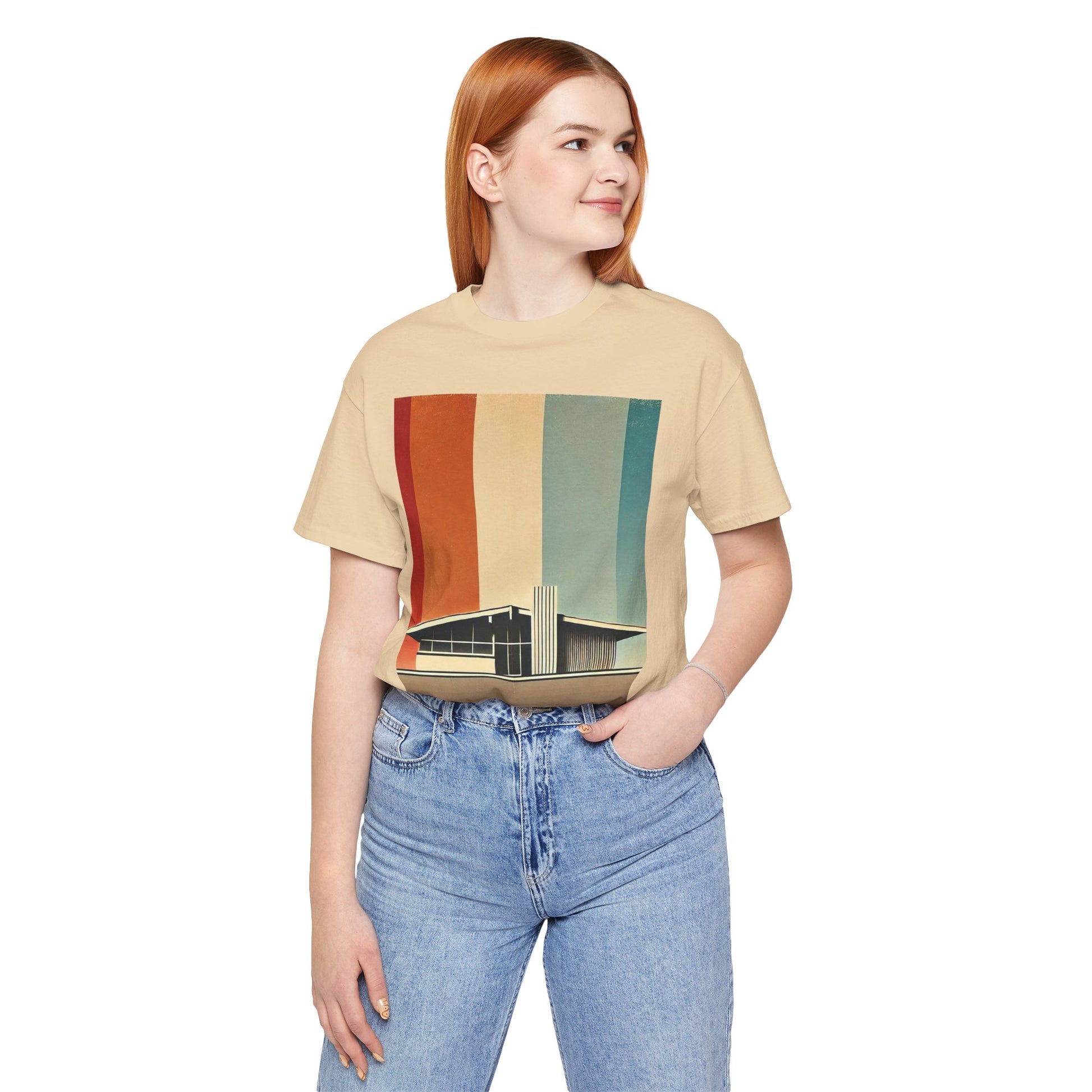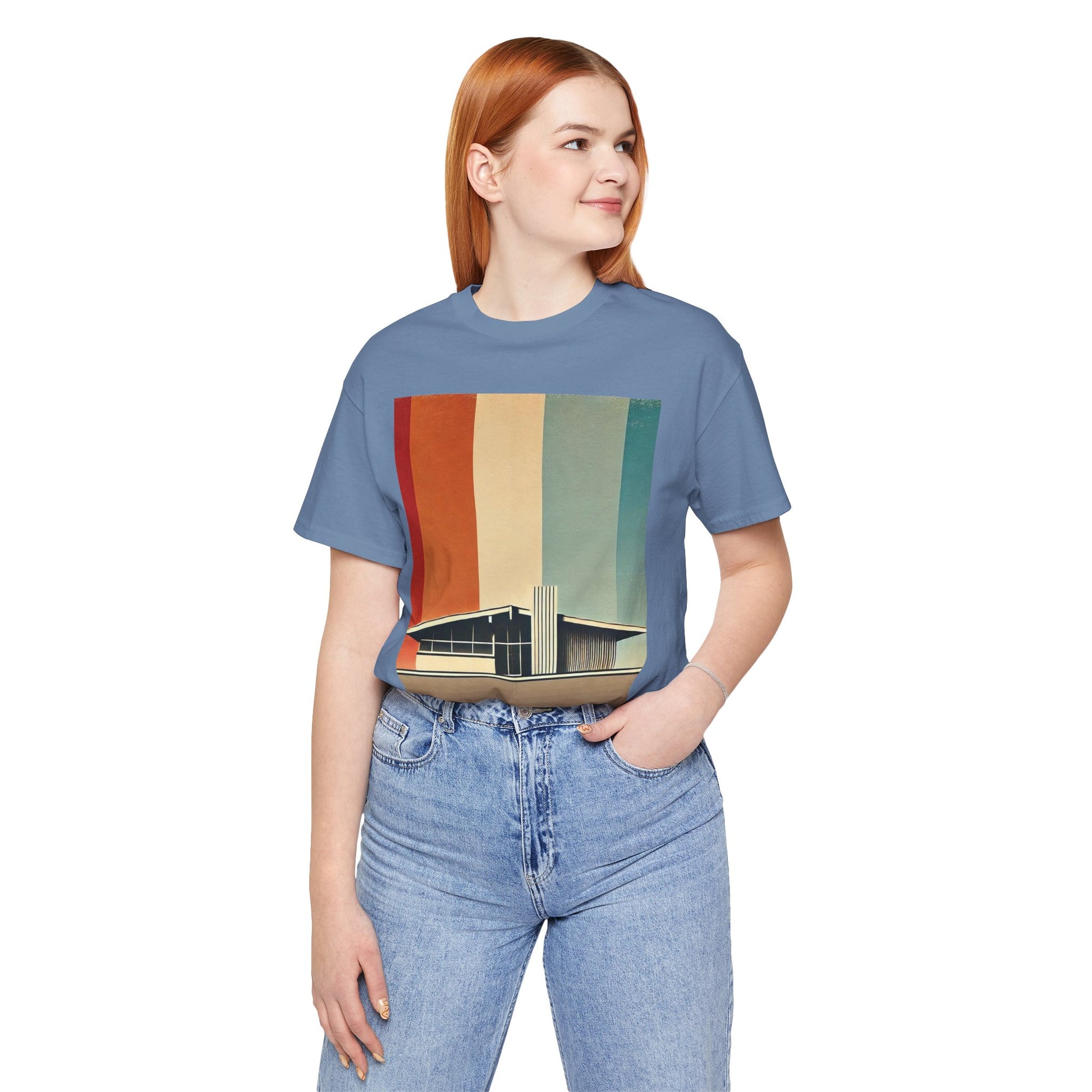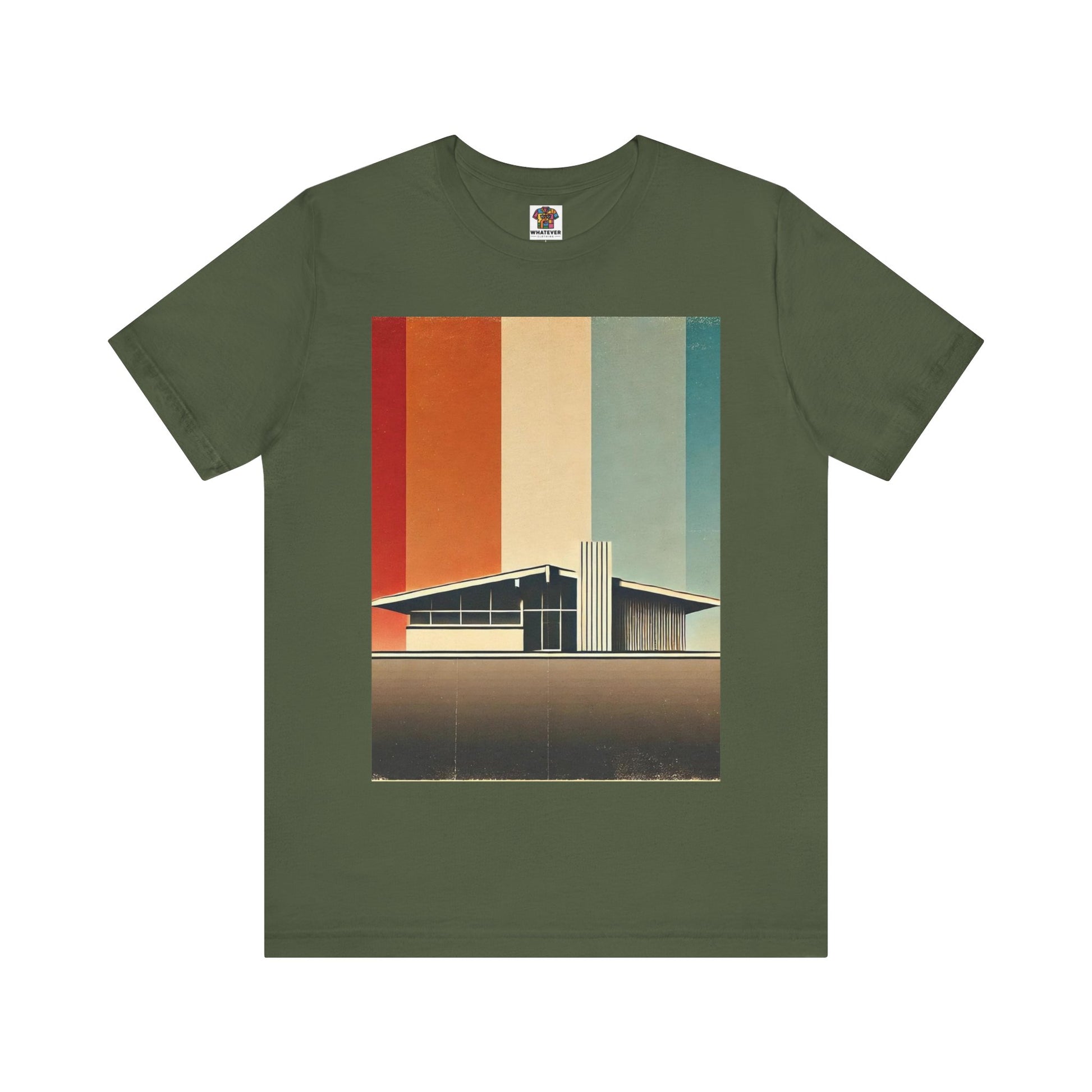 A minimalist mid-century modern house with clean lines, set against a gradient background with a vintage, grainy texture.