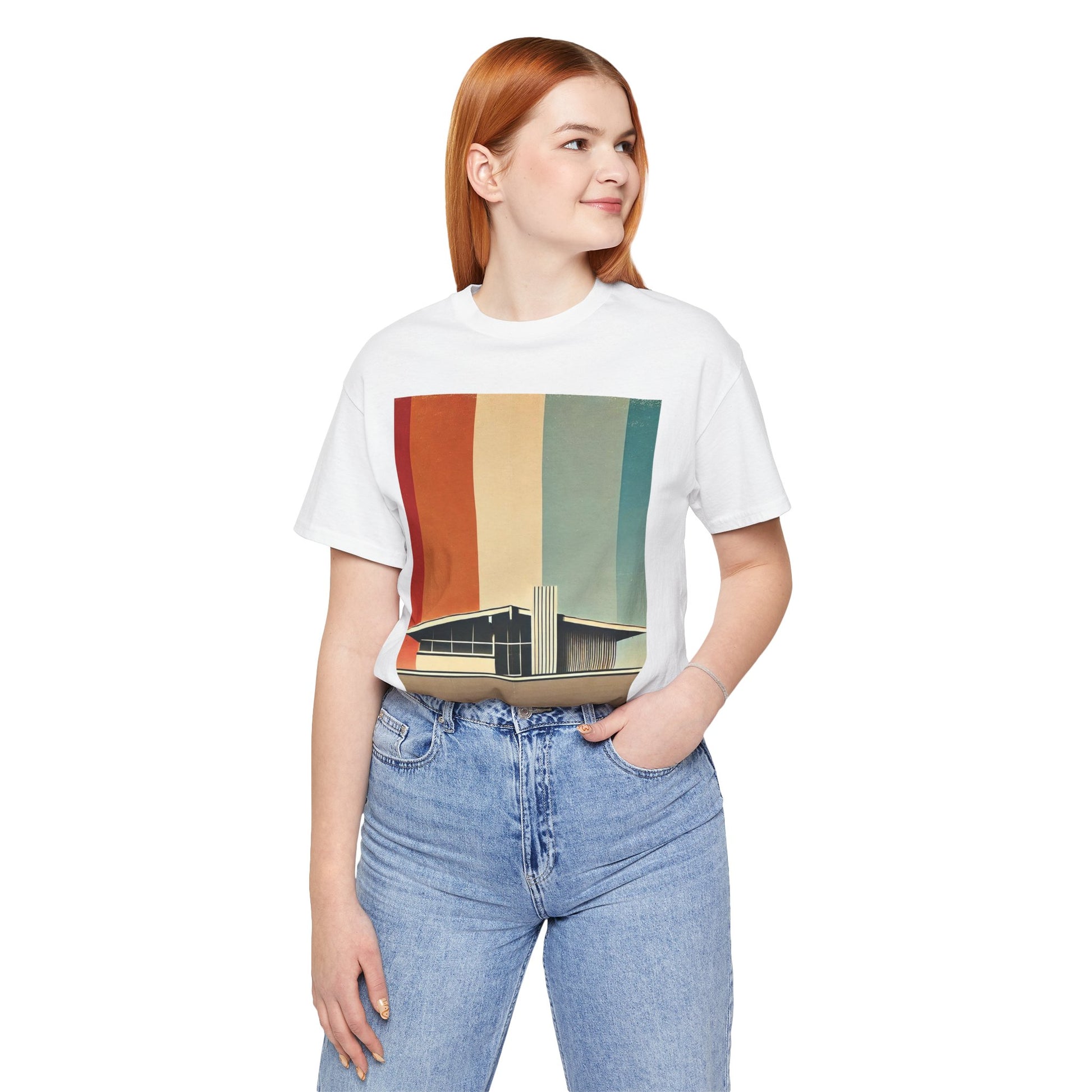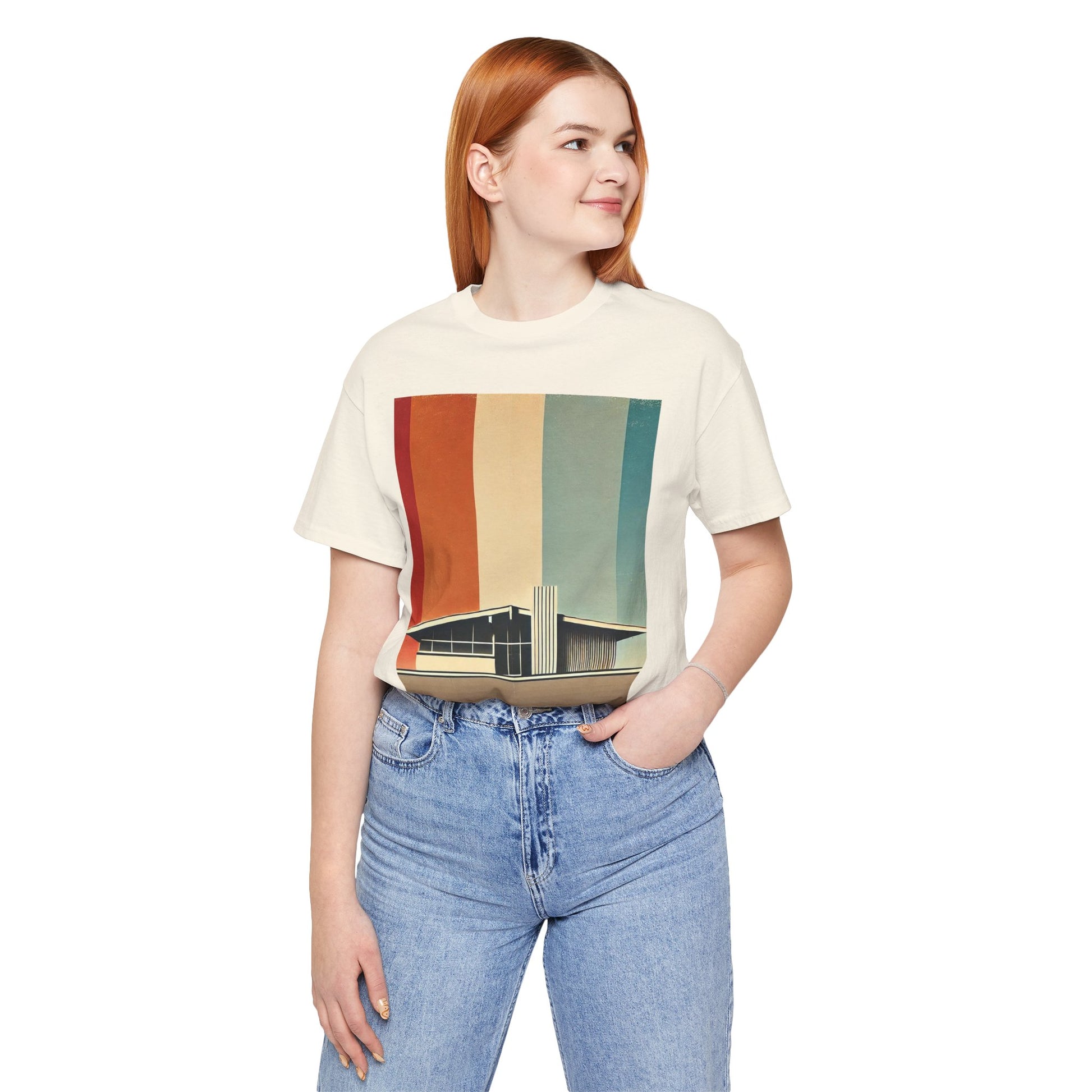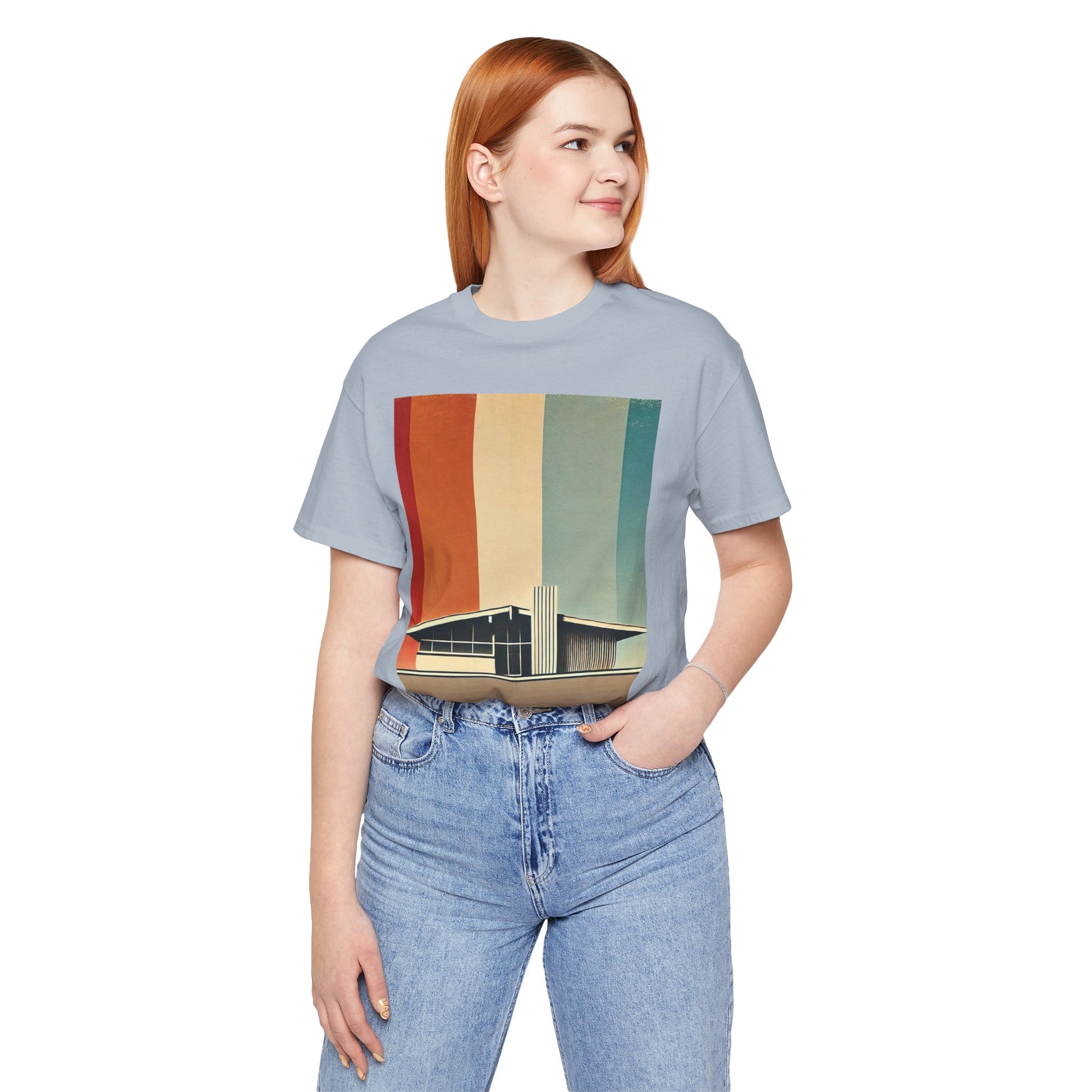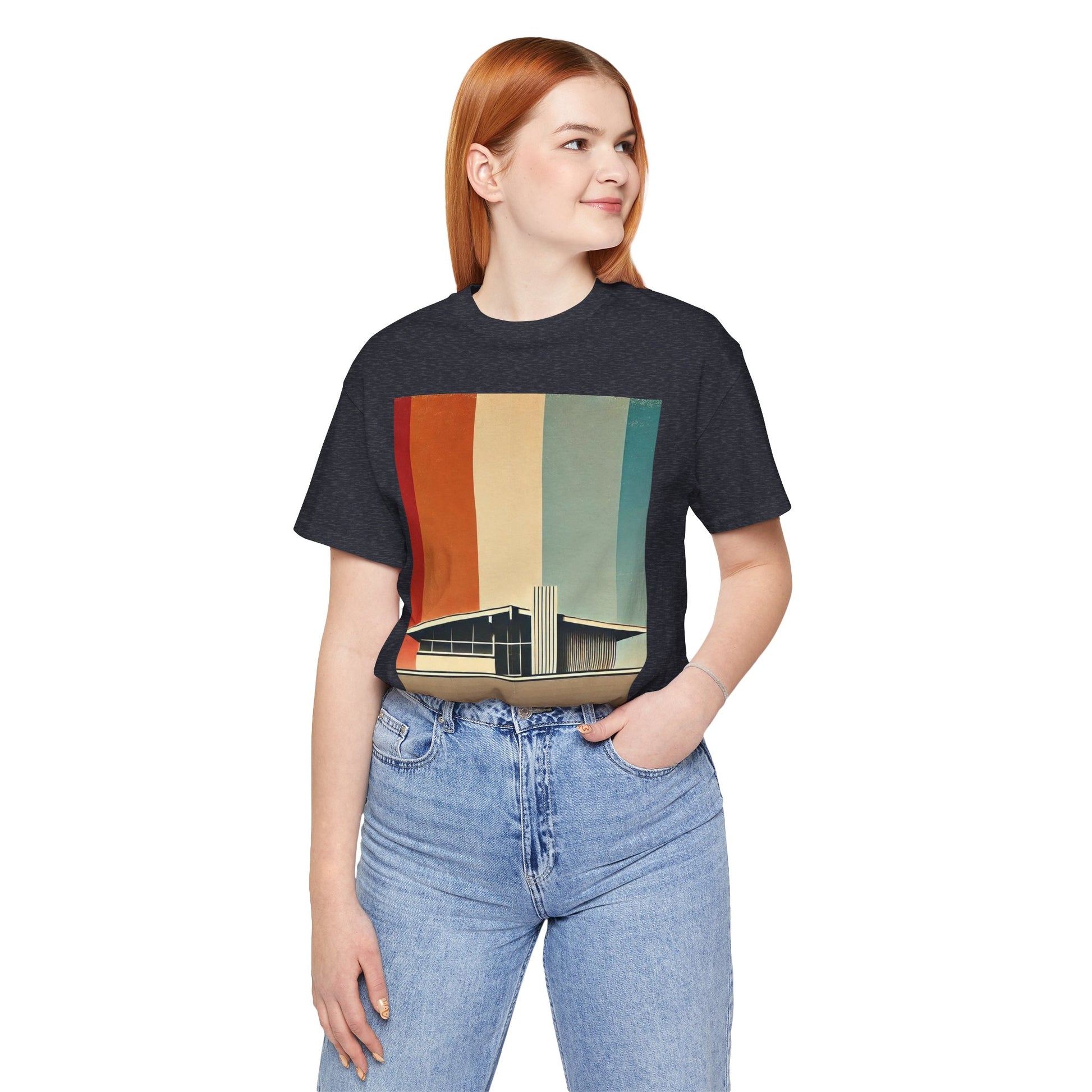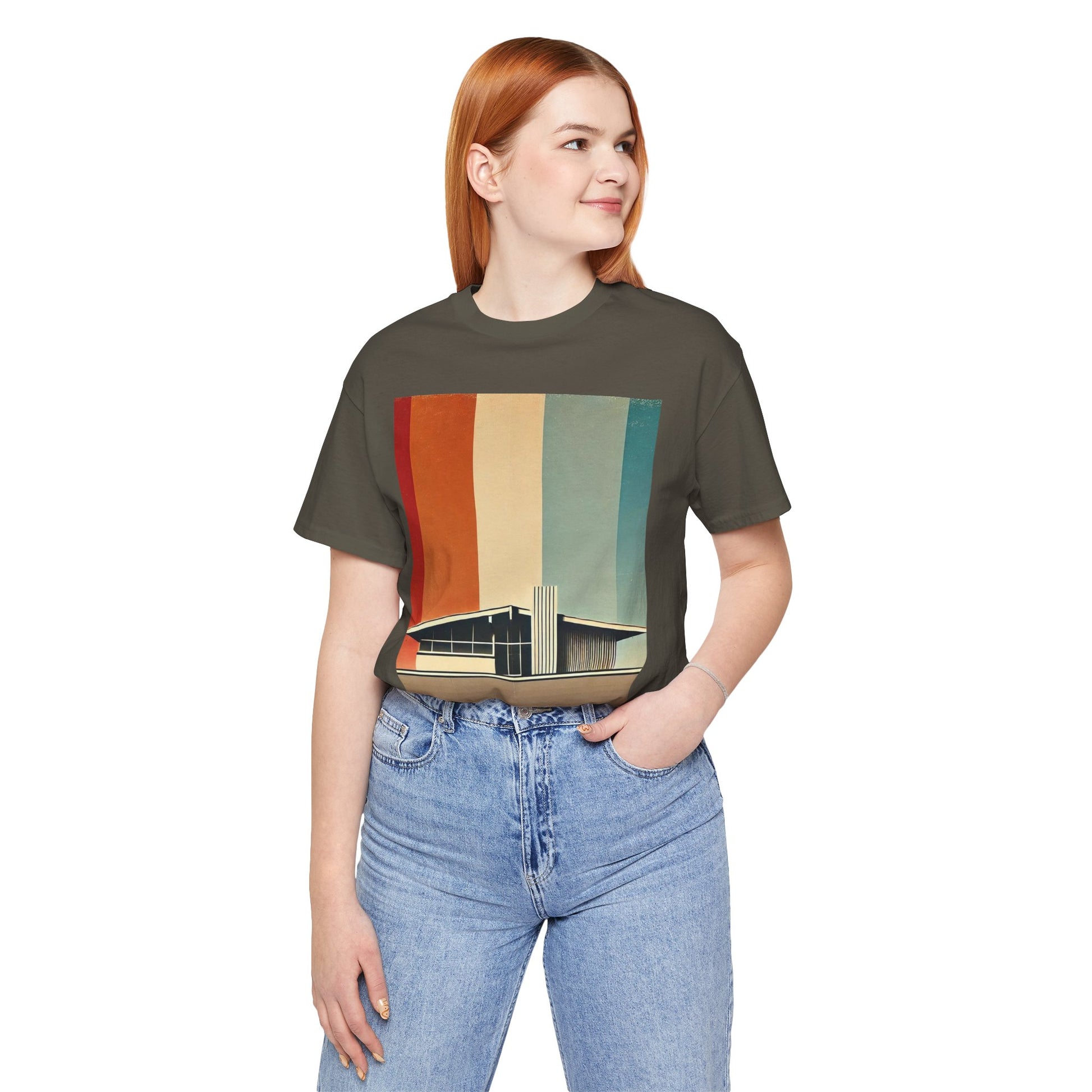A minimalist mid-century modern house with clean lines, set against a gradient background with a vintage, grainy texture.