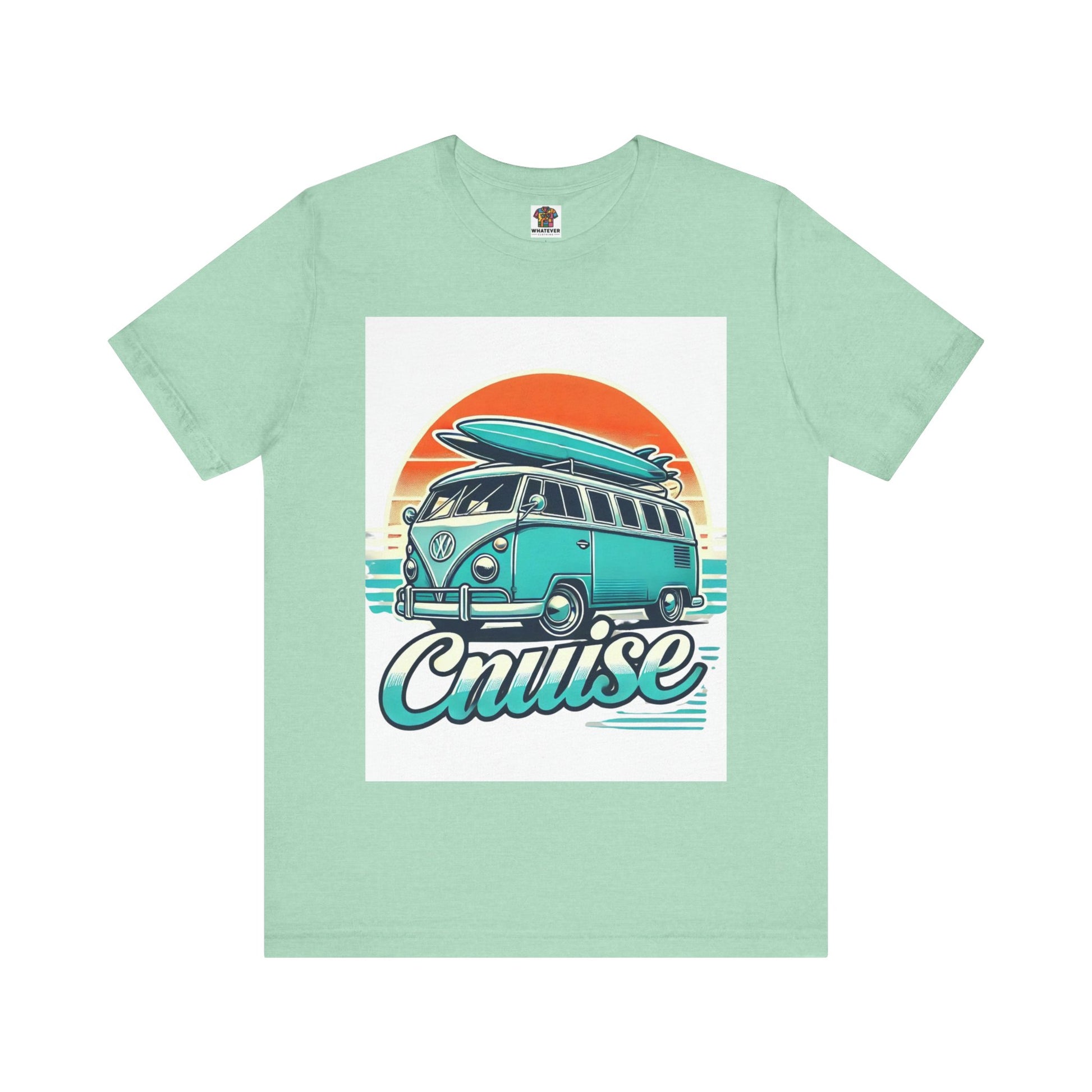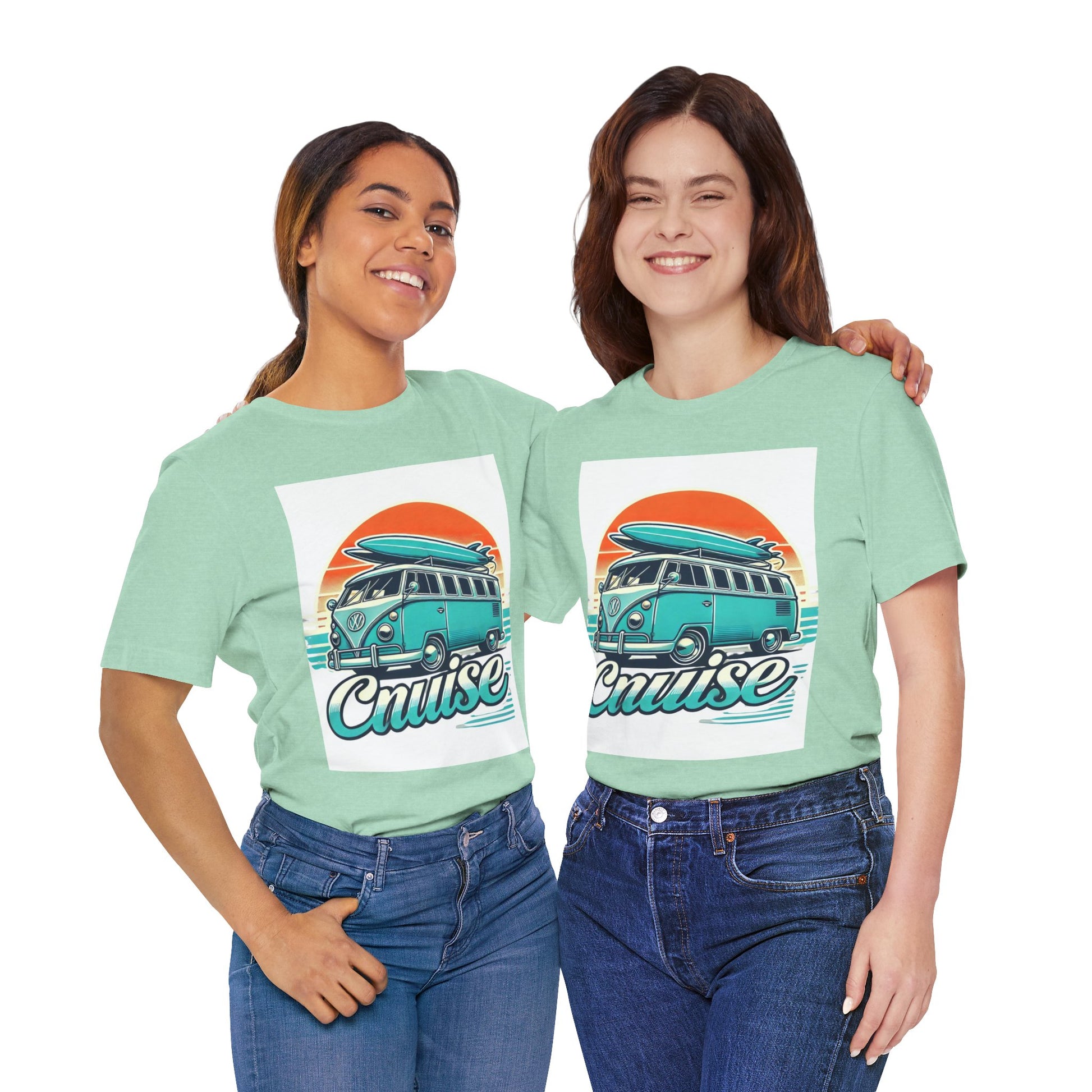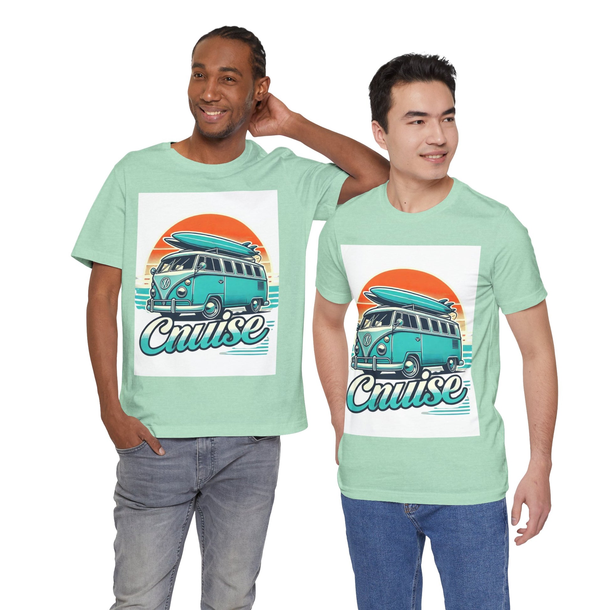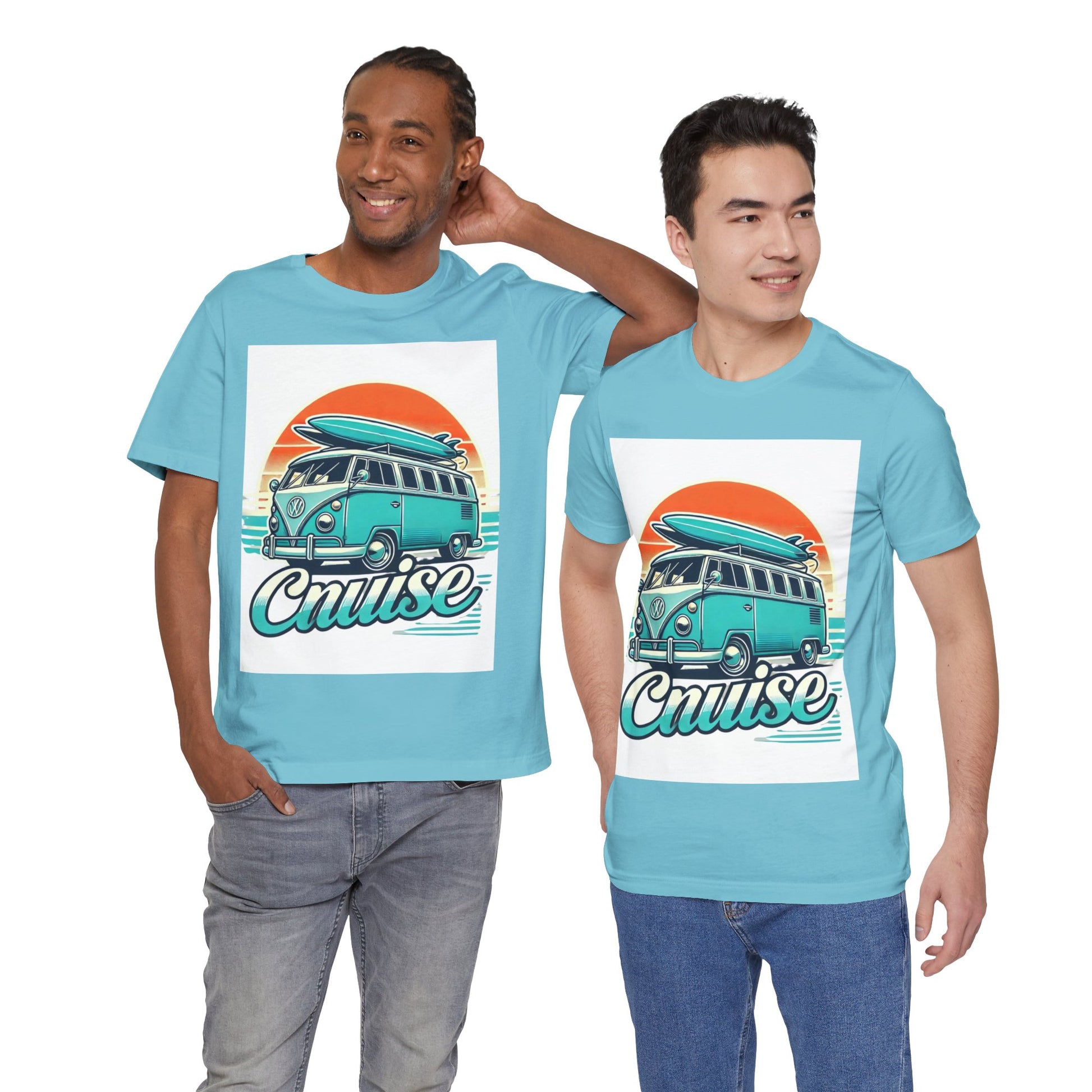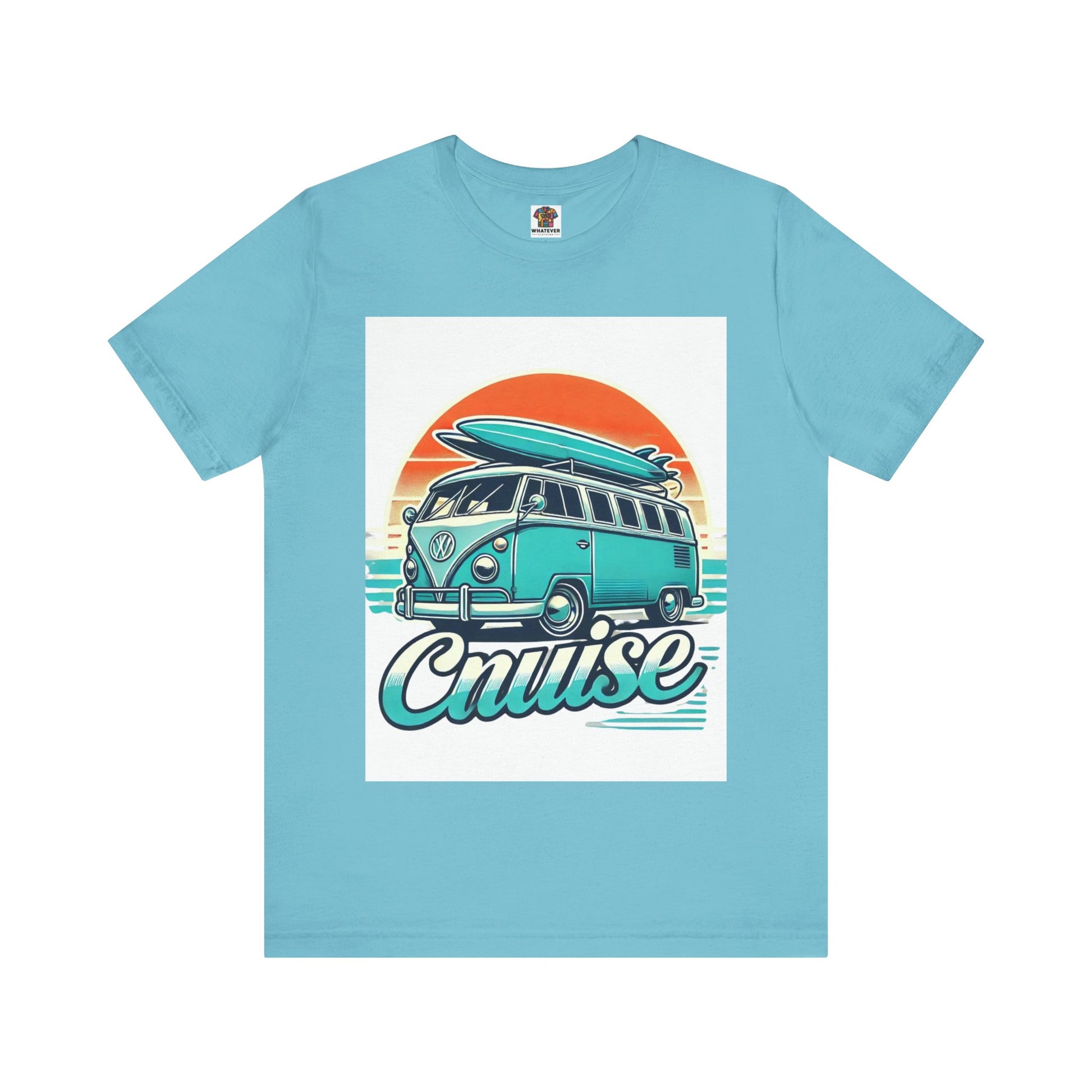 A retro teal surf van with surfboards on top and graffiti-style "Cruise" text in orange. Playful and nostalgic, ideal for surf culture fans.