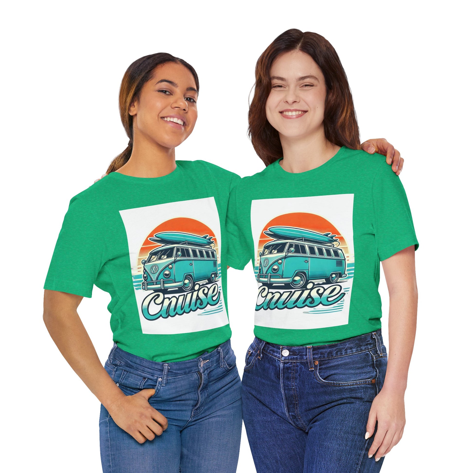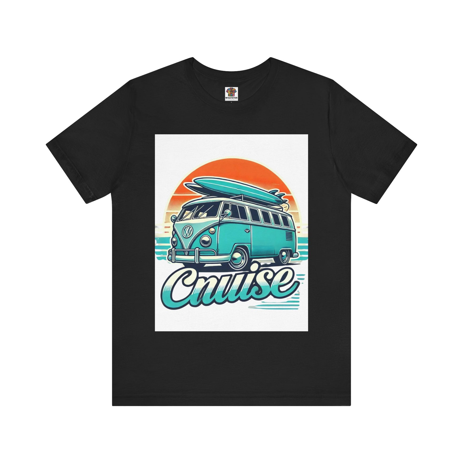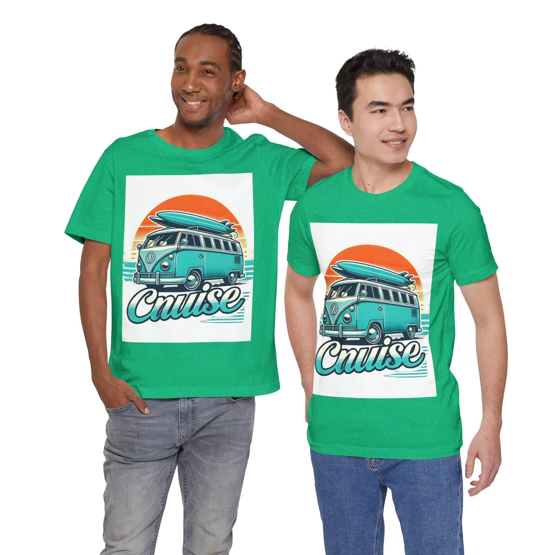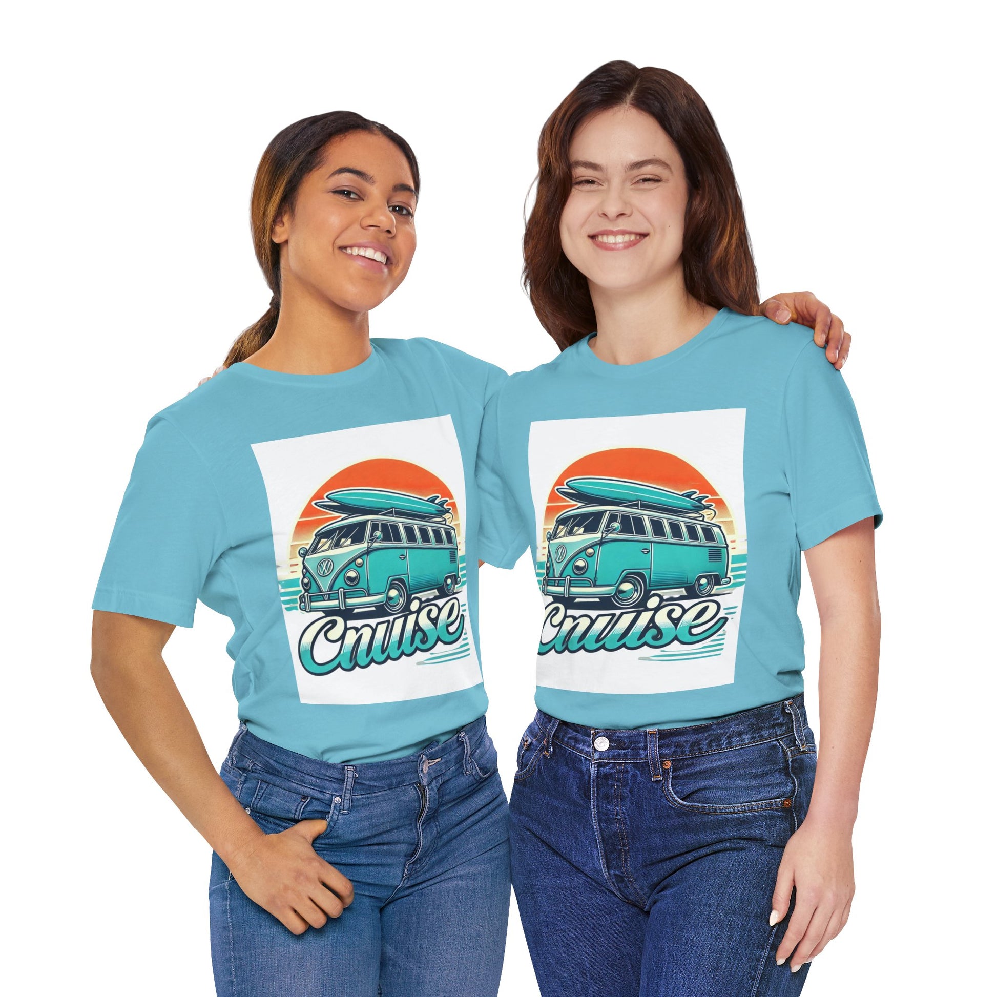 A retro teal surf van with surfboards on top and graffiti-style "Cruise" text in orange. Playful and nostalgic, ideal for surf culture fans.