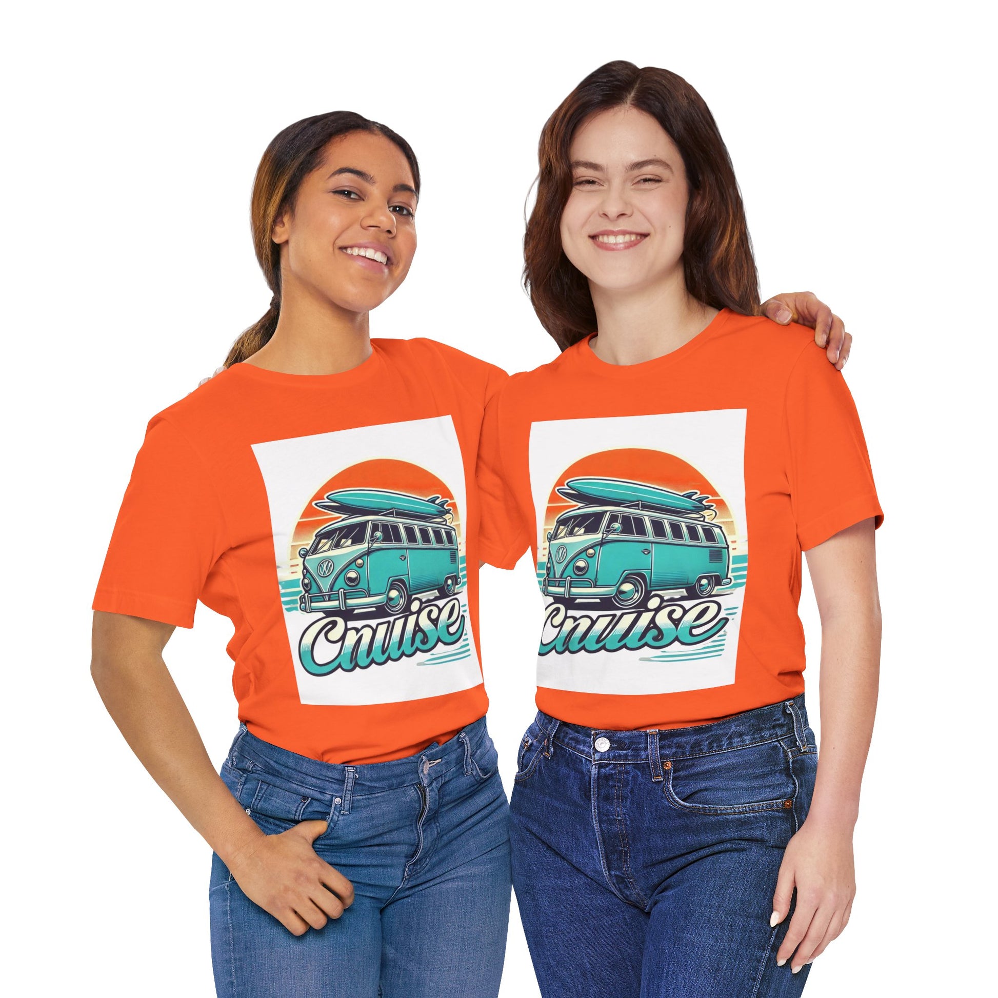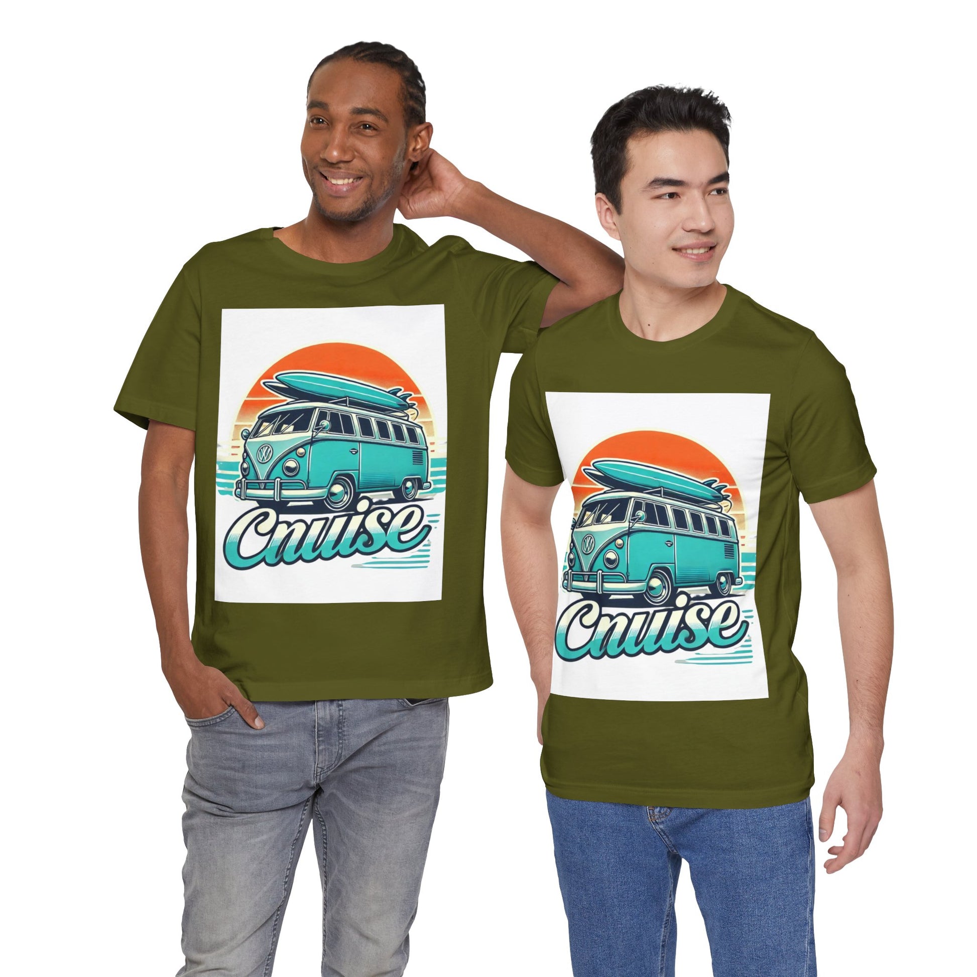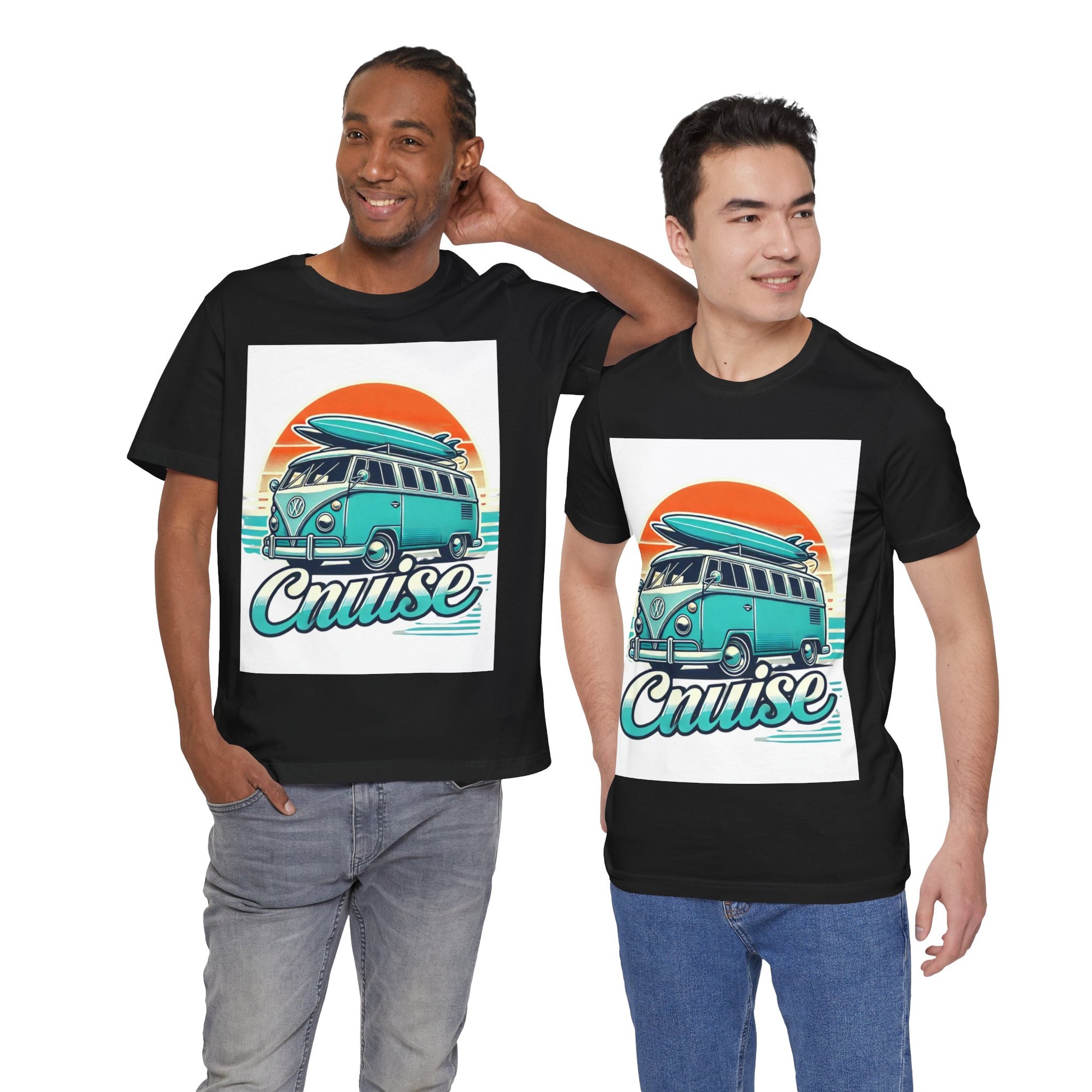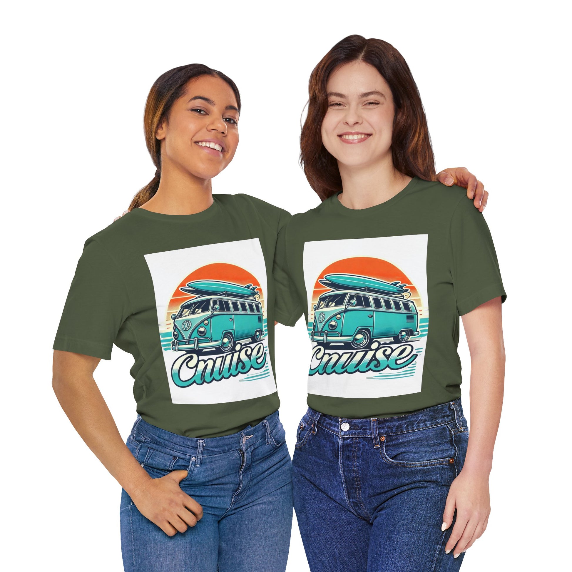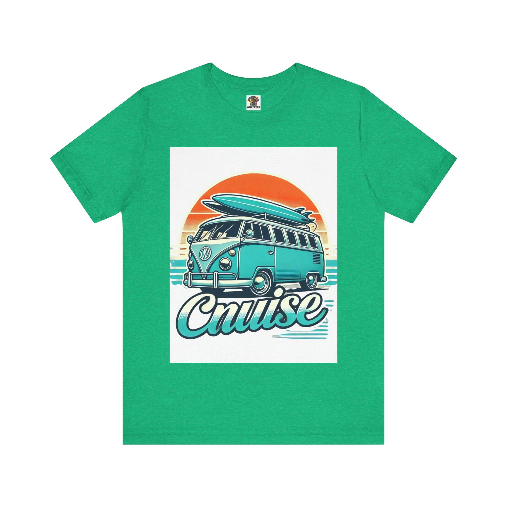 A retro teal surf van with surfboards on top and graffiti-style "Cruise" text in orange. Playful and nostalgic, ideal for surf culture fans.