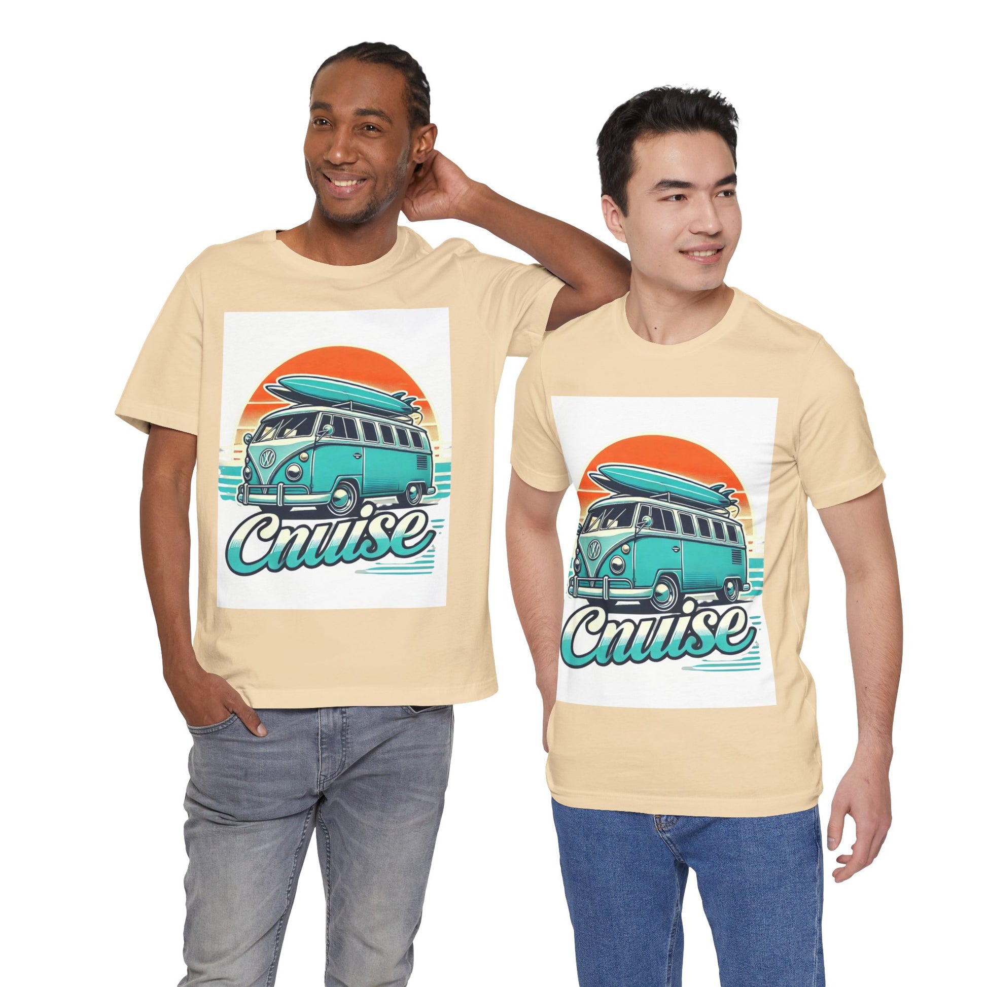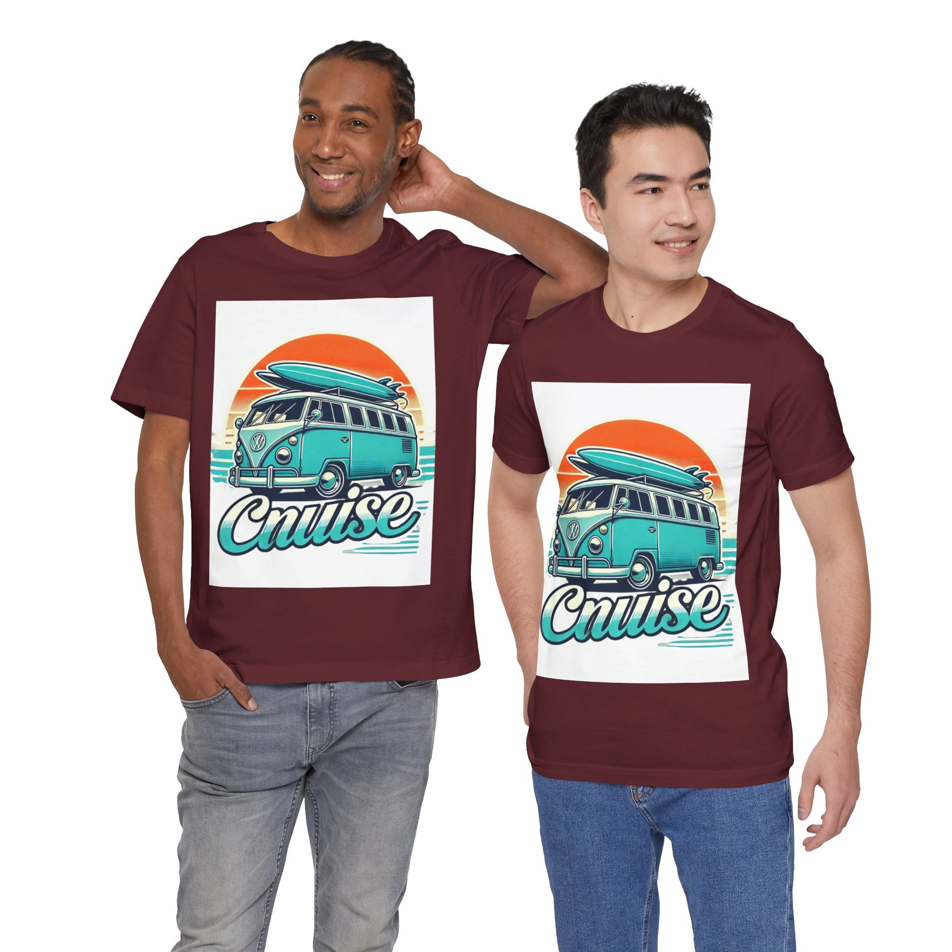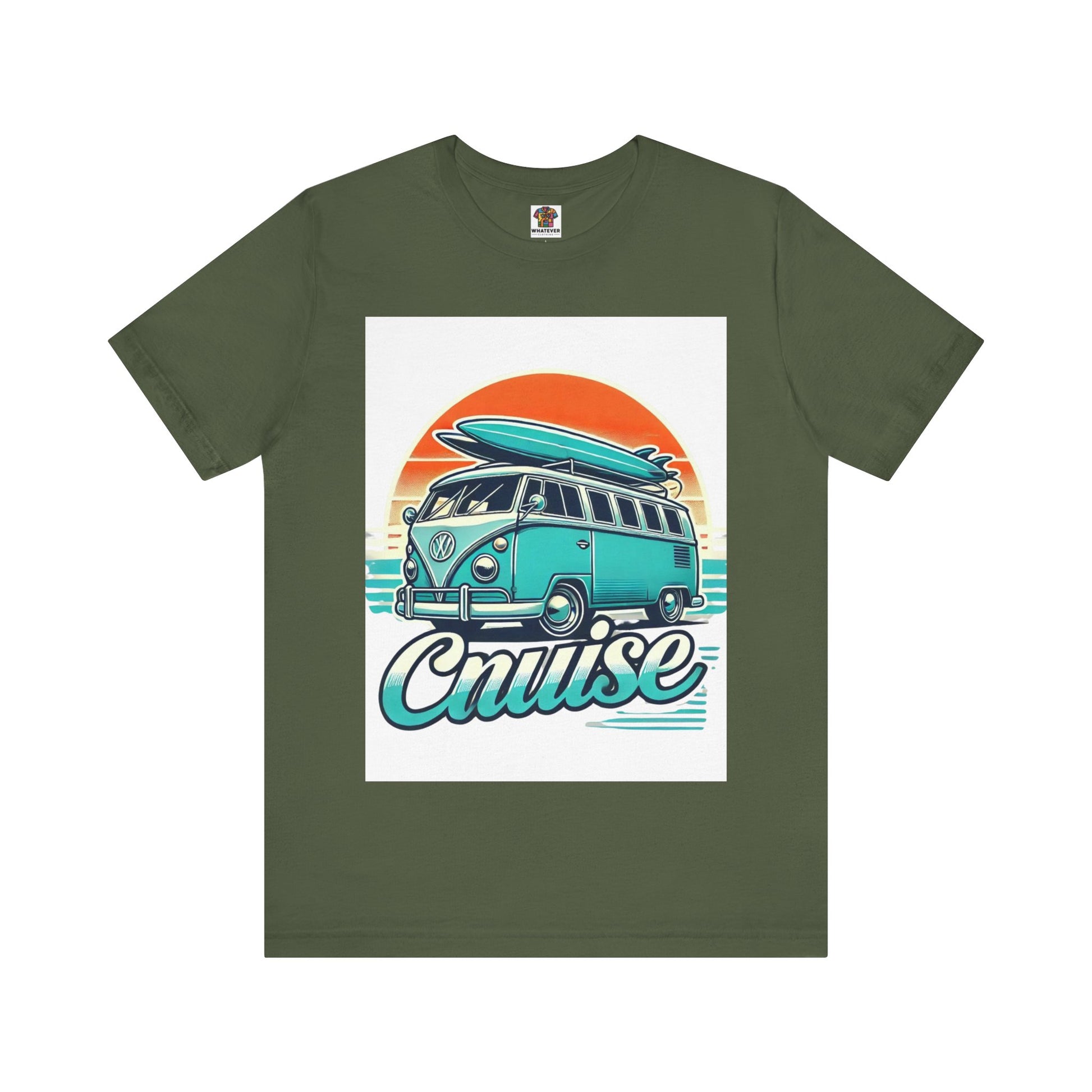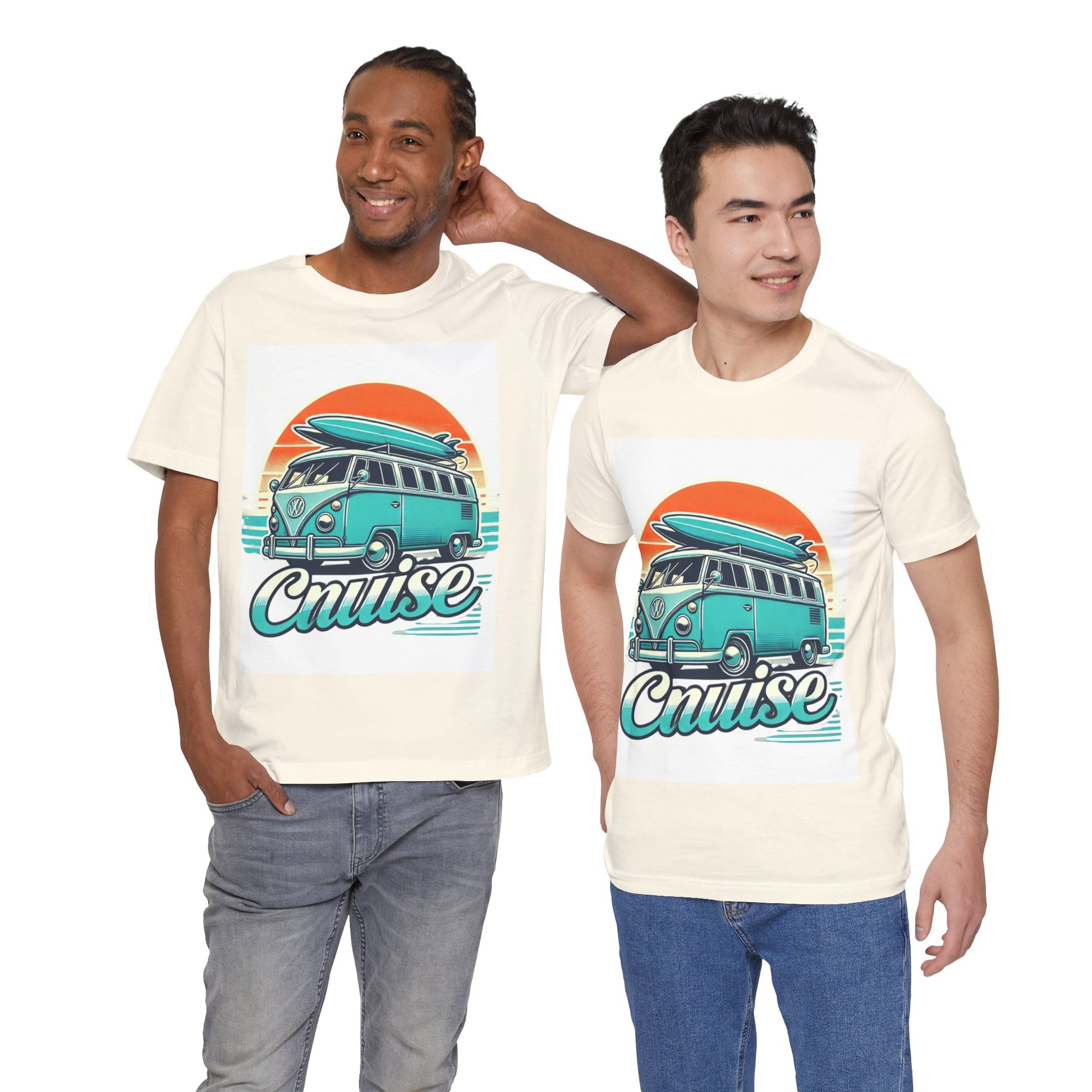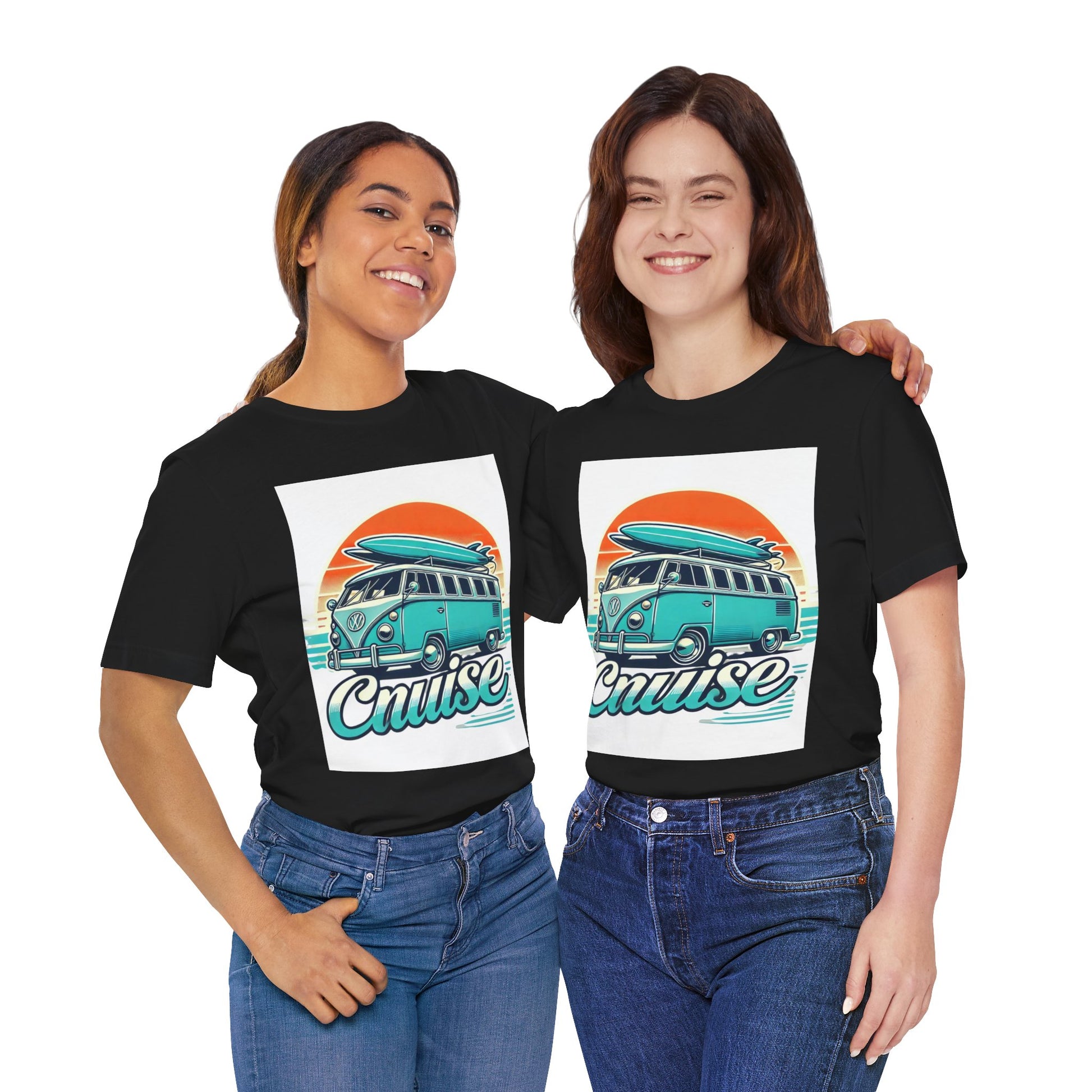 A retro teal surf van with surfboards on top and graffiti-style "Cruise" text in orange. Playful and nostalgic, ideal for surf culture fans.