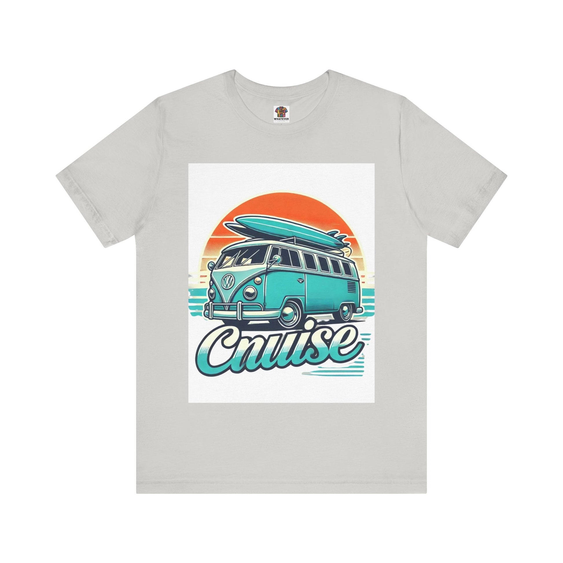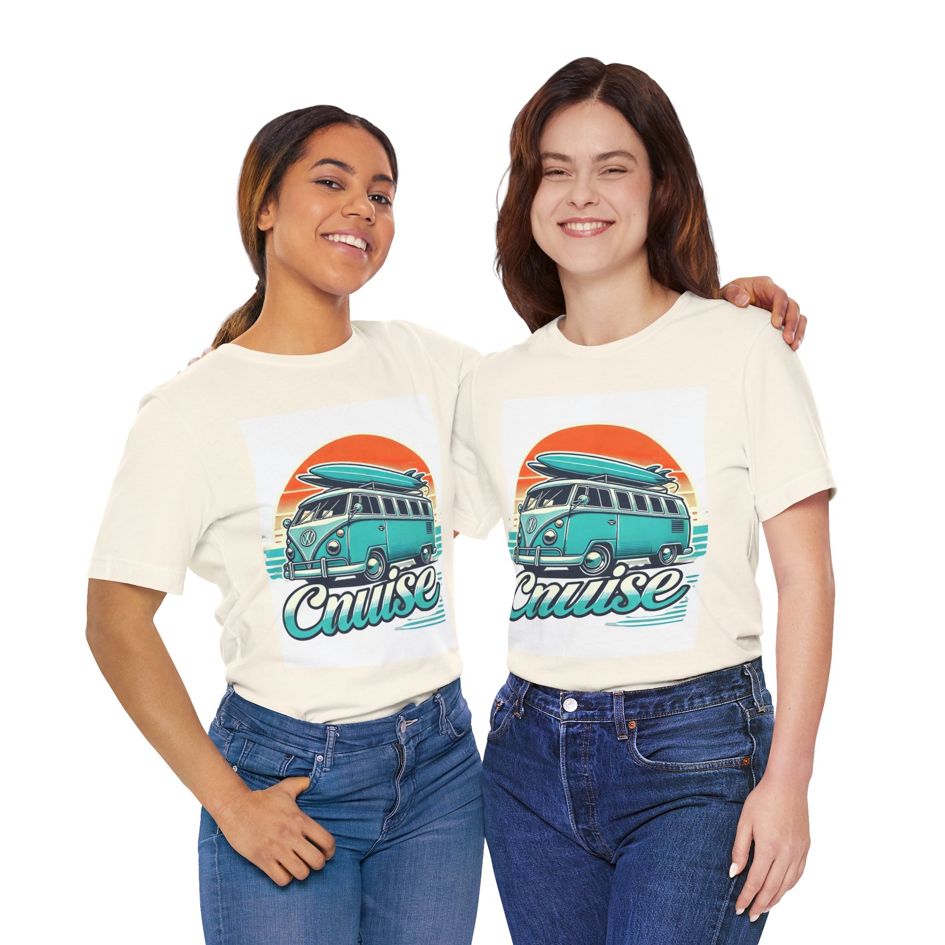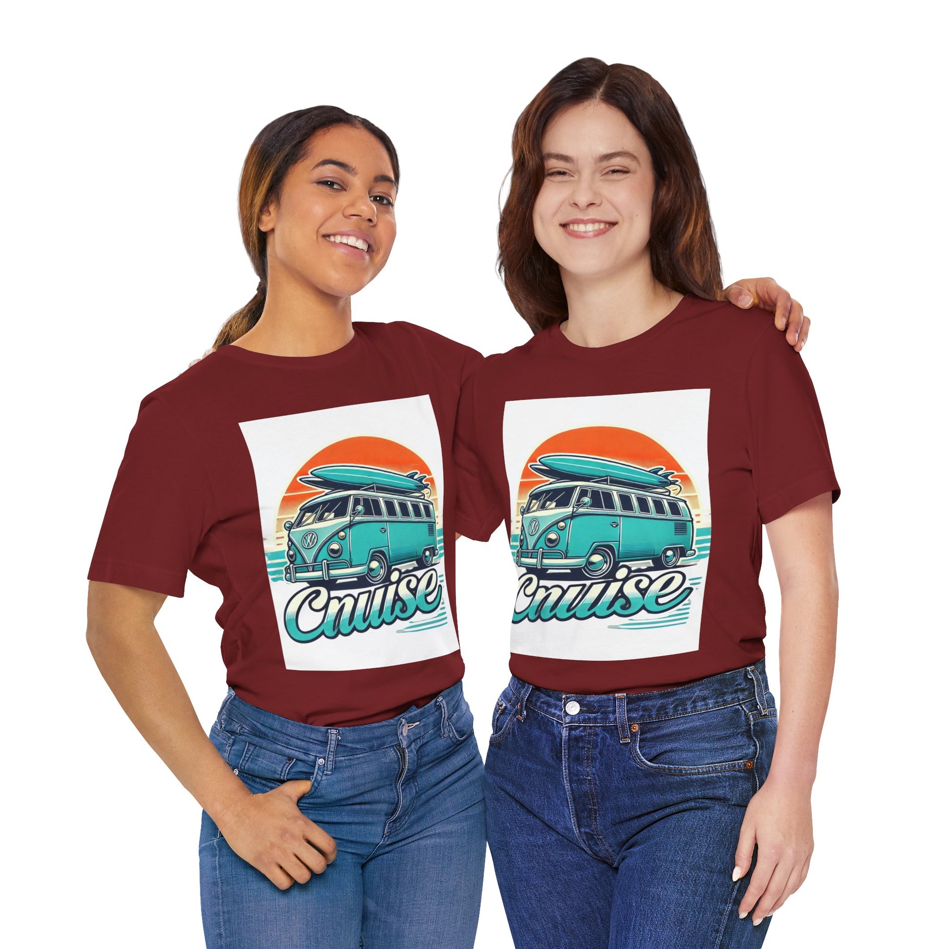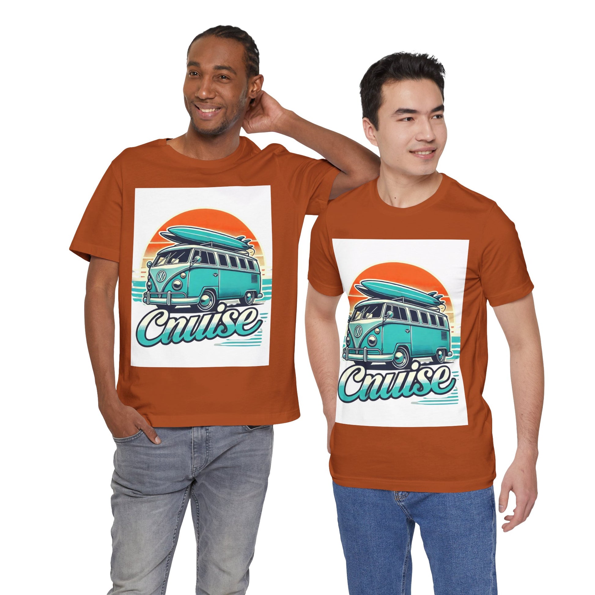 A retro teal surf van with surfboards on top and graffiti-style "Cruise" text in orange. Playful and nostalgic, ideal for surf culture fans.