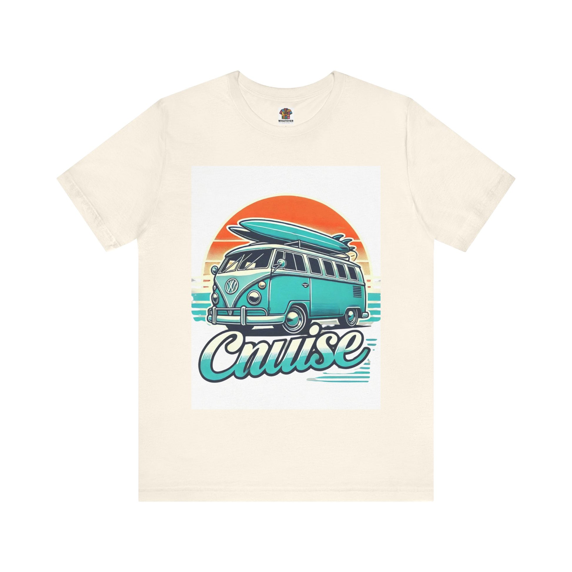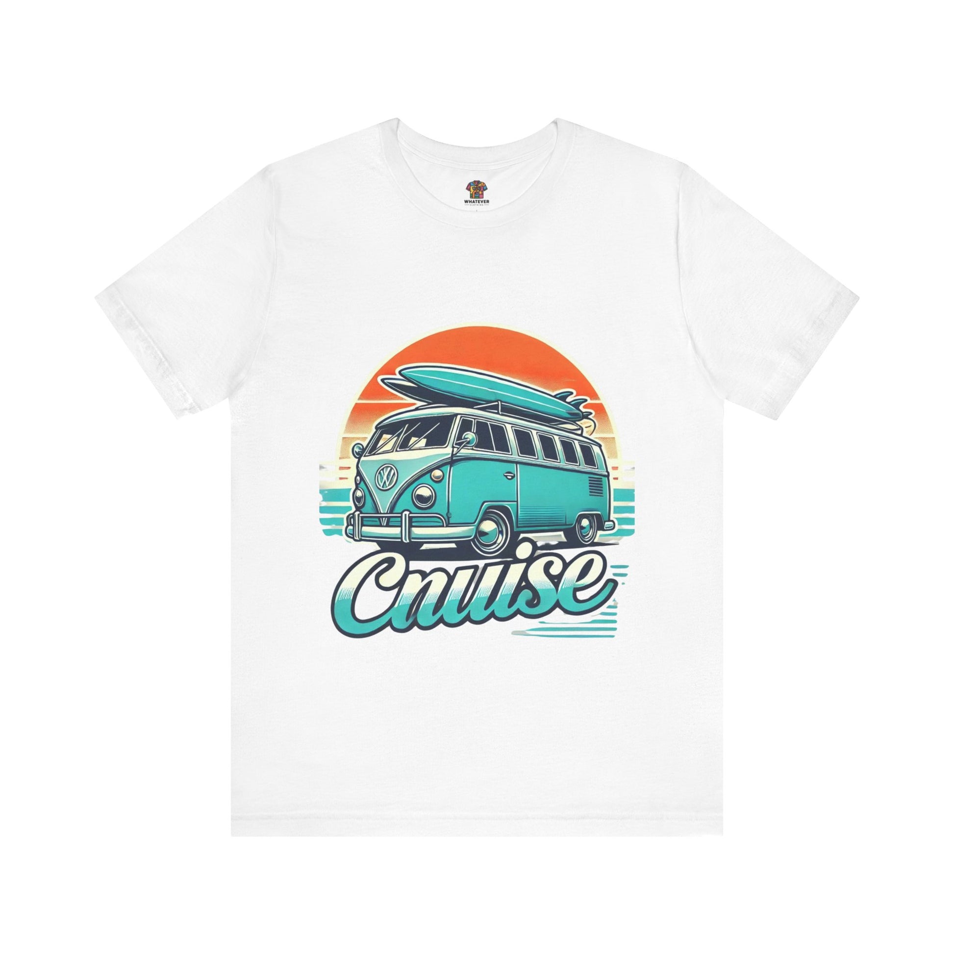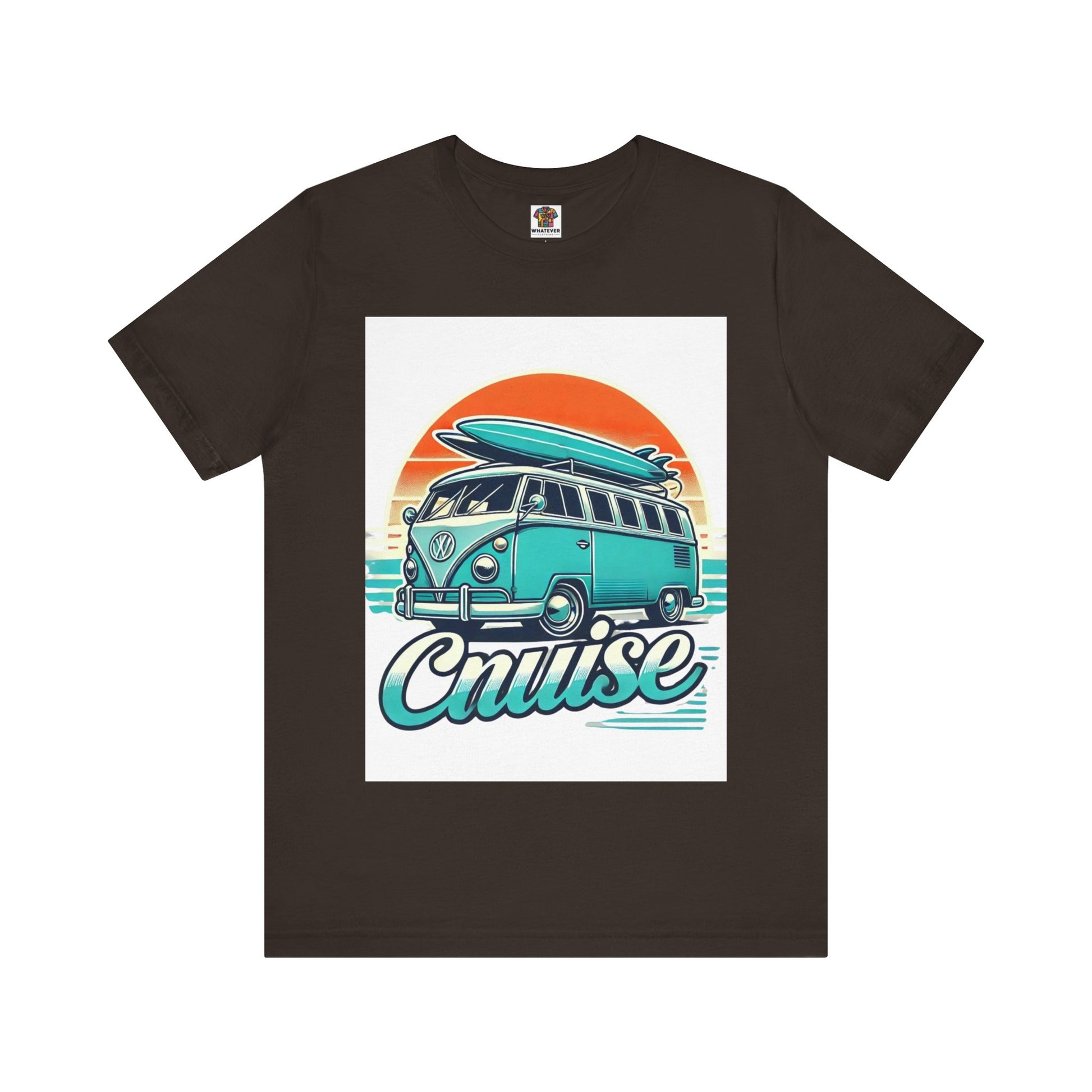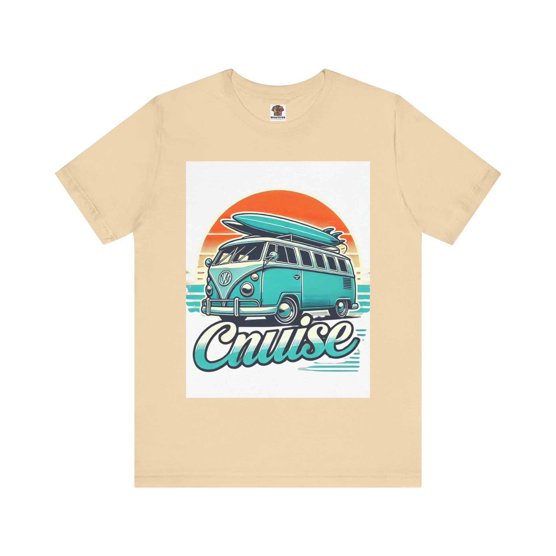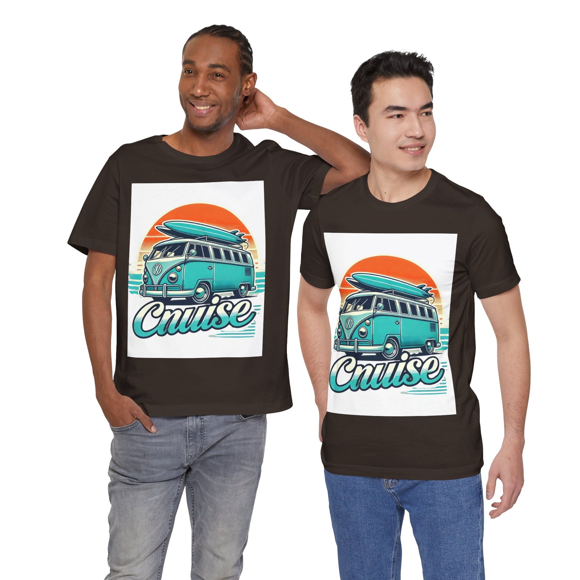 A retro teal surf van with surfboards on top and graffiti-style "Cruise" text in orange. Playful and nostalgic, ideal for surf culture fans.